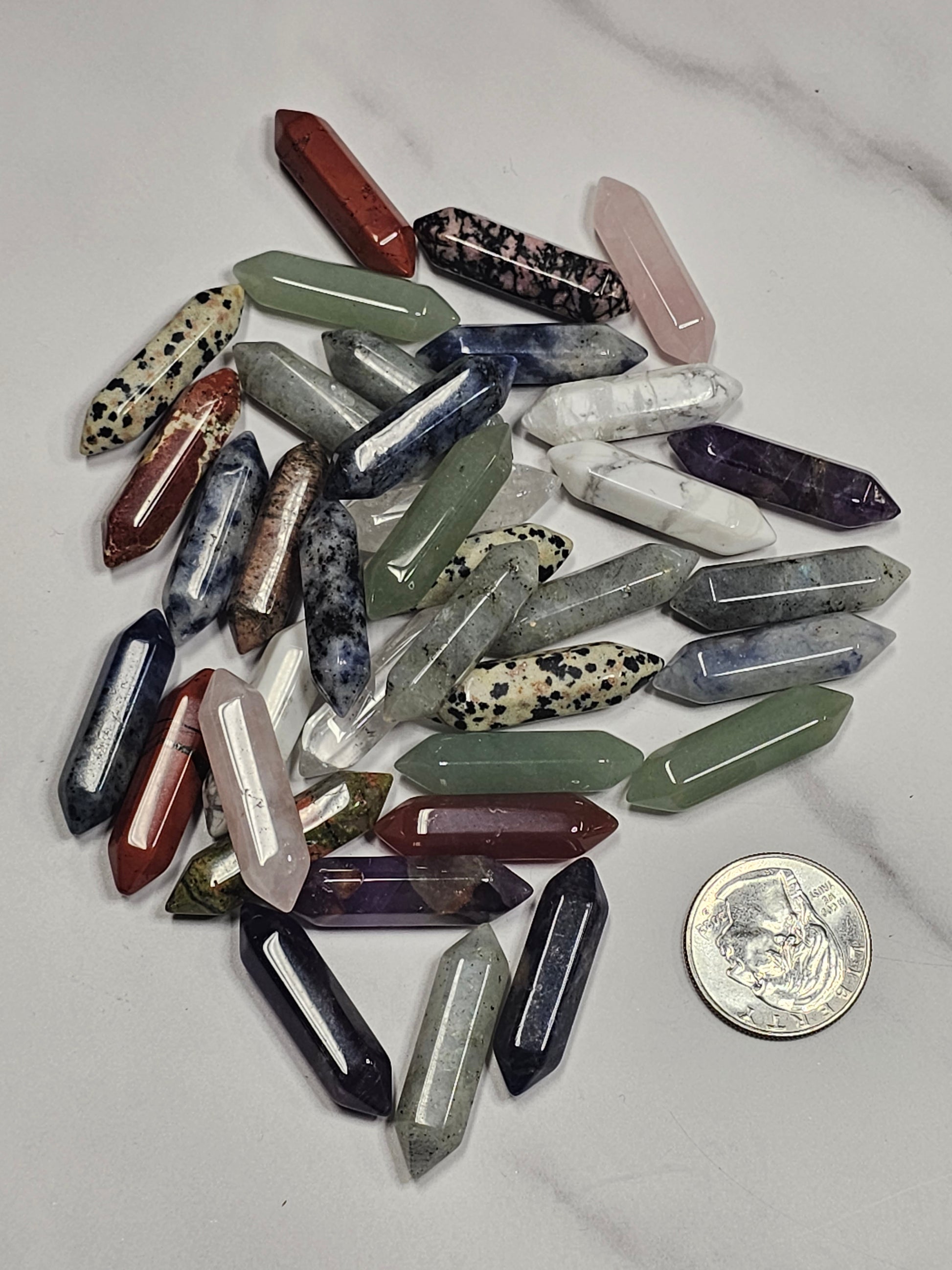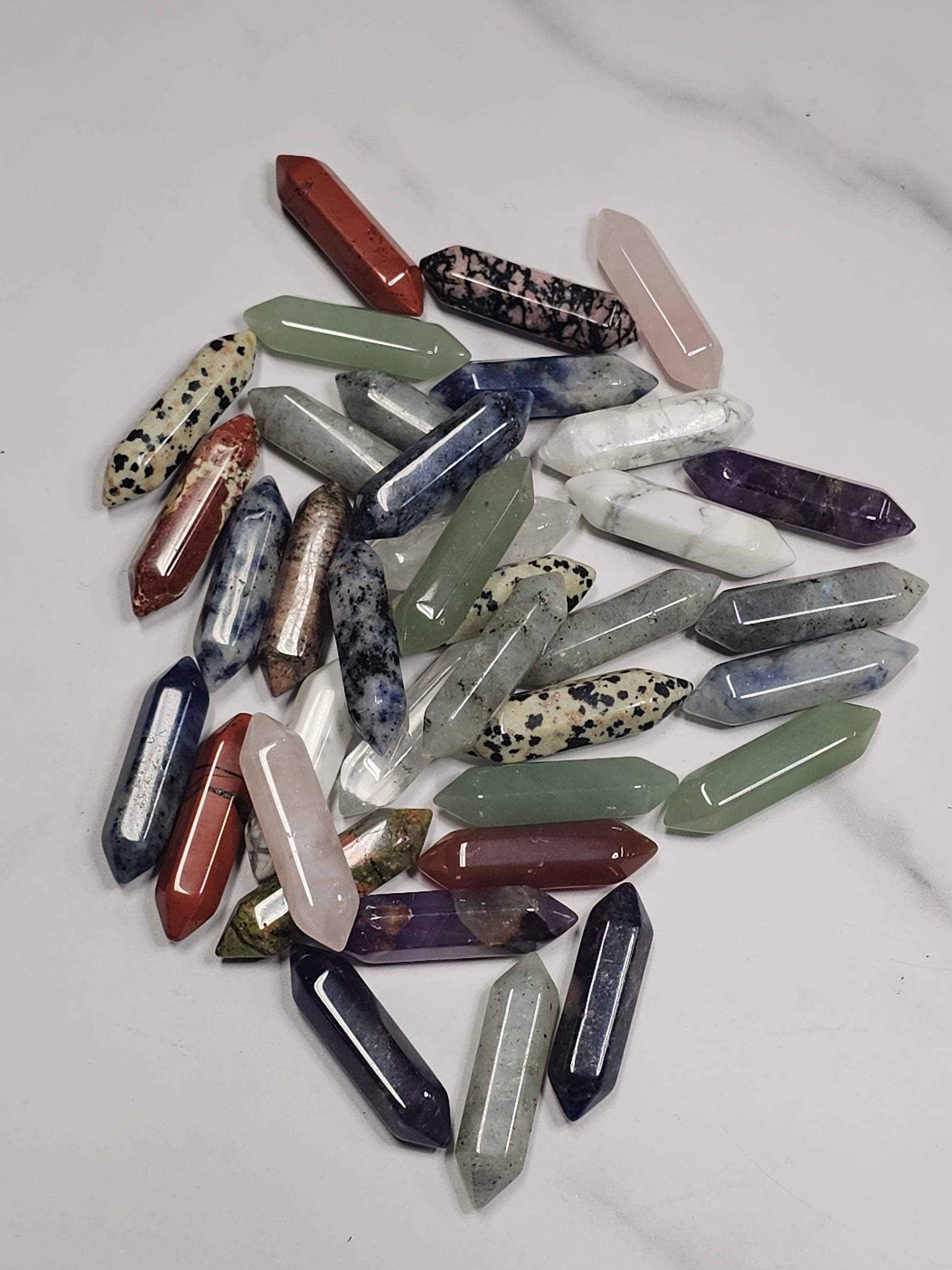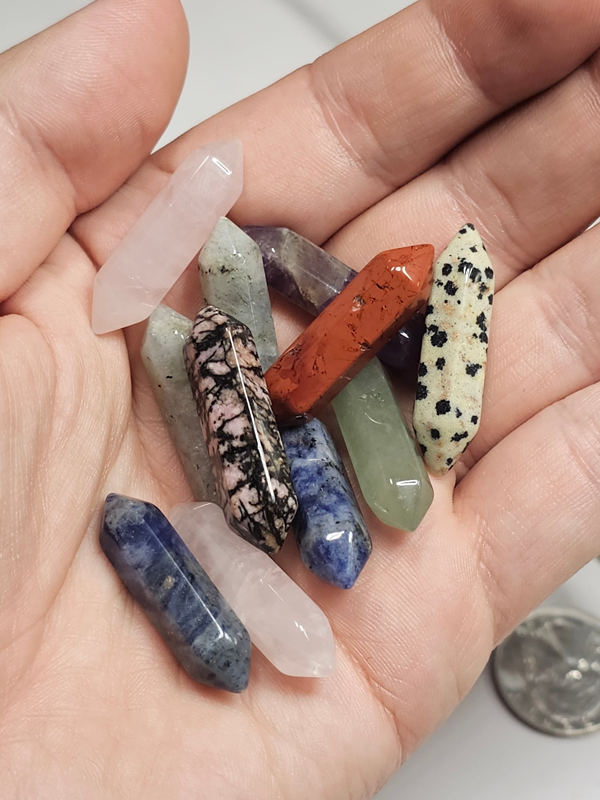 Each mini double terminated point is 33mm or 1.4 inches long. They are perfect for jewelry making or keeping as a pocket or bag stone! They can even be used as a worry stone or given away as gifts. Each one is sent at random. Many possible crystal types including but not limited to Quartz, Rose Quartz, Rhodonite, Unakite, Red Jasper, Amethyst, Lapis Lazuli, Labradorite, Sodalite, Tiger's Eye, Dalmatian Jasper and so much more.