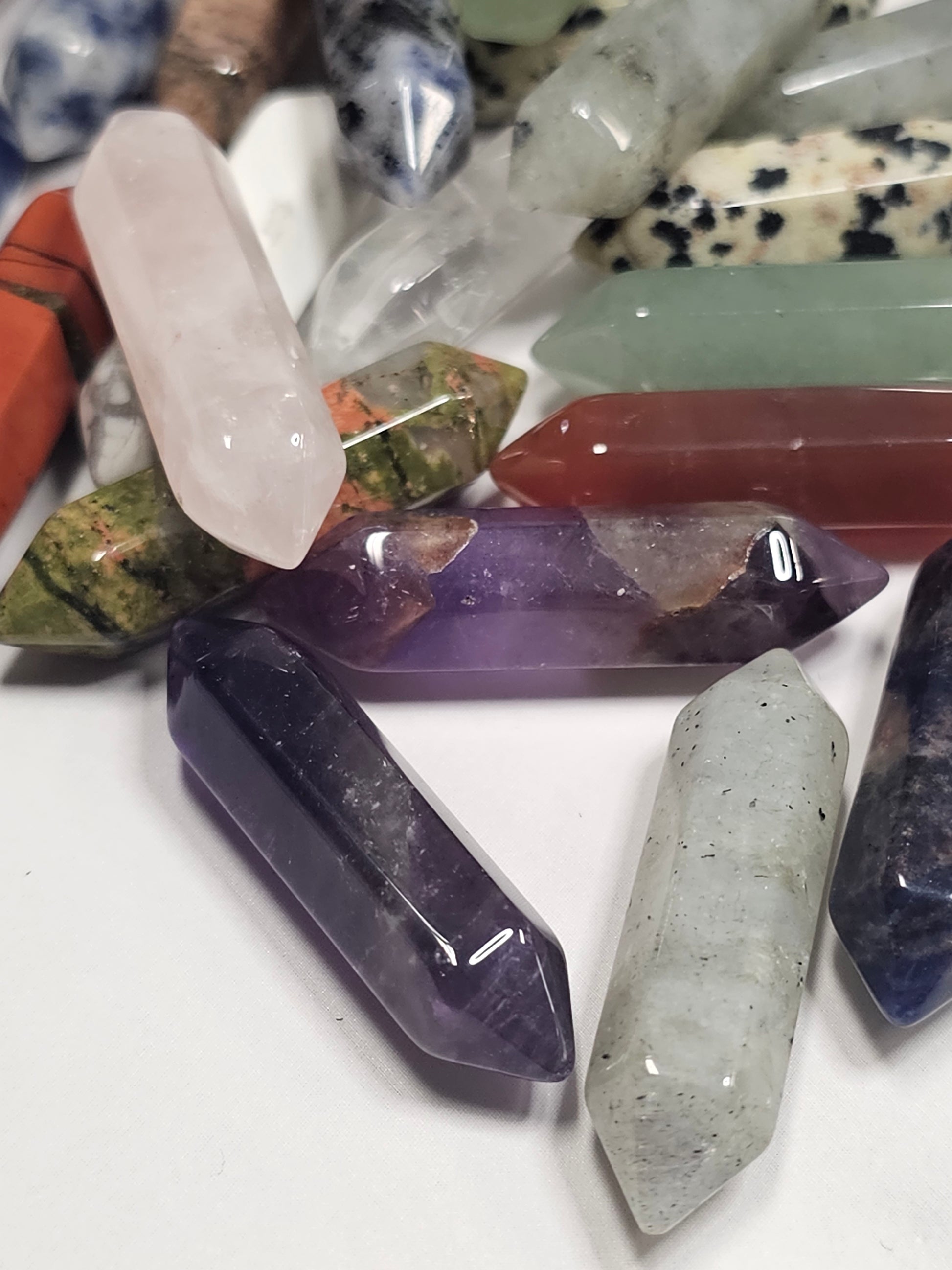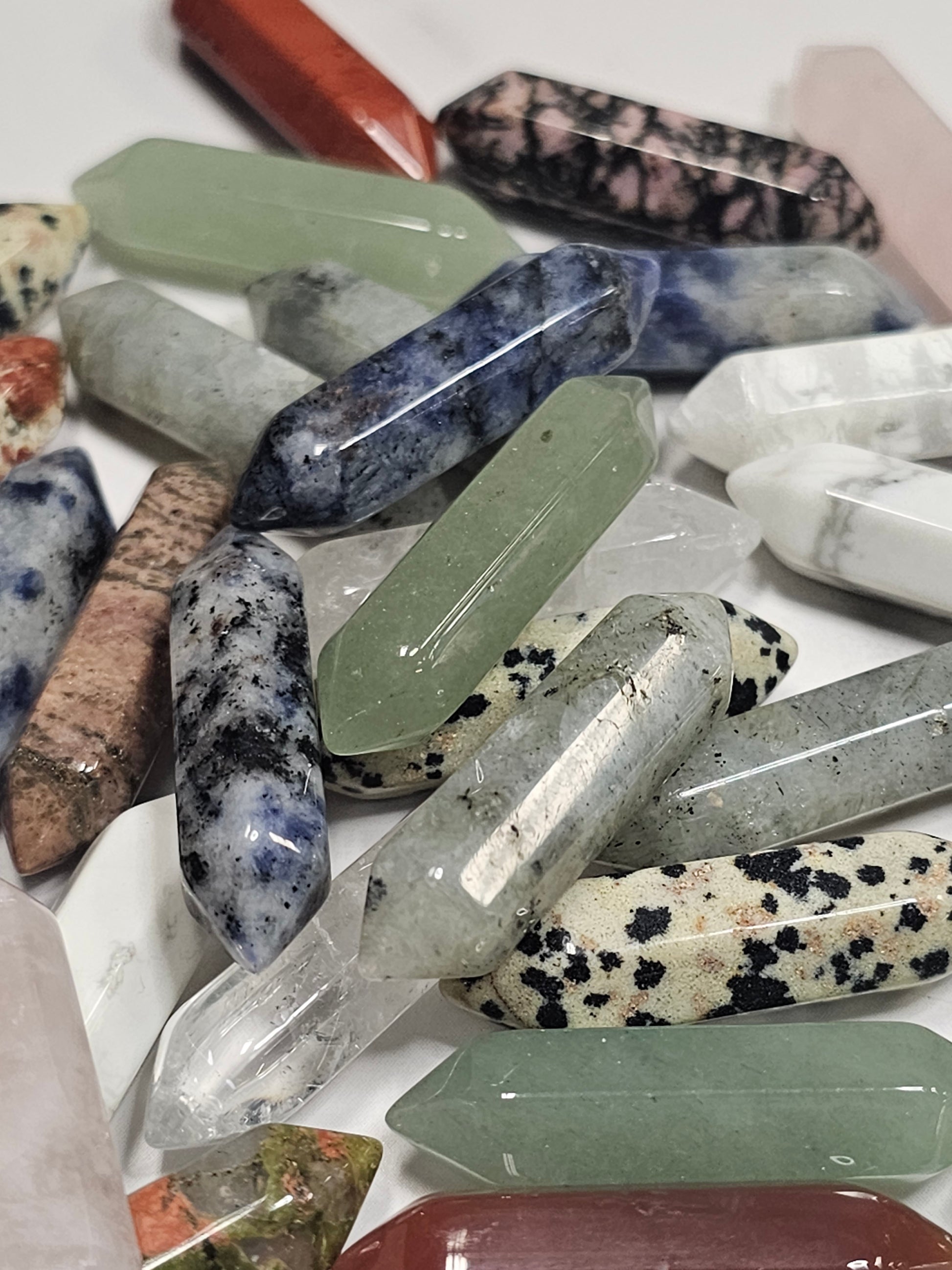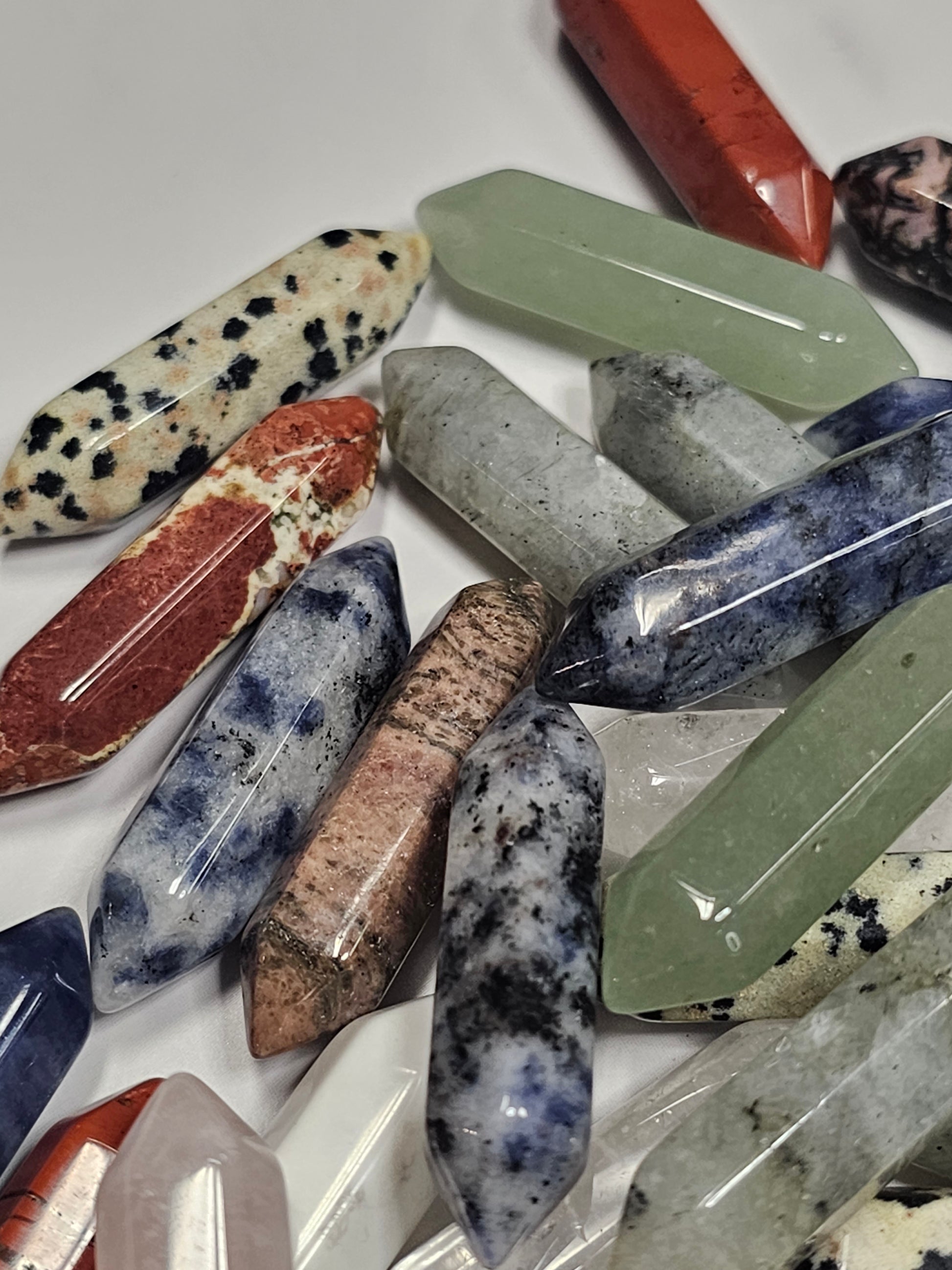 Each mini double terminated point is 33mm or 1.4 inches long. They are perfect for jewelry making or keeping as a pocket or bag stone! They can even be used as a worry stone or given away as gifts. Each one is sent at random. Many possible crystal types including but not limited to Quartz, Rose Quartz, Rhodonite, Unakite, Red Jasper, Amethyst, Lapis Lazuli, Labradorite, Sodalite, Tiger's Eye, Dalmatian Jasper and so much more.