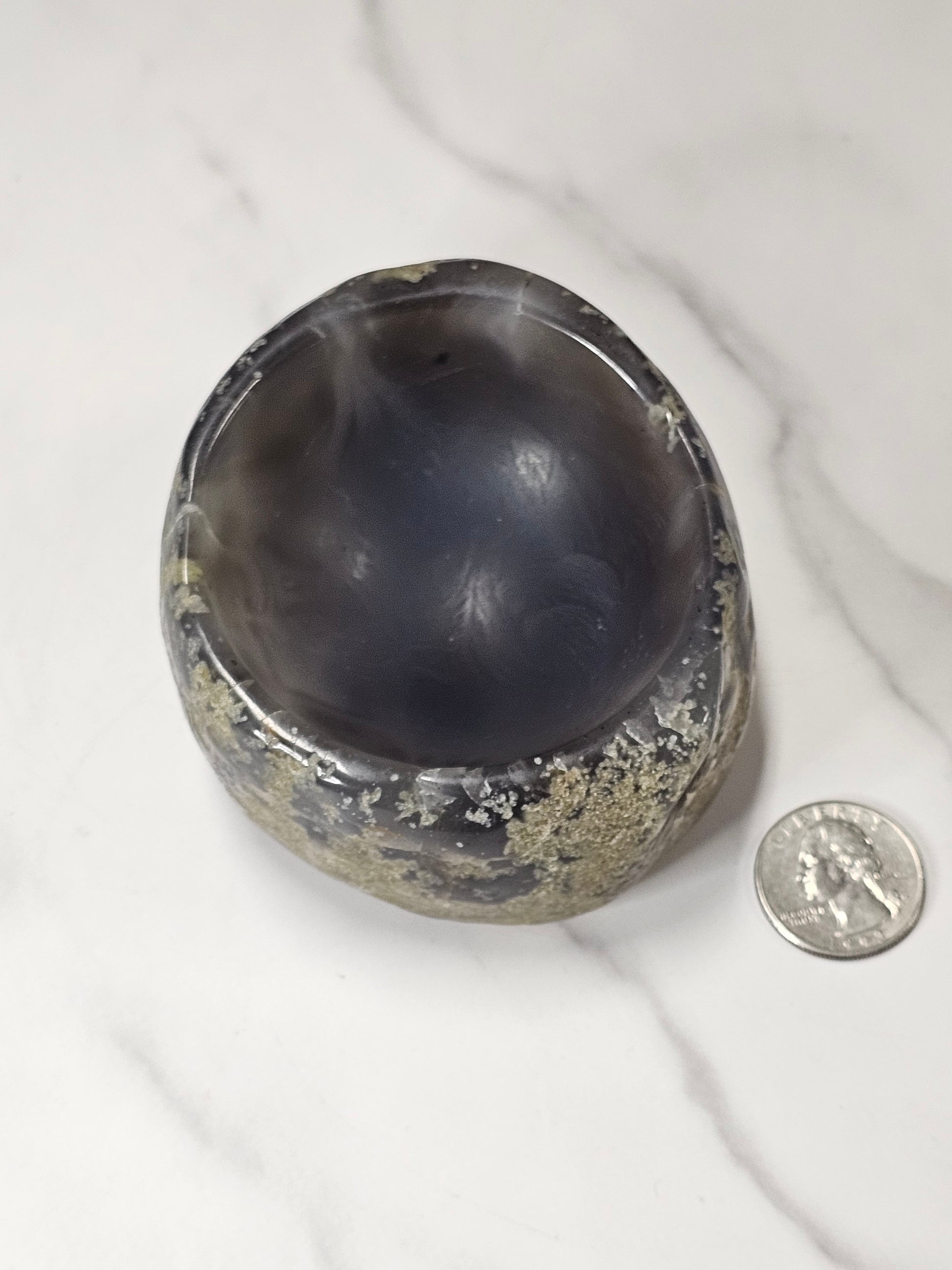 This Agate bowl is pretty deep and is nicely polished on the inside. It is 3.70 inches wide at the widest part and it is 1.91 inches tall. The bowl indent is approximately 1.4 inches deep. The bowl weighs 15.7 ounces.