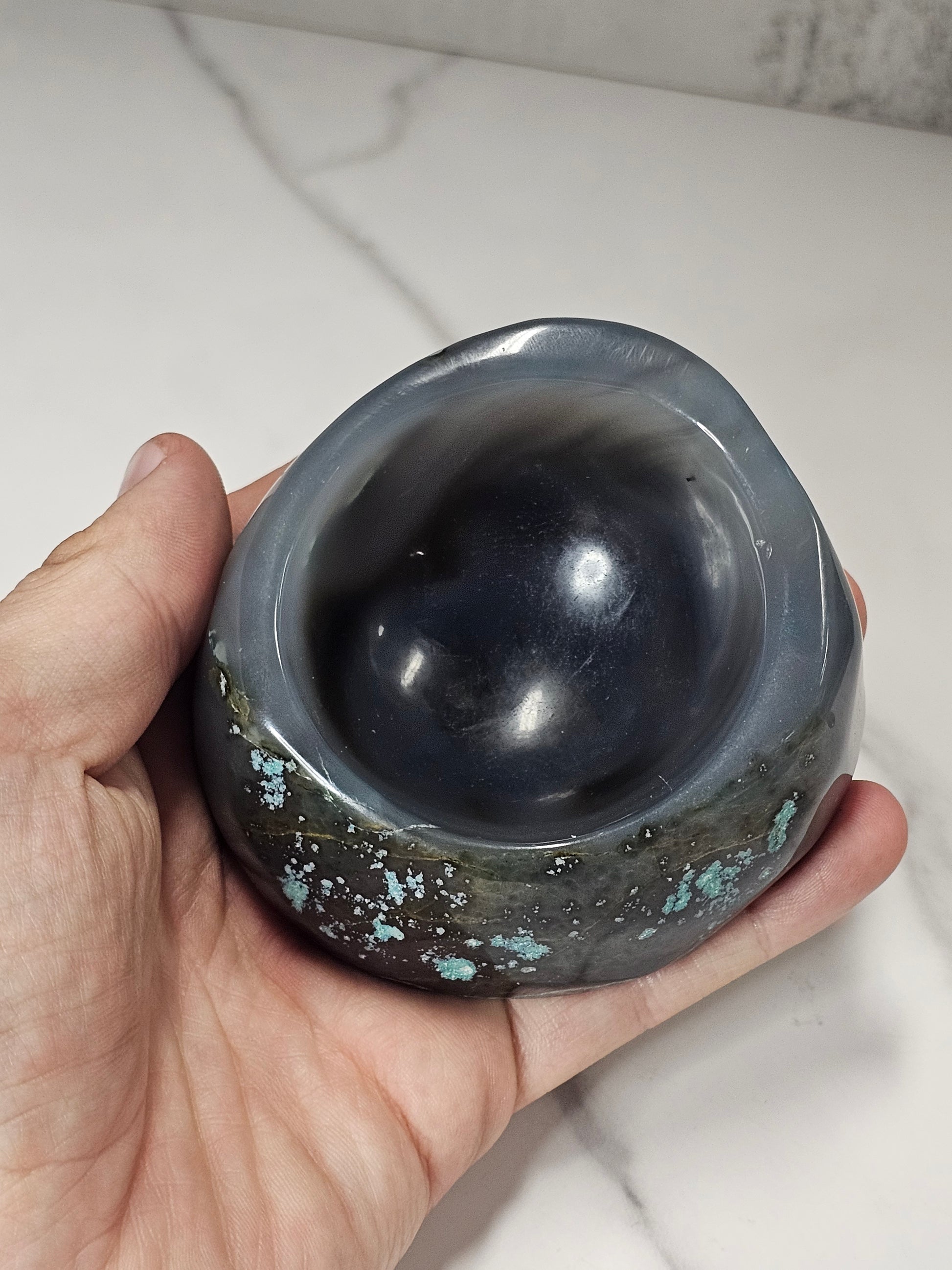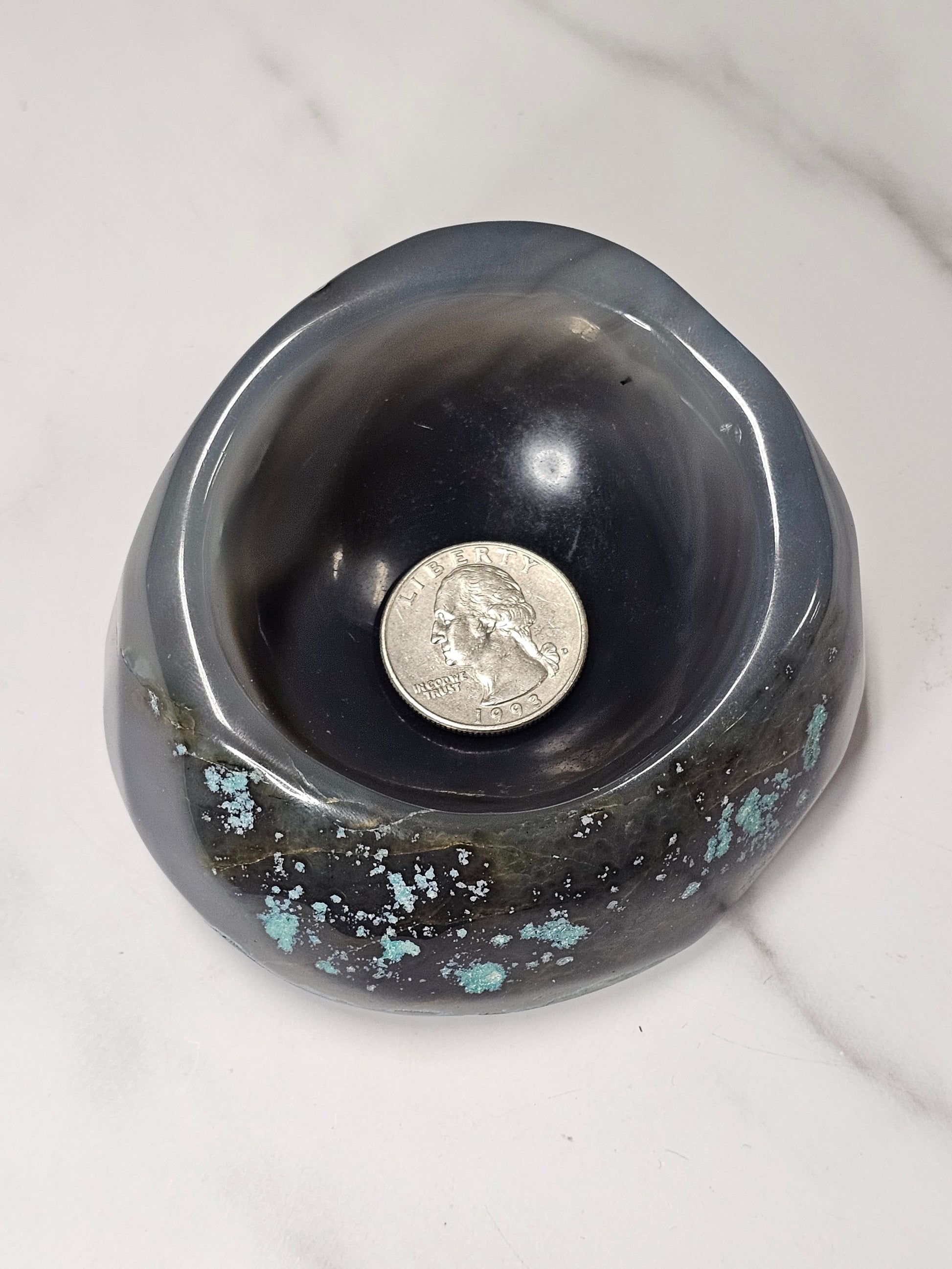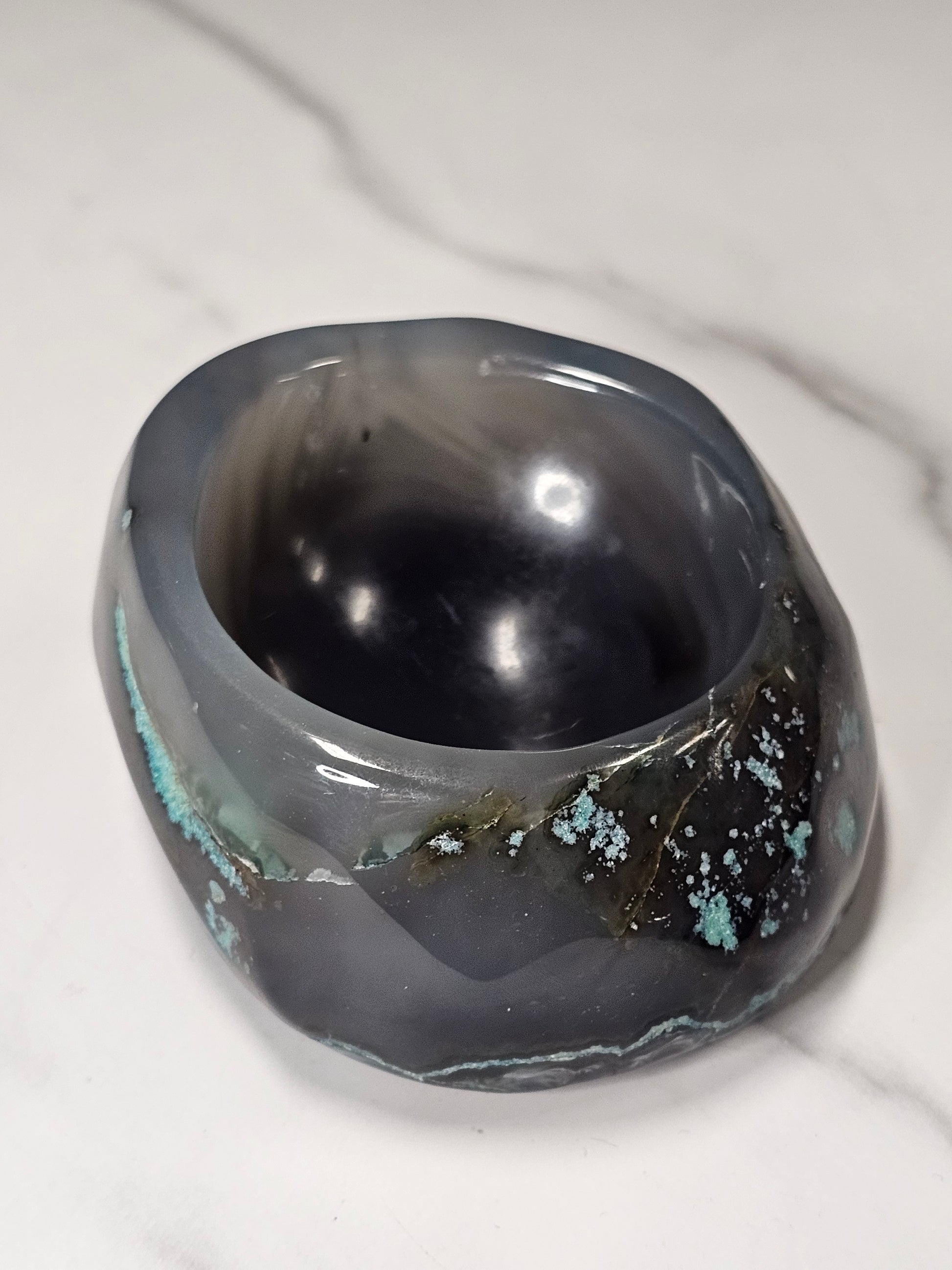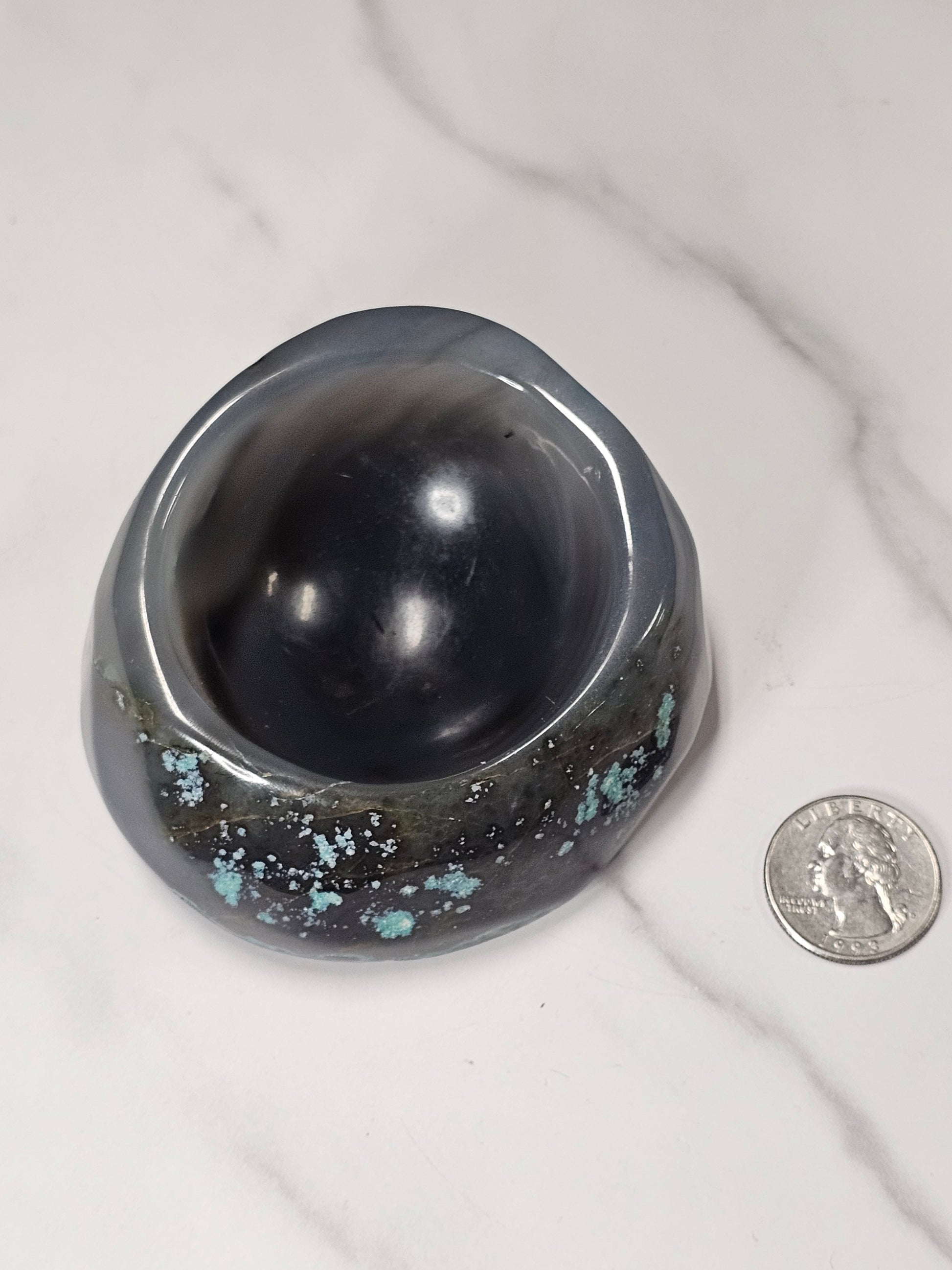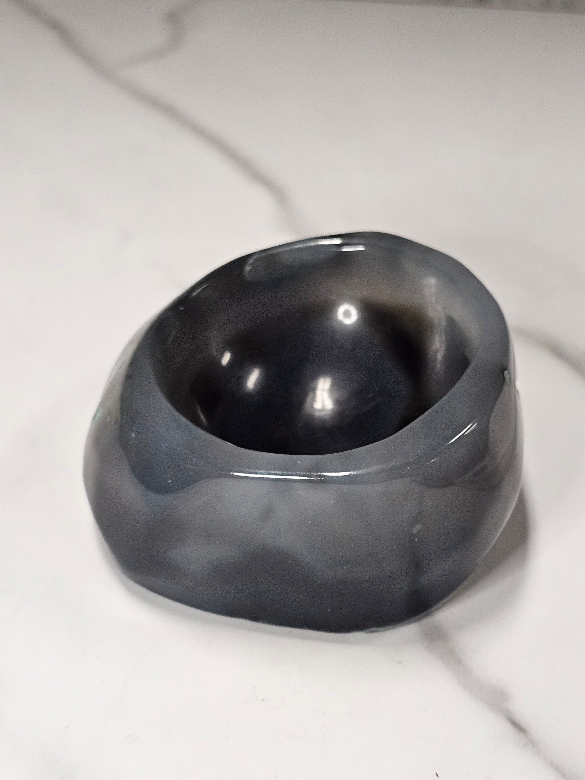 This Agate bowl is nicely polished and smooth. The sides are slightly translucent. It is 3.35 inches at the widest part and it stands 1.57 inches tall. The bowl indent is approximately 1.35 inches deep. It weighs 11.6 ounces.
