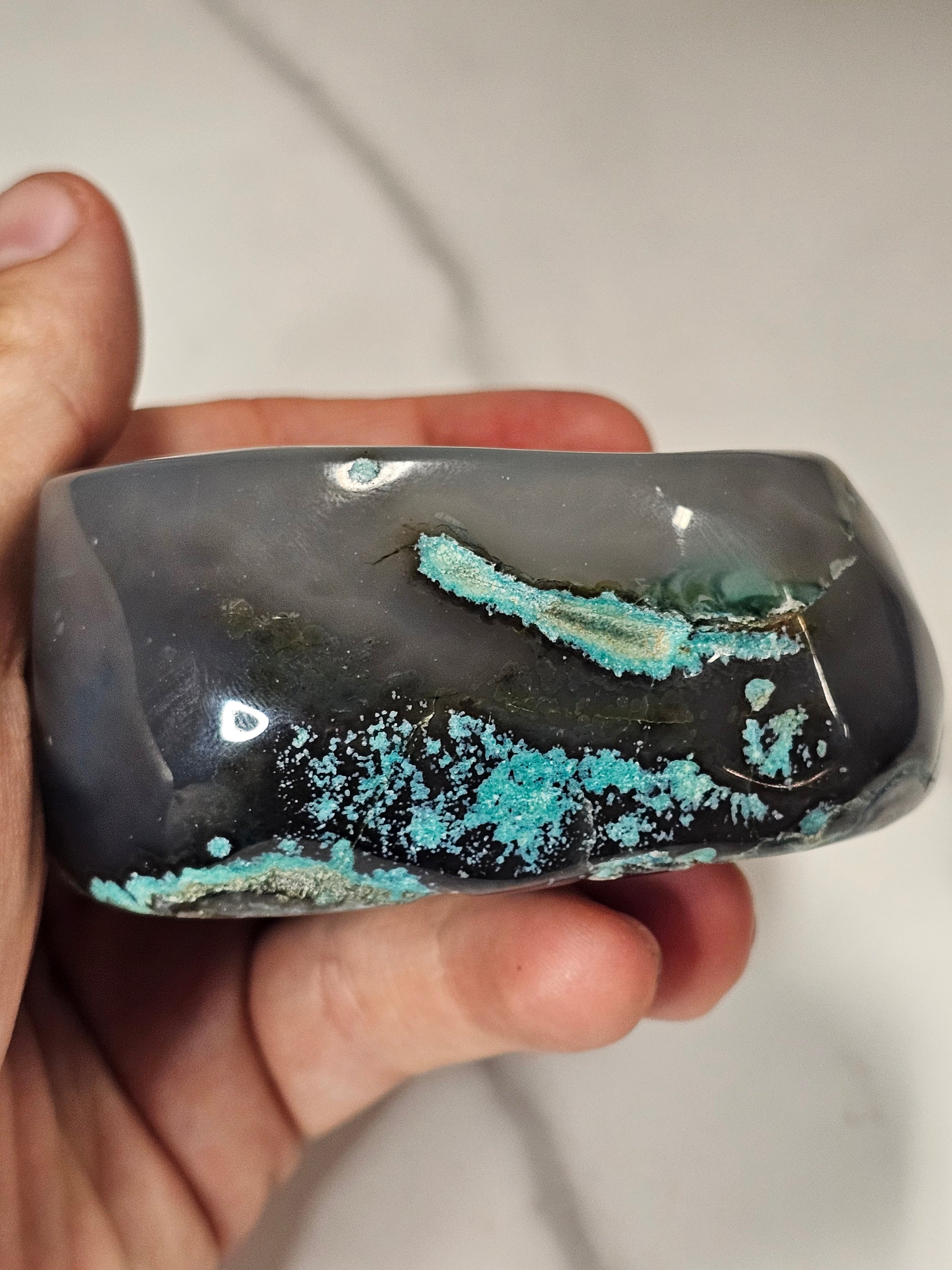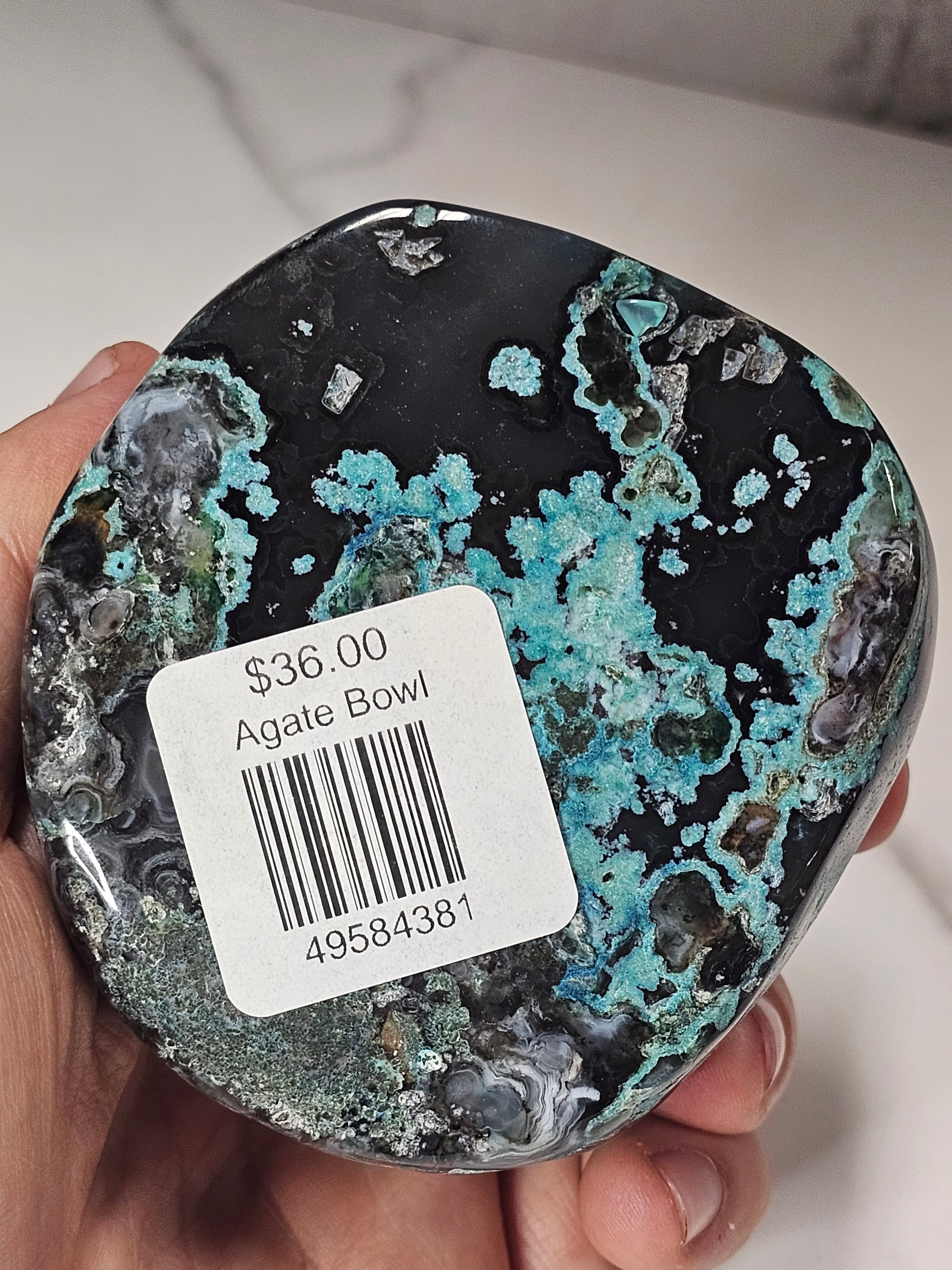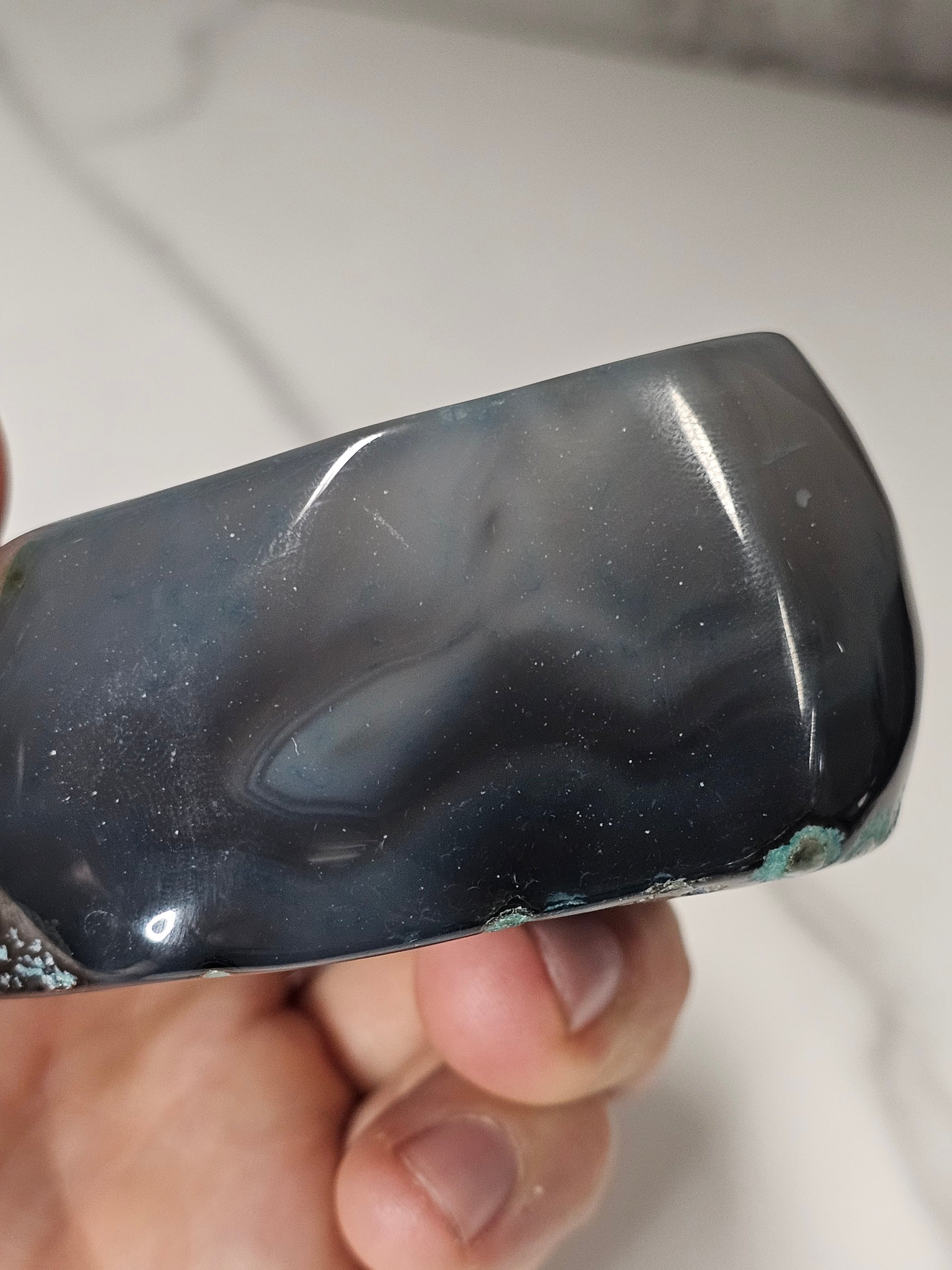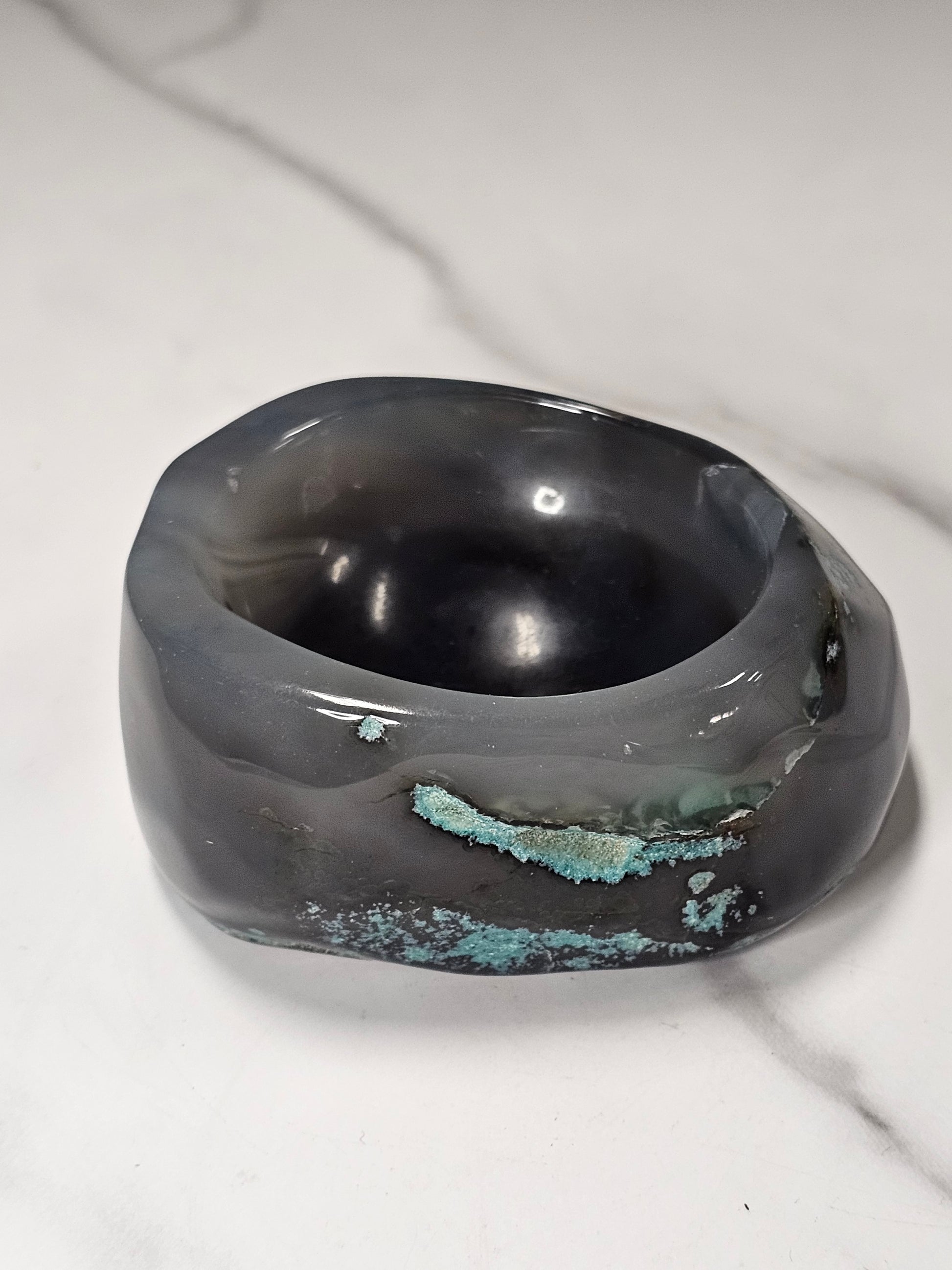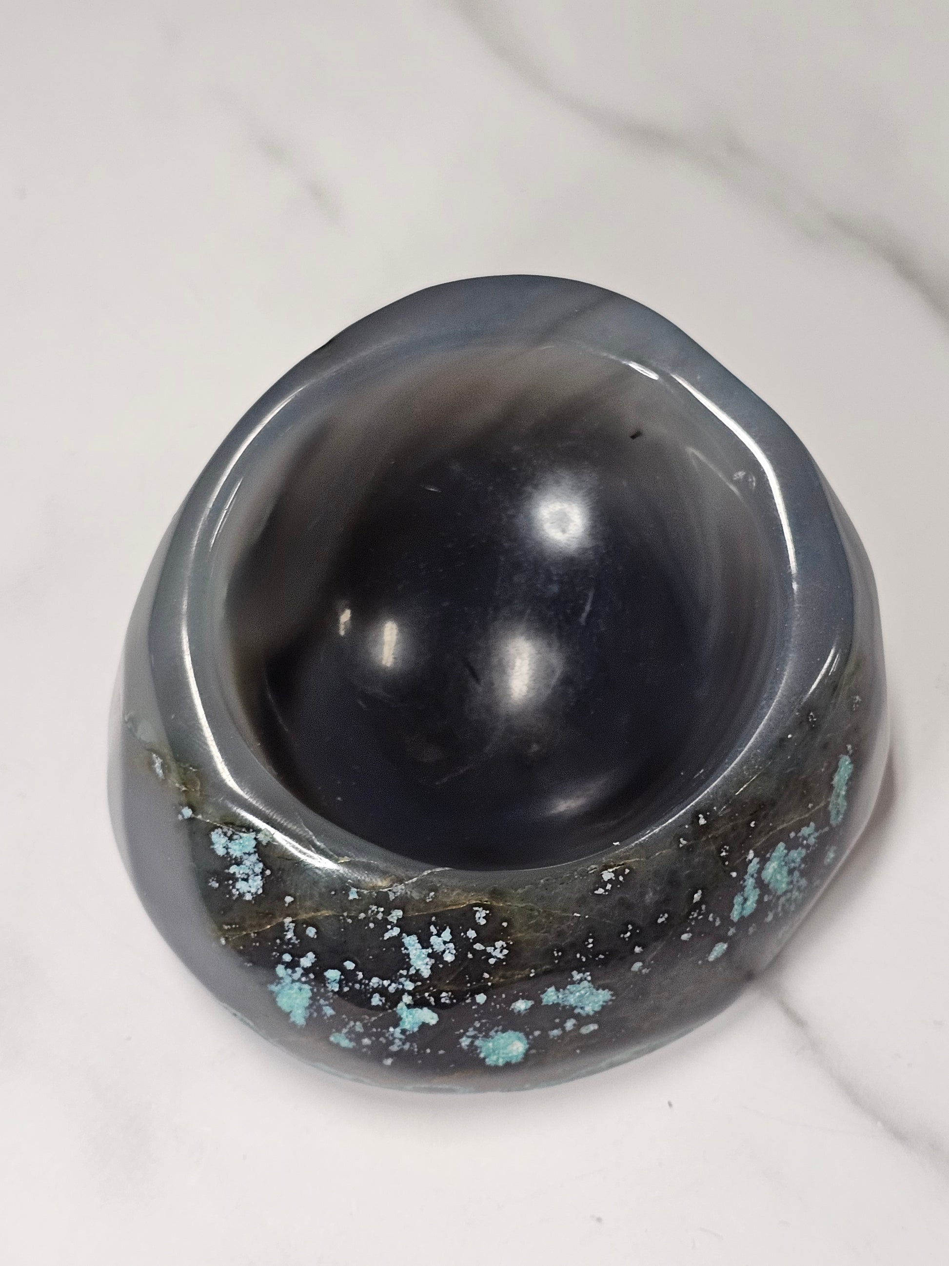 This Agate bowl is nicely polished and smooth. The sides are slightly translucent. It is 3.35 inches at the widest part and it stands 1.57 inches tall. The bowl indent is approximately 1.35 inches deep. It weighs 11.6 ounces.