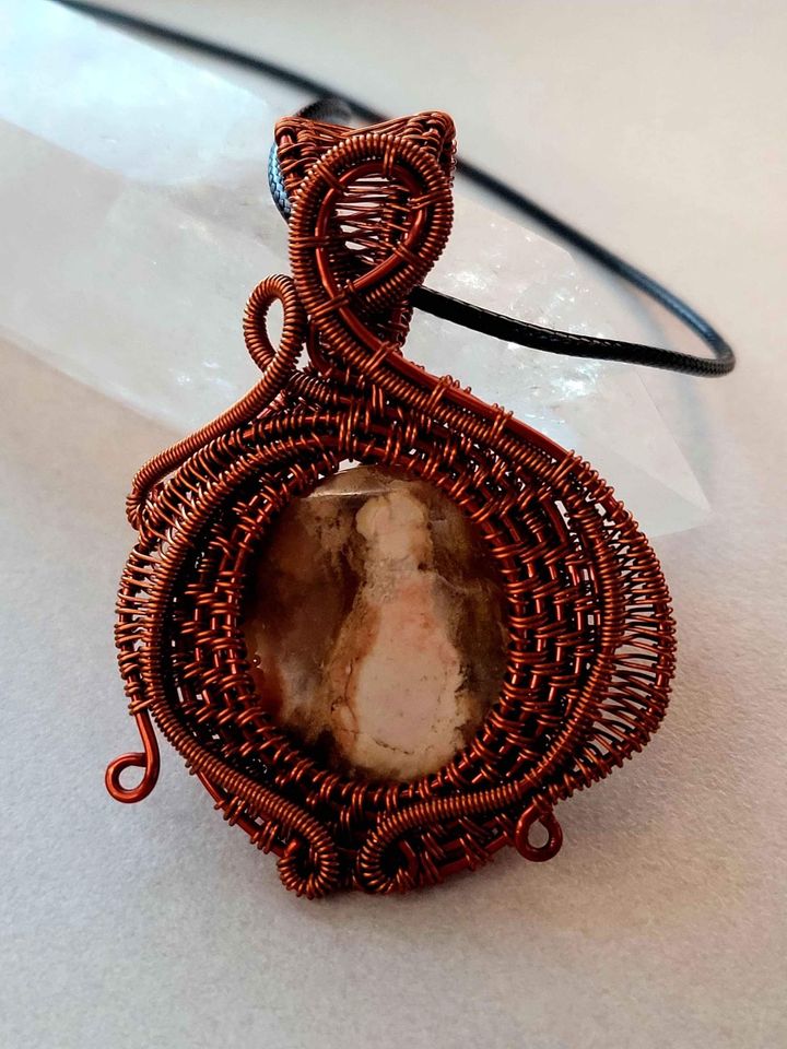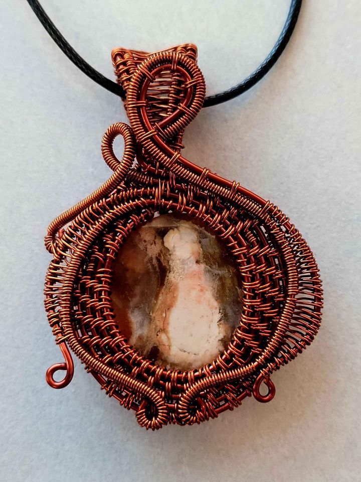 This Agate cabochon is wrapped in lots of copper wire. It hangs on an 18" black waxed cord with metal clasps