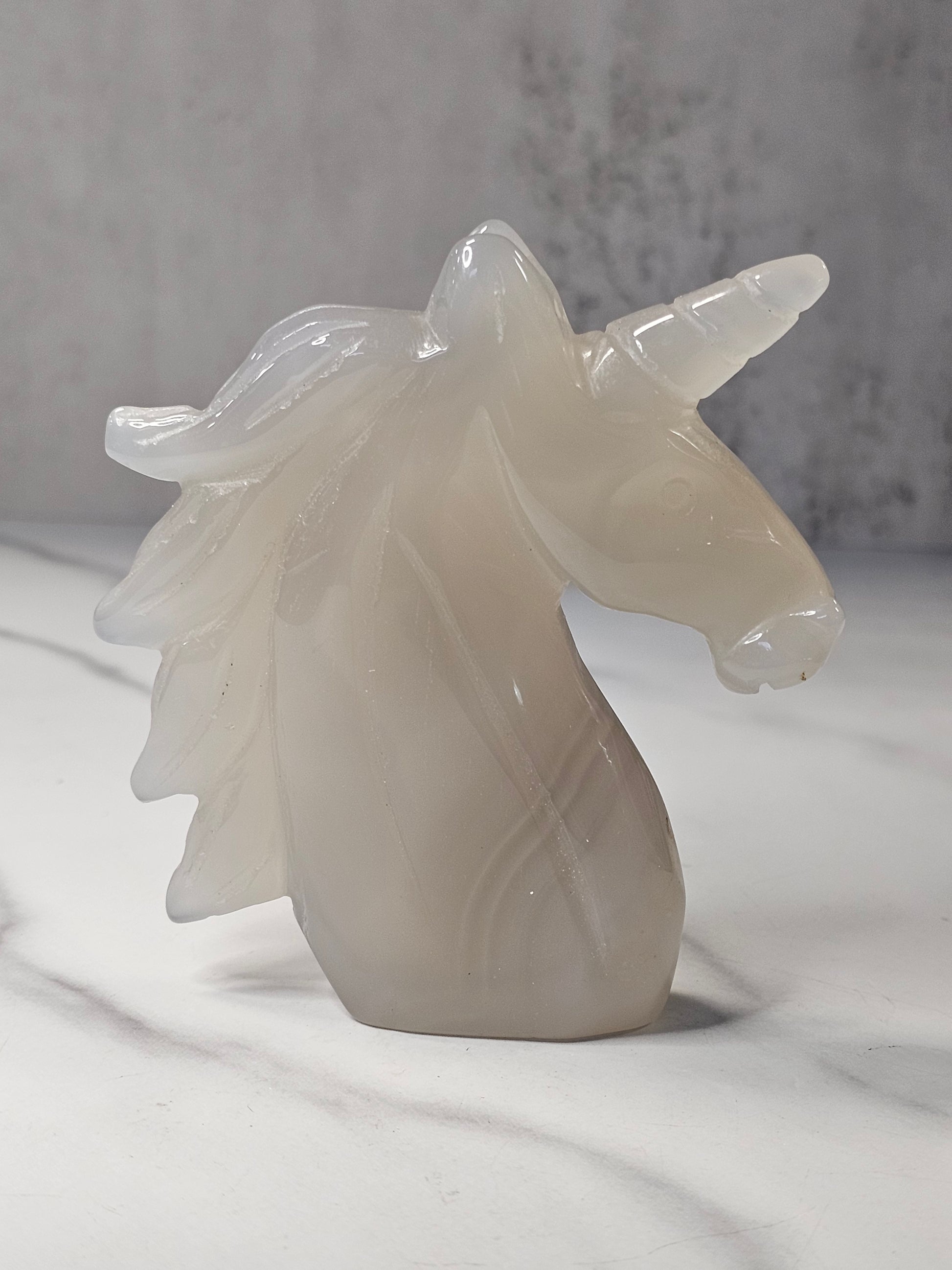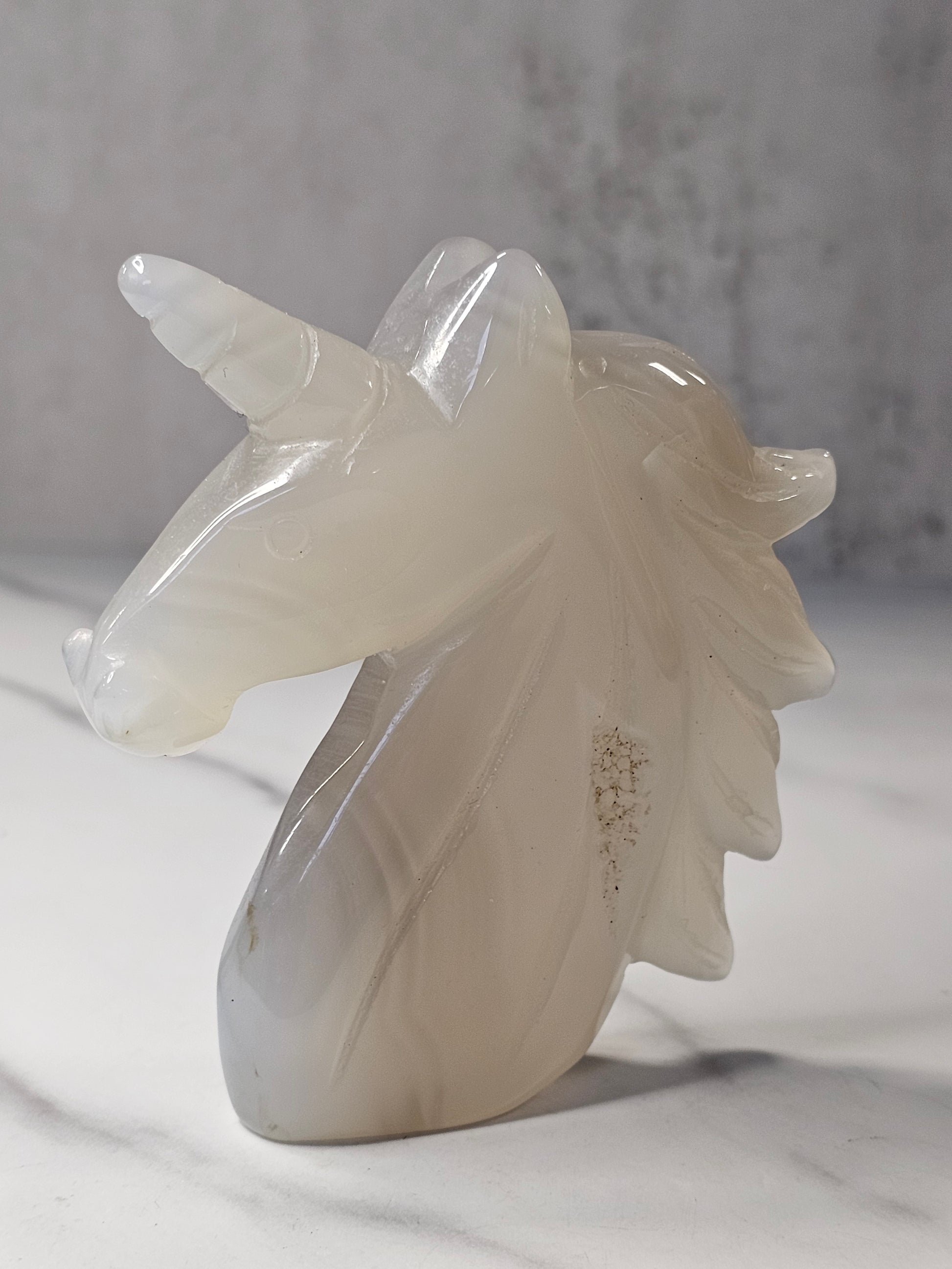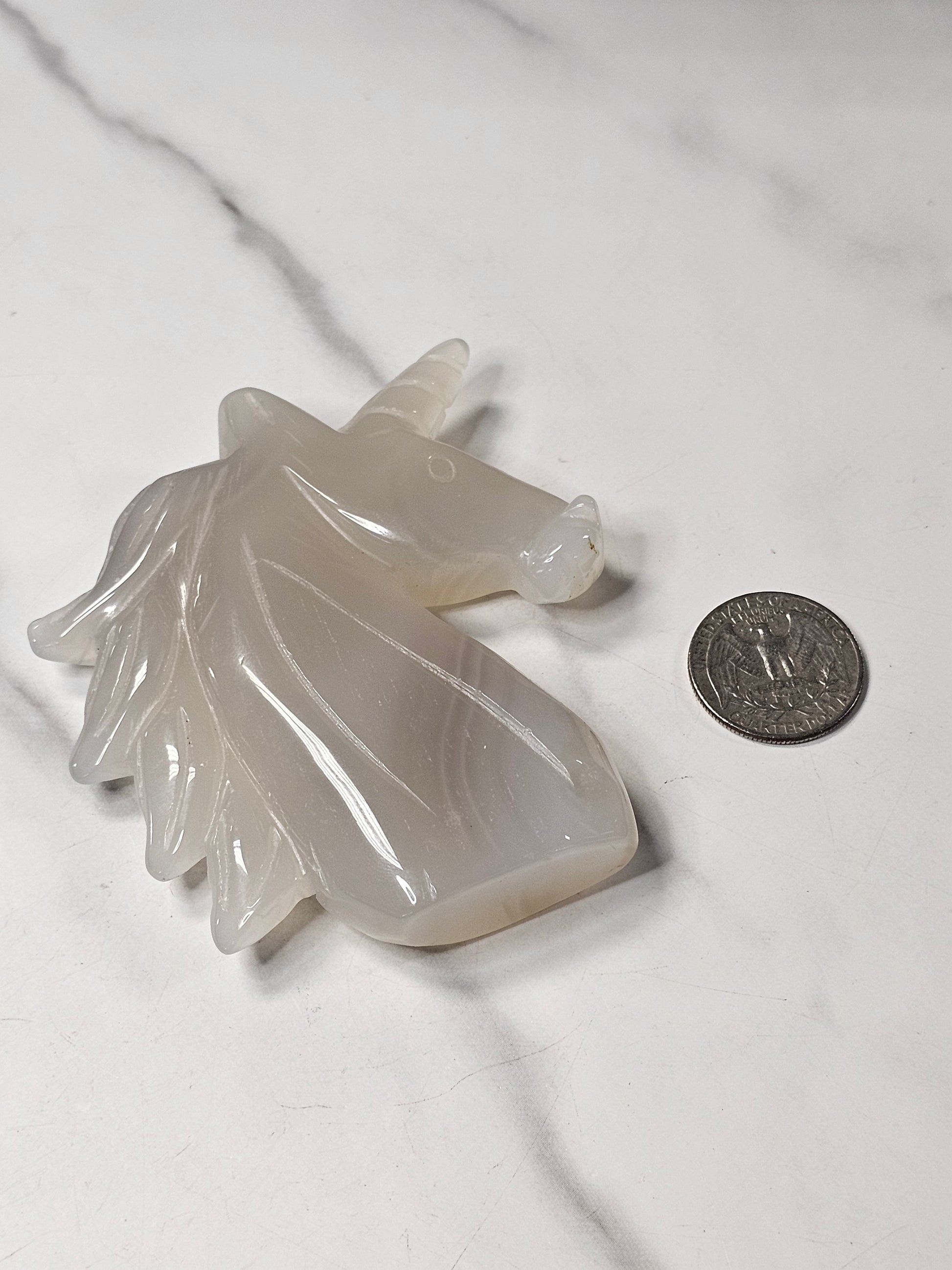 This agate unicorn head carving is 3.37 inches tall and 3.12 inches wide.