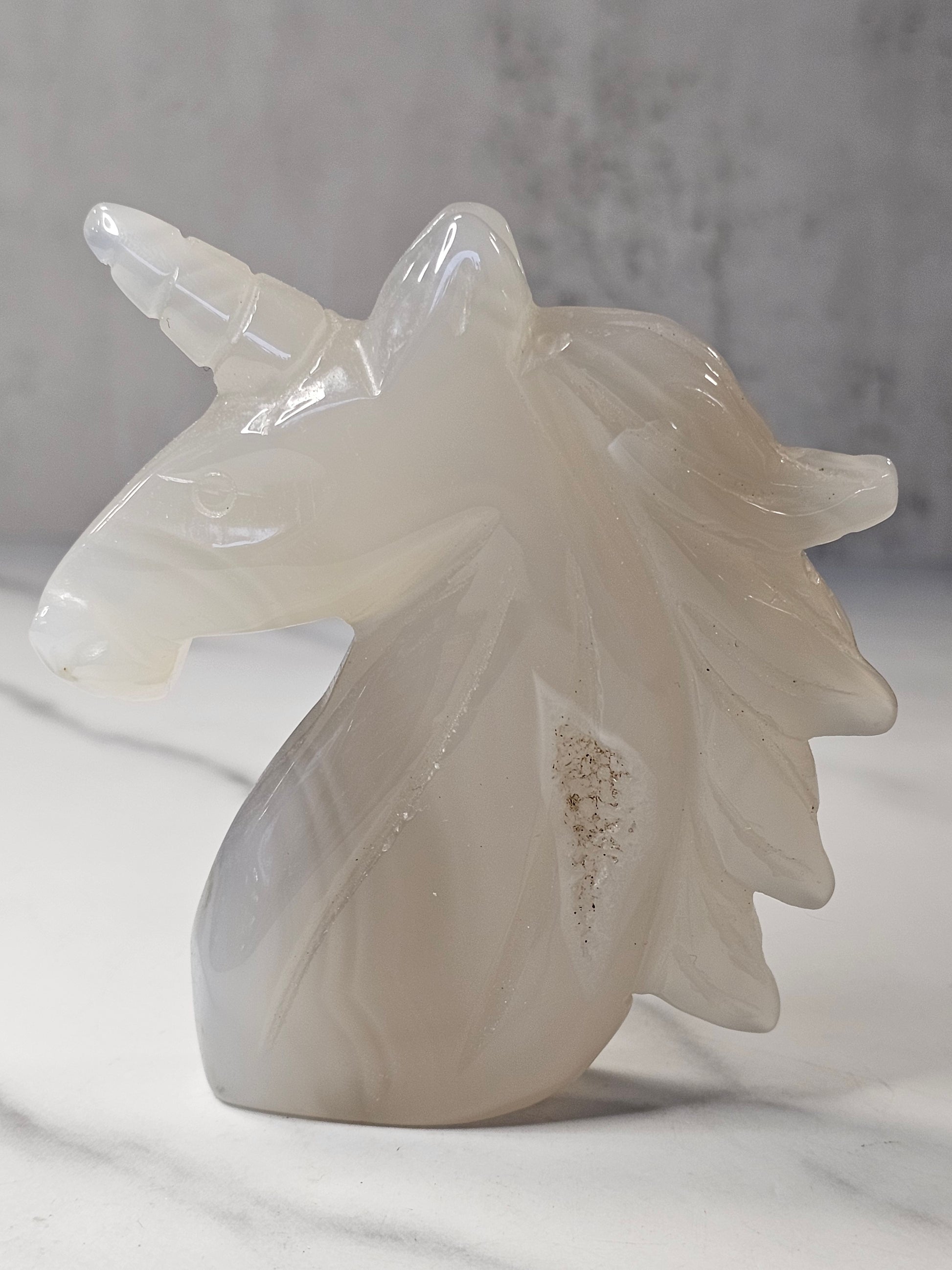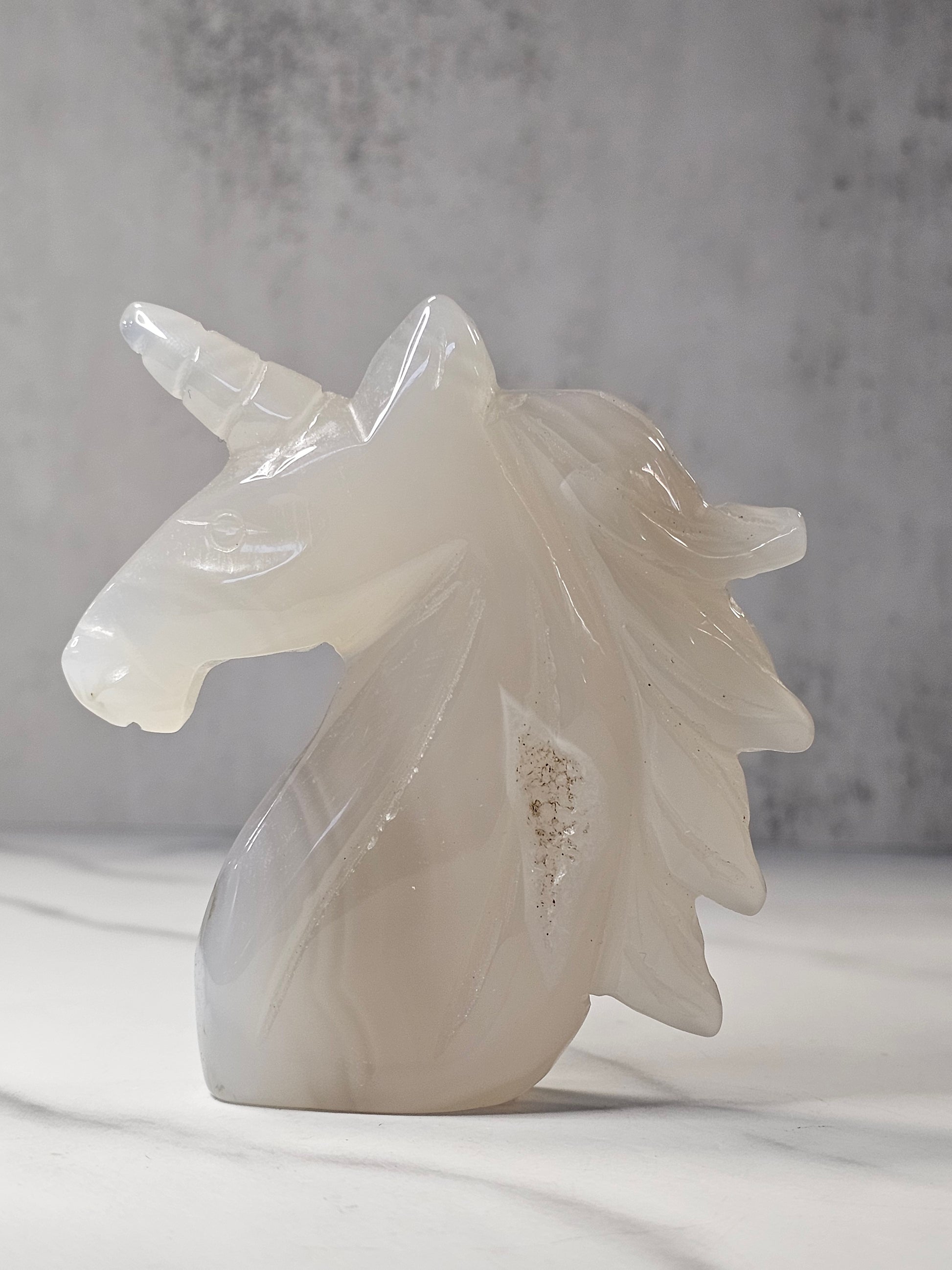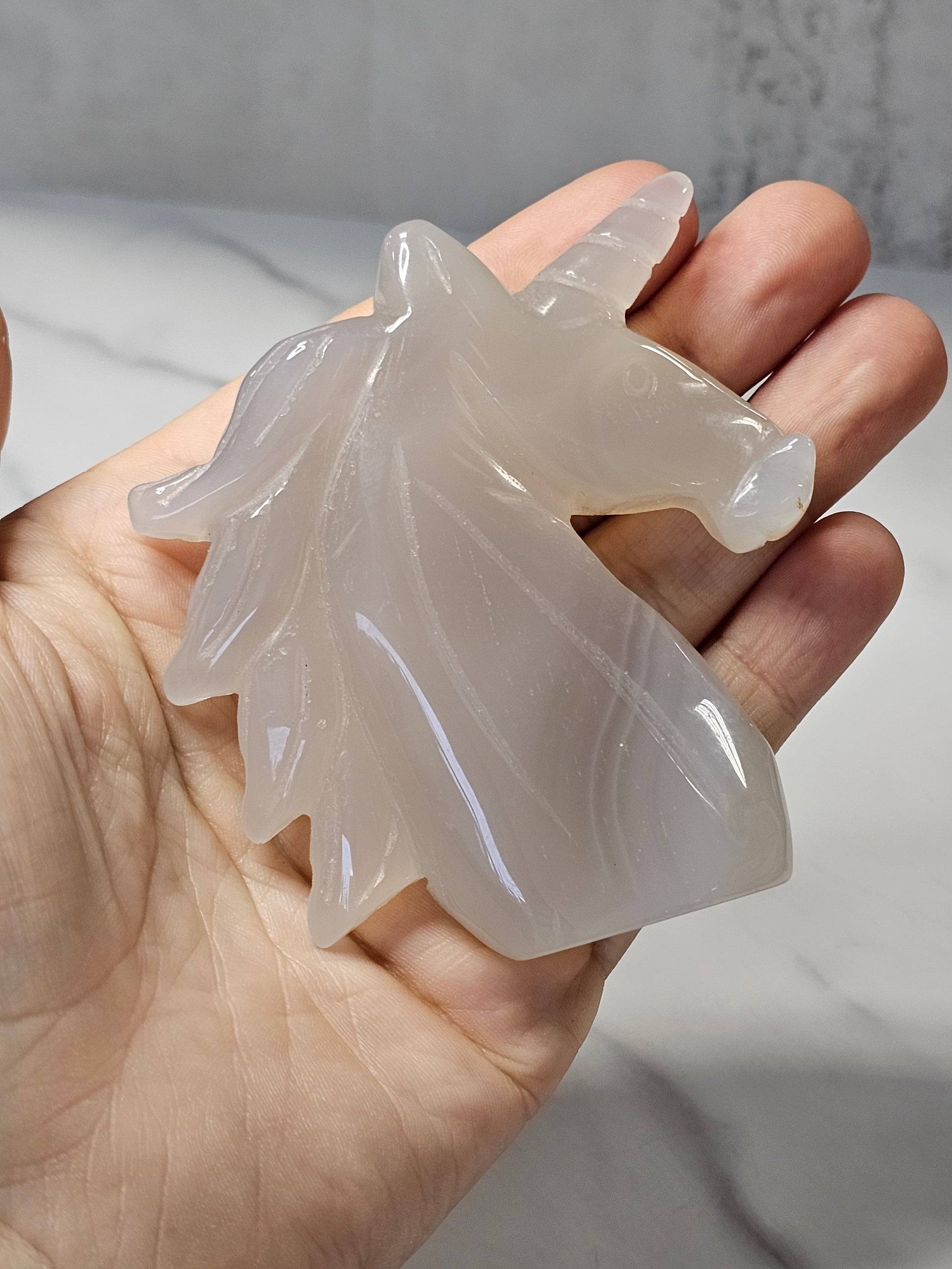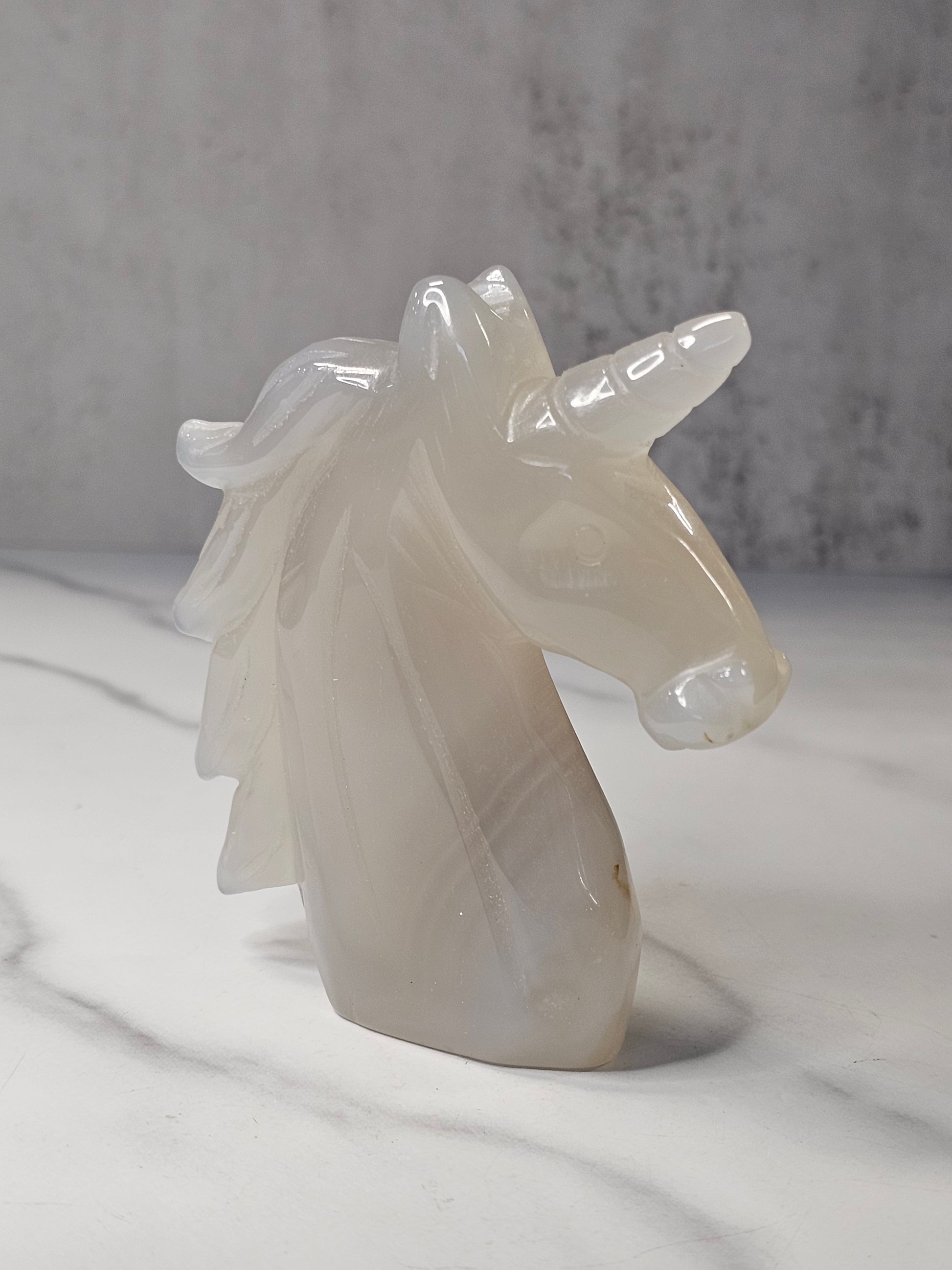 This agate unicorn head carving is 3.37 inches tall and 3.12 inches wide.