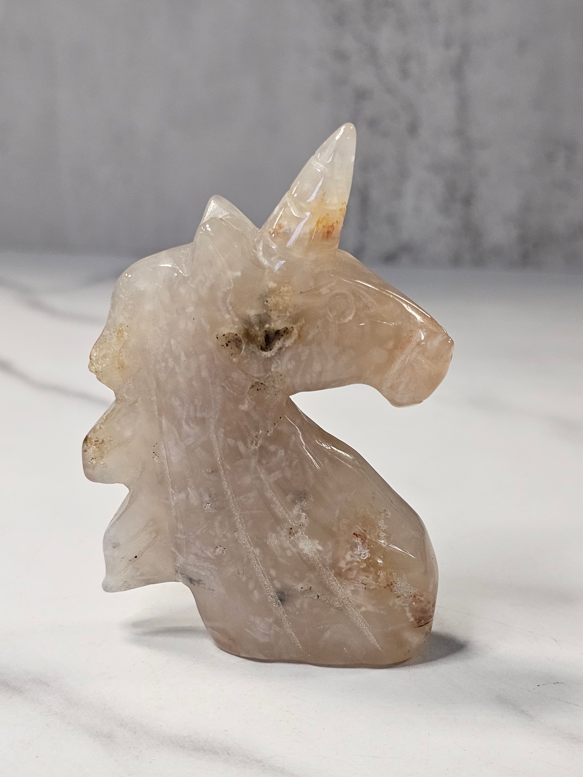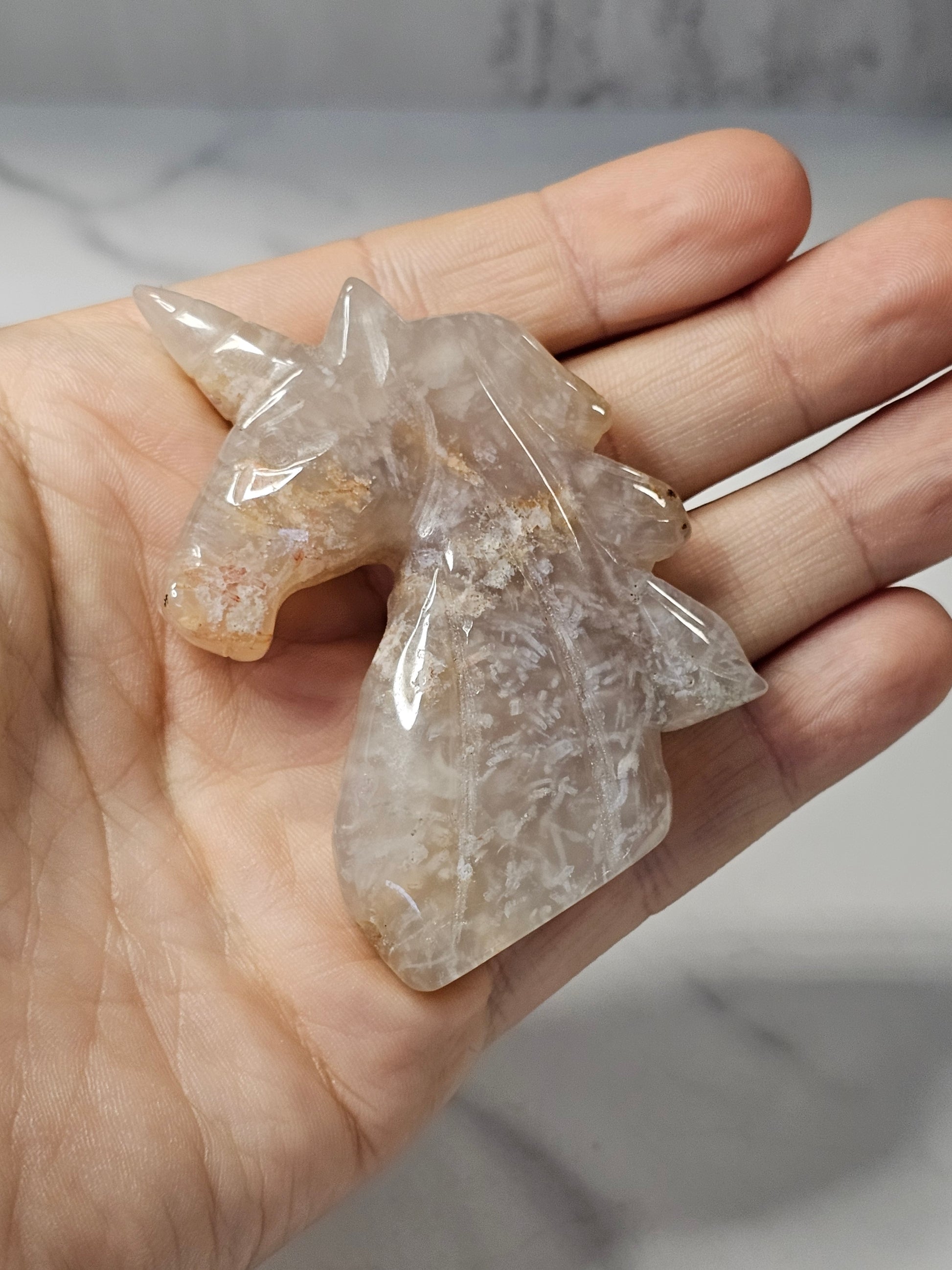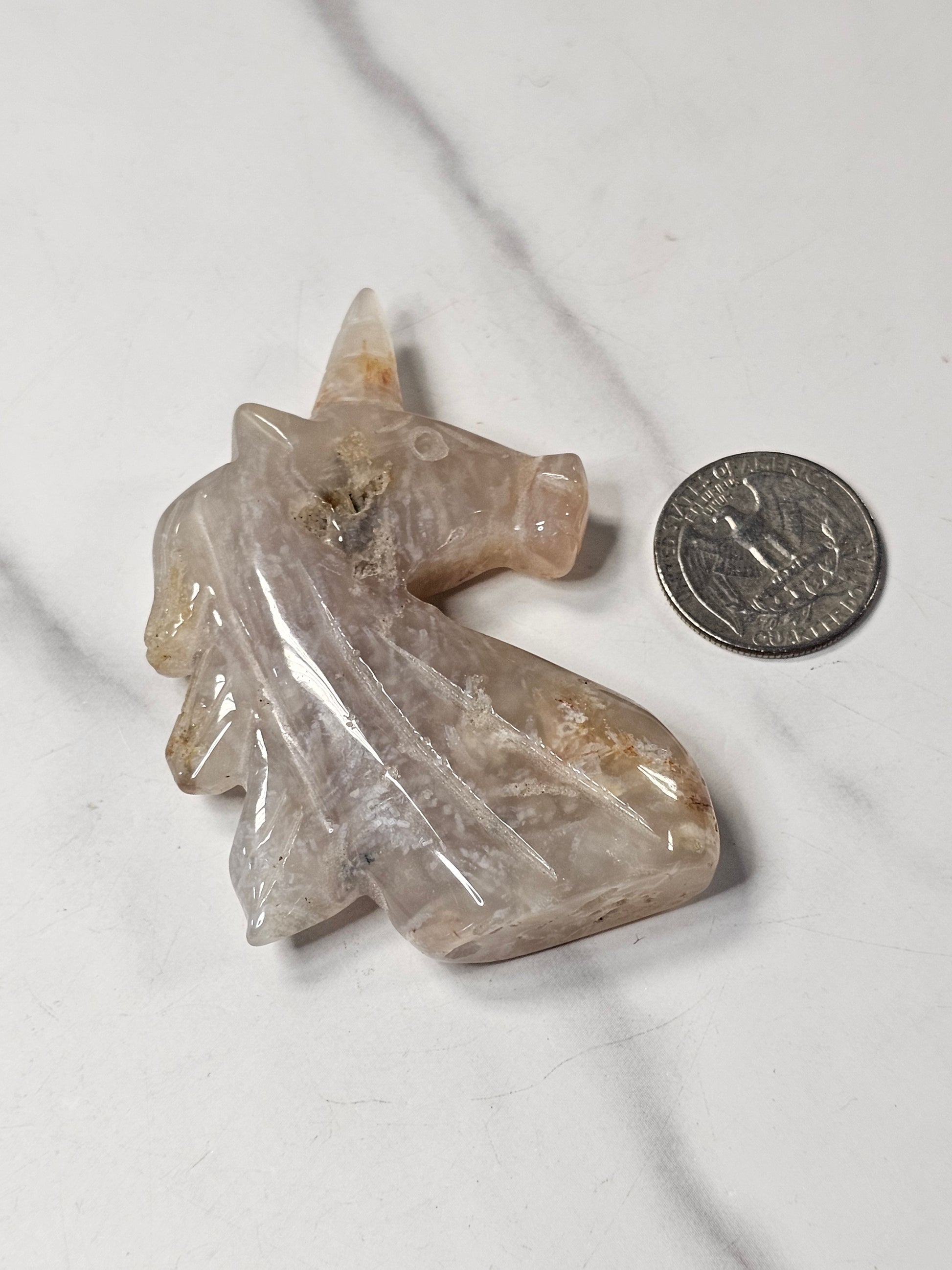 This agate unicorn head carving is 2.91 inches tall and 1.95 inches wide.