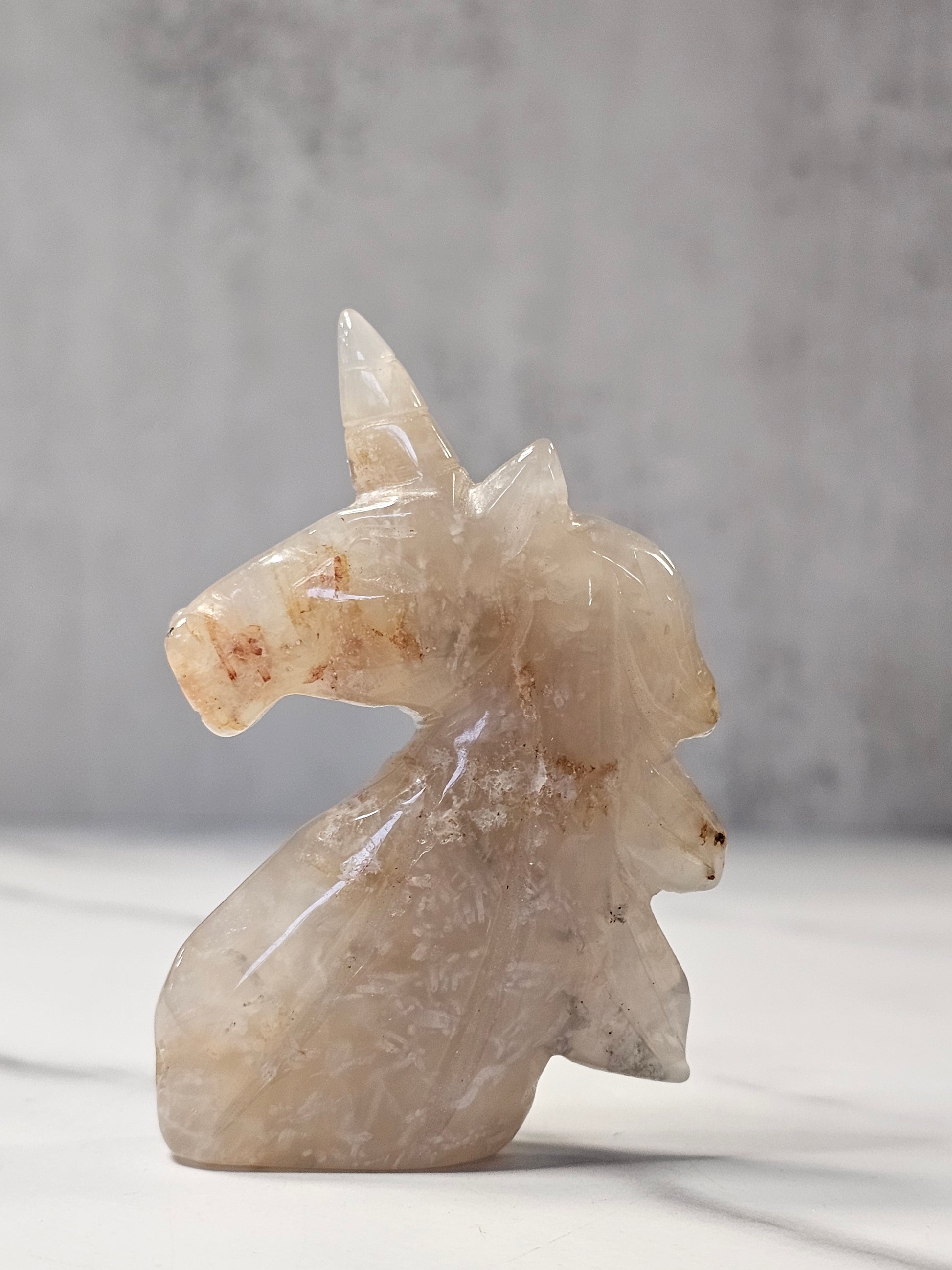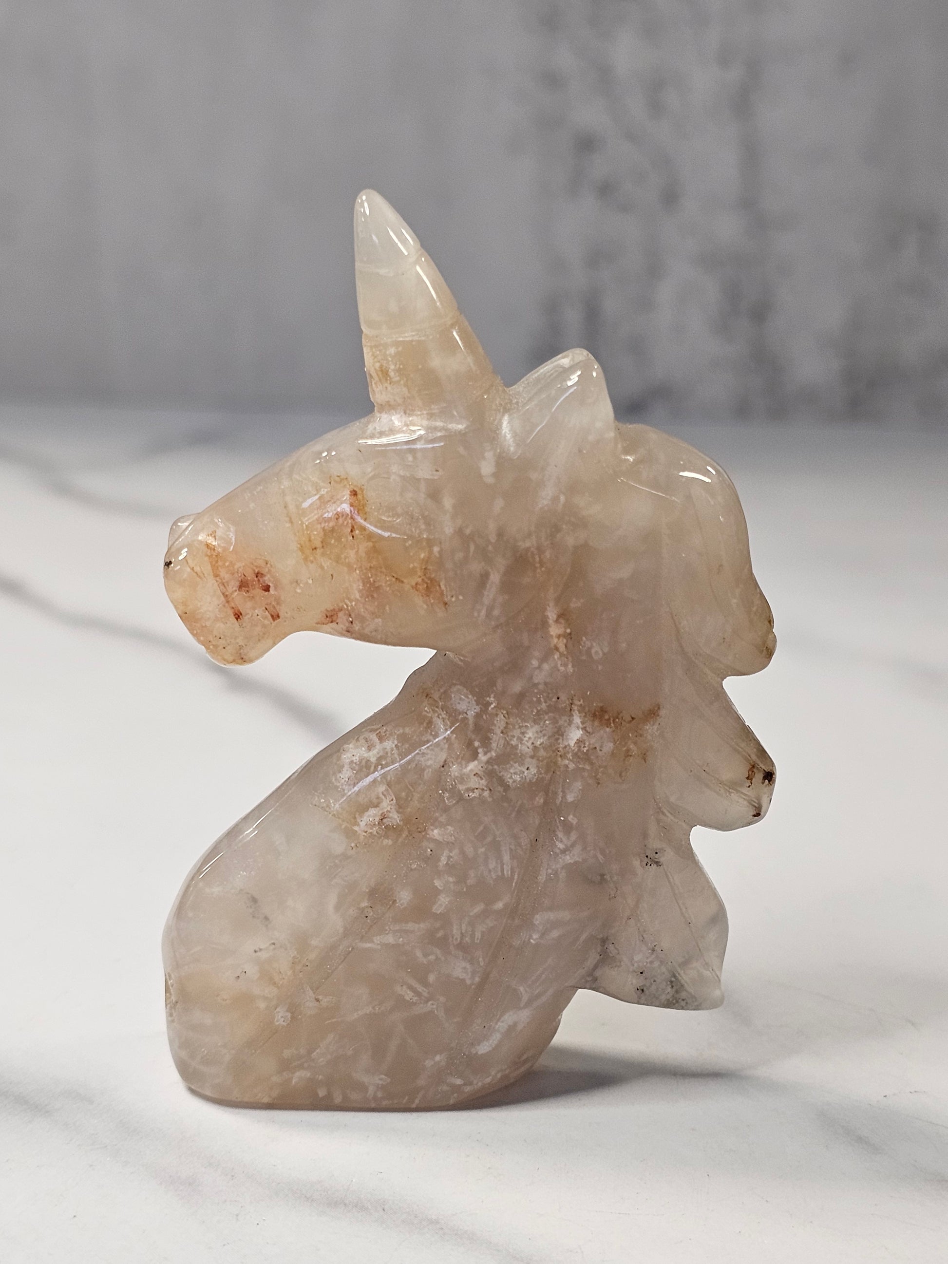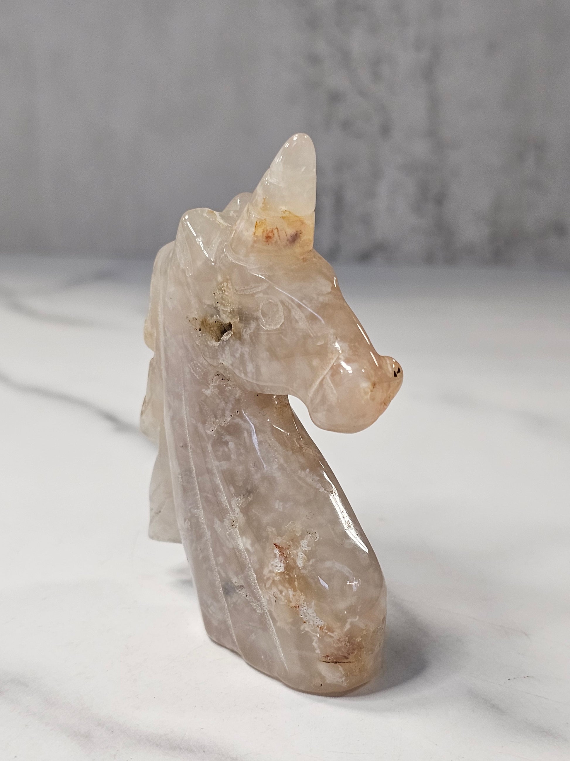 This agate unicorn head carving is 2.91 inches tall and 1.95 inches wide.