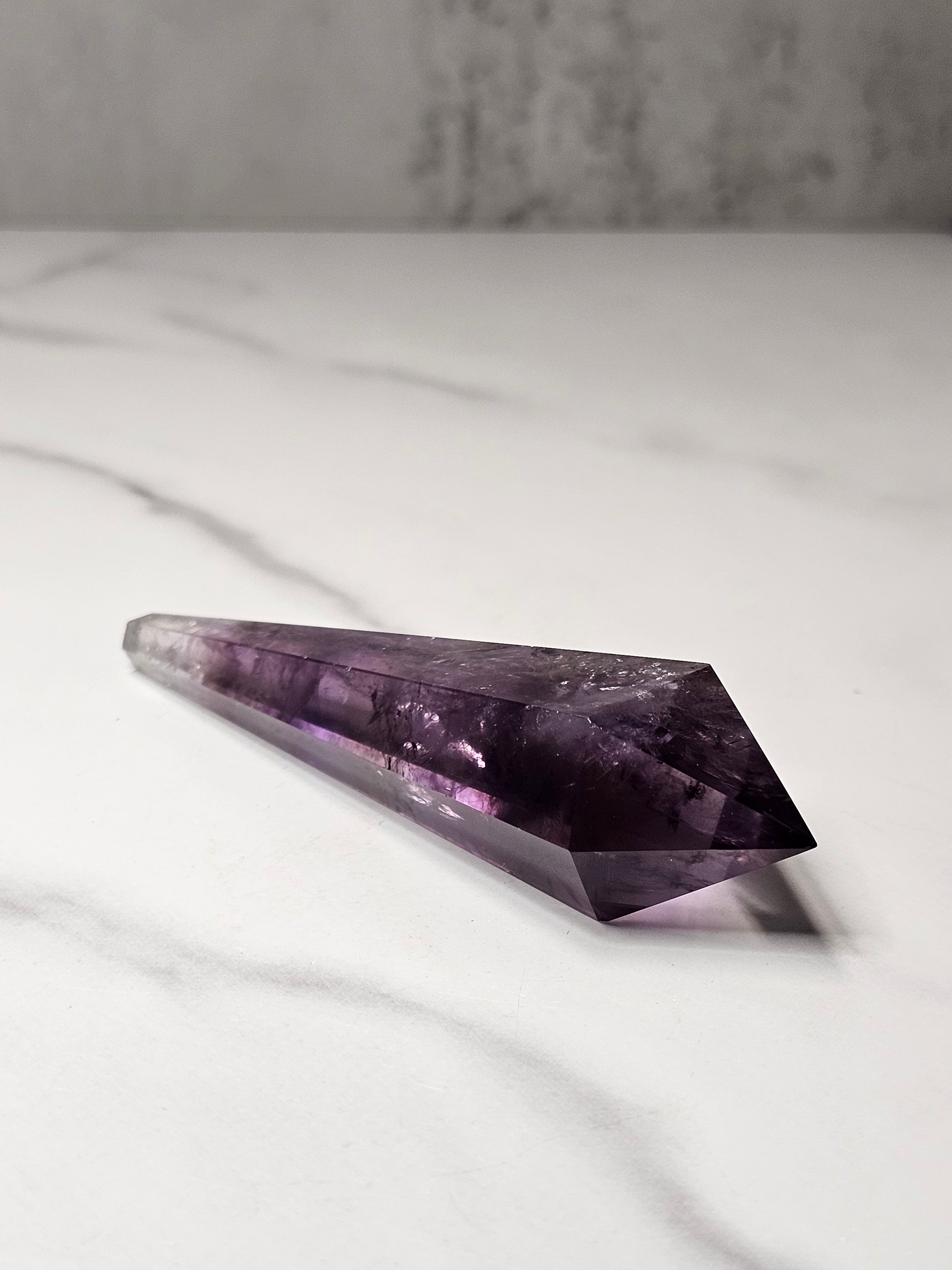 This Amethyst scepter has some faint yellow Ametrine spots inside and is a beautiful, gemmy, translucent purple.