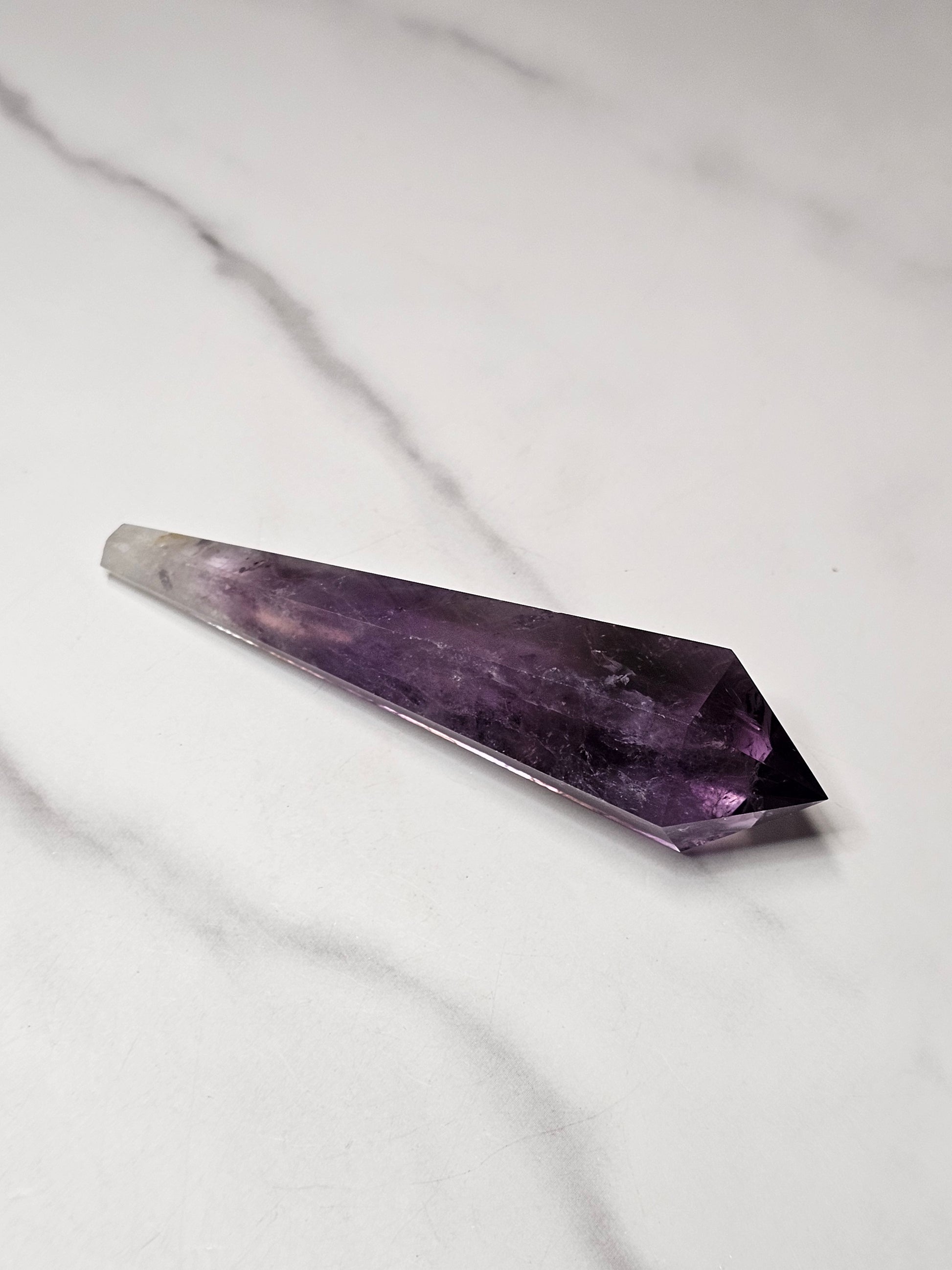 This Amethyst scepter has some faint yellow Ametrine spots inside and is a beautiful, gemmy, translucent purple.