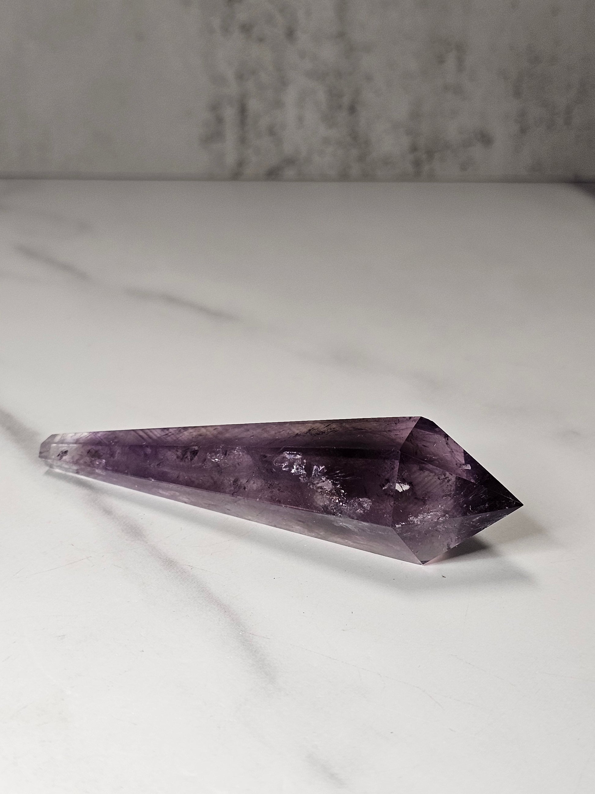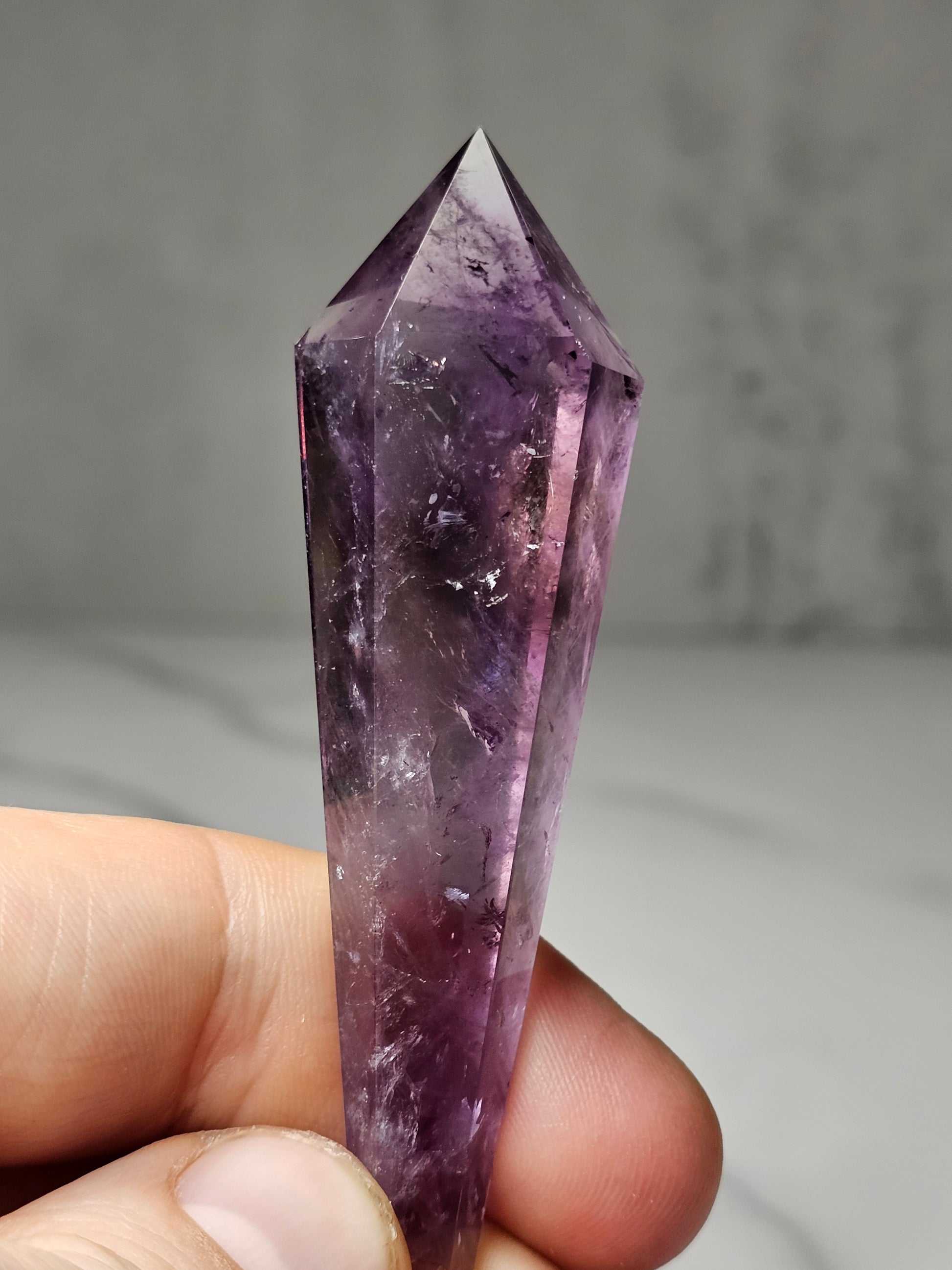 This Amethyst scepter has some faint yellow Ametrine spots inside and is a beautiful, gemmy, translucent purple.