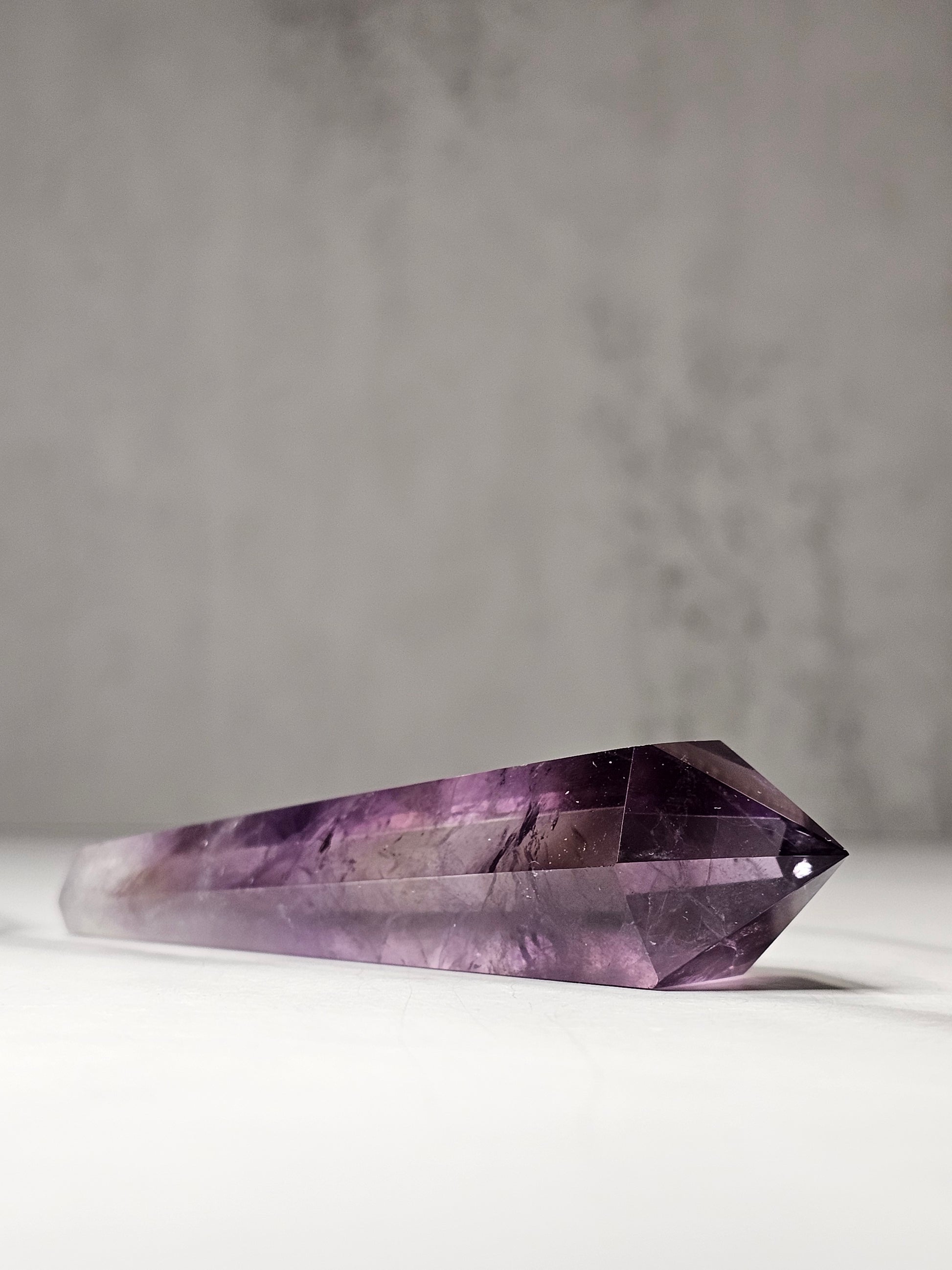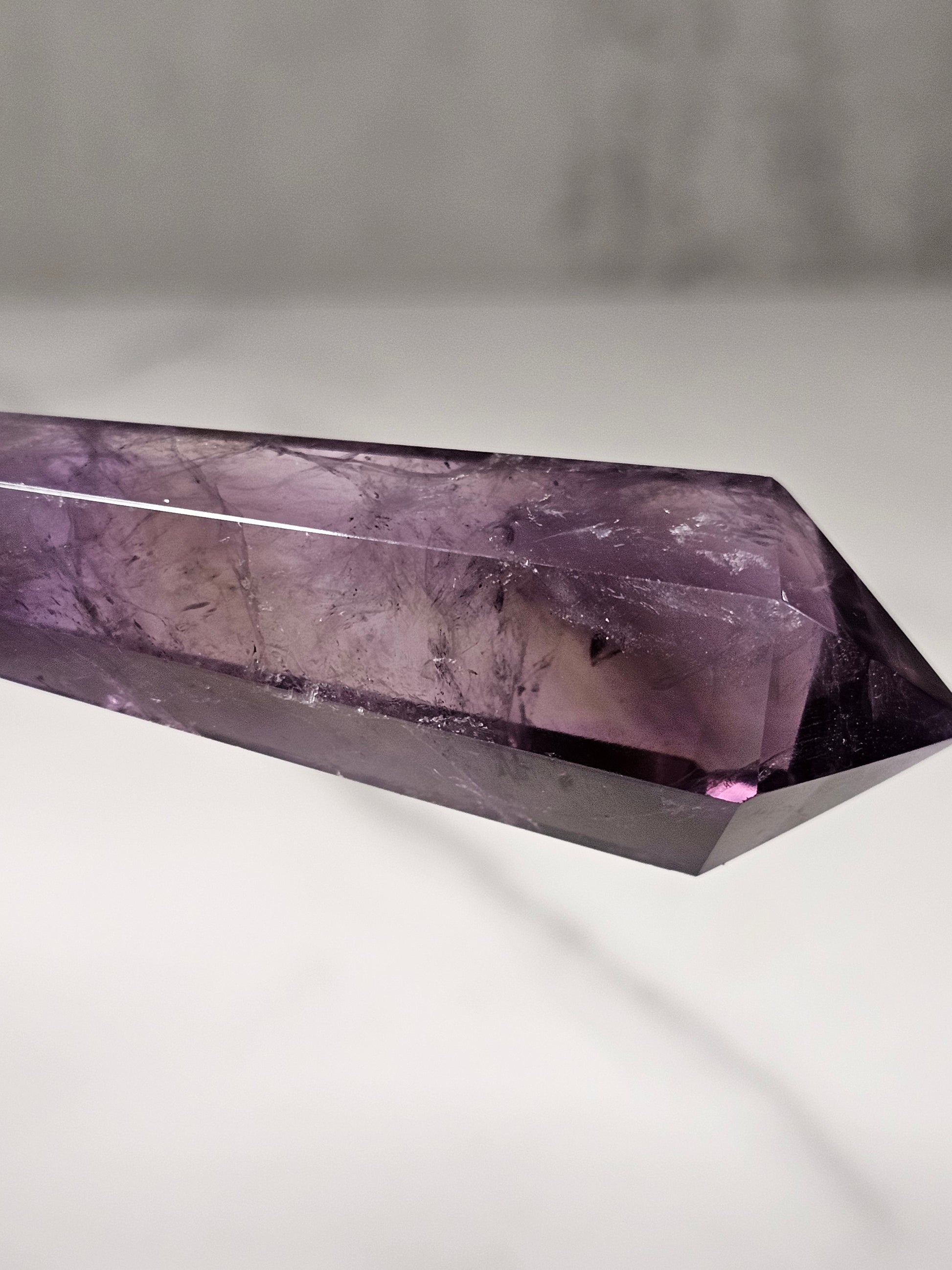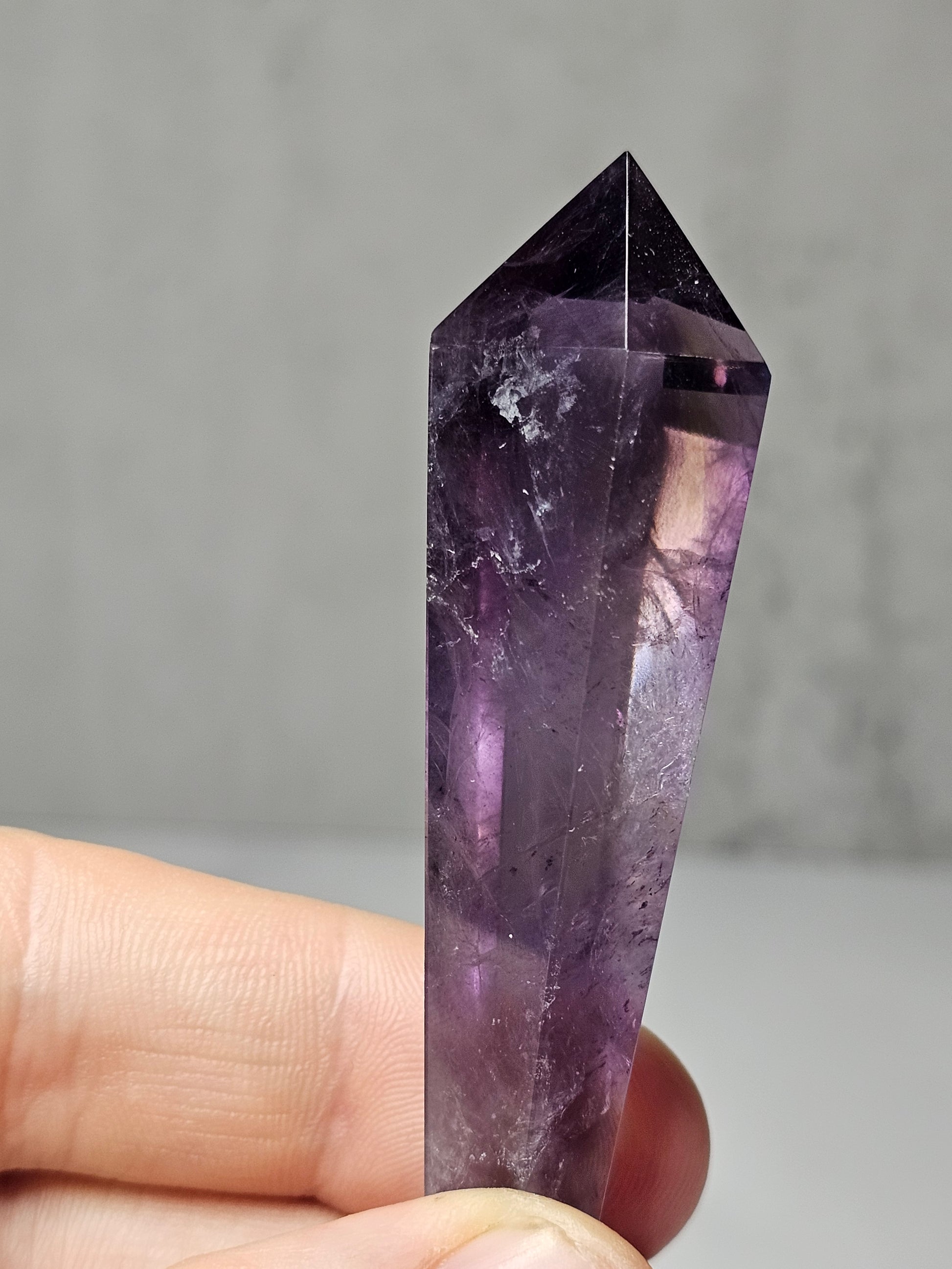 This Amethyst scepter has some faint yellow Ametrine spots inside and is a beautiful, gemmy, translucent purple.