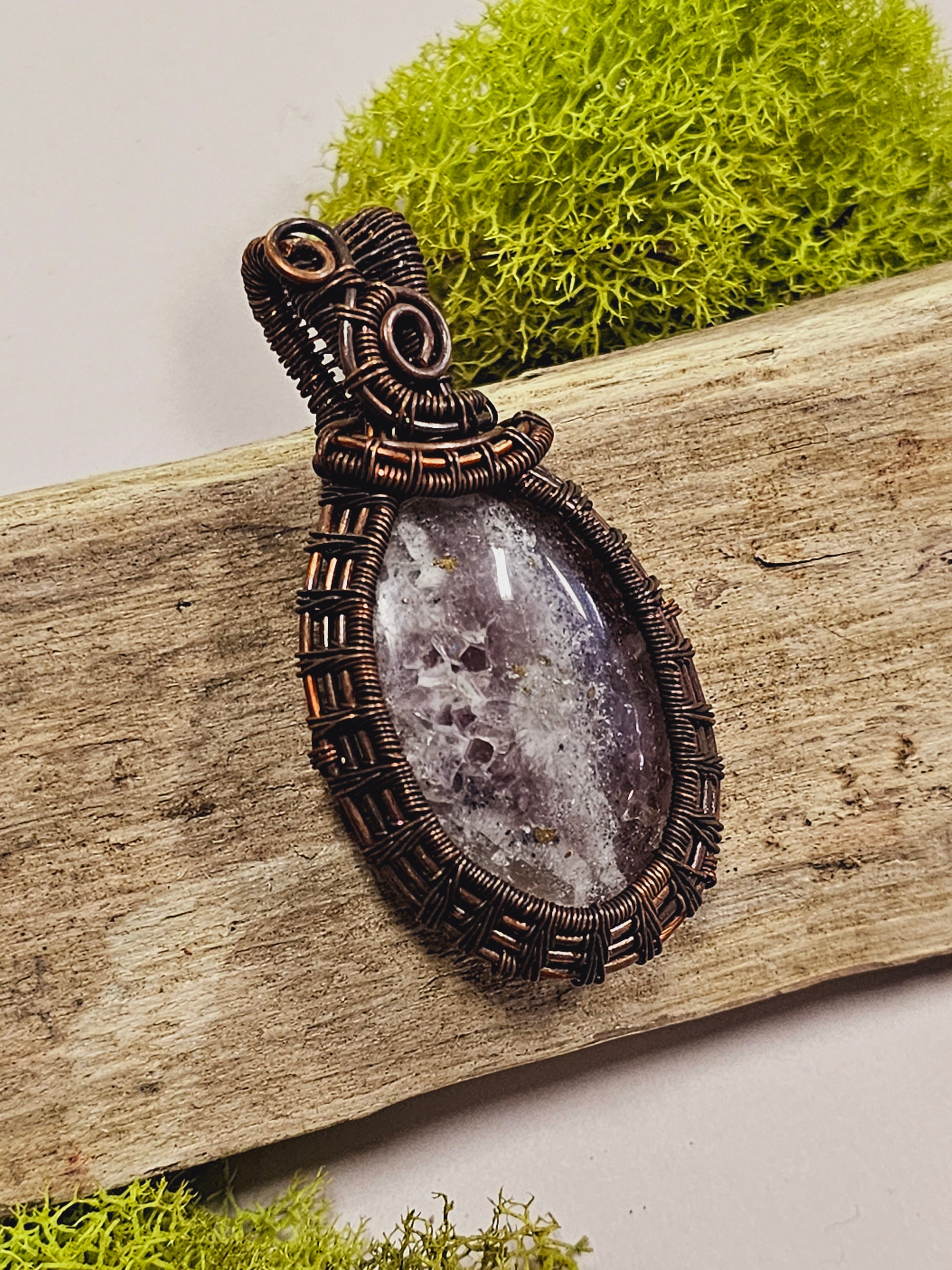 This handmade wire wrapped pendant comes on an 18" black cord with metal clasps.