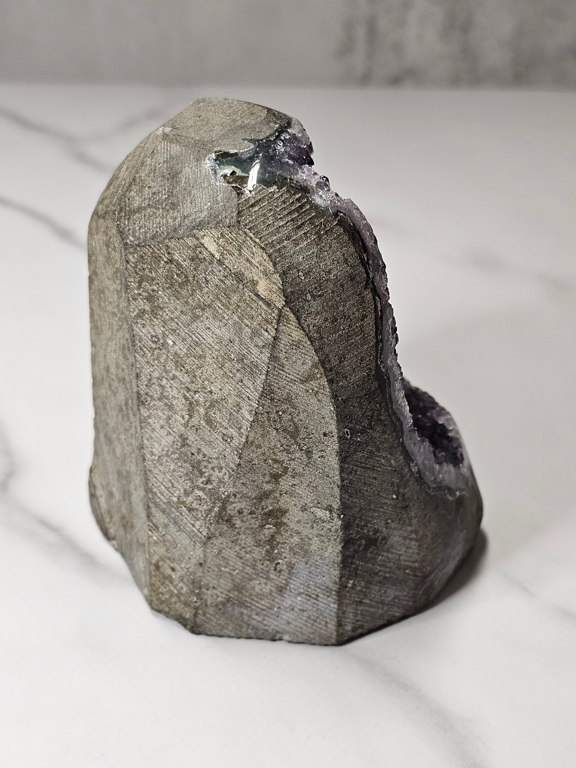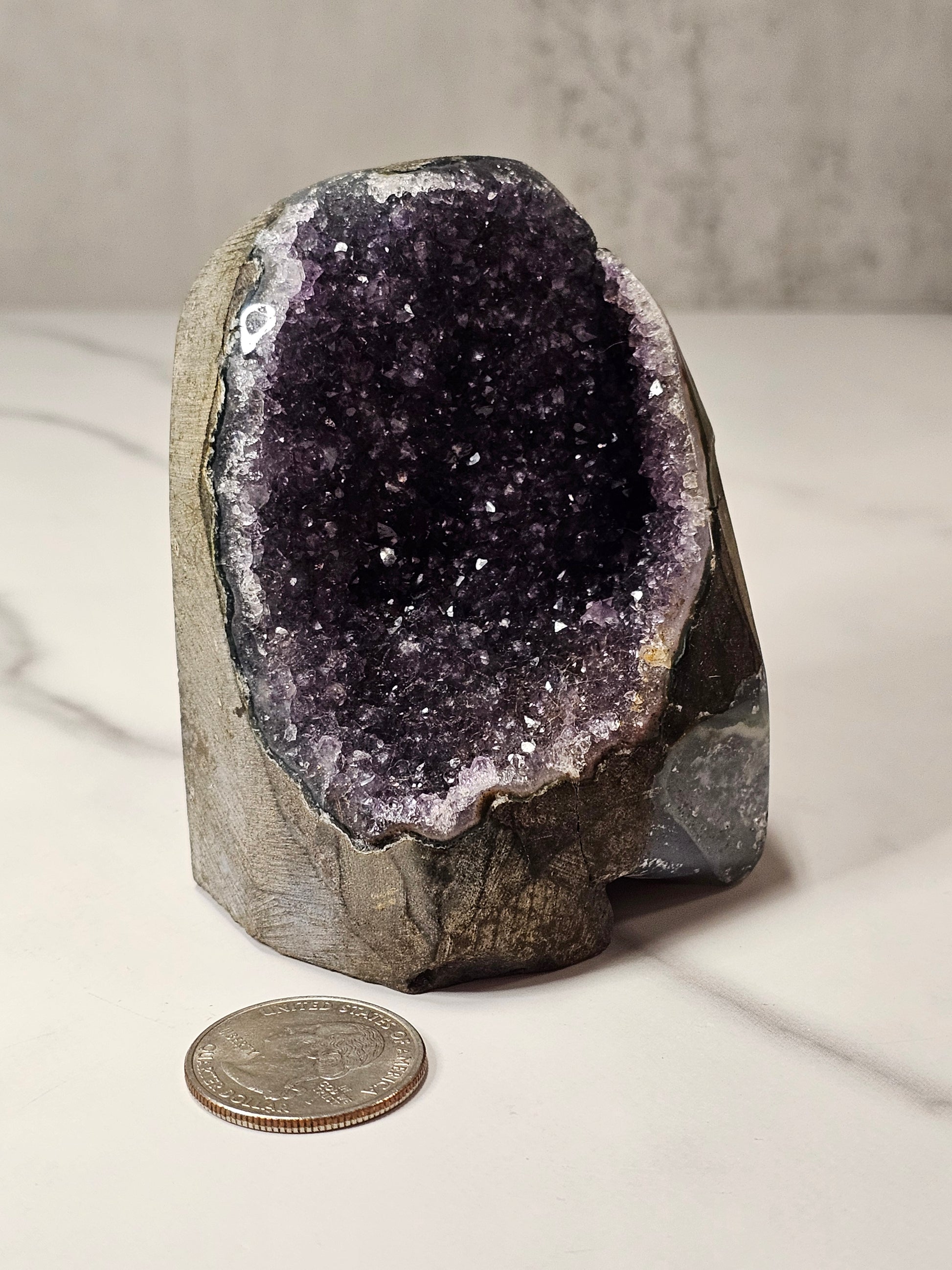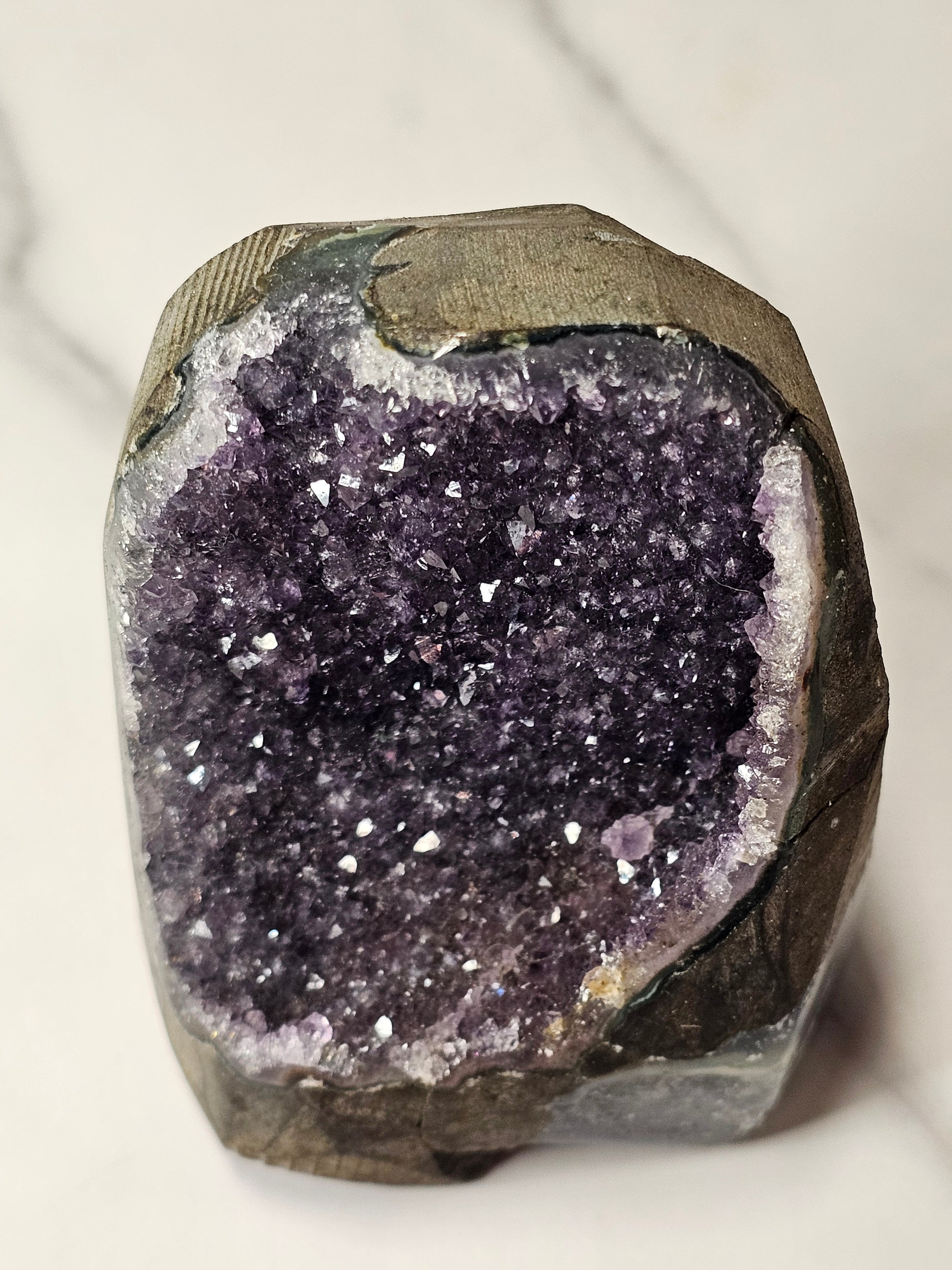 This druzy Amethyst cut base has a nice color and sparkle! It has polished edges. It stands up at 3.21 inches tall and is 2.55 inches wide at the base. It weighs 13.7 ounces.
