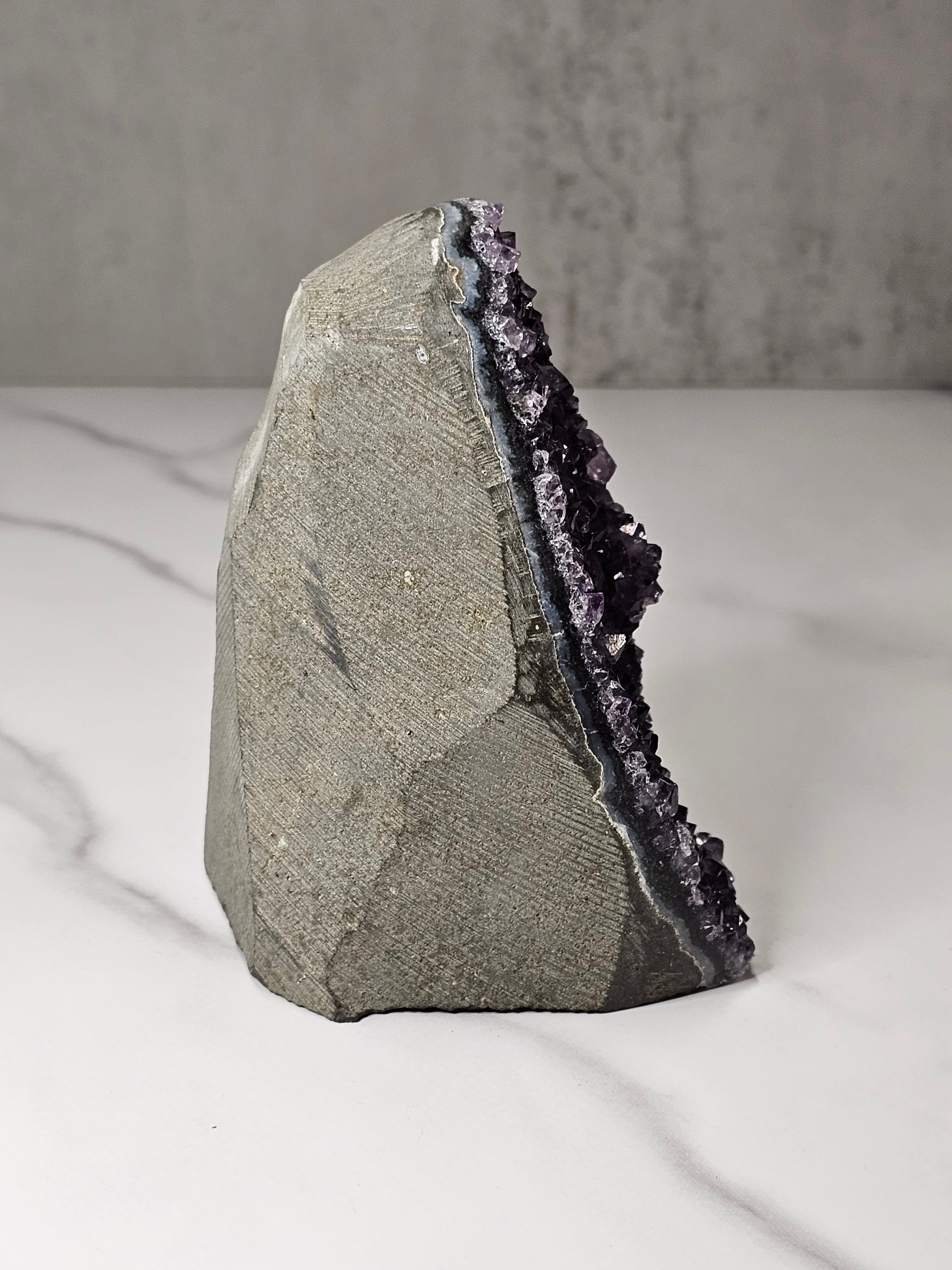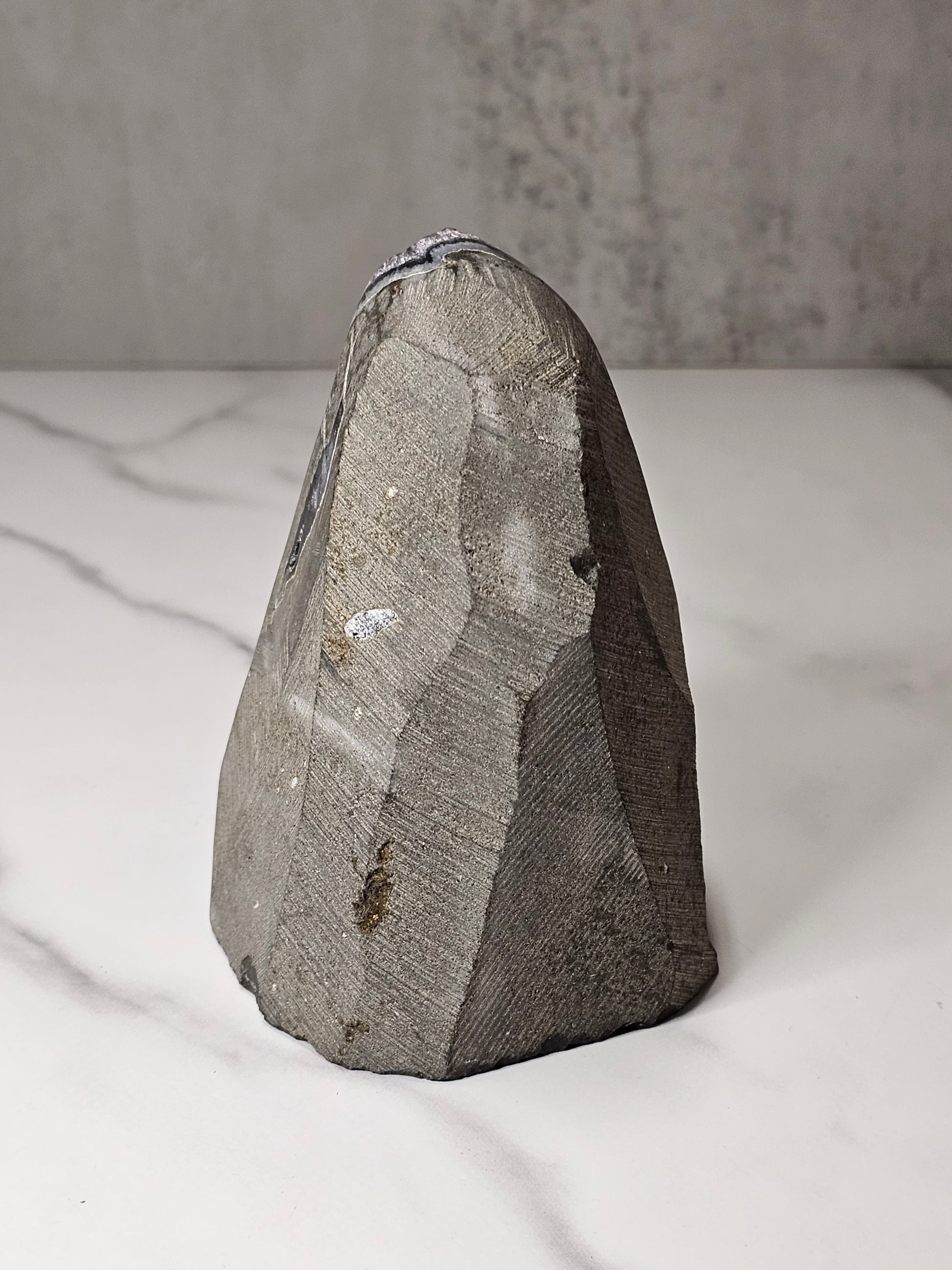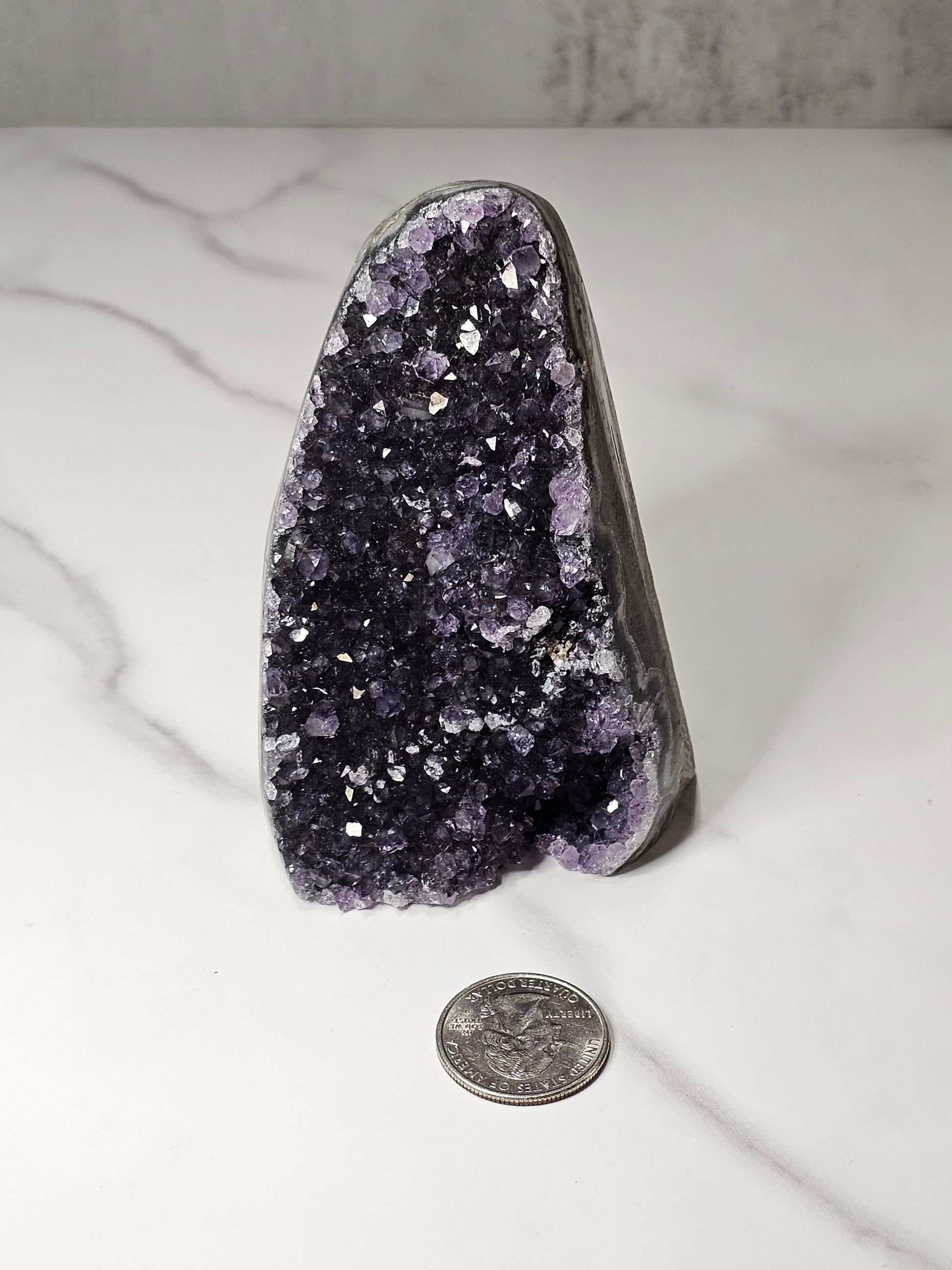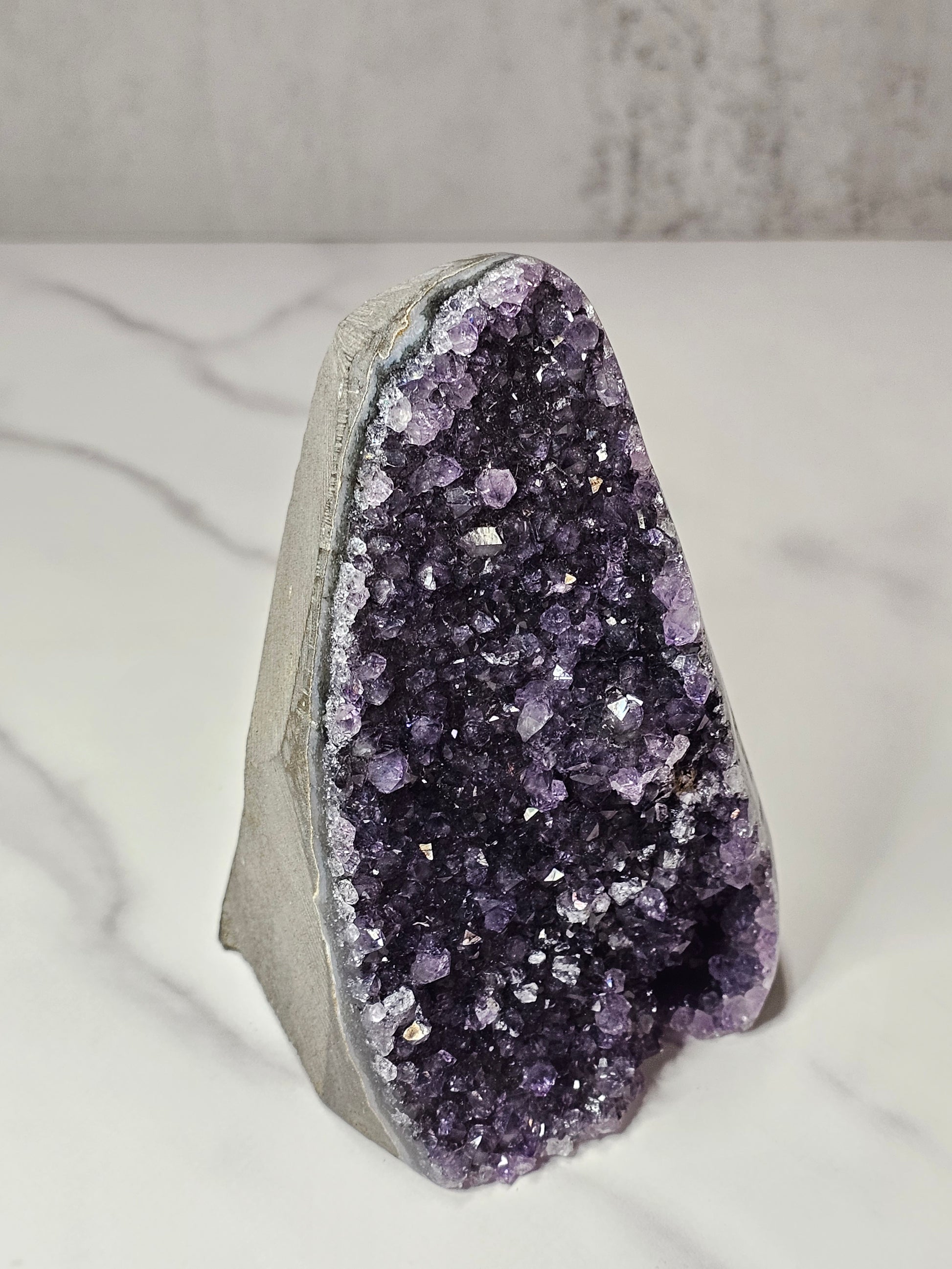 This druzy Amethyst cut base has a vibrant and deep color purple. It has polished edges. It stands up at 3.95 inches tall and is 2.69 inches wide at the base. It weighs 18.6 ounces. The exact crystal pictured is the one you will receive.