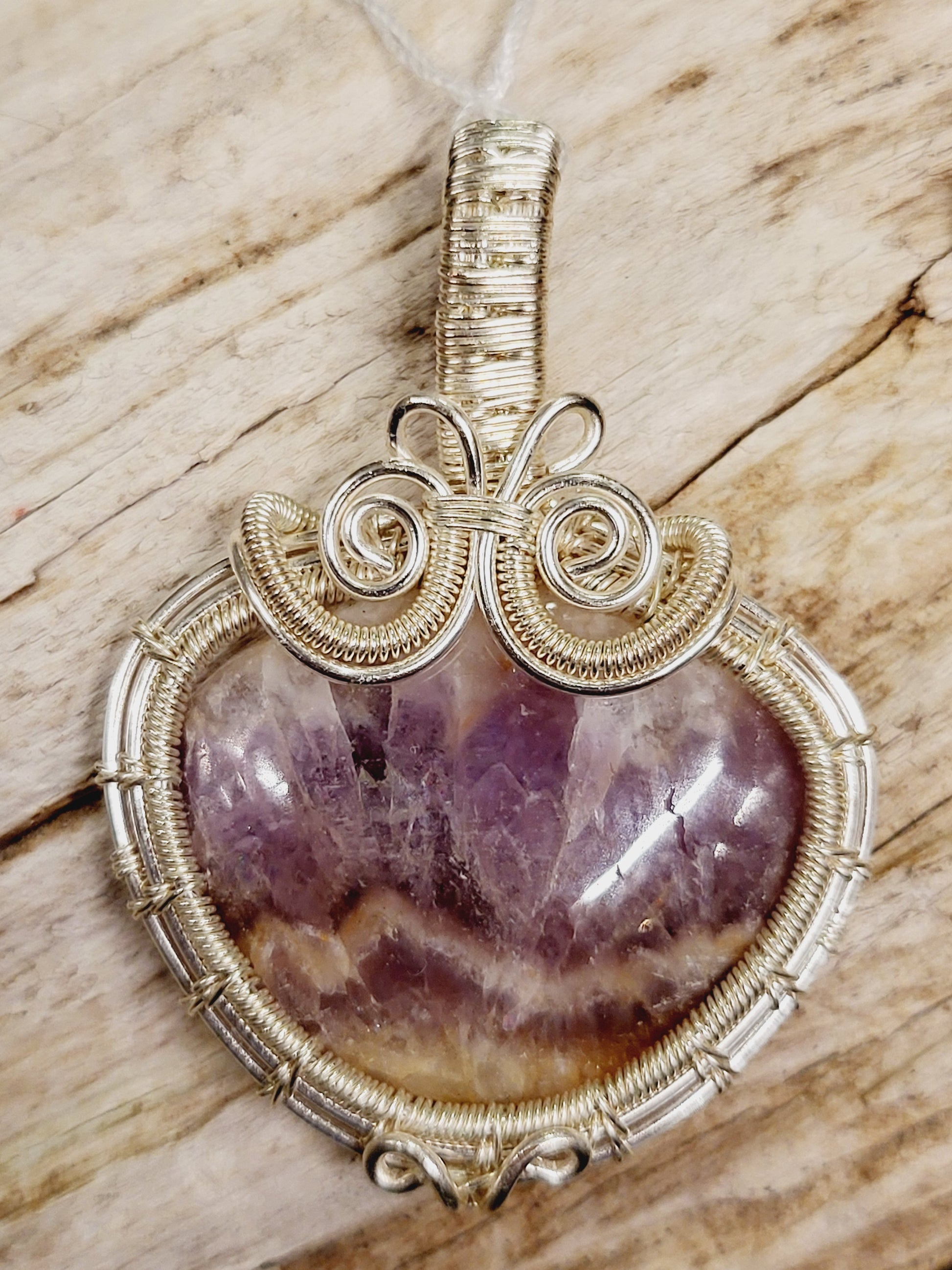 This handmade pendant features a bright Amethyst cabochon wrapped in silver plated wire. The purple crystal outlined in silver wore is really a stunner.
