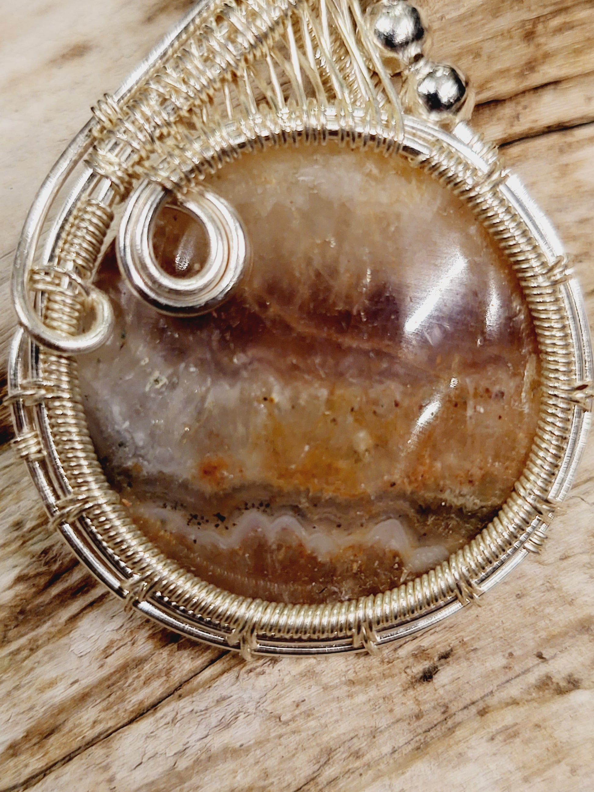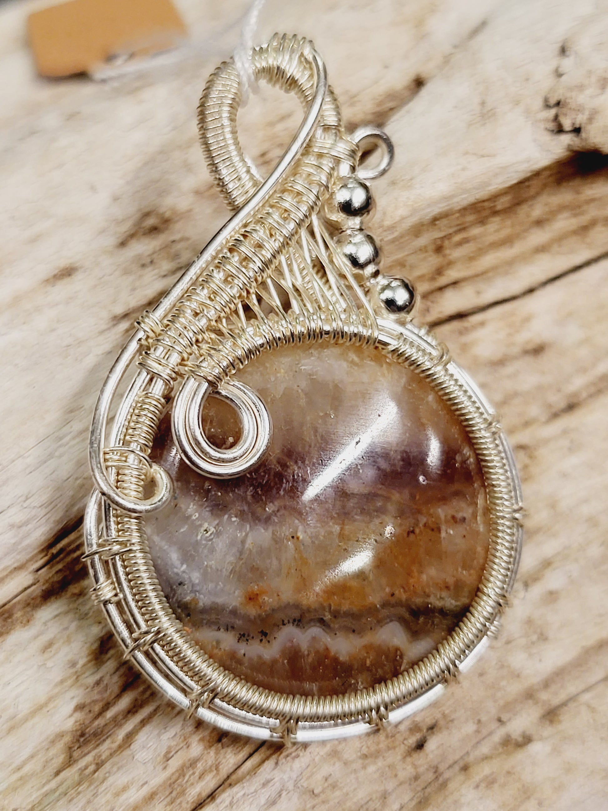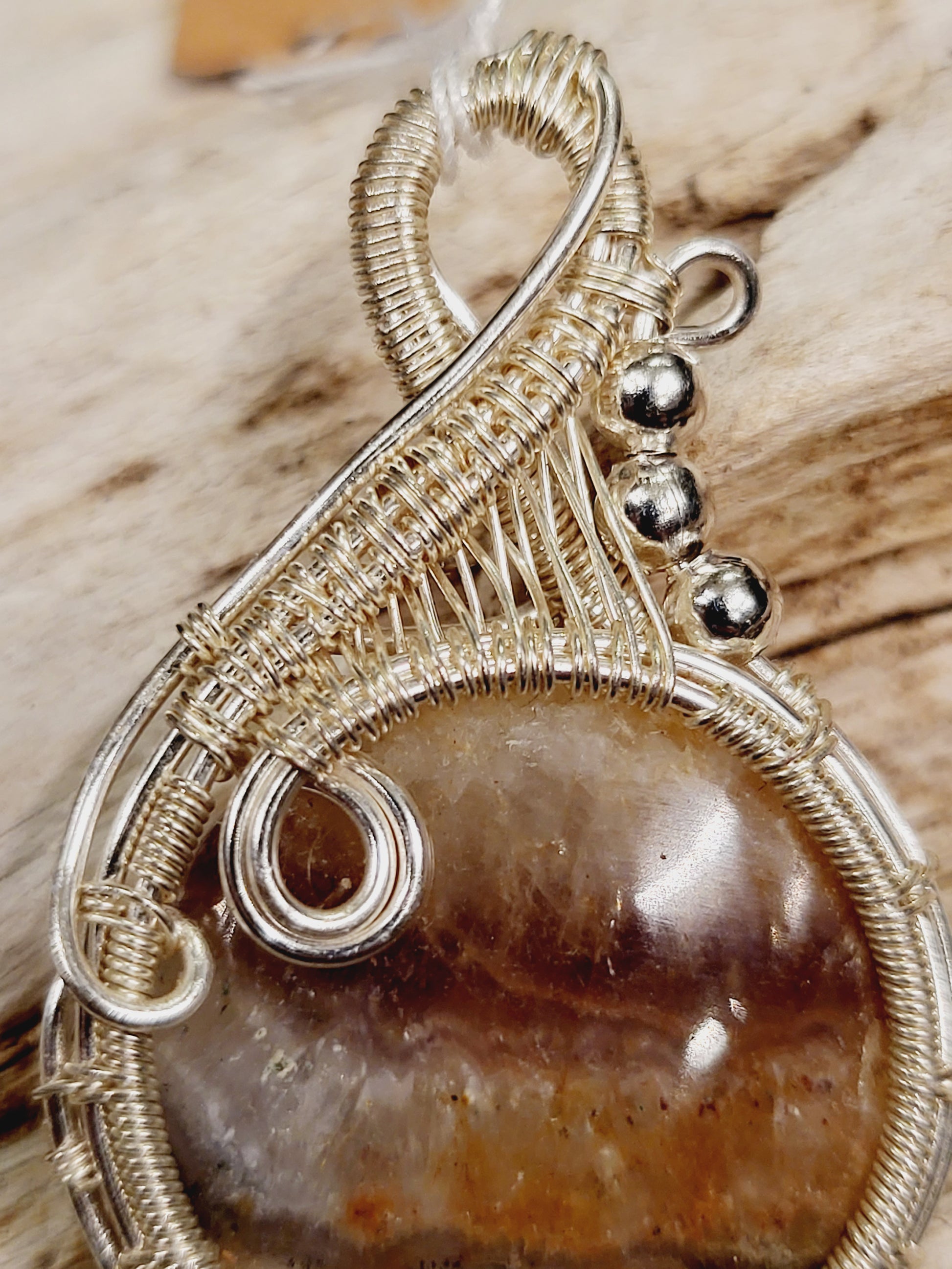 This handmade pendant features a circular Amethyst cabochon wrapped in silver plated wire. The crystal is primarily warm toned with hues of brown and hints of purple.