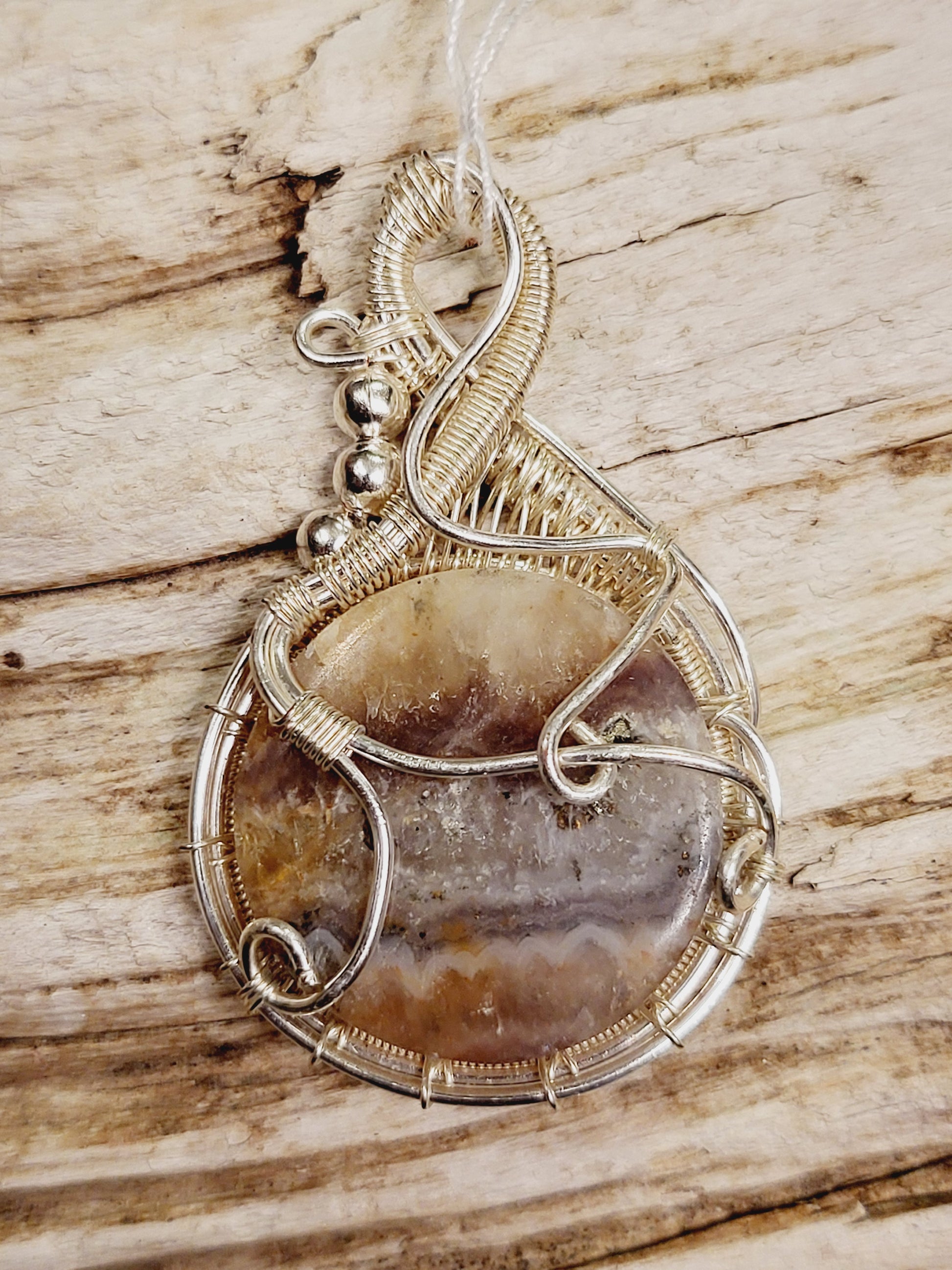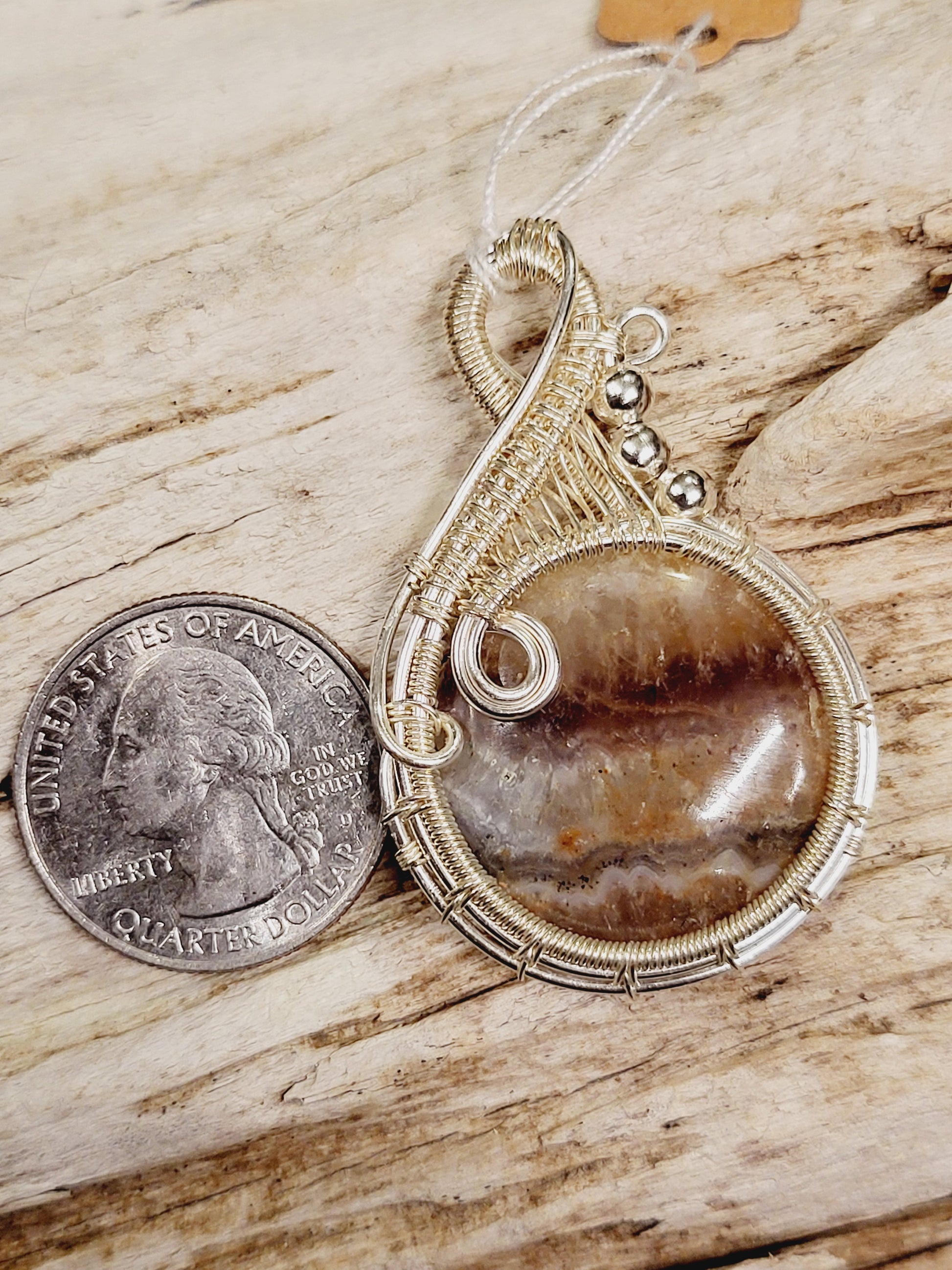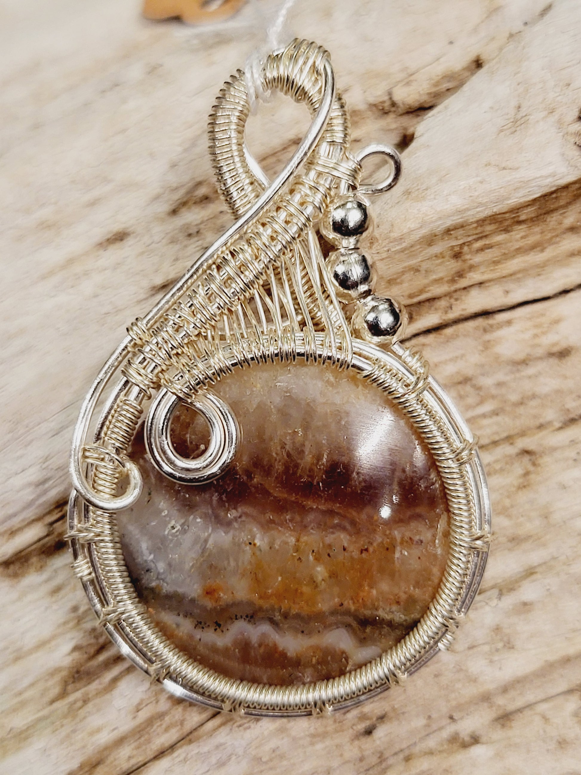 This handmade pendant features a circular Amethyst cabochon wrapped in silver plated wire. The crystal is primarily warm toned with hues of brown and hints of purple.