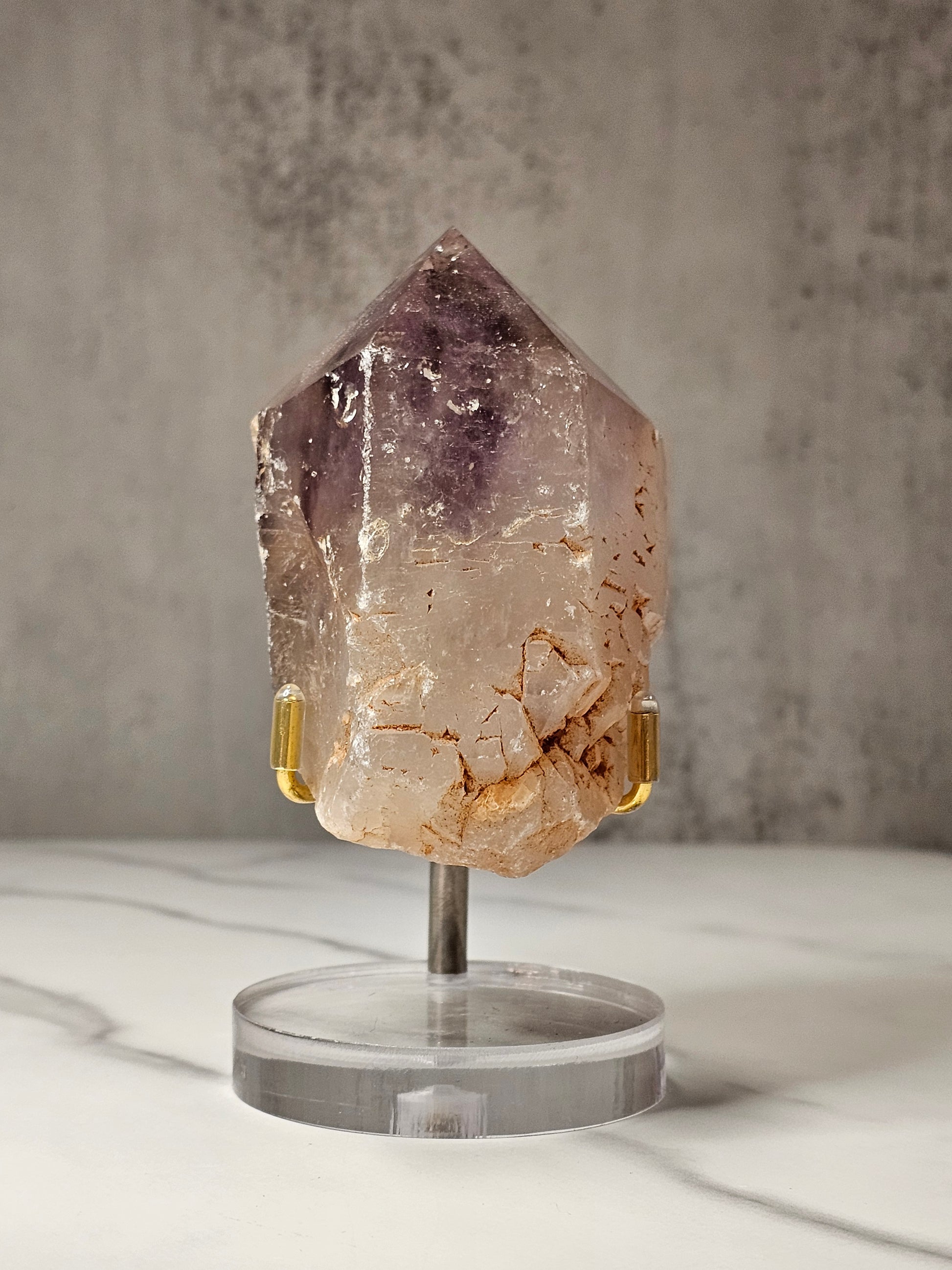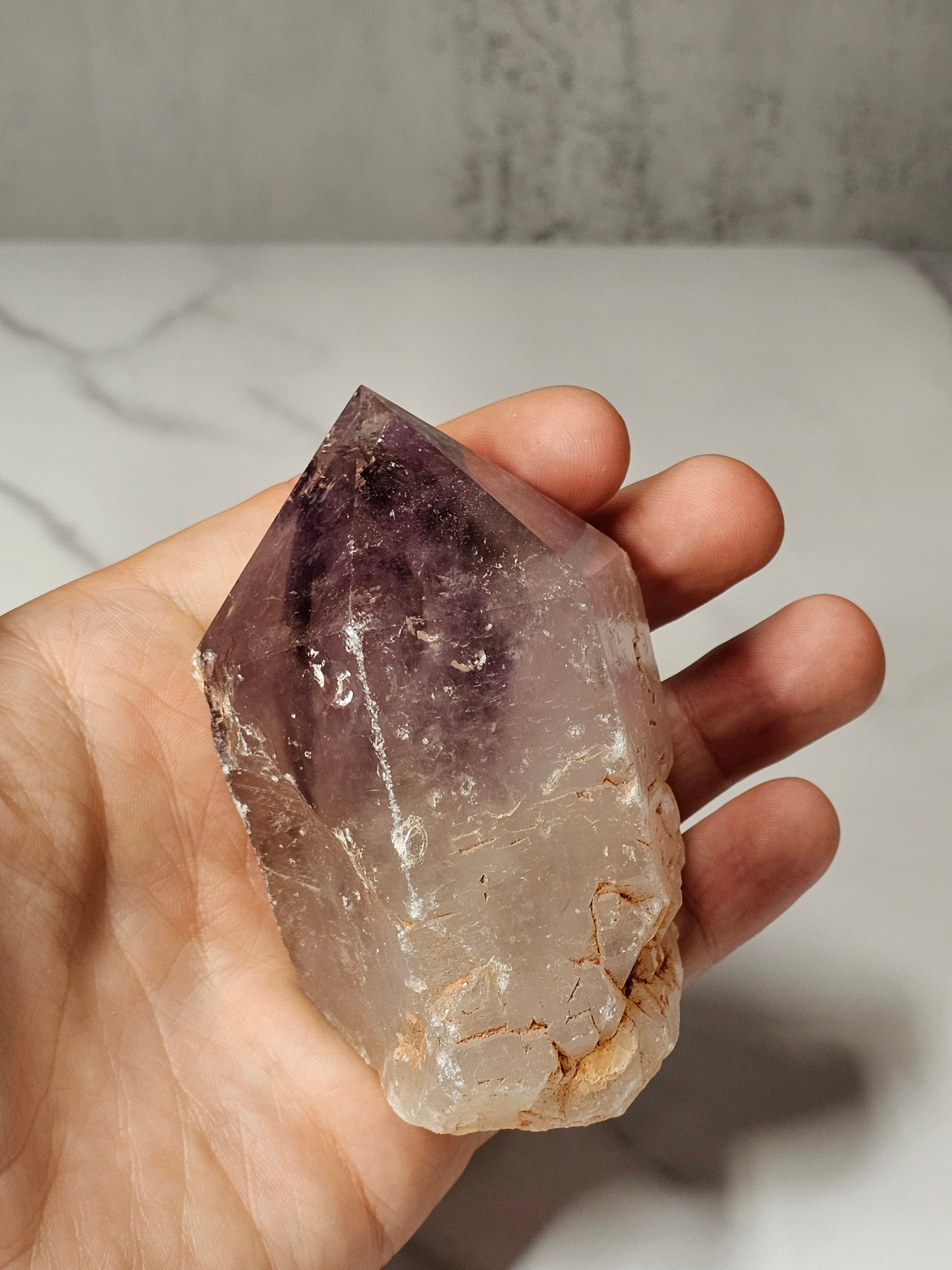 This Amethyst has a polished top point with rough edges. It has excellent vibrant color and even some smokey almost black inclusions. It is 3.61 inches long and 2.26 inches wide. It weighs 10.6 ounces.