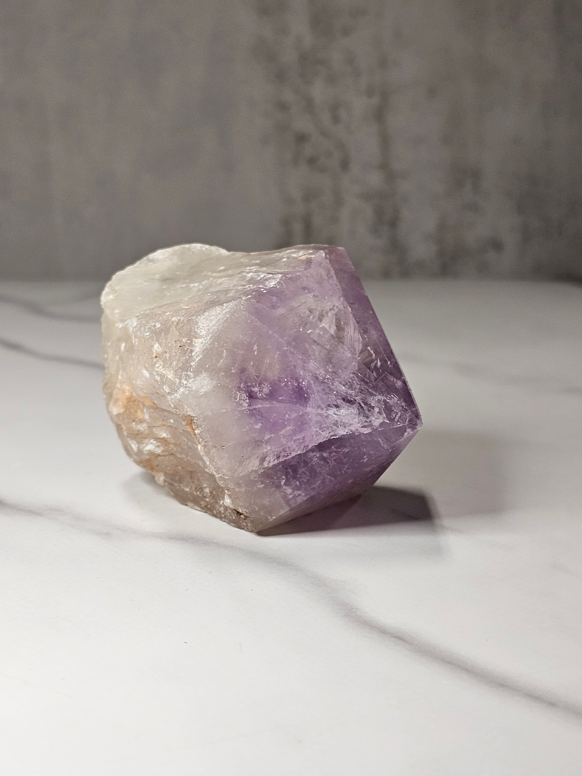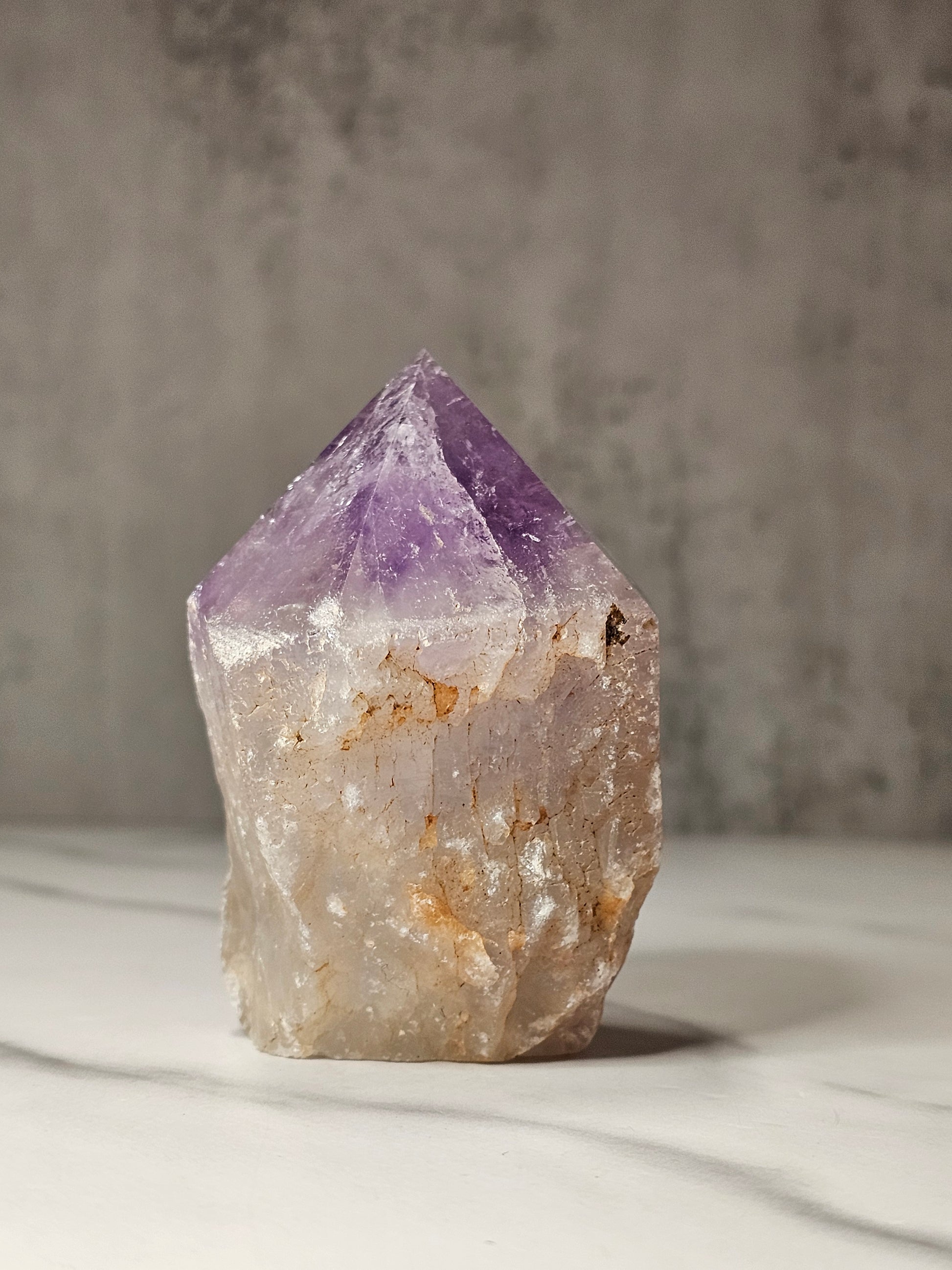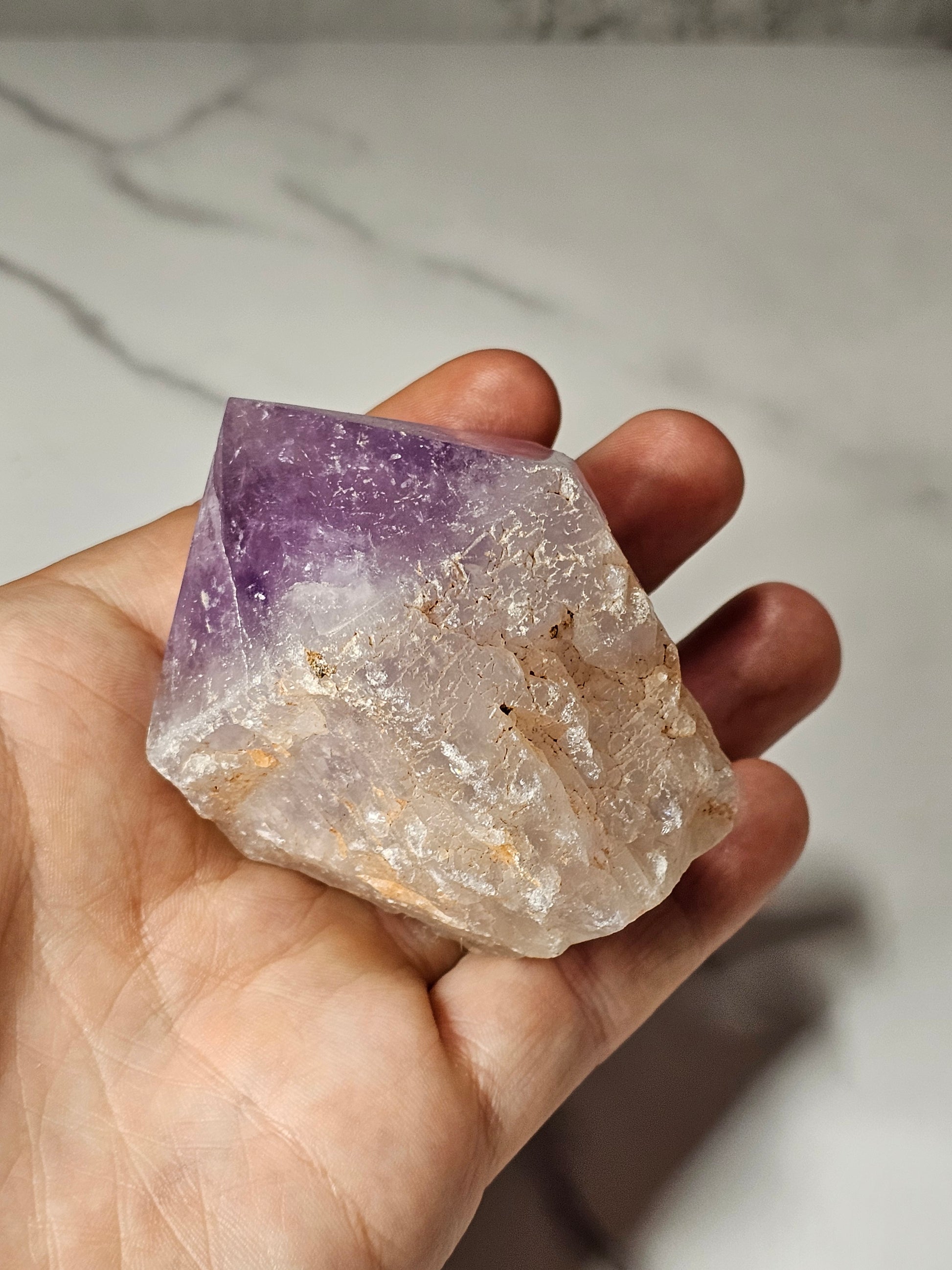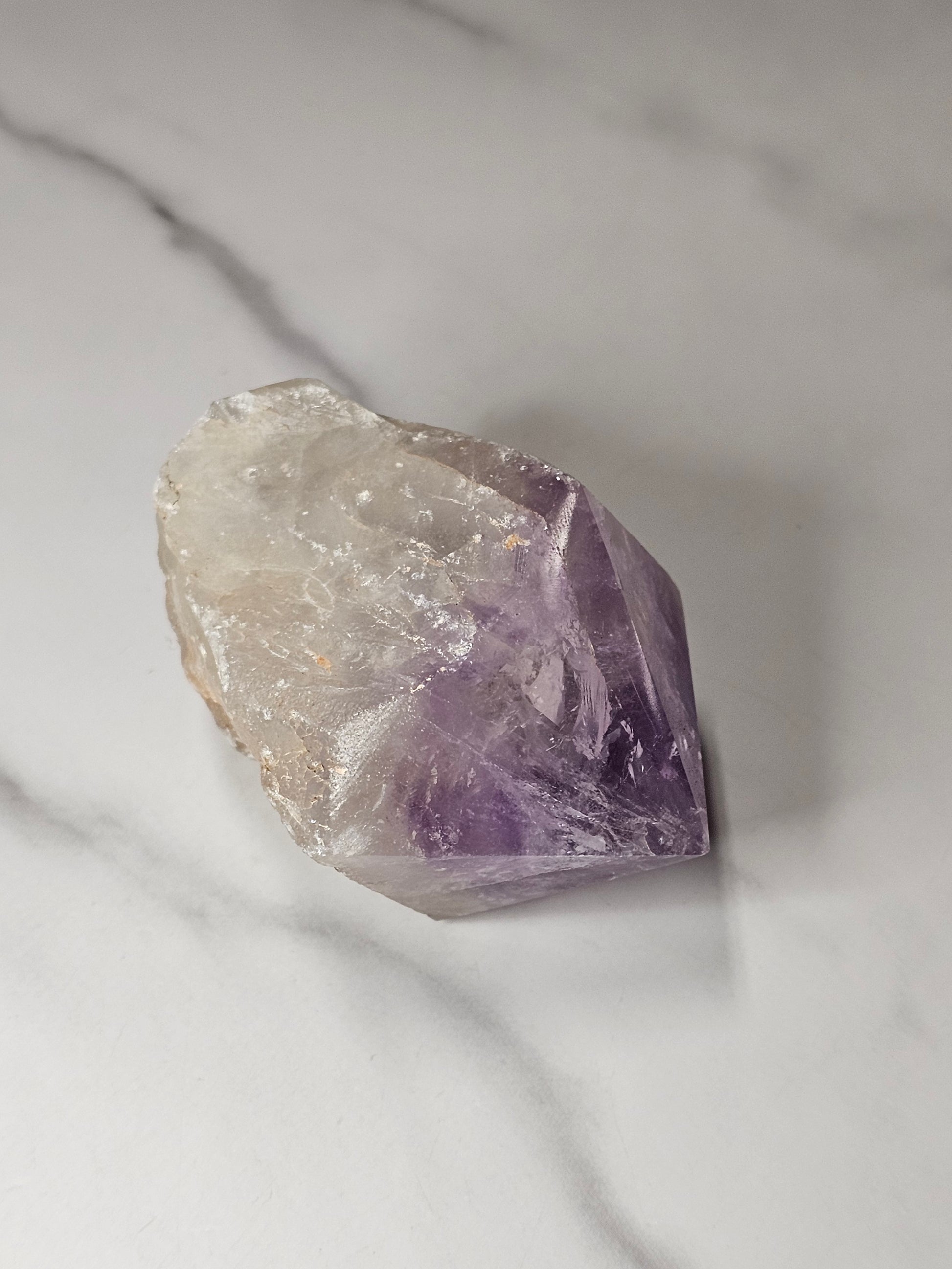 This Amethyst has a polished top point with rough edges. It can stand flat and has excellent vibrant color. It is 2.77 inches tall and 2.15 inches wide. It weighs 7.2 ounces.