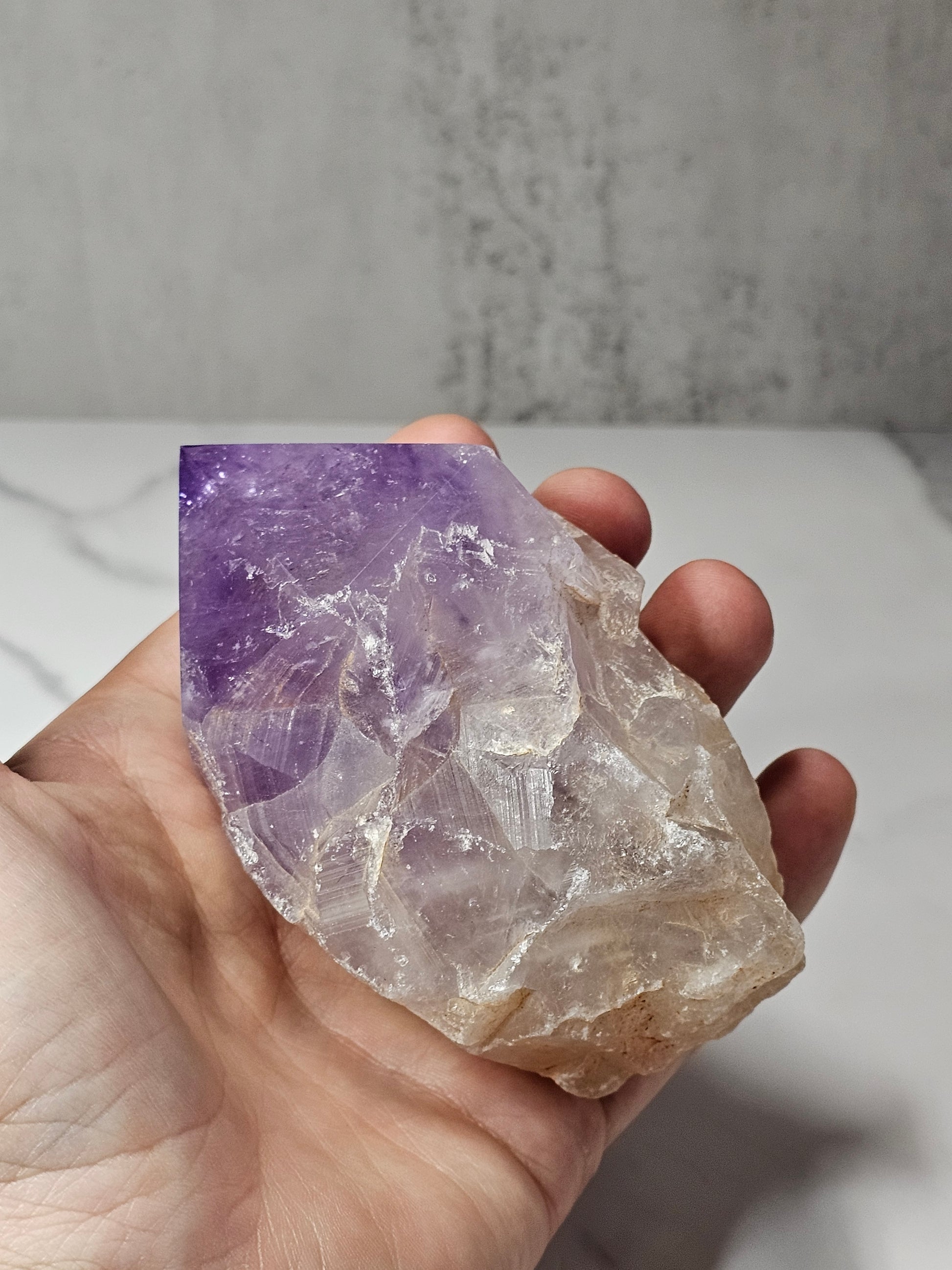 This Amethyst has a polished top point with rough edges and bottom. It has a really pretty light and gemmy purple color. It is 4.14 inches tall and 2.45 inches wide. It weighs 14.6 ounces.