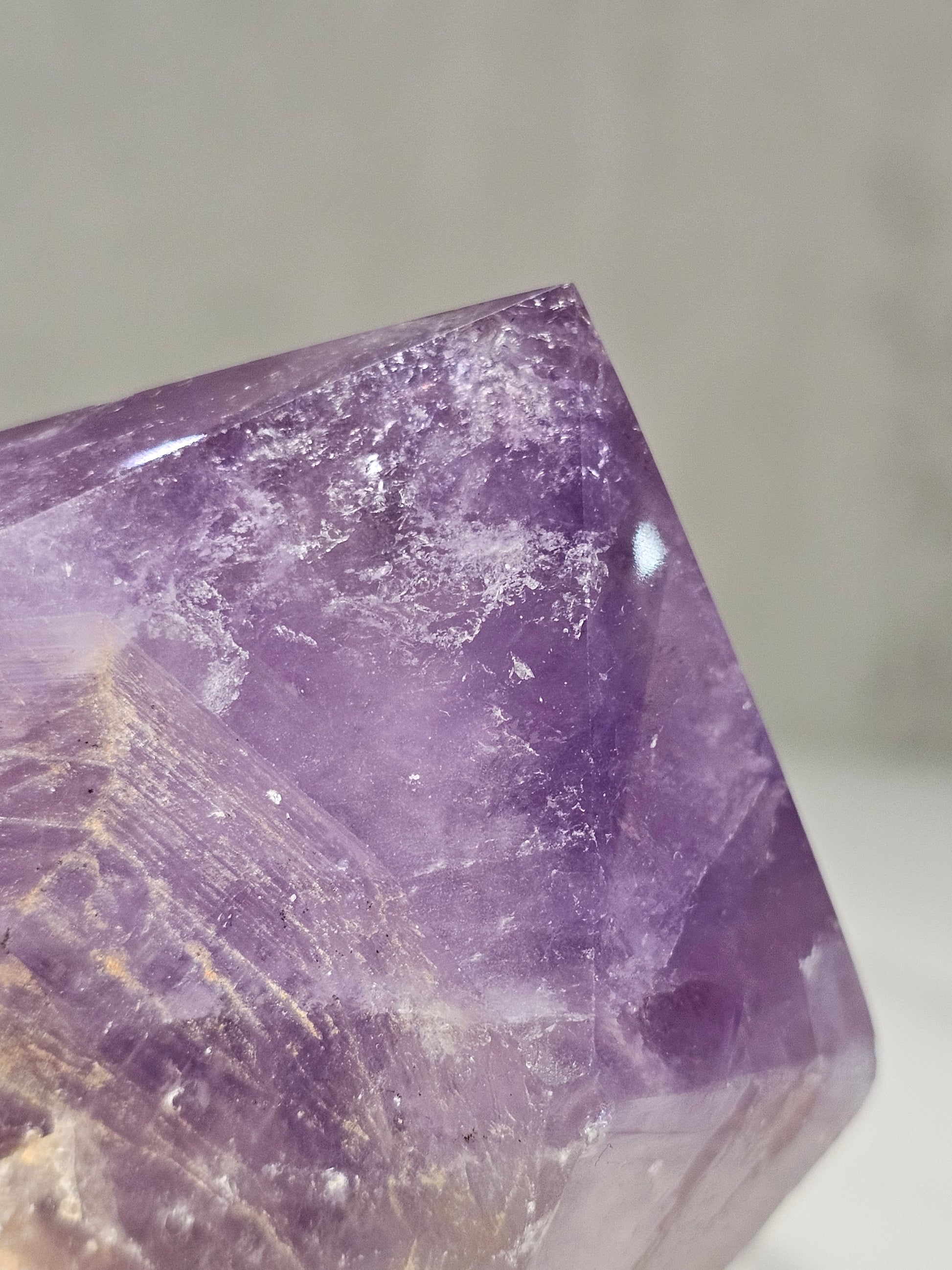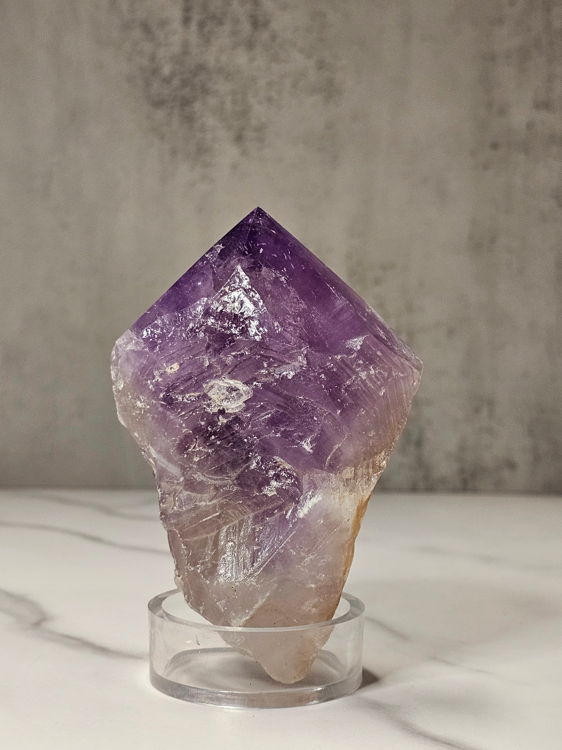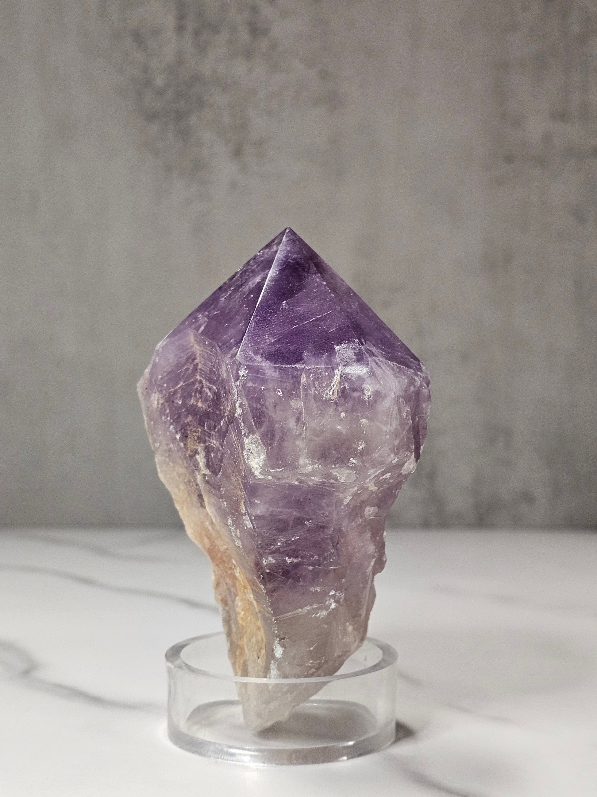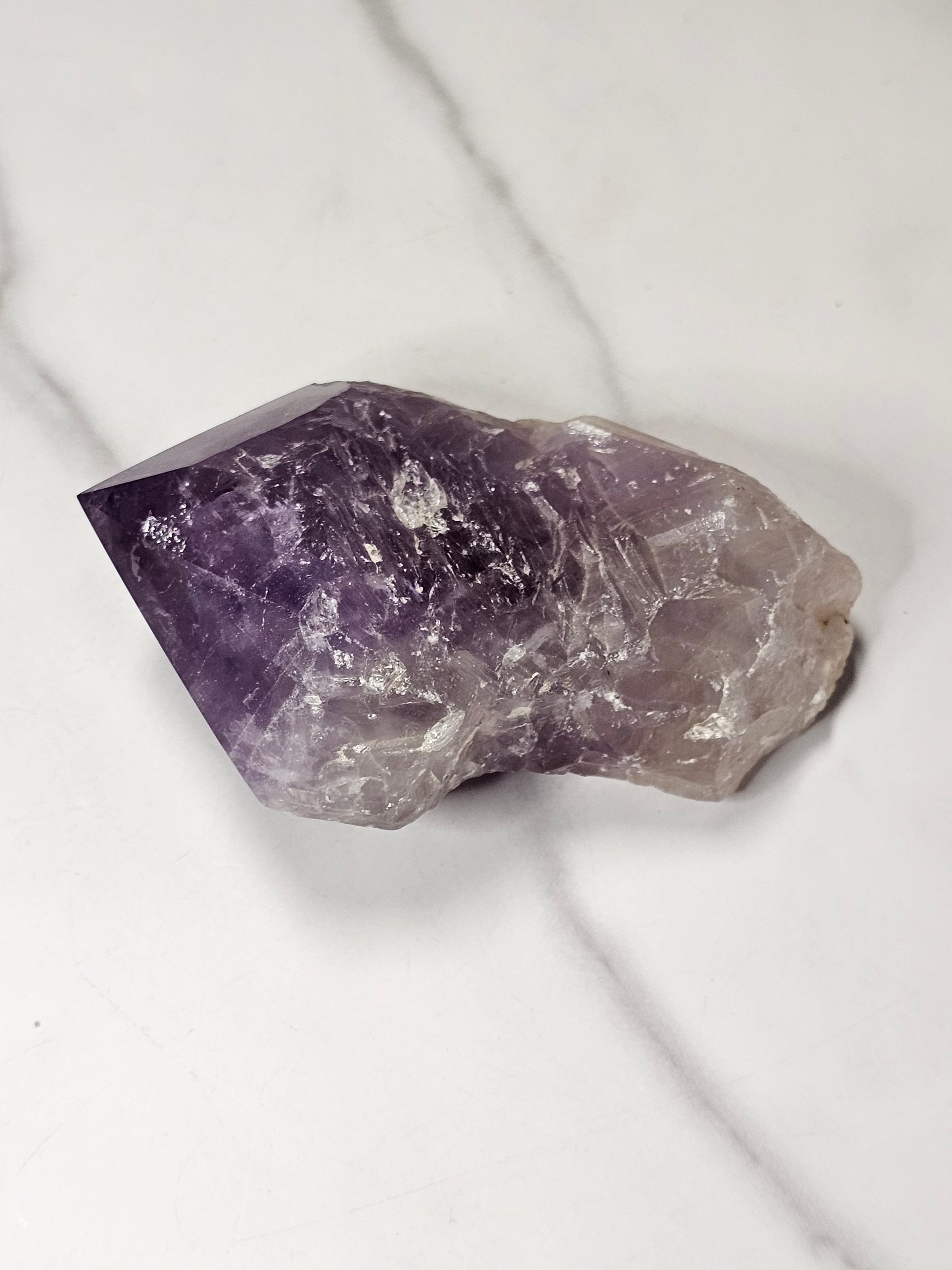 This Amethyst has a polished top point with rough edges and bottom. It has a really pretty light and gemmy purple color. It is 3.8 inches tall and 2.6 inches wide. It weighs 8.4 ounces.