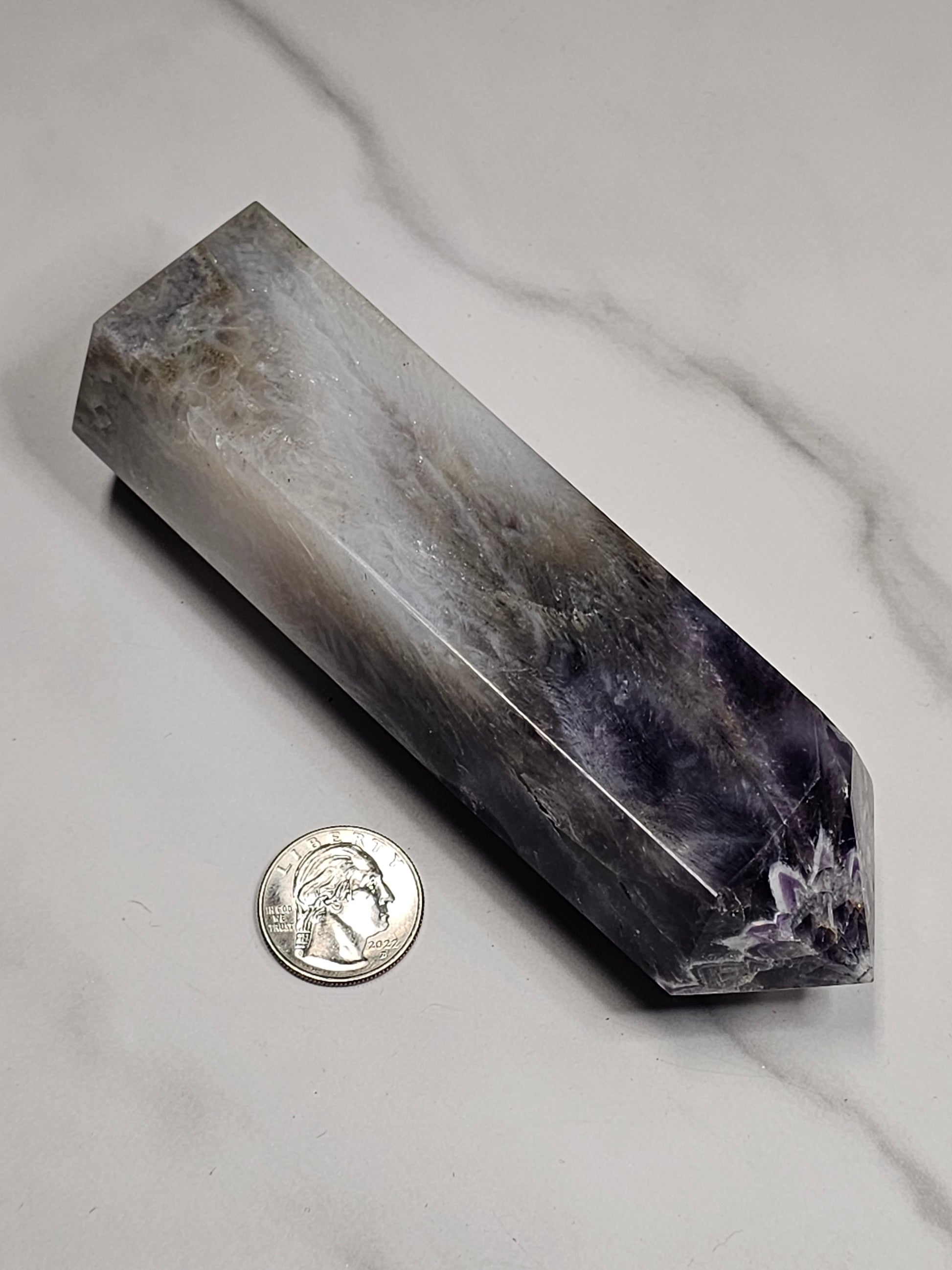 This tower is 144mm or 5.66 inches tall. It has a base diameter of 1.97 inches. It weighs 18.6 ounces. Excellent vibrant purple color.