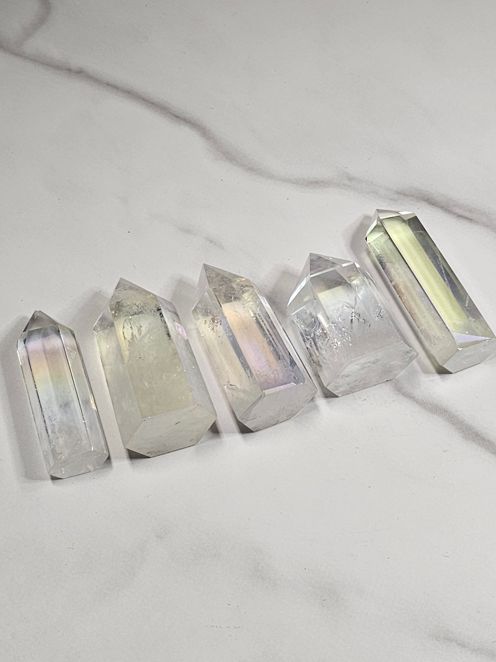 These Angel Aura Quartz points are approximately 1.75-2.5 inches in height. They have a nice rainbow sheen to them and almost change colors under different directions of light.