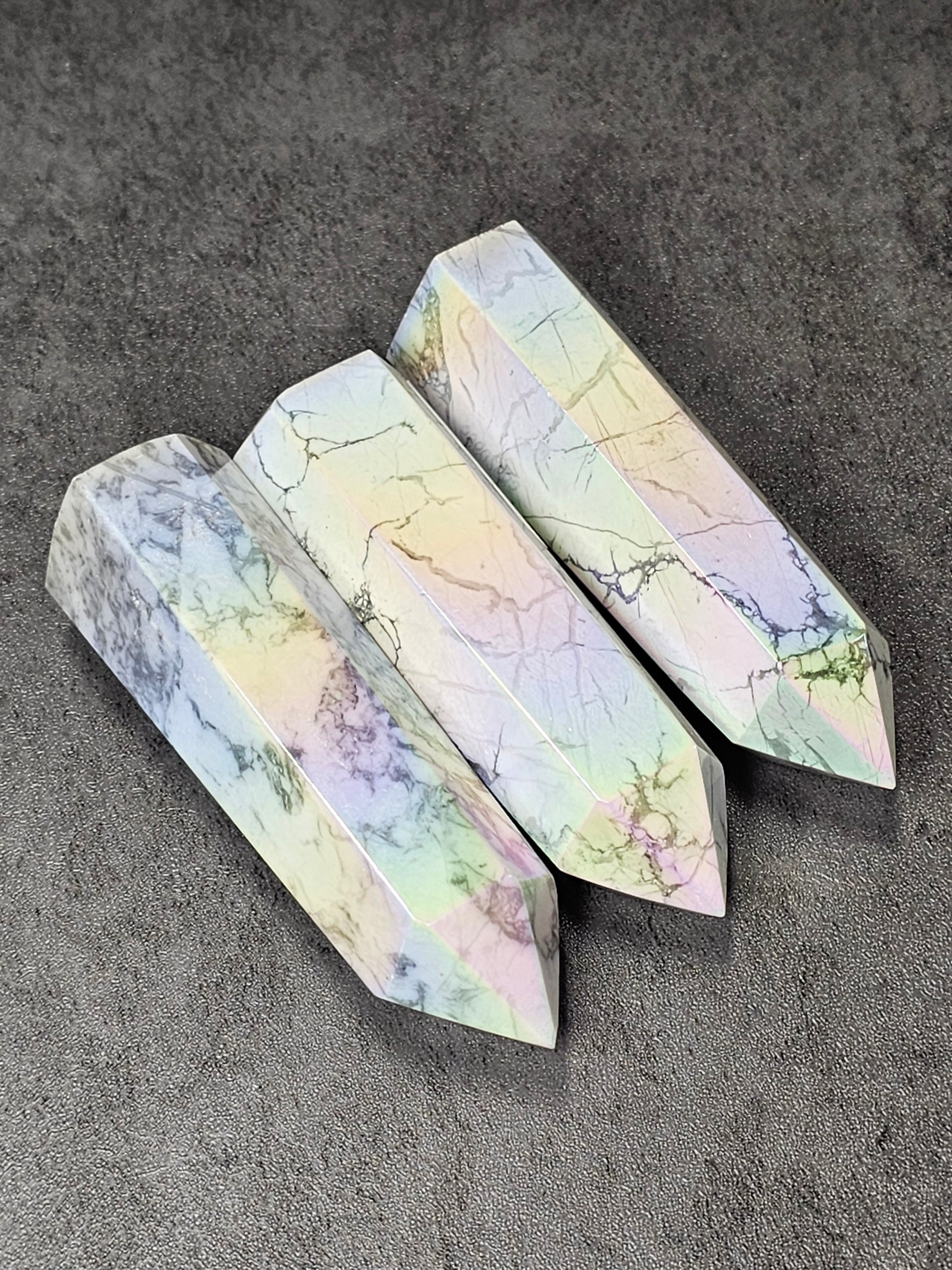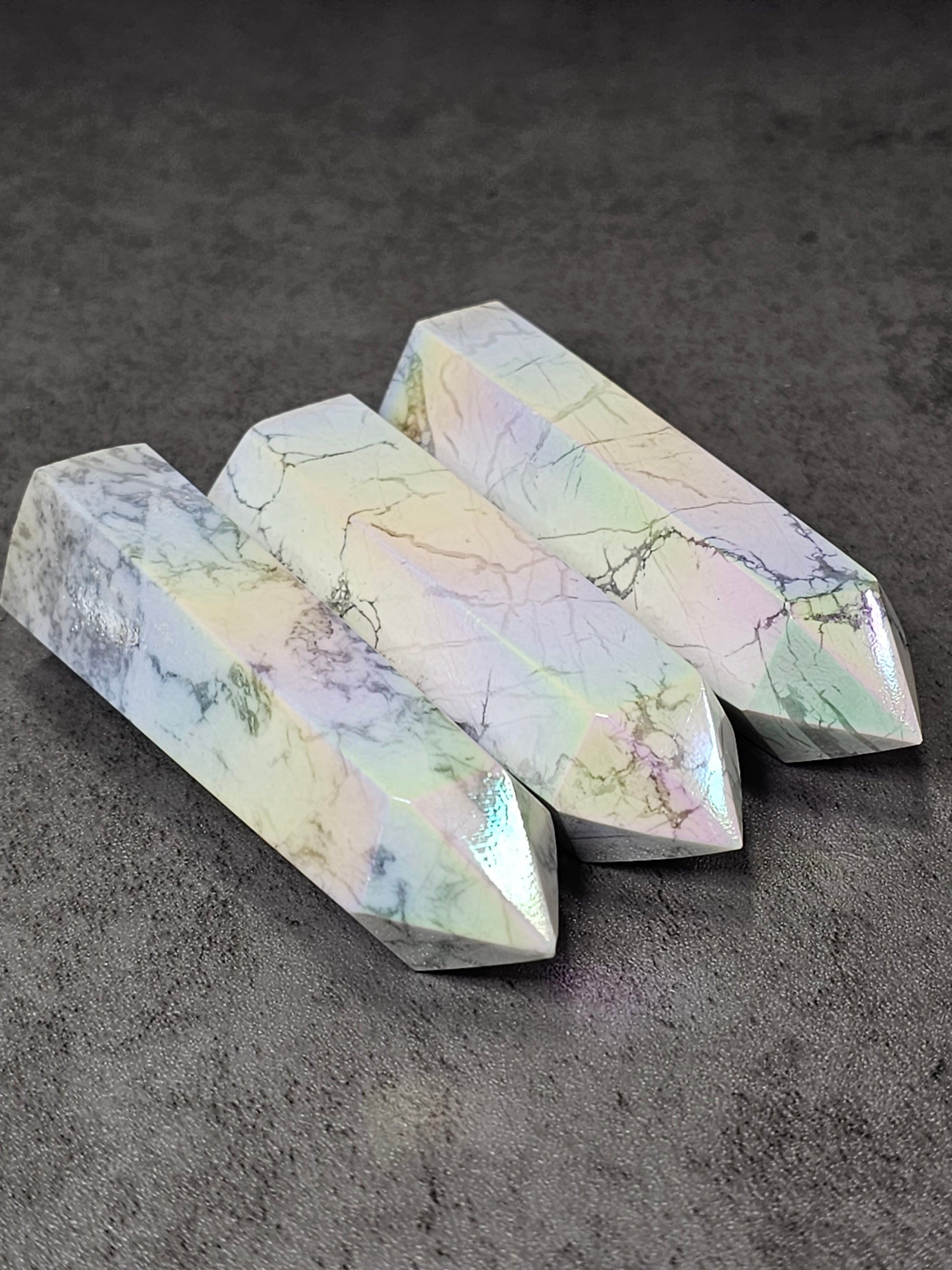 Each Aura Howlite tower is approximately 3-3.75 inches tall. They have a beautiful rainbow aura coating.