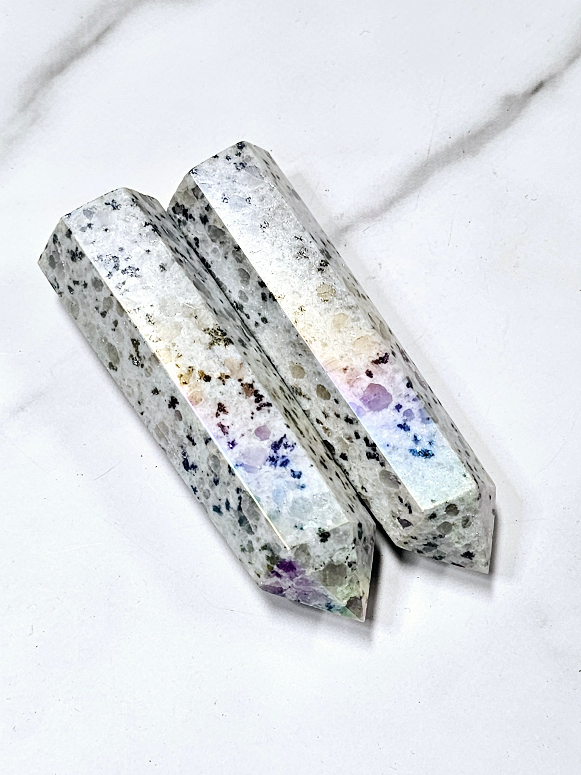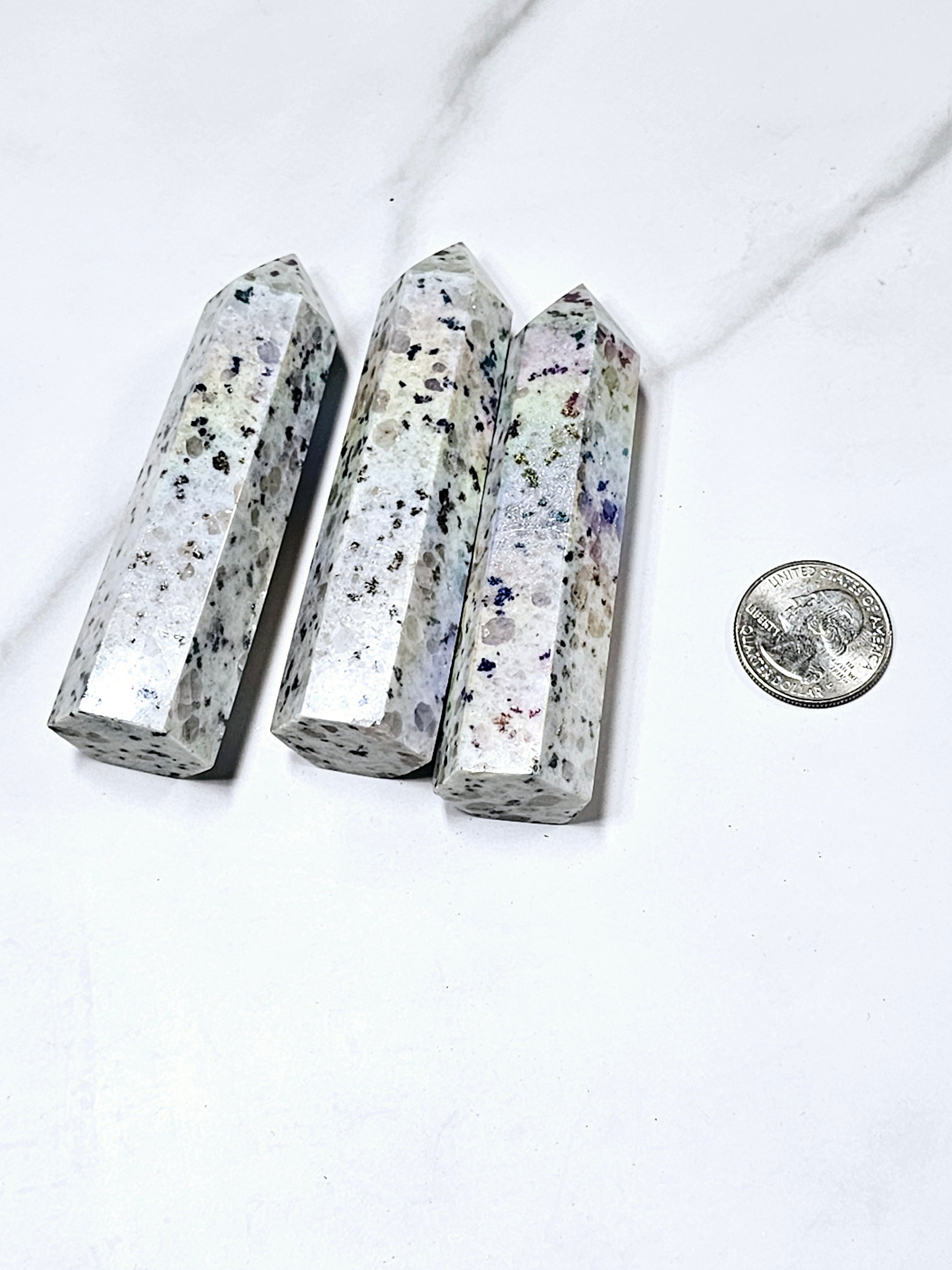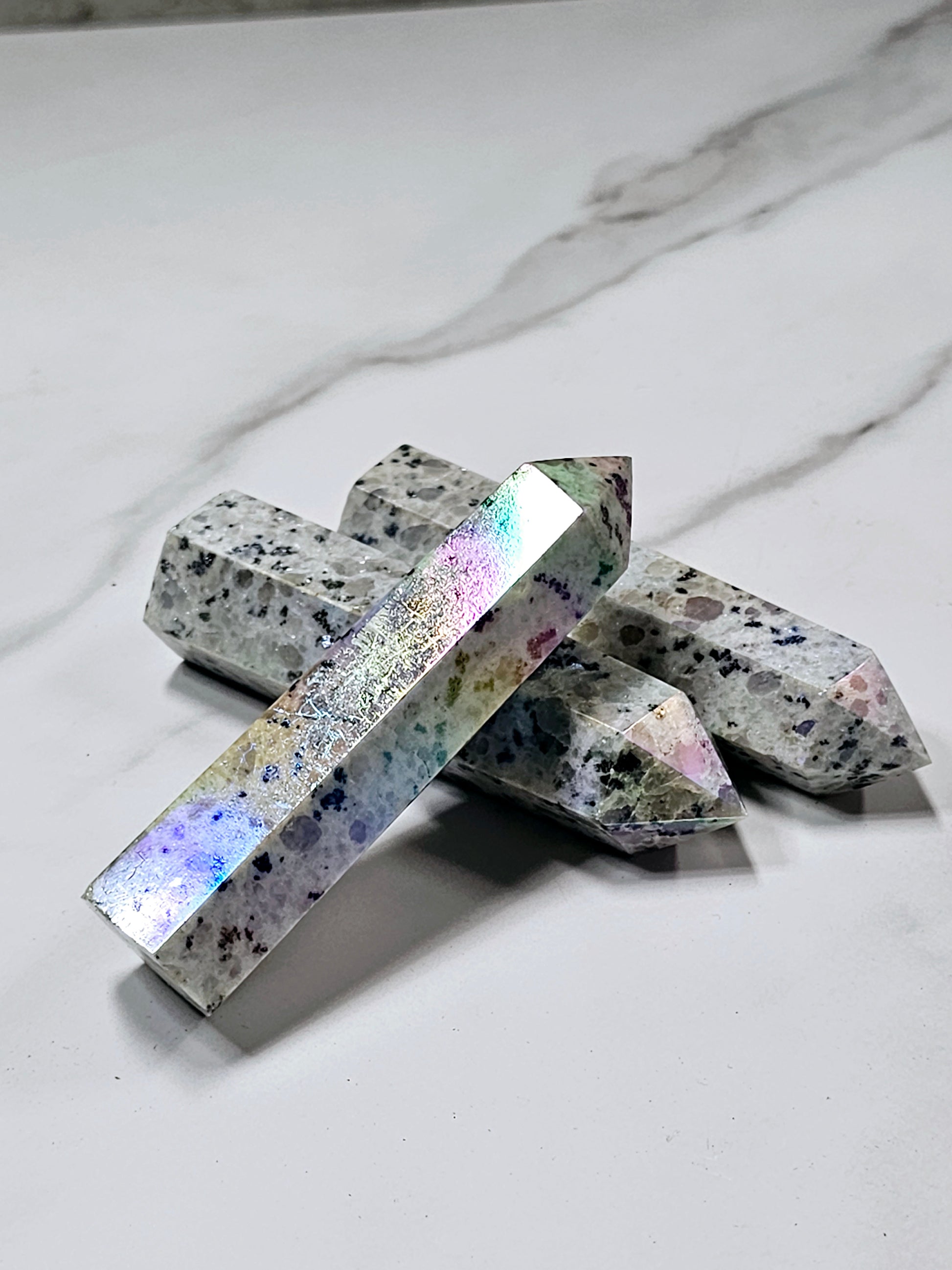 These are approximately 3.25"-3.75" in length. They are very bright and vibrant with pretty and colorful rainbows. These have been electroplated in Titanium to acheive the Aura effect. Sold curators choice.