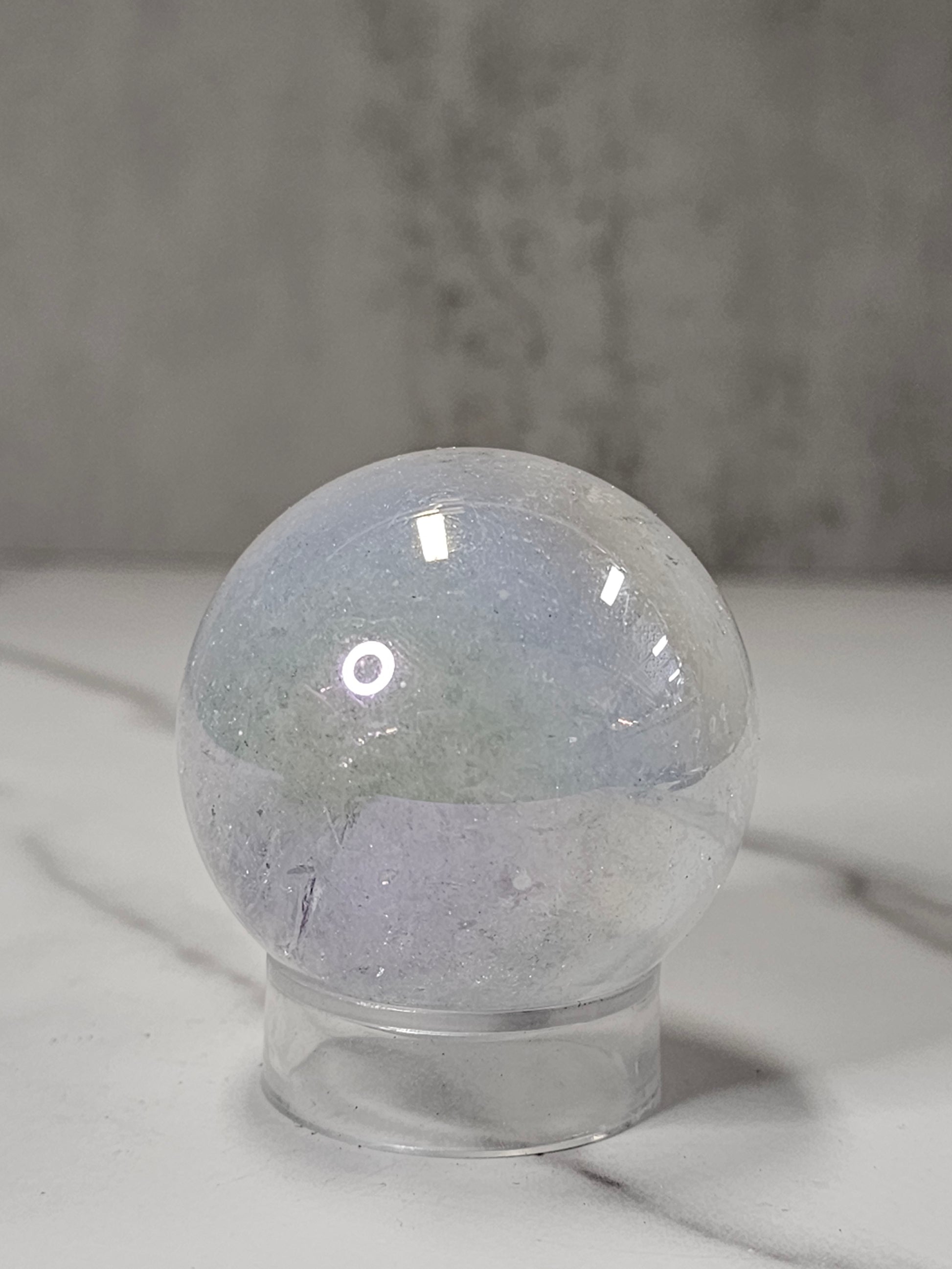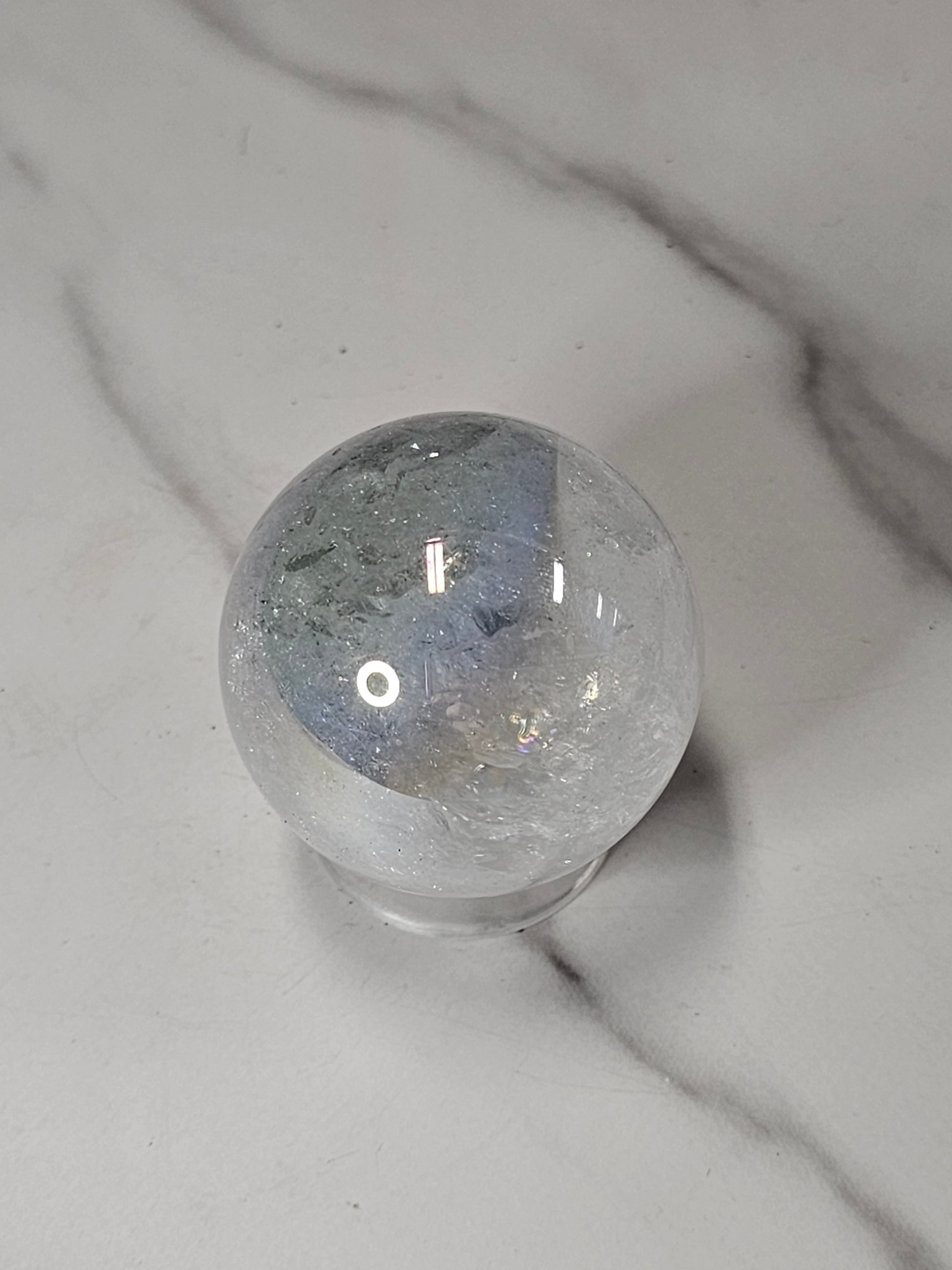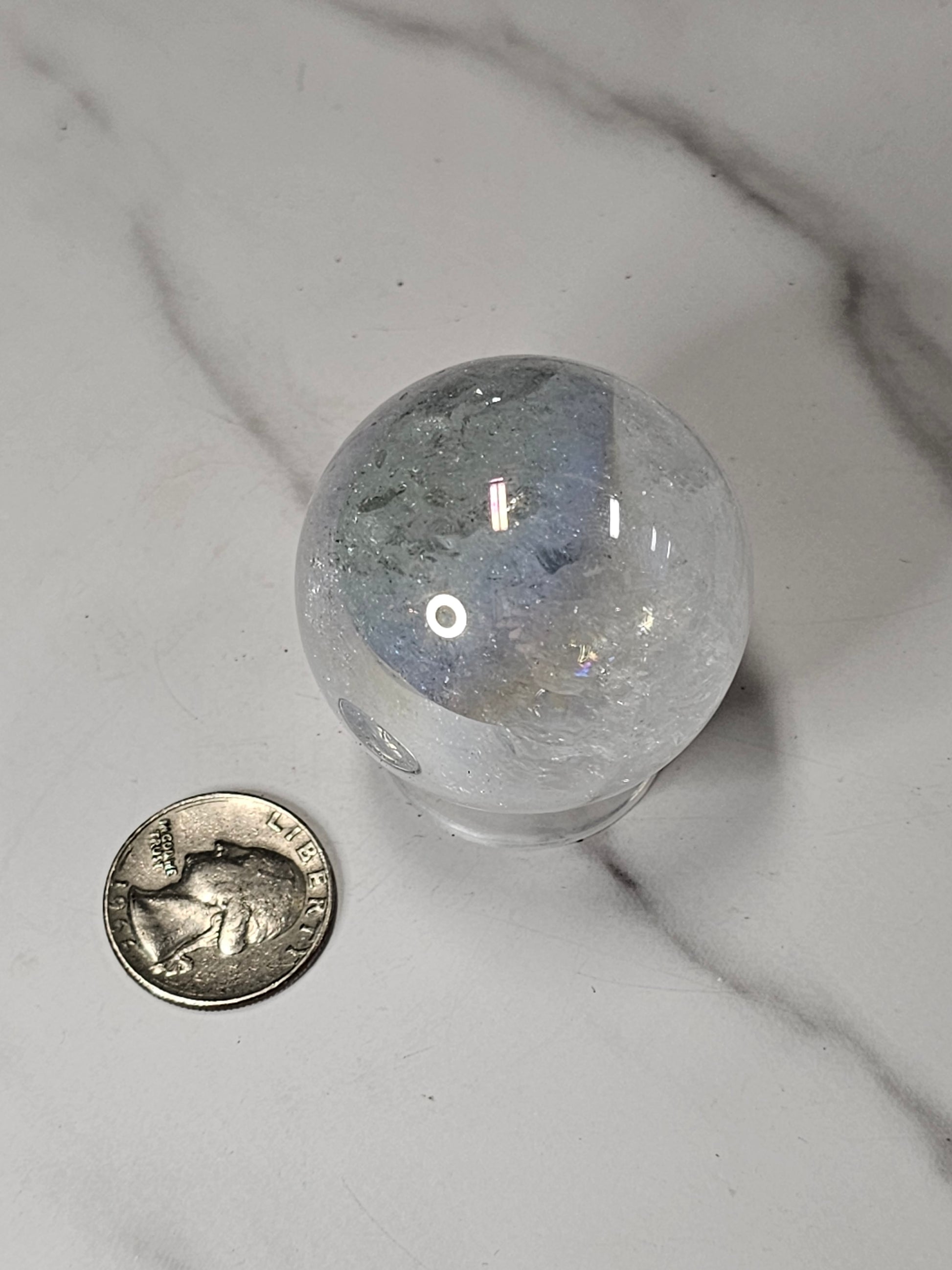 This Clear Quartz sphere has a beautiful aura coating giving it lots of iridescent rainbows.