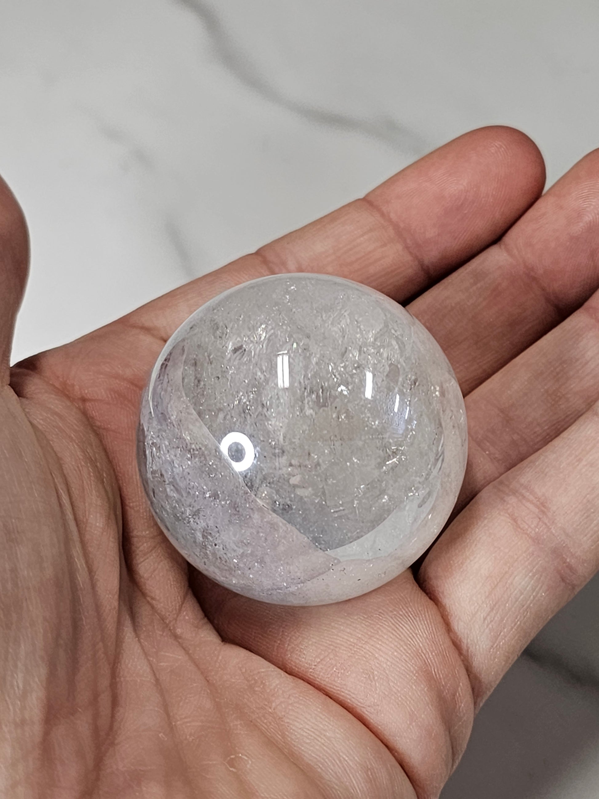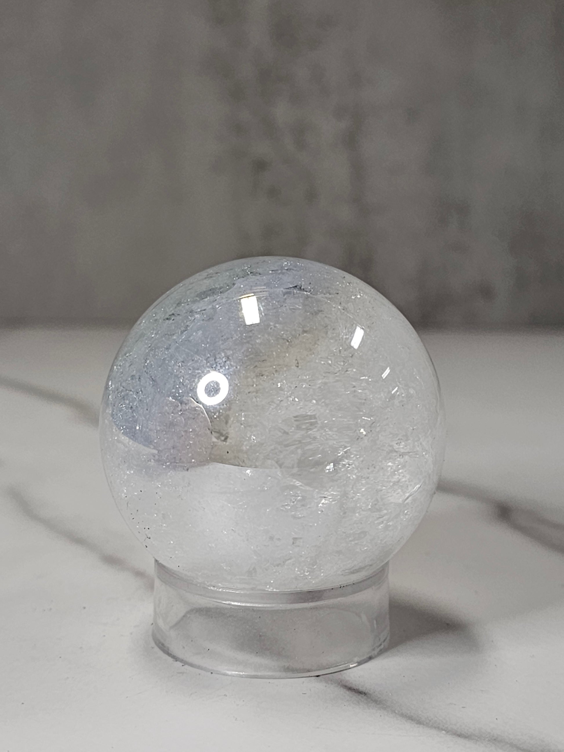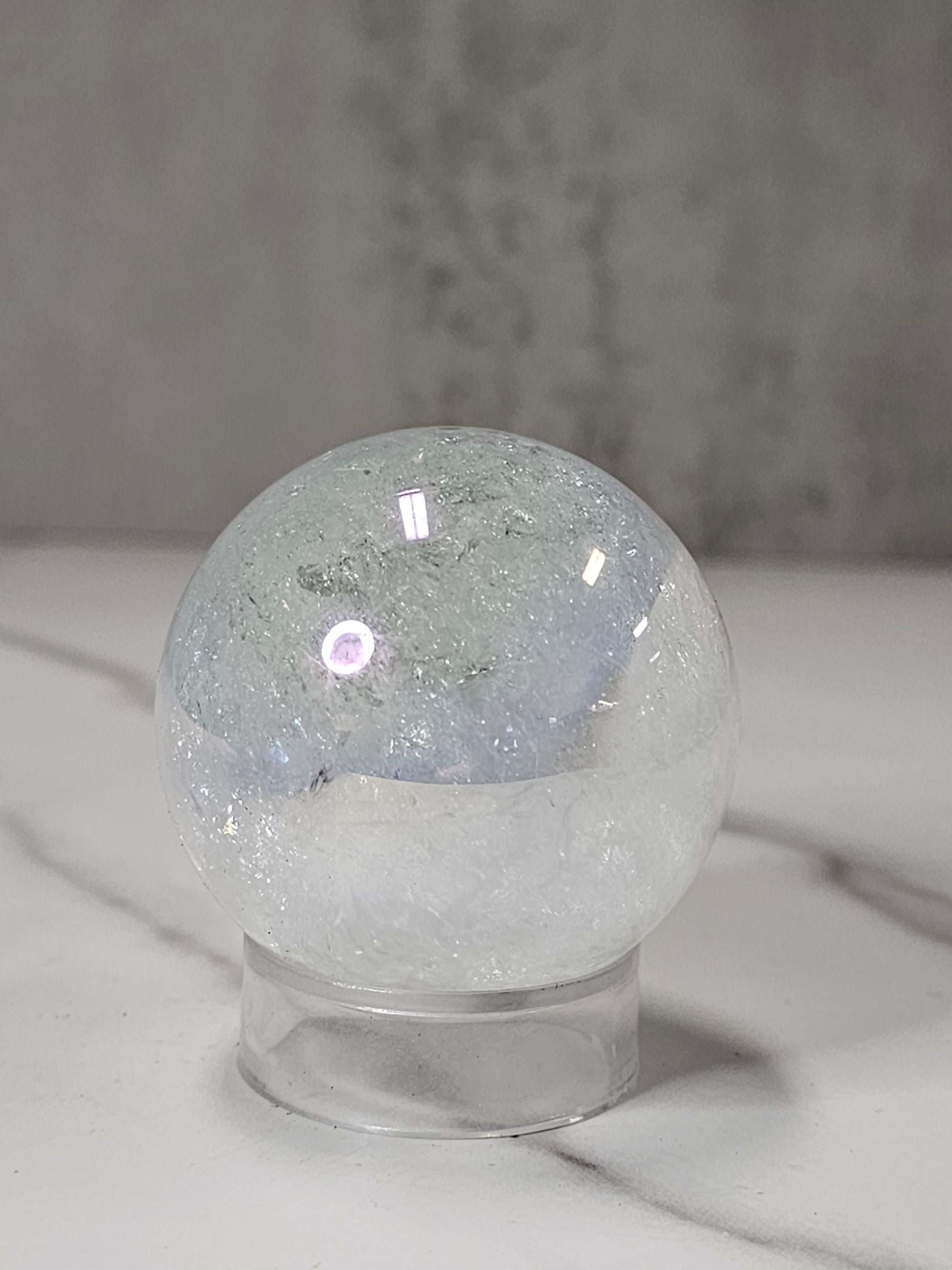 This Clear Quartz sphere has a beautiful aura coating giving it lots of iridescent rainbows.