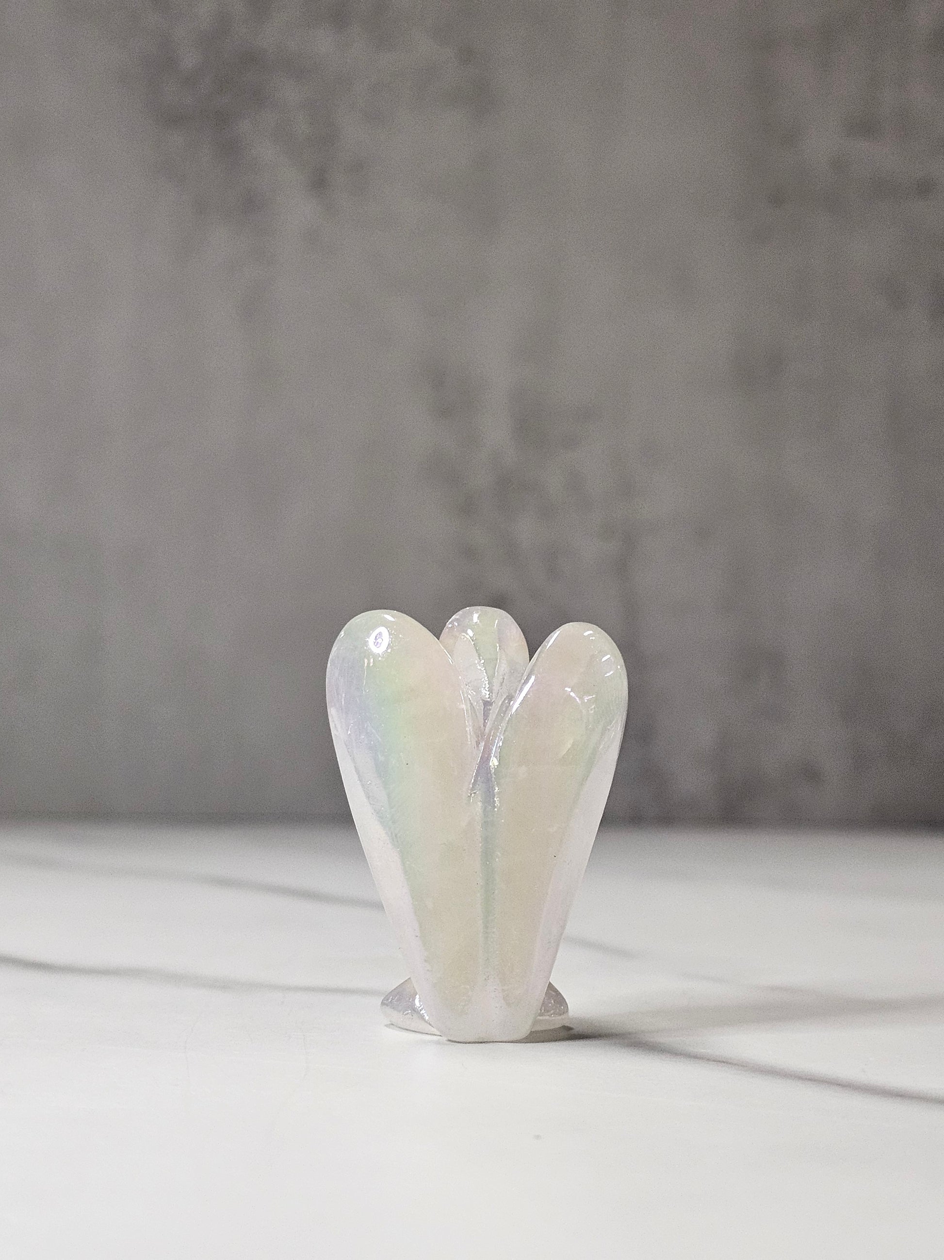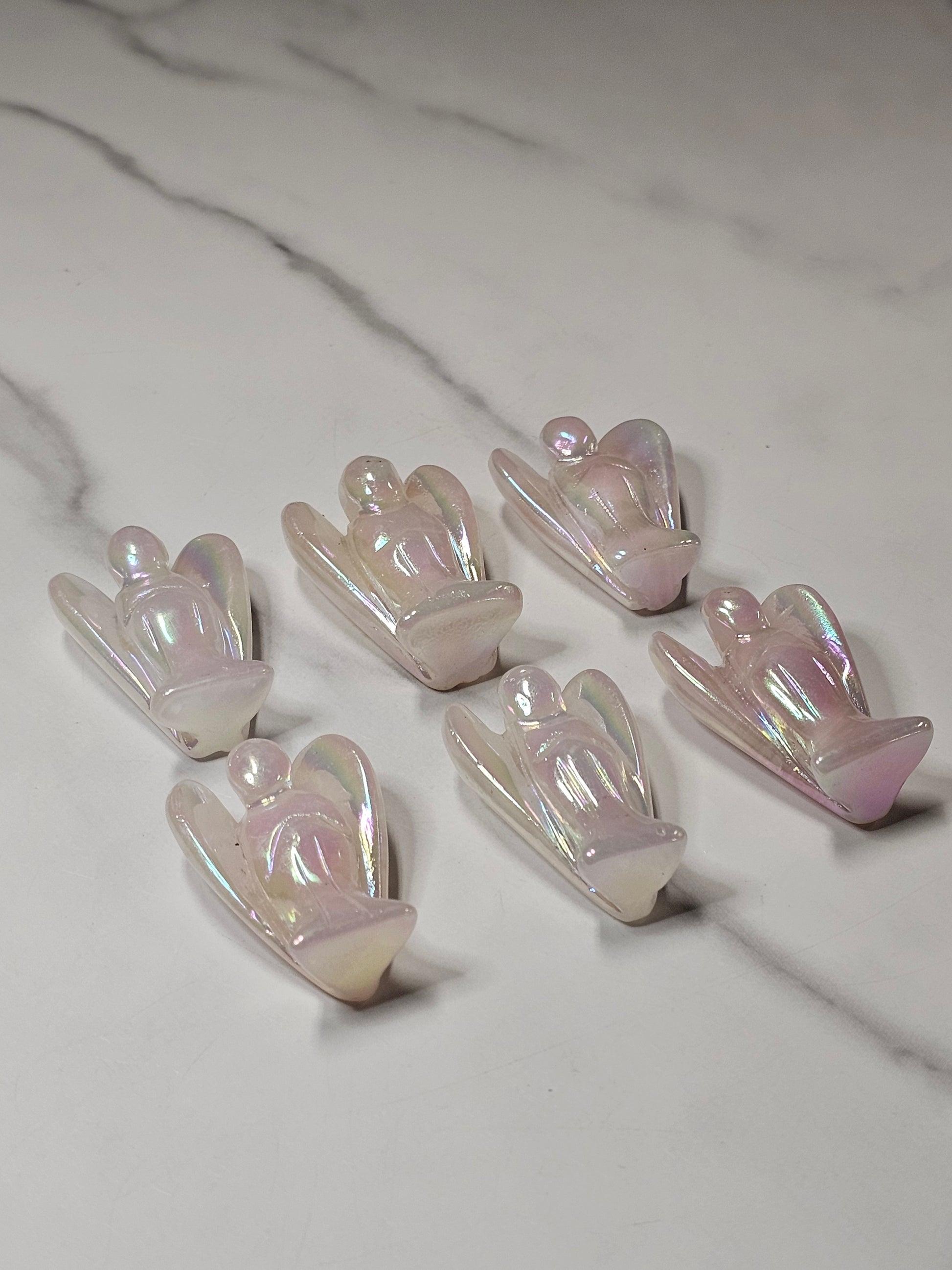 This Angel carvings are made out of Rose Quartz with a beautiful rainbow Aura coating. They stand up at 1.6 inches tall and are 1.1 inches wide.