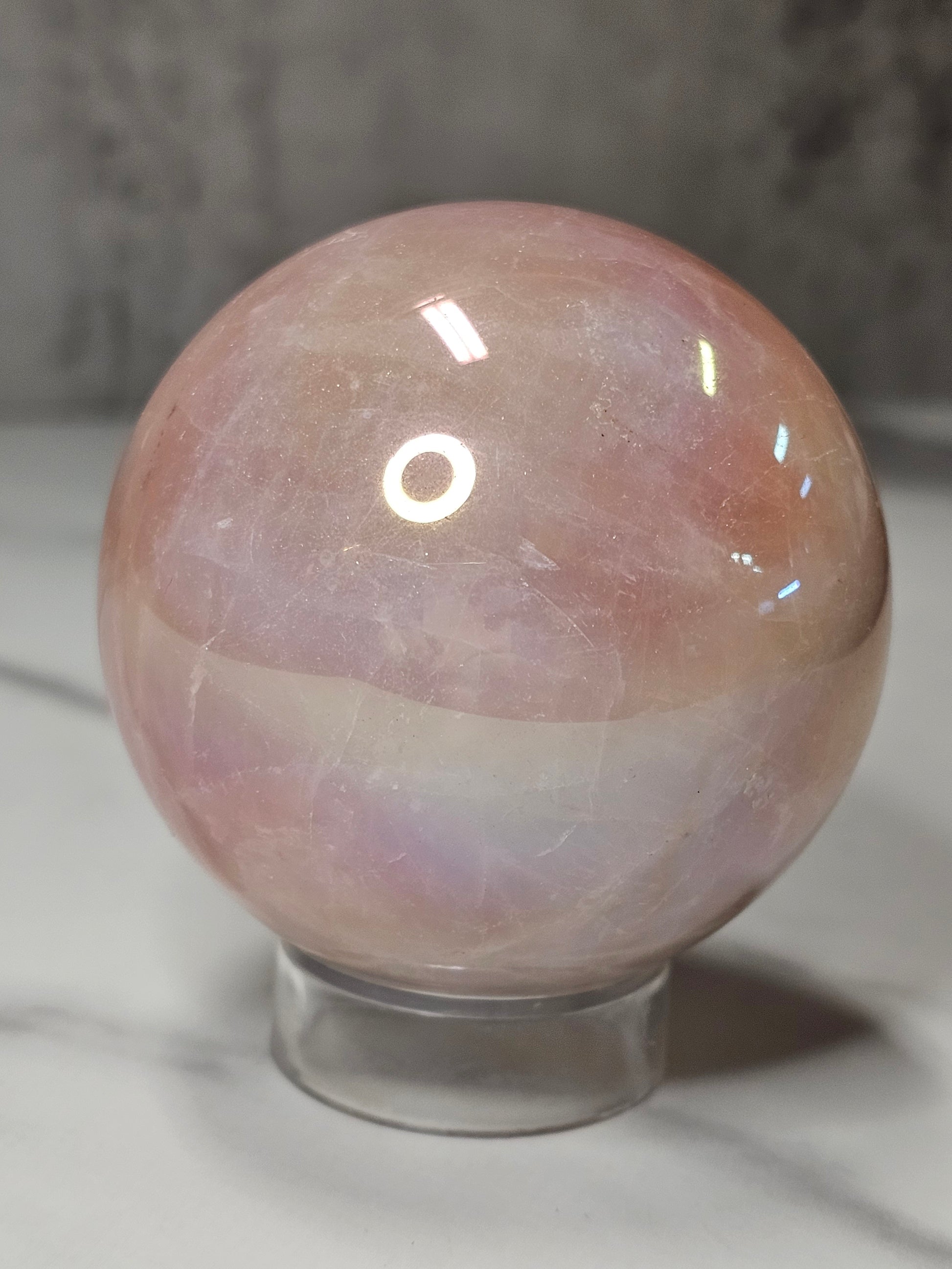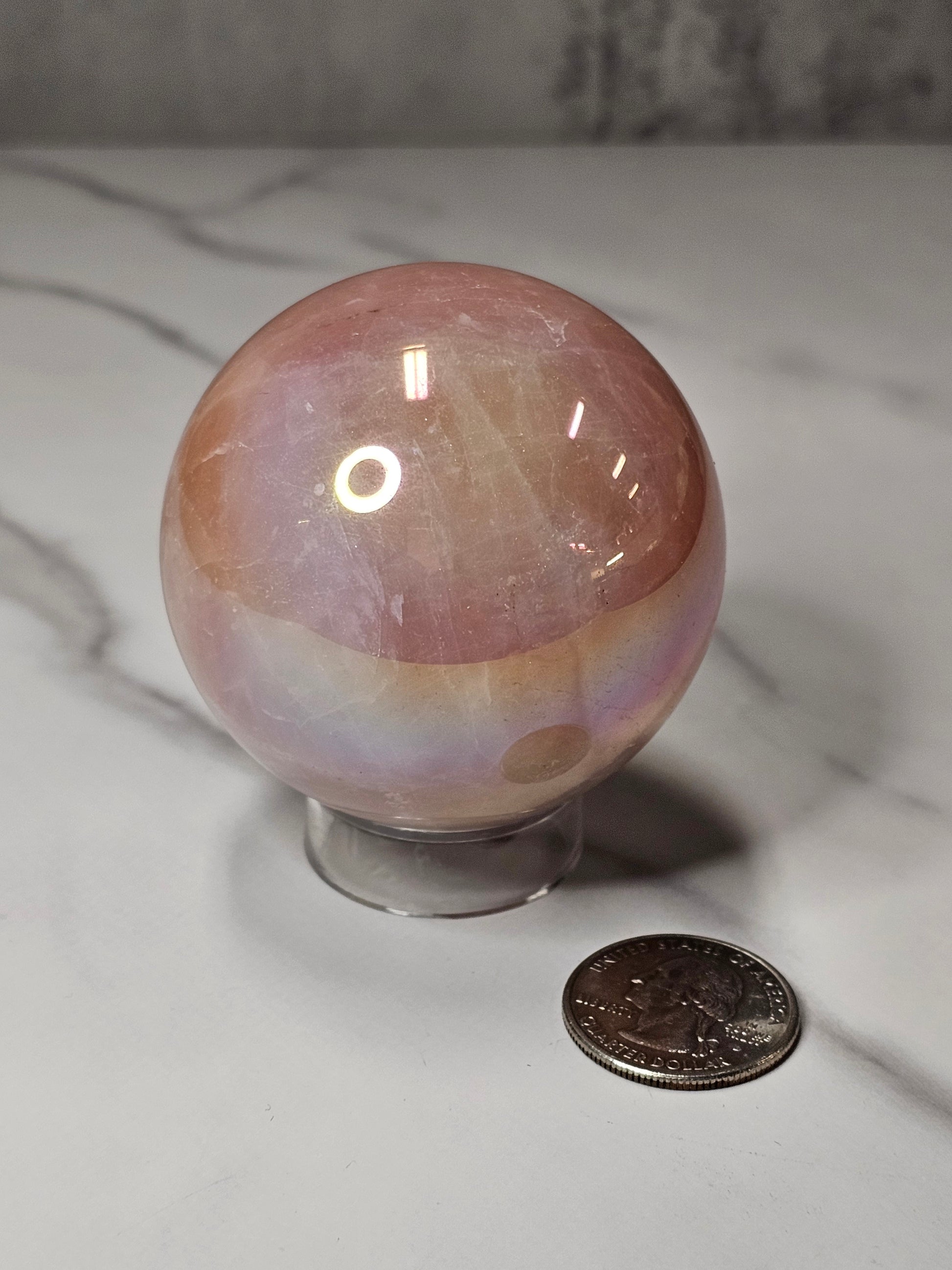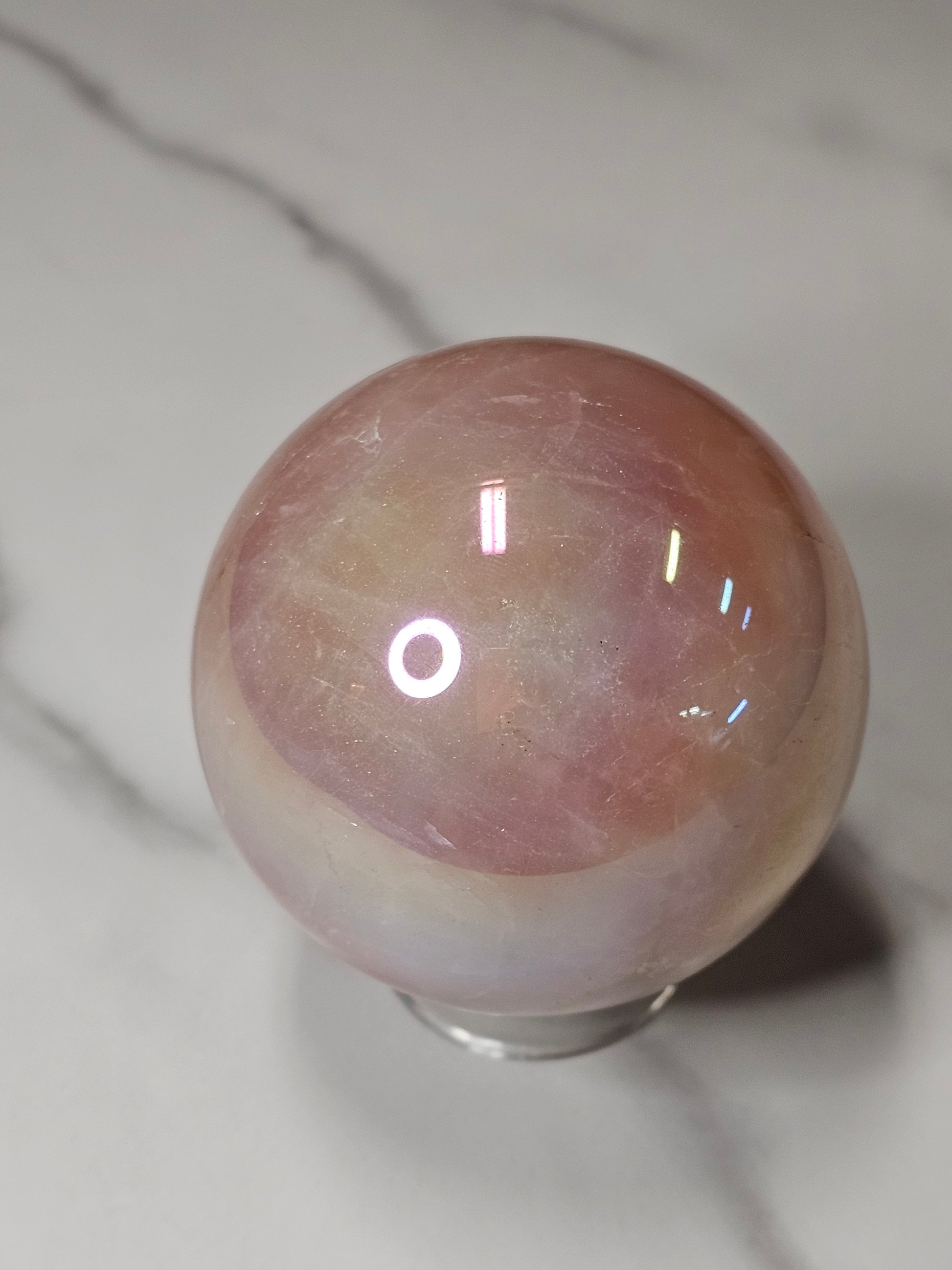 This Rose Quartz sphere has a beautiful aura coating. It has a diameter of 60.2mm. Excellent vibrant pink color with a cast of iridescent rainbow!