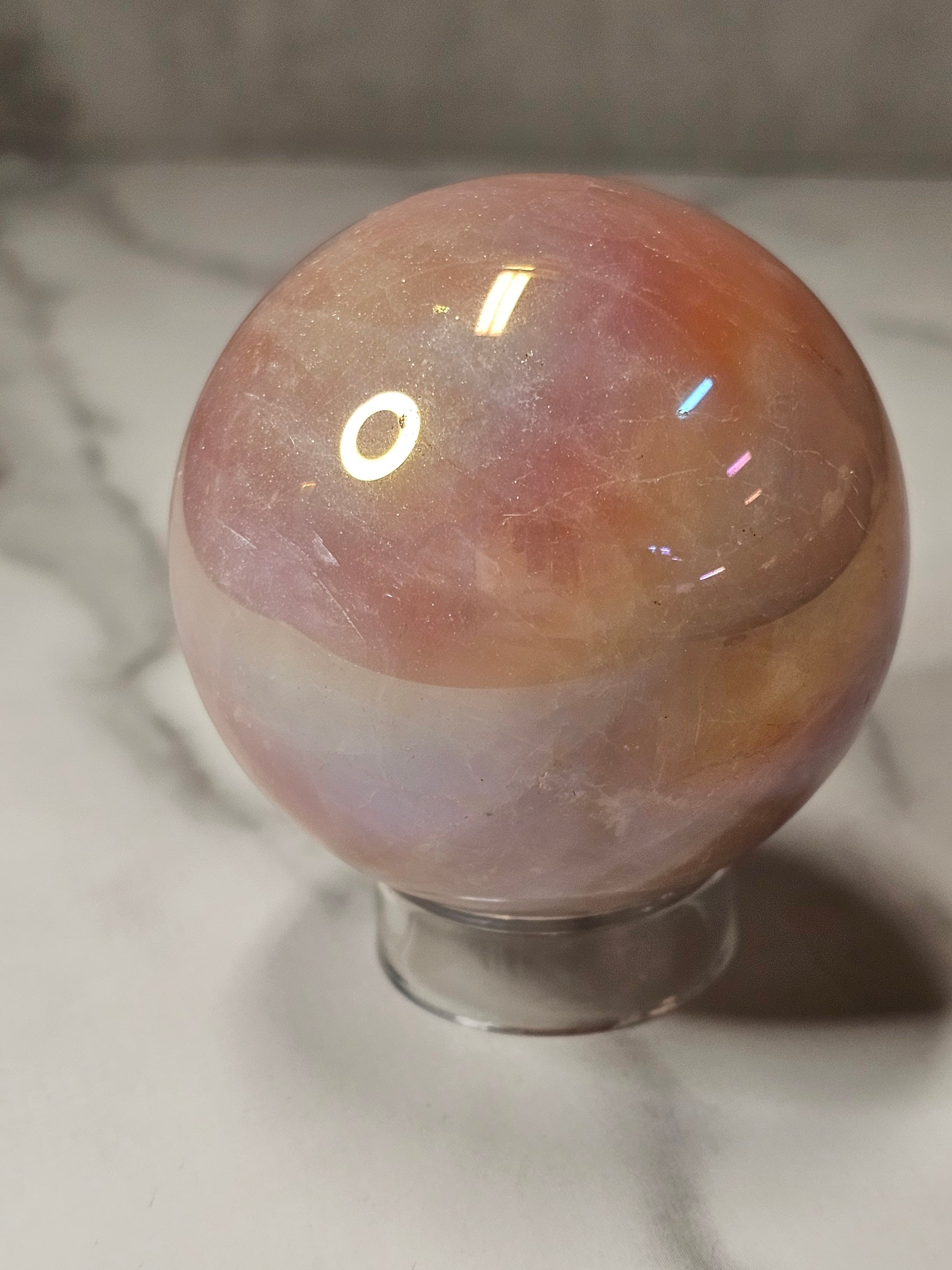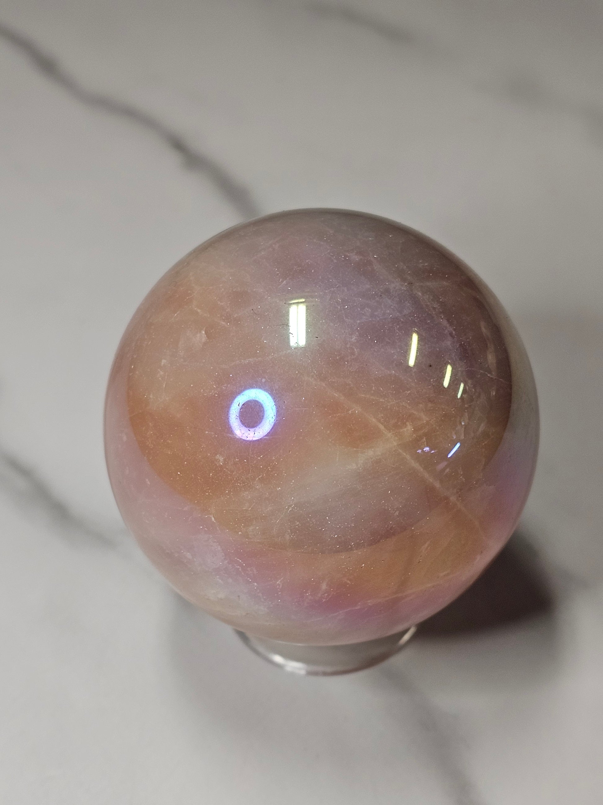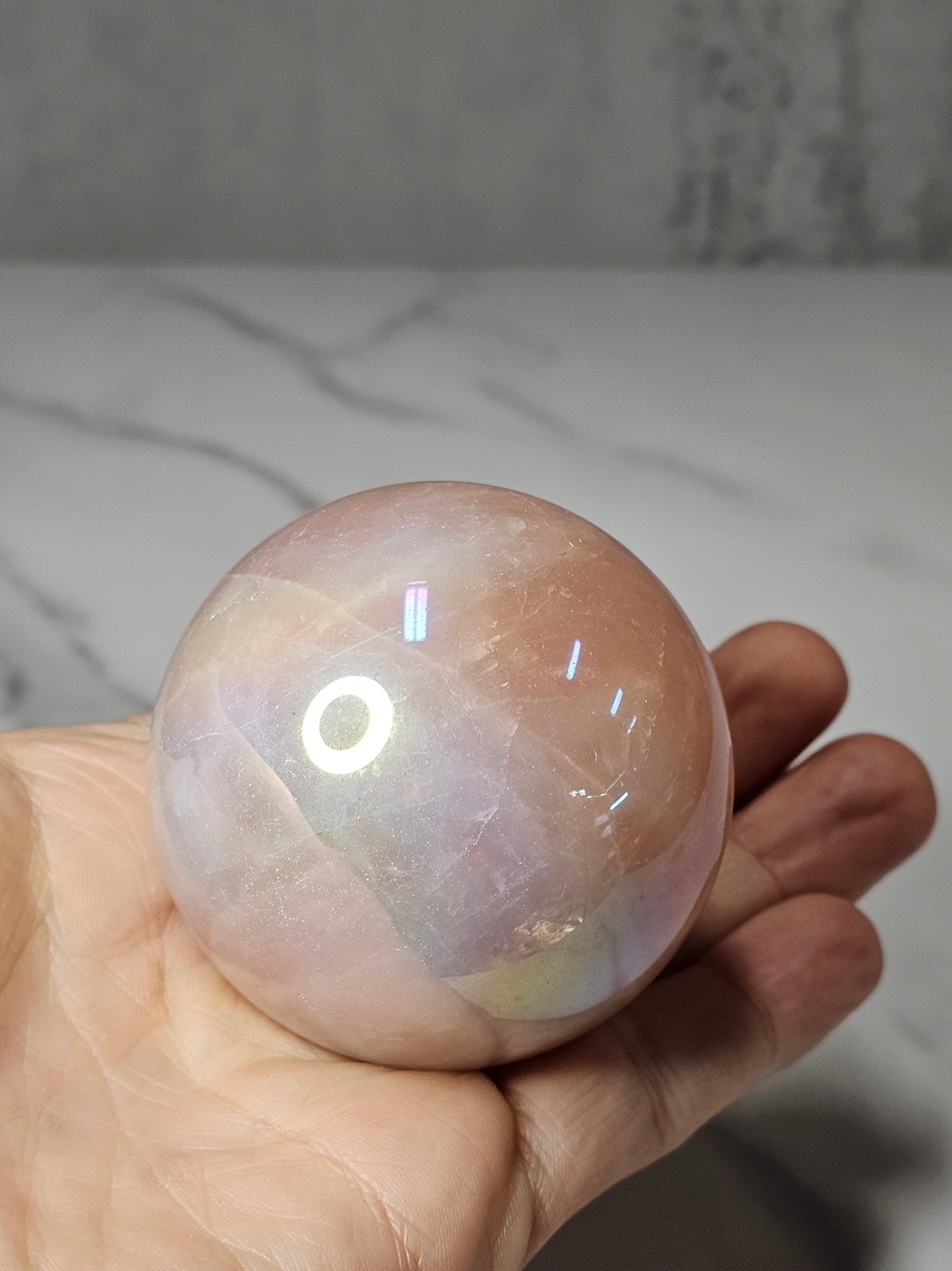This Rose Quartz sphere has a beautiful aura coating. It has a diameter of 60.2mm. Excellent vibrant pink color with a cast of iridescent rainbow!