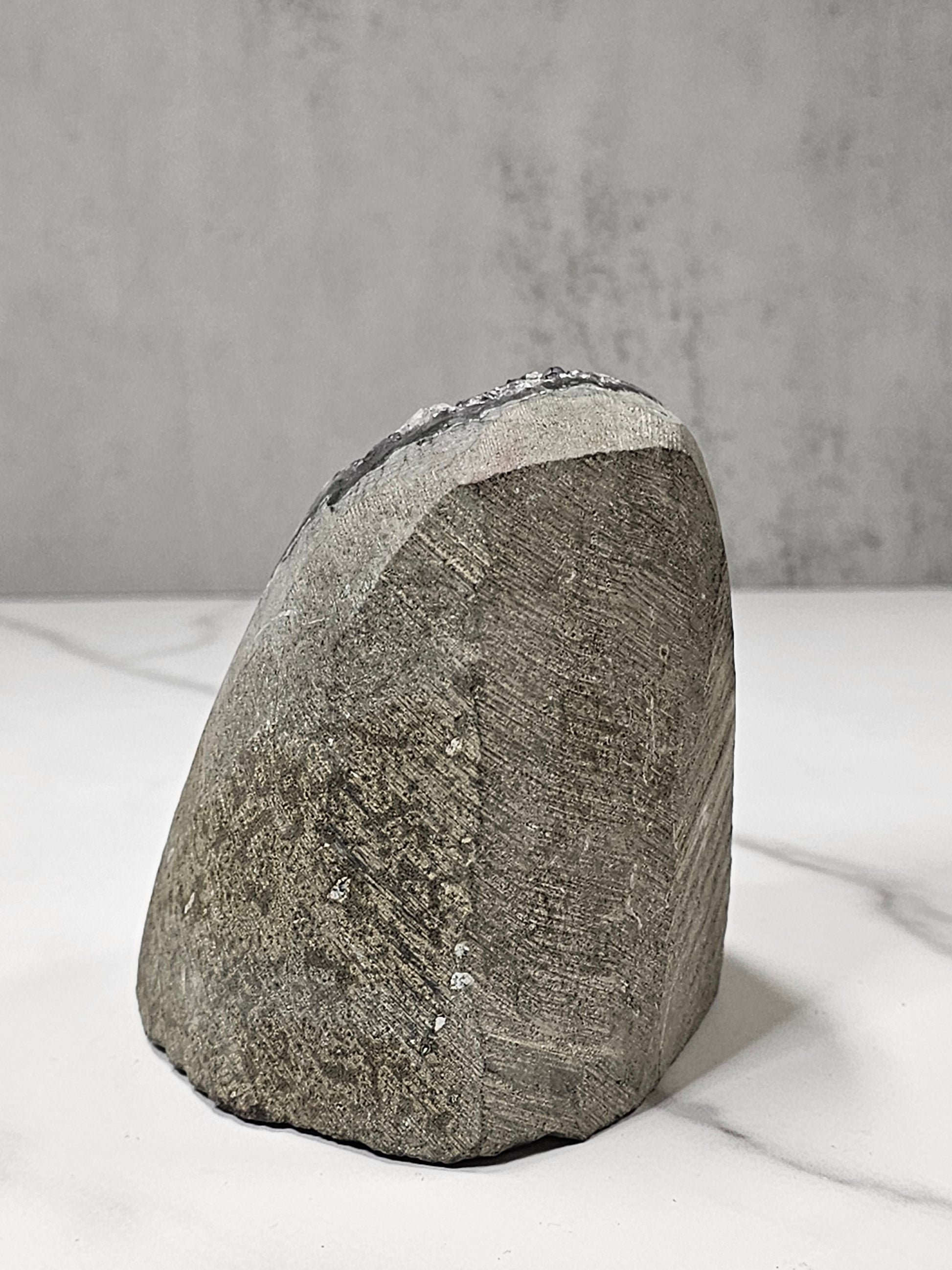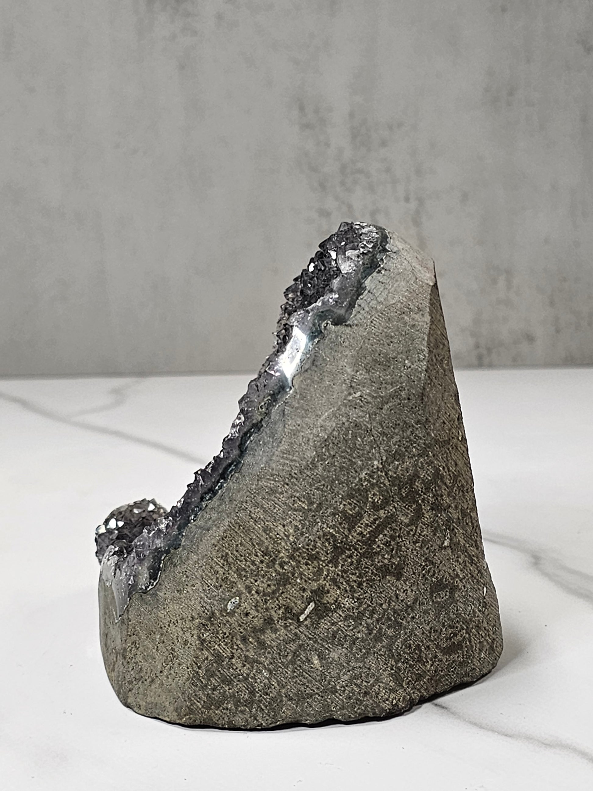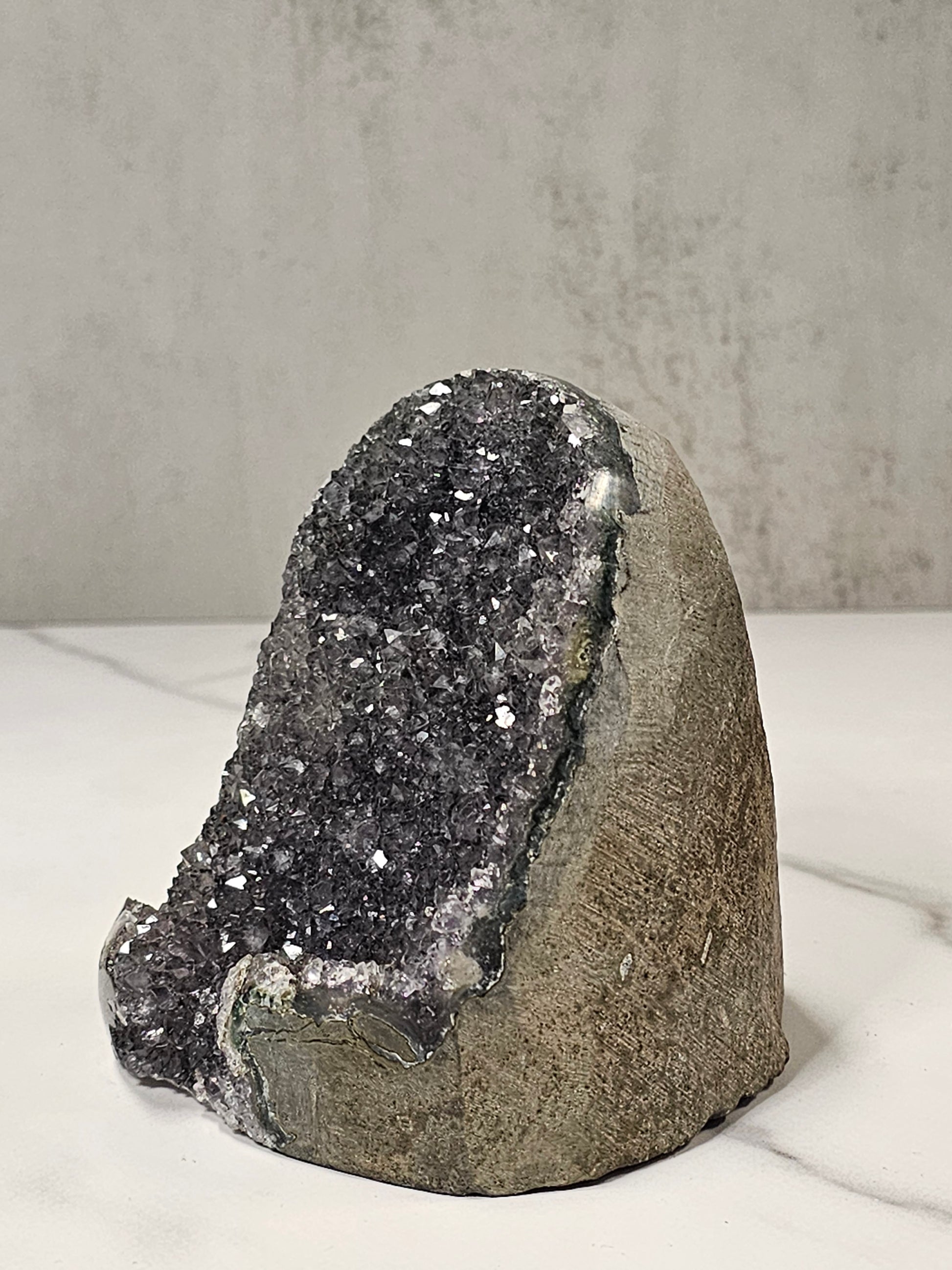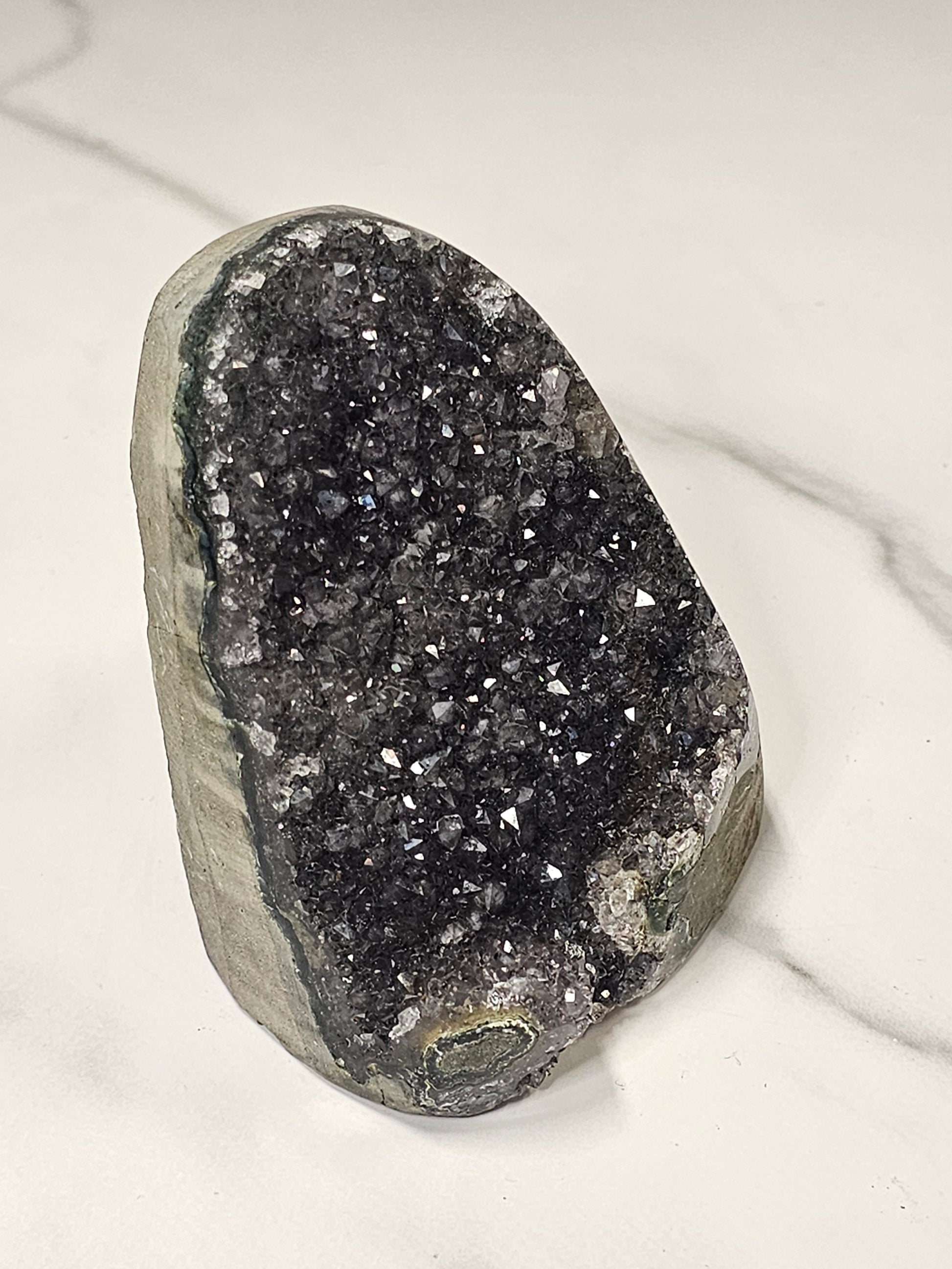 This Black Amethyst cut base with polished edges is exceptionally dark and sparkly. It weighs 22.1 ounces. It is 3.46 inches tall and 3.14 inches wide at the base. The exact crystal pictured is the one you will receive.