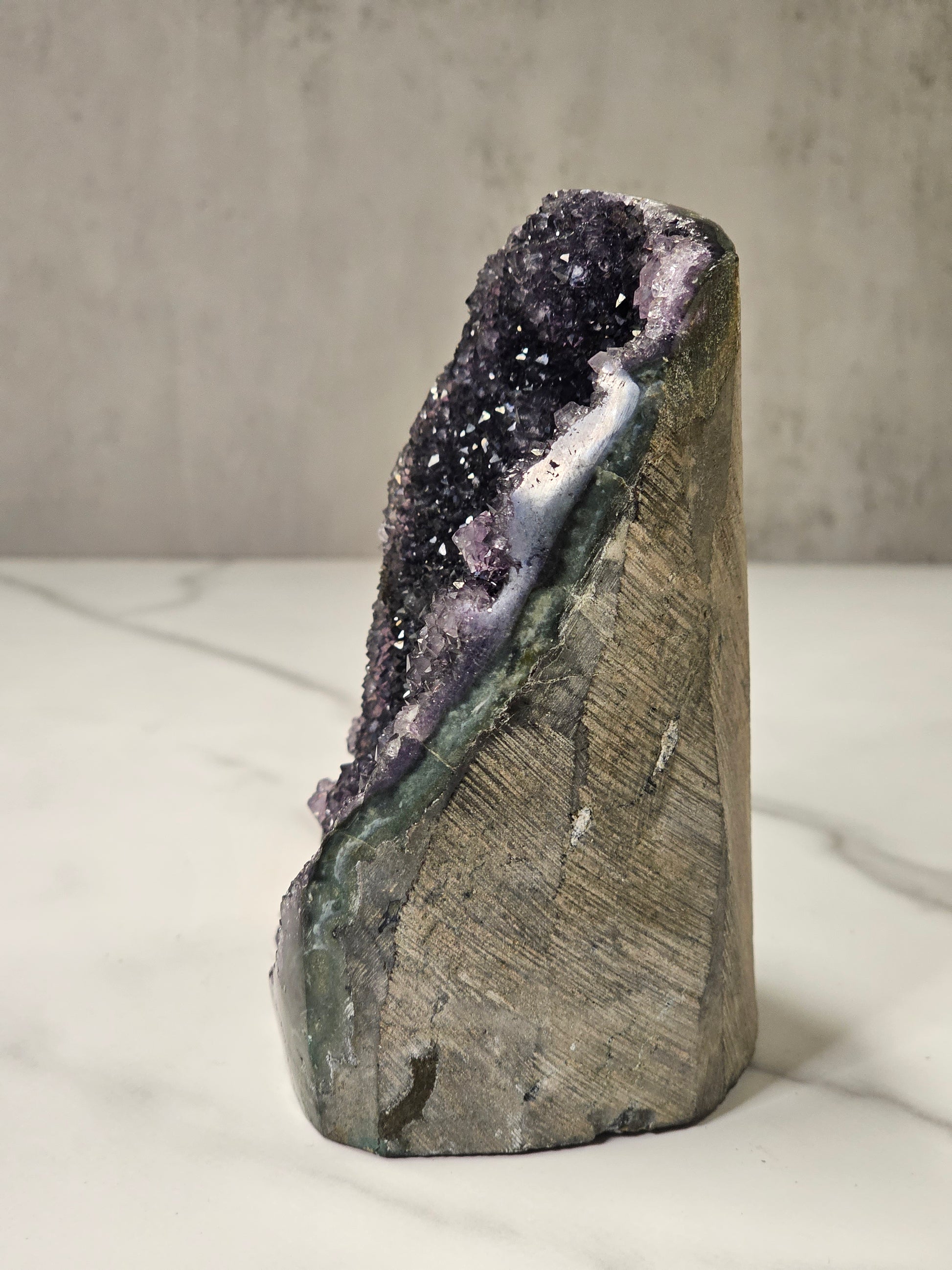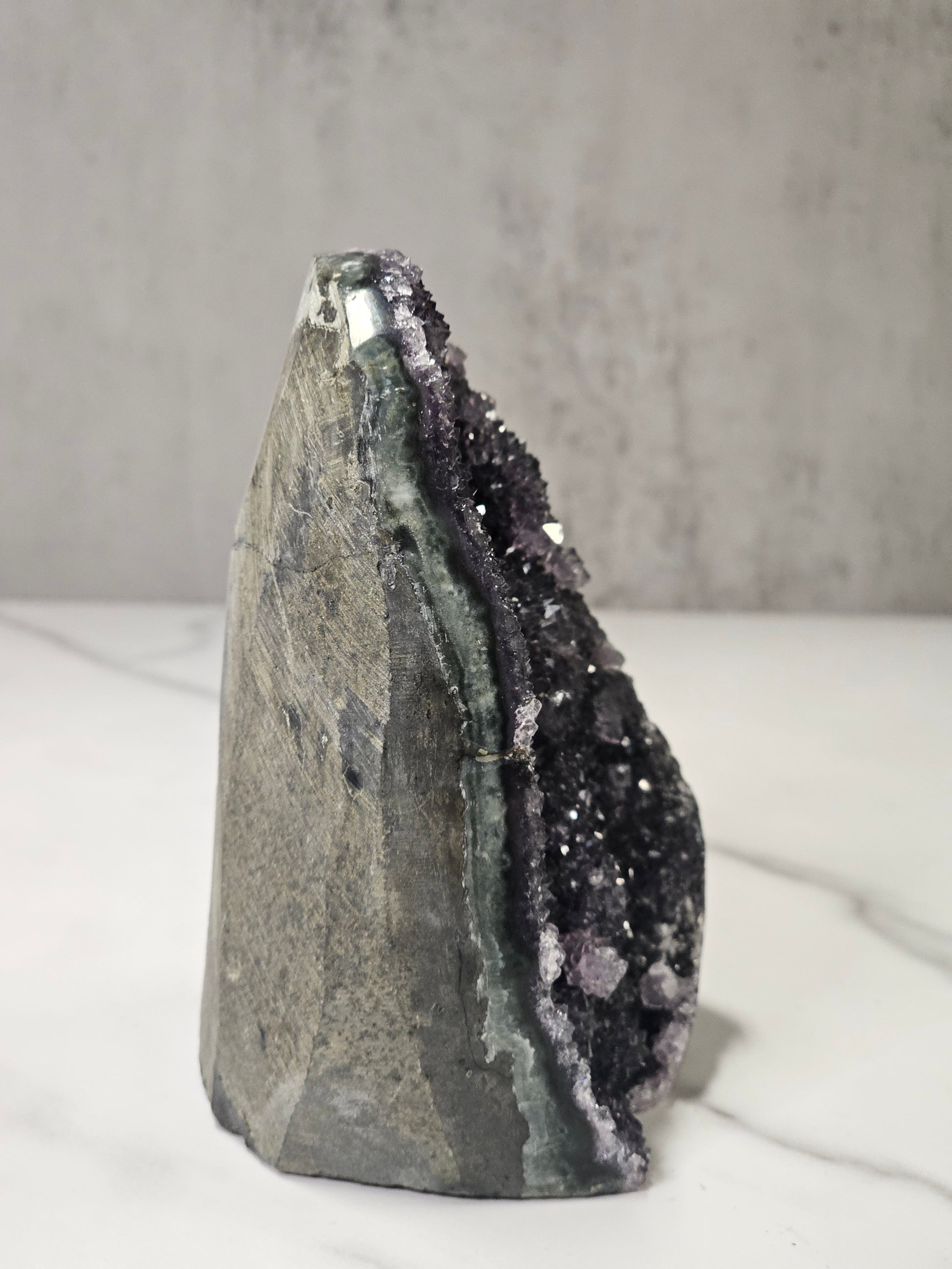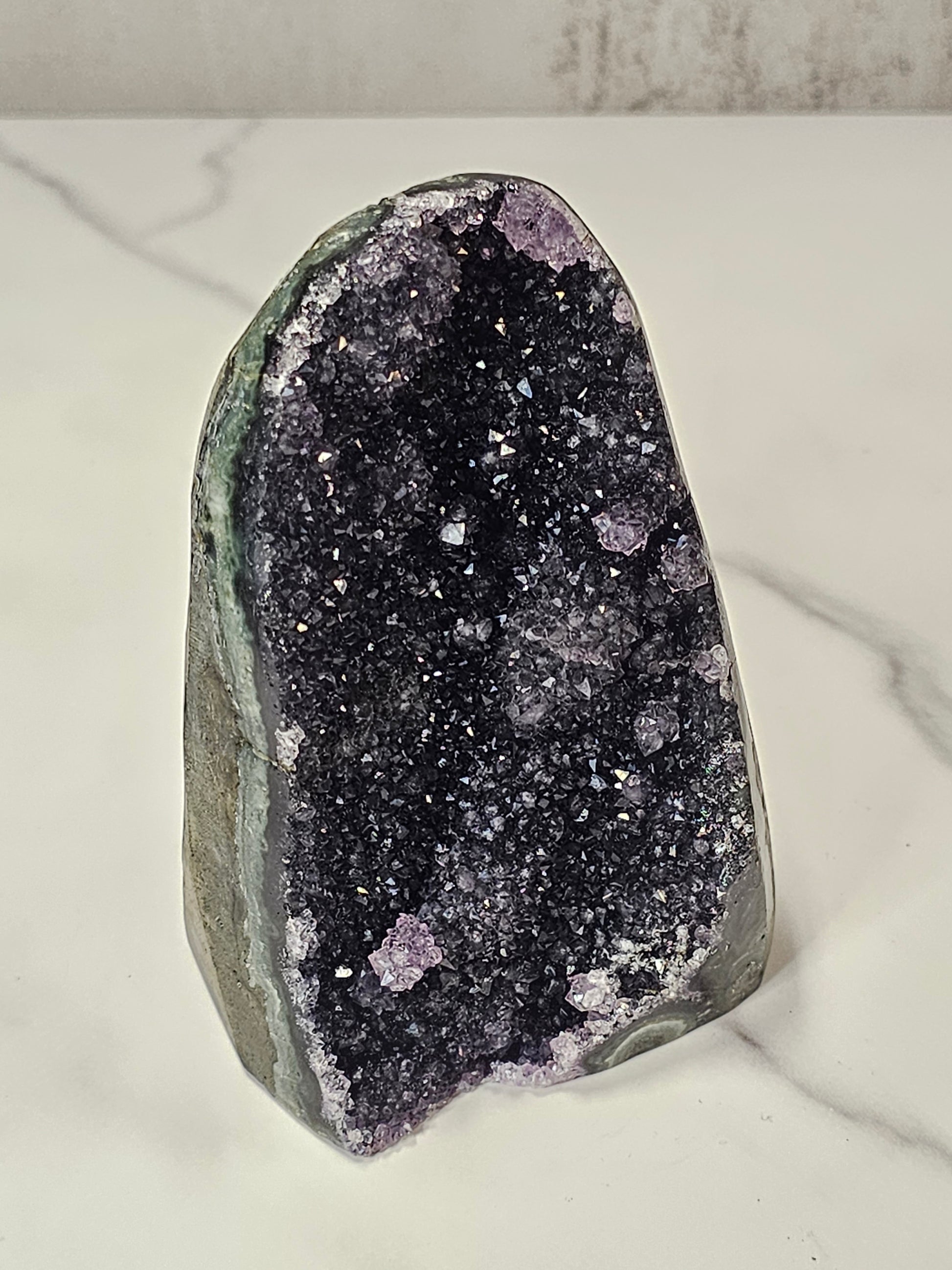This Black Amethyst cut base with polished edges is very nice. It weighs 21.1 ounces. It is 4.25 inches tall and 3 inches at the widest part of the base. The exact crystal pictured is the one you will receive.