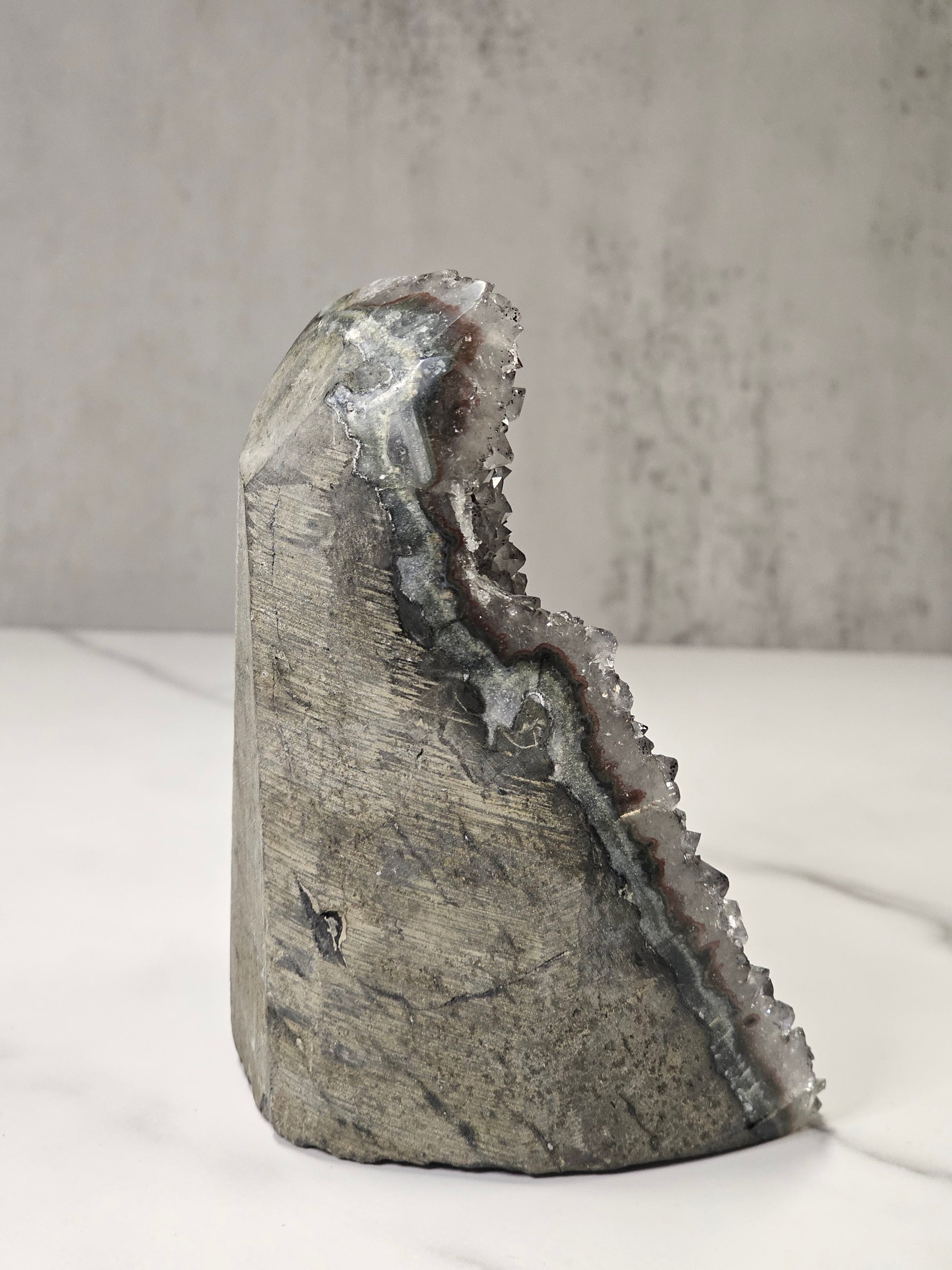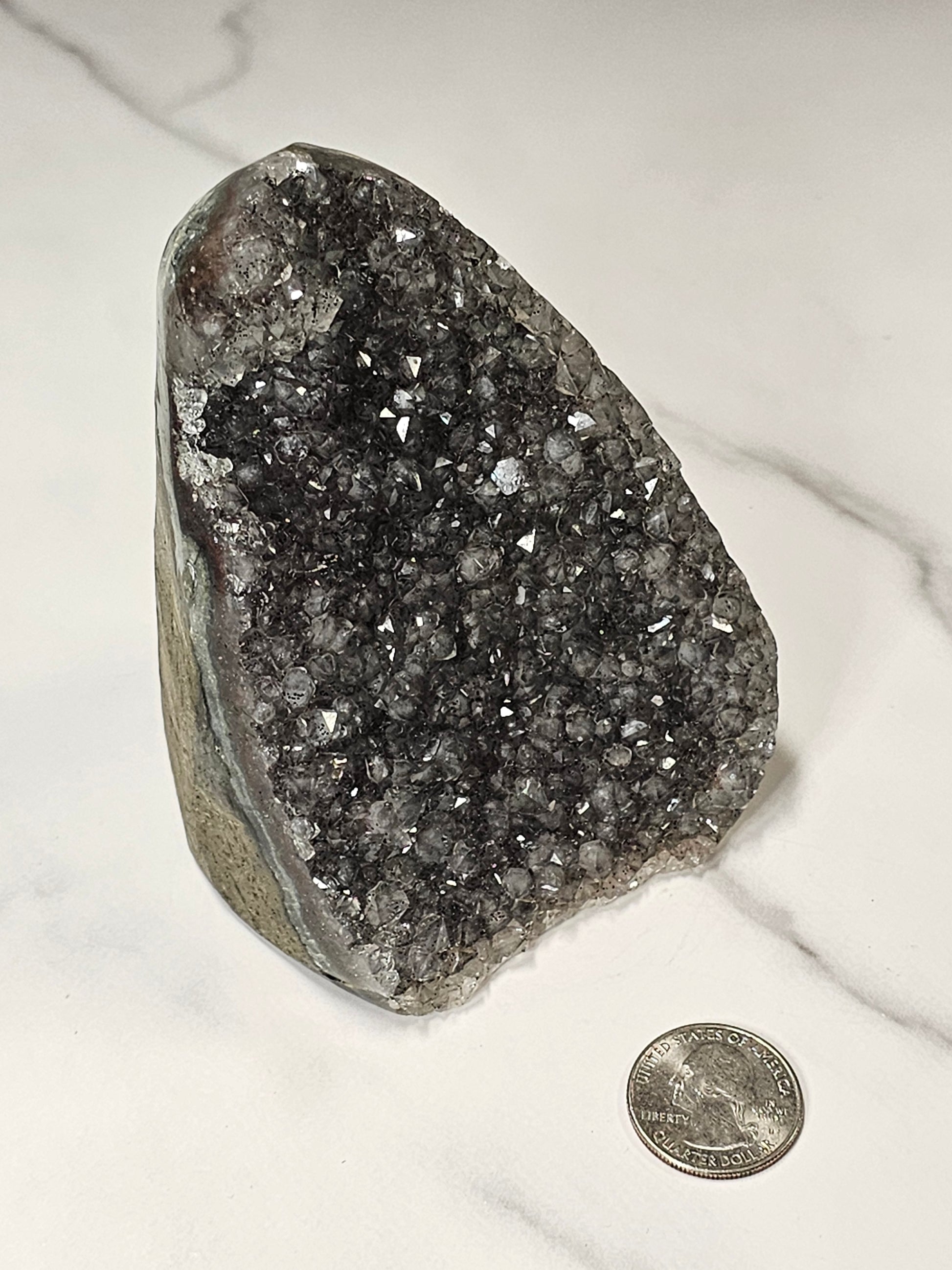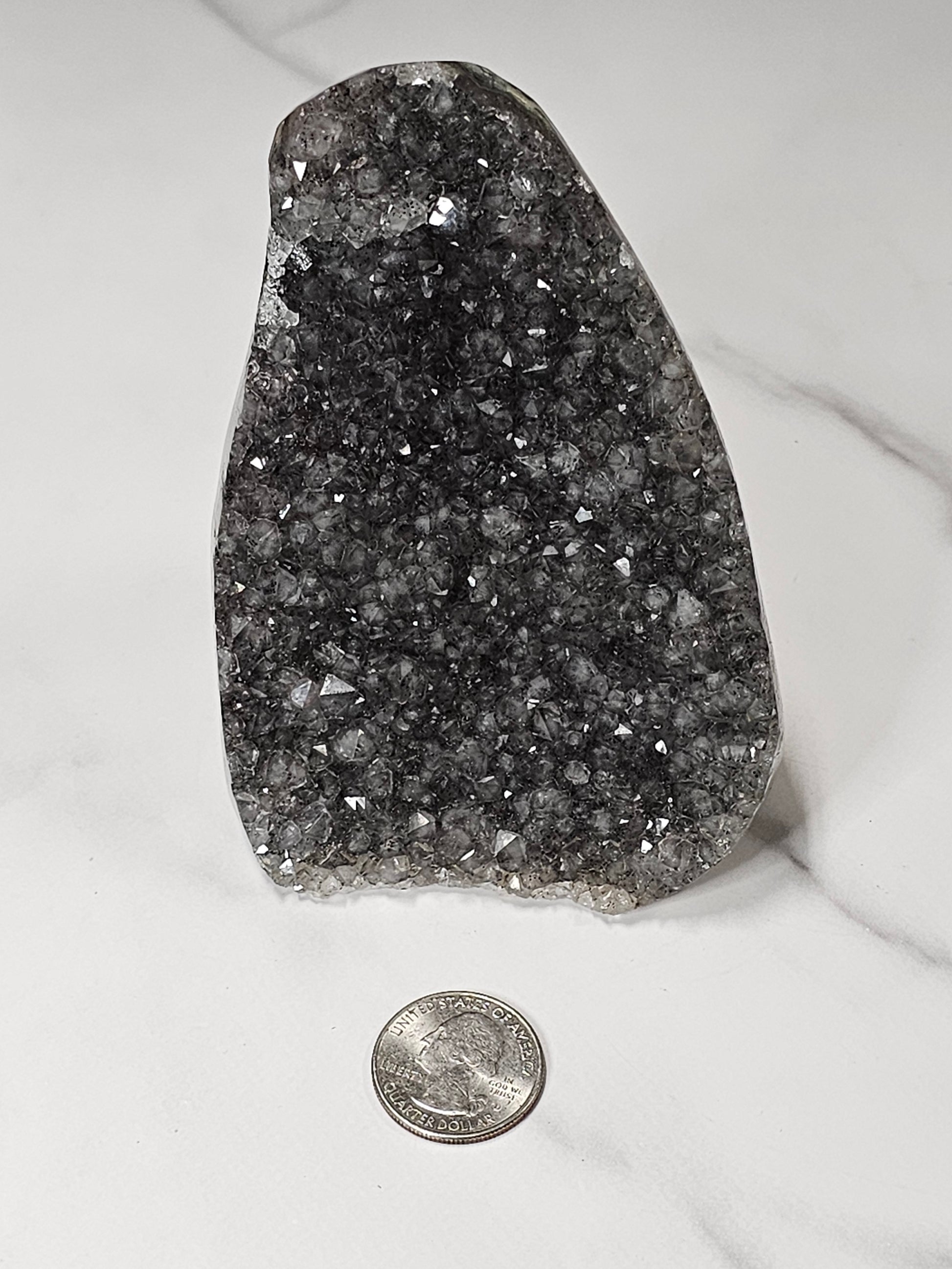 This Black Amethyst cut base with polished edges is very nice and has a good shape. It weighs 24.4 ounces. It is 4.43 inches tall and 3.37 inches at the widest part of the base. The exact crystal pictured is the one you will receive.