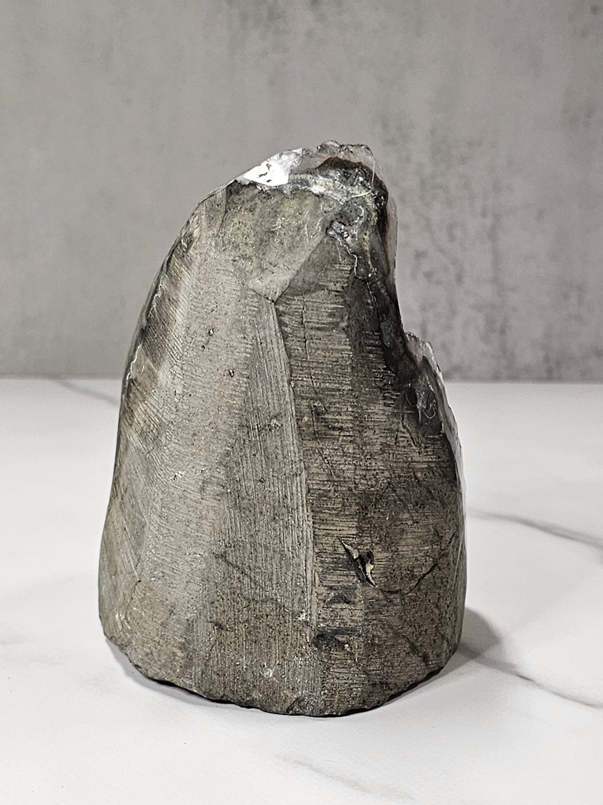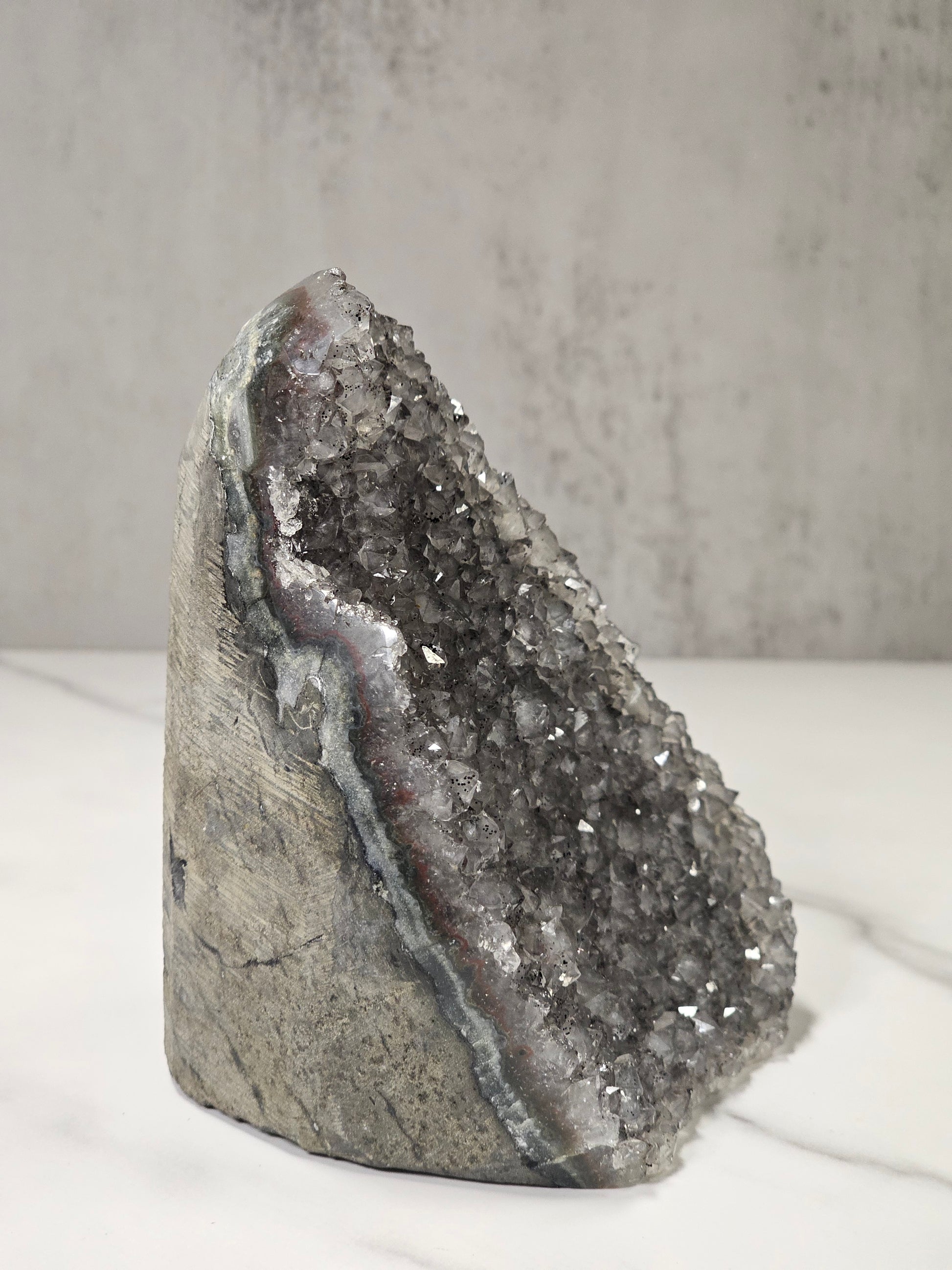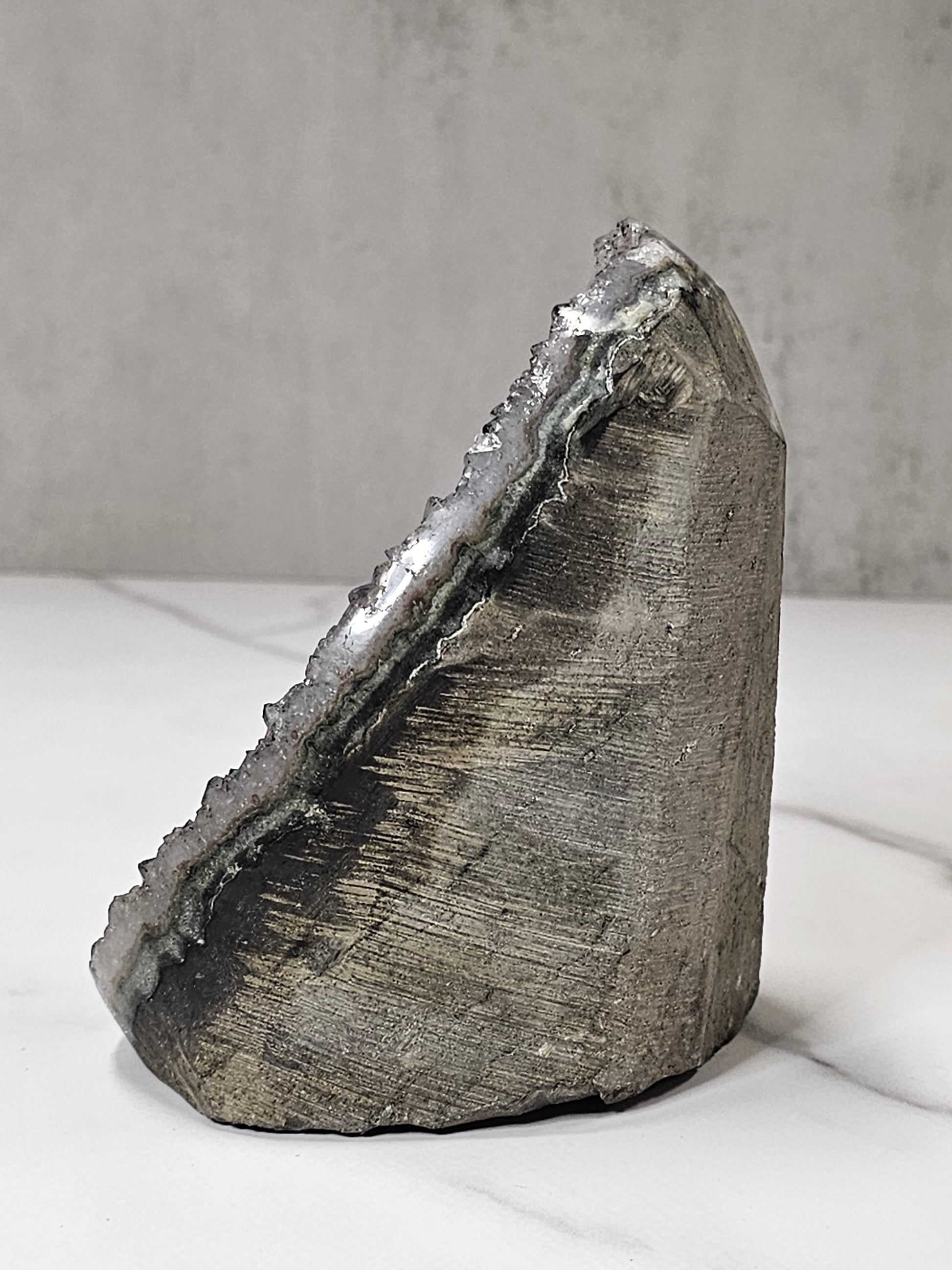 This Black Amethyst cut base with polished edges is very nice and has a good shape. It weighs 24.4 ounces. It is 4.43 inches tall and 3.37 inches at the widest part of the base. The exact crystal pictured is the one you will receive.