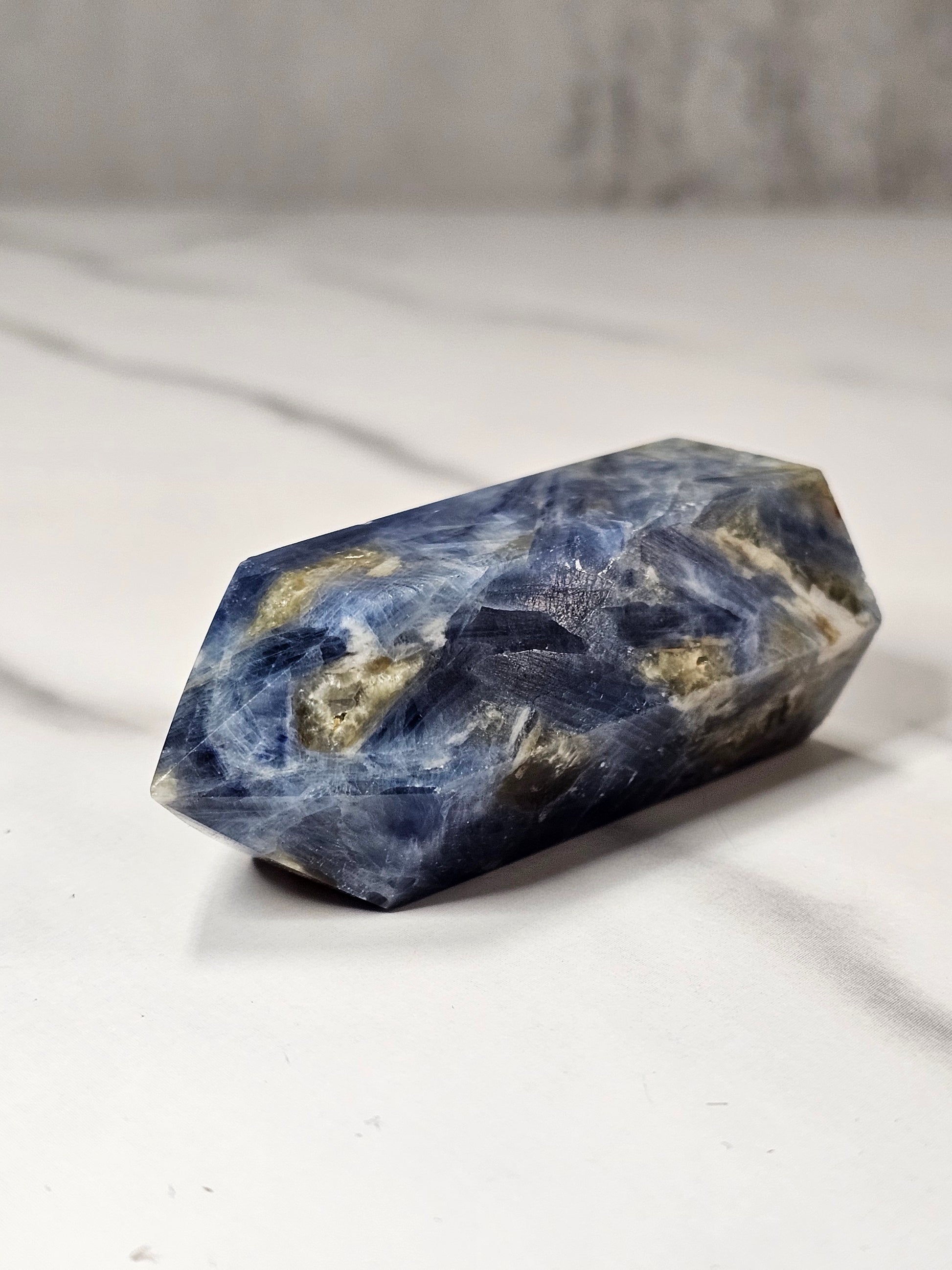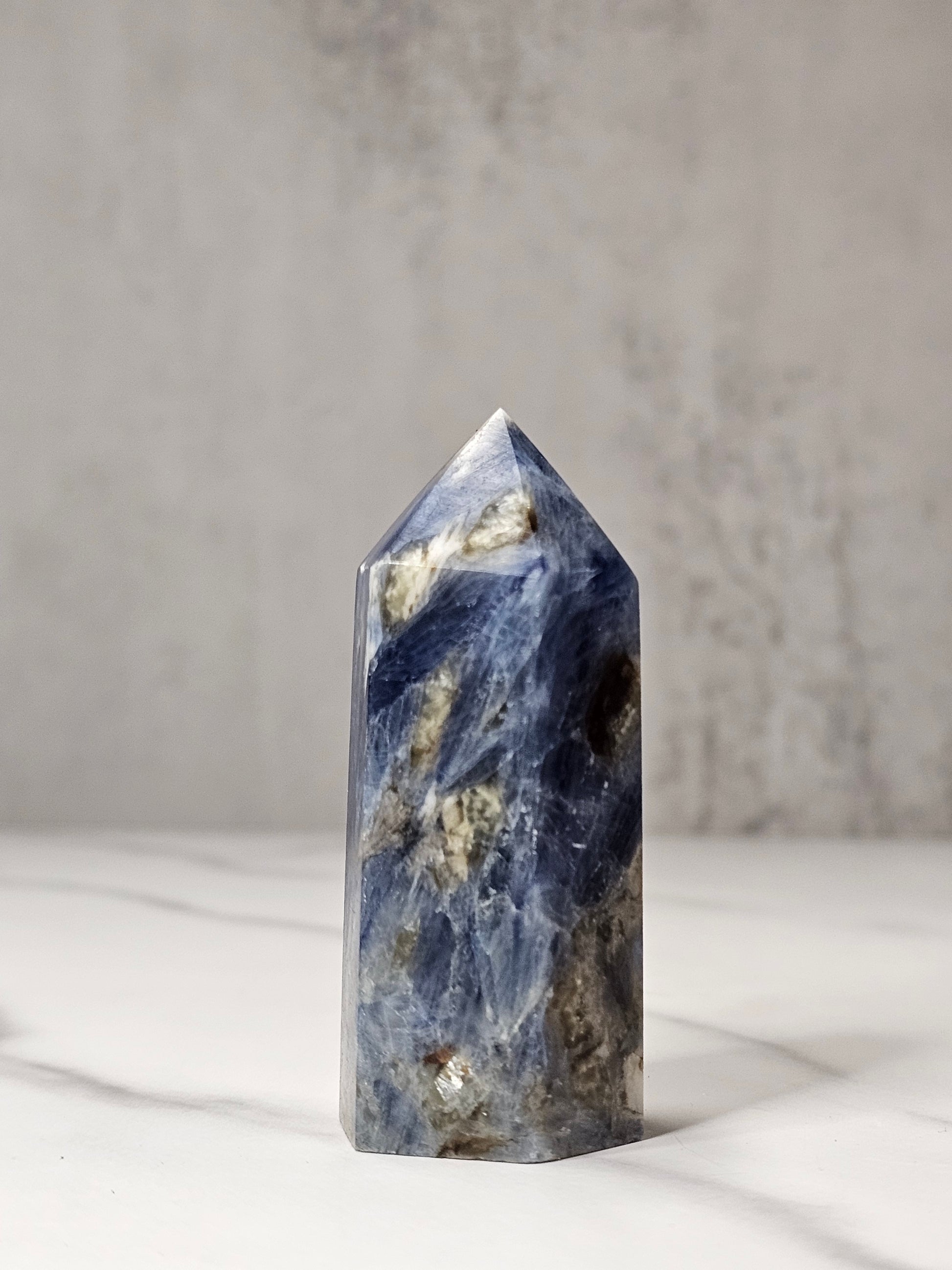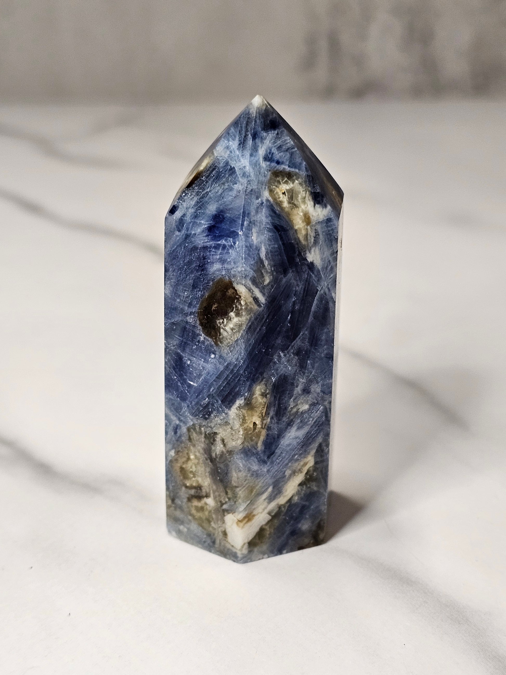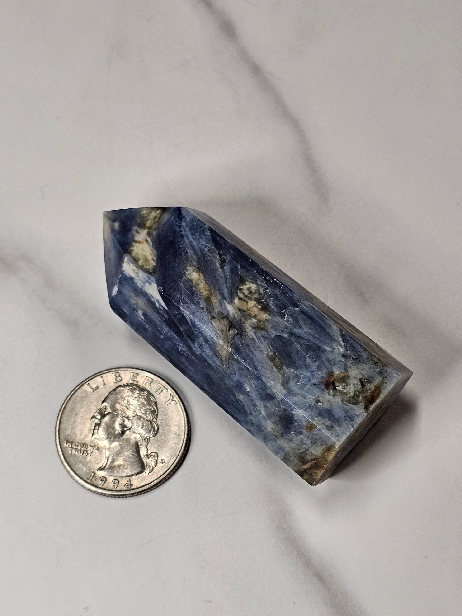 This tower is 2.51 inches tall. It has a base diameter of 1.07 inches. It weighs 2.9 ounces. Excellent striking blue and golden hues.