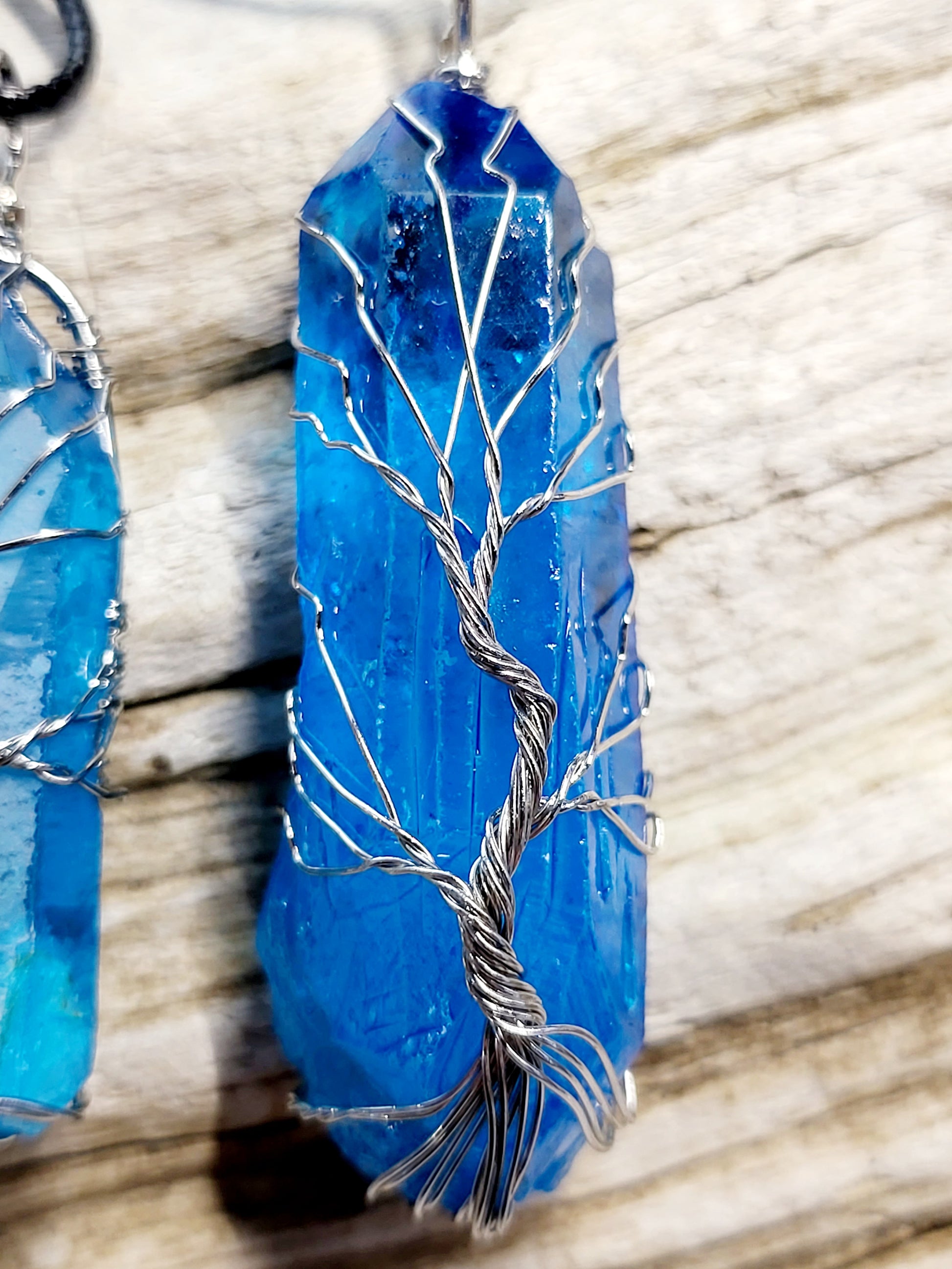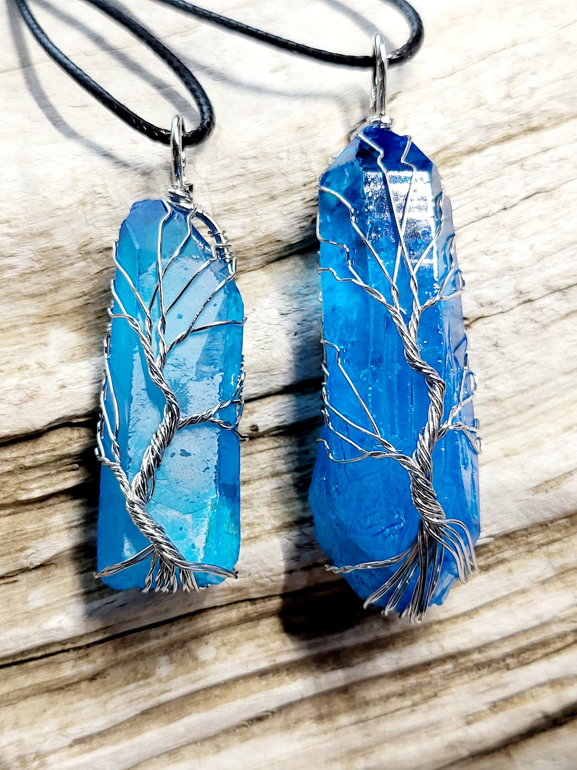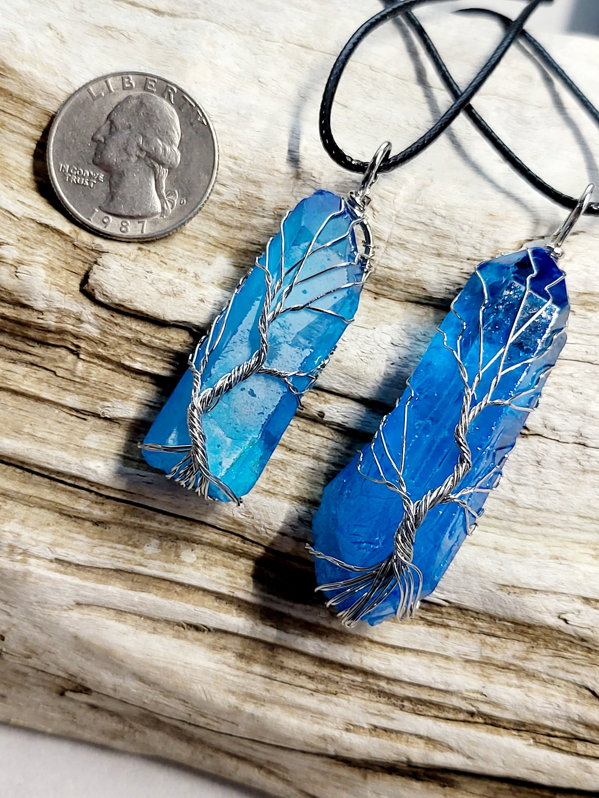 This blue Quartz point has been wrapped with silver wire in a Tree of Life design. It comes on an 18" black waxed cord with metal clasps. The necklace you will receive is not the exact one pictured but will be very similar in size.