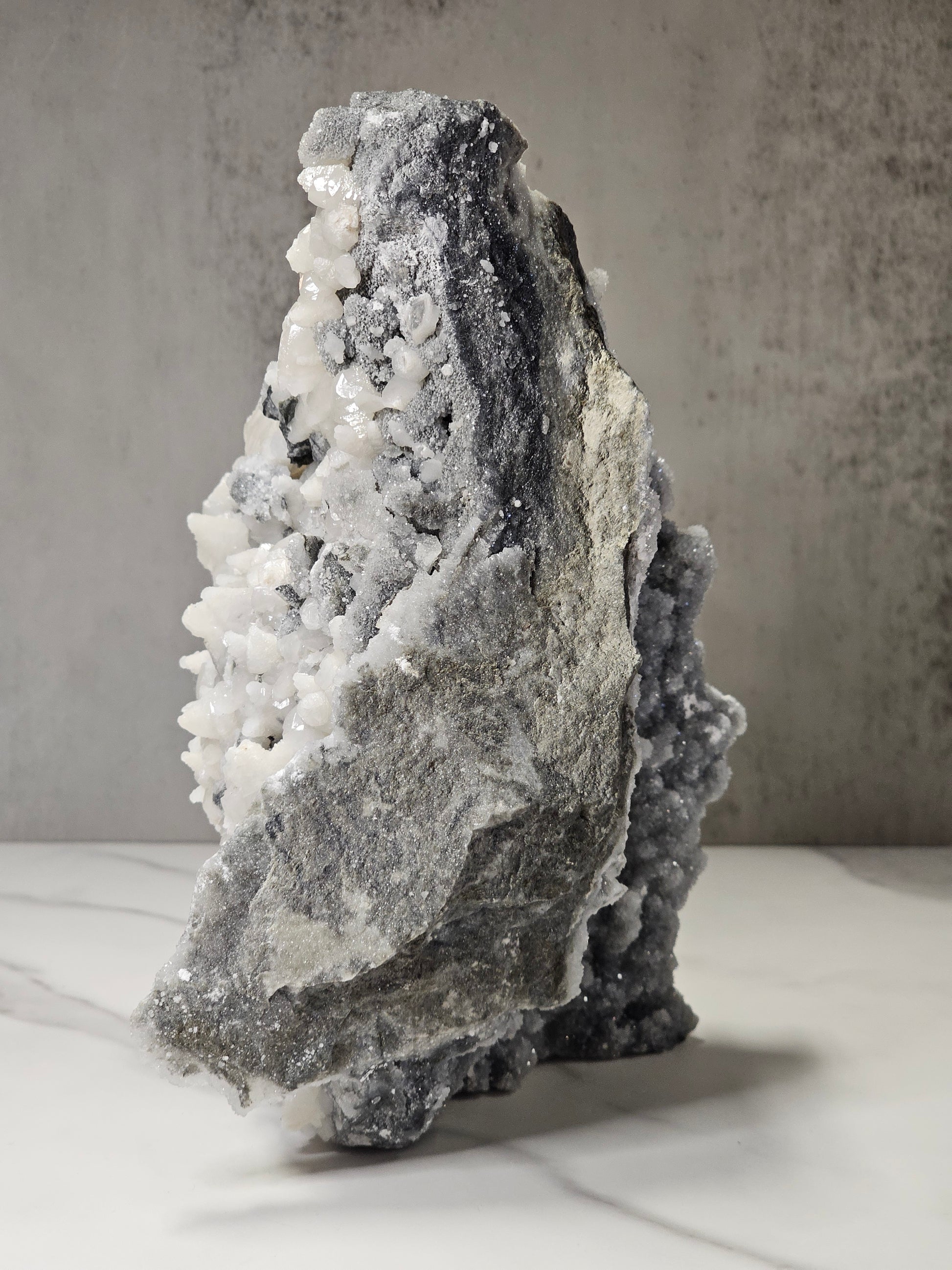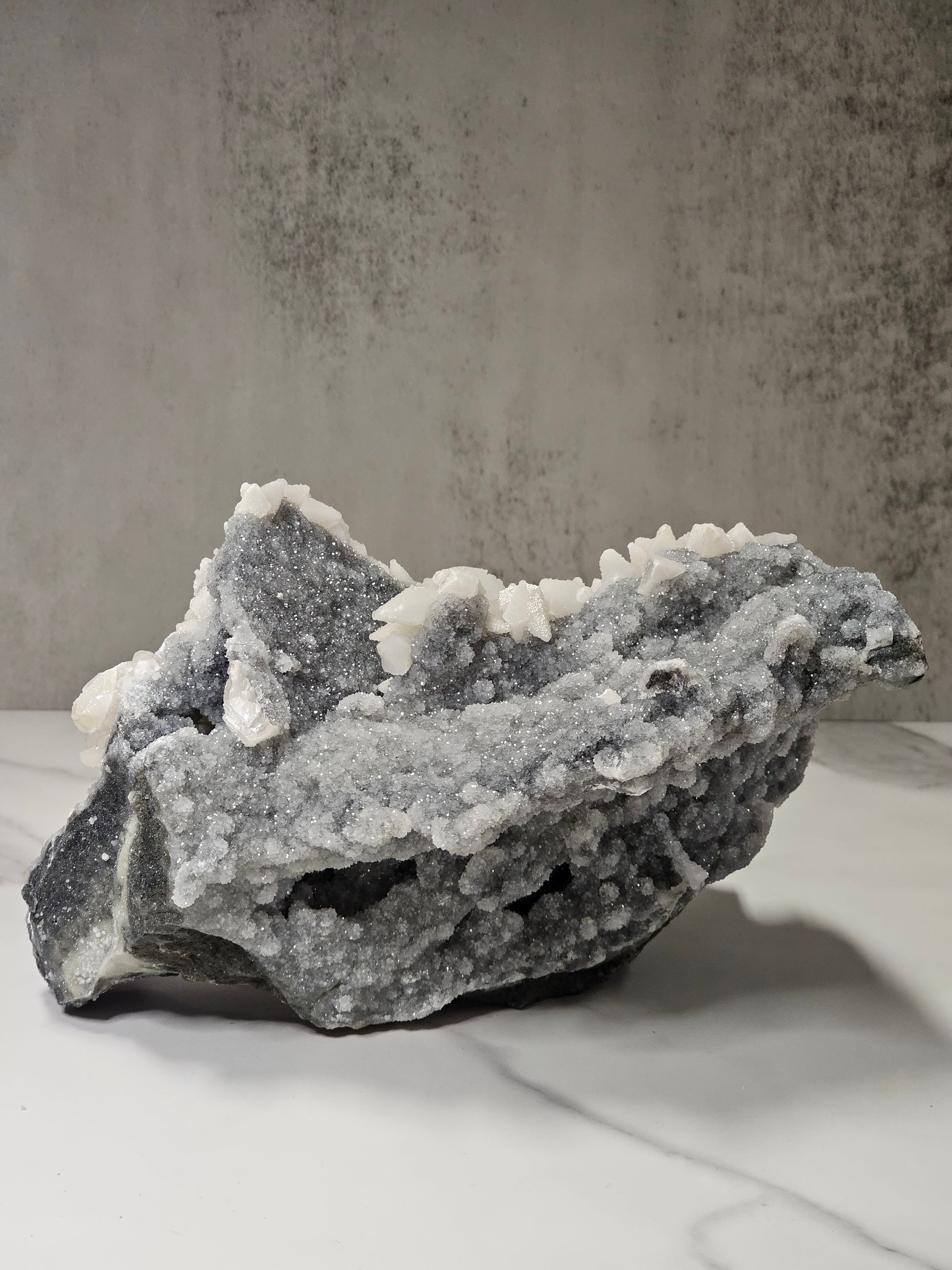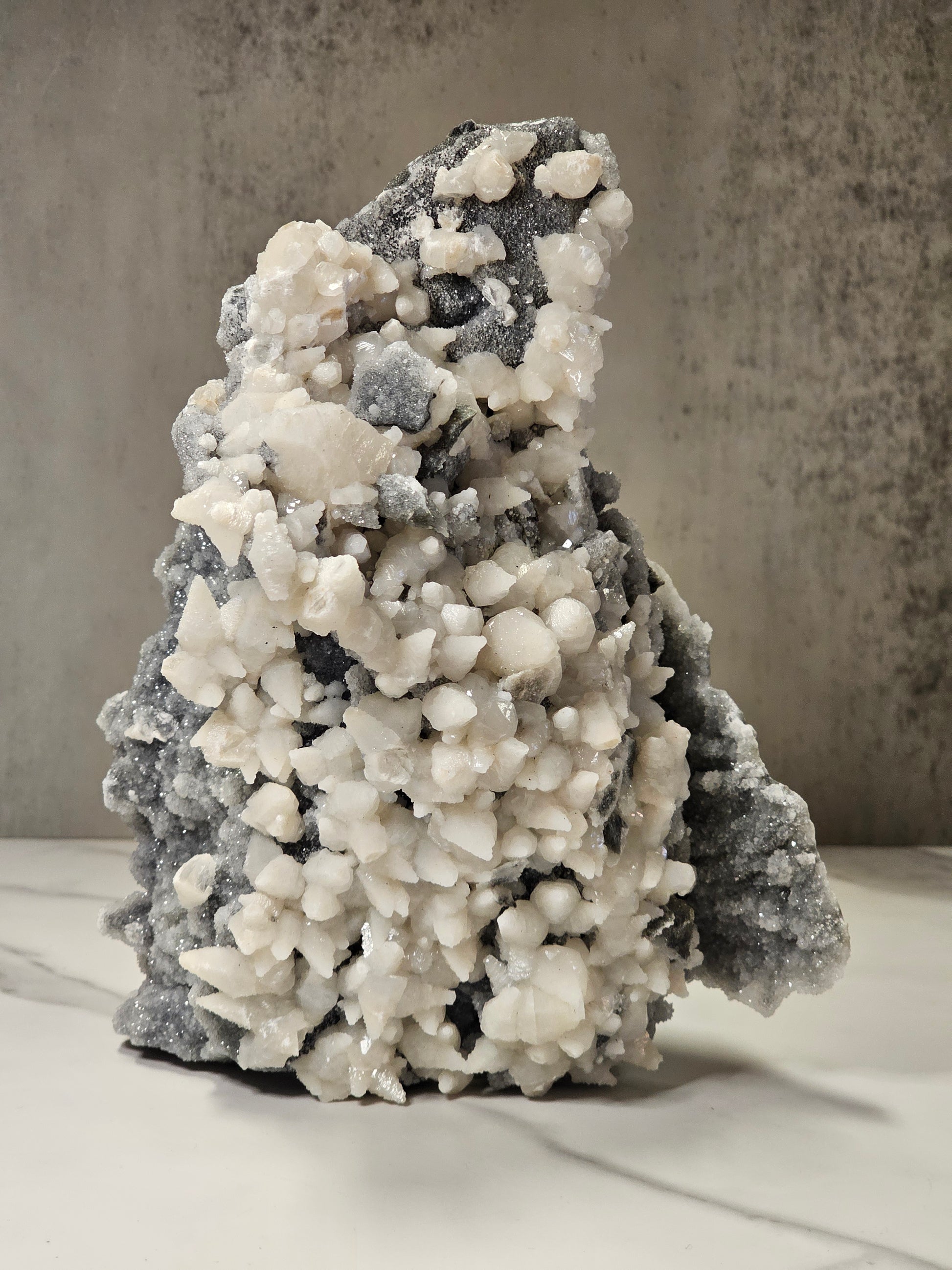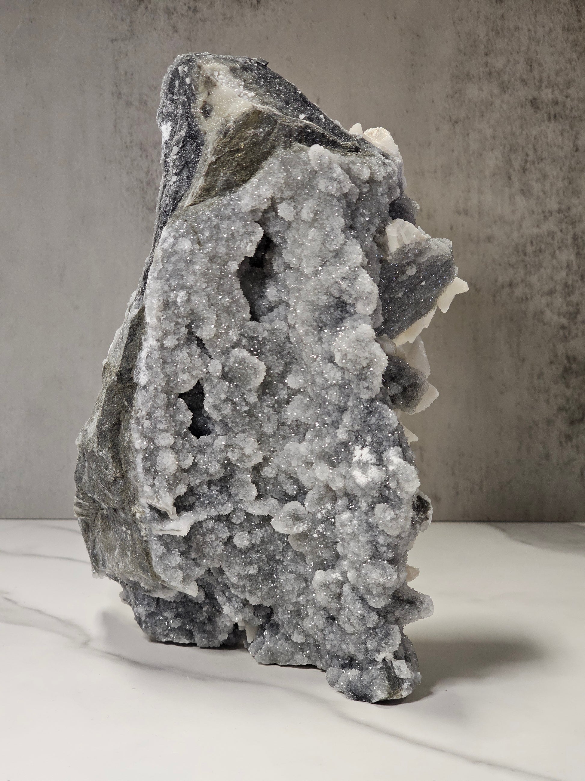 This extra large one of a kind specimen is composed of Calcite on Sphalerite. It has lots of sparkly sugar druzy all over with small growths of pointed Calcite. It can stand up in a couple different orientations, no stand included. This specimen is approximately 7.85 inches tall and 5.67 inches at the widest part. It weighs 73.1 ounces.