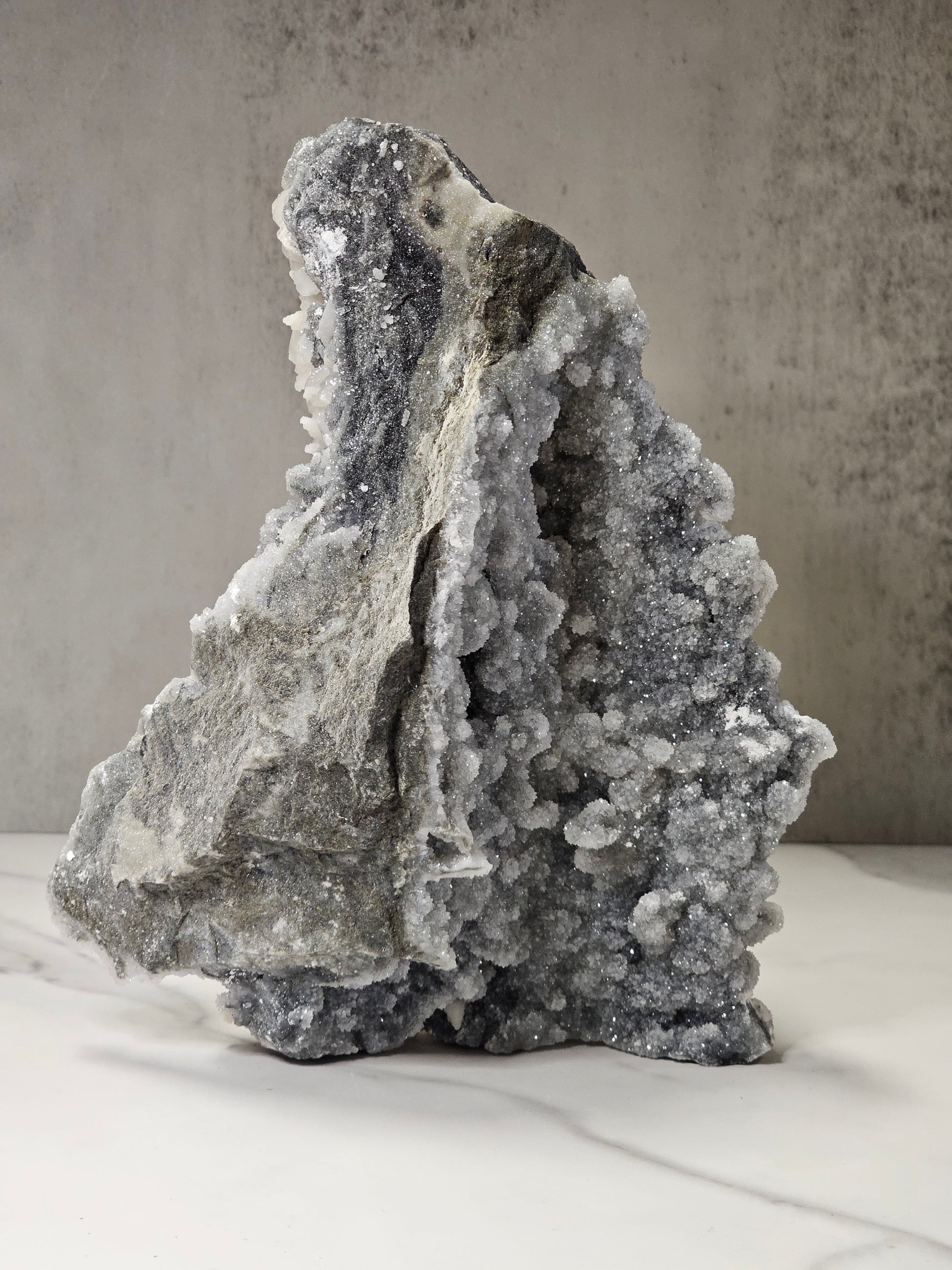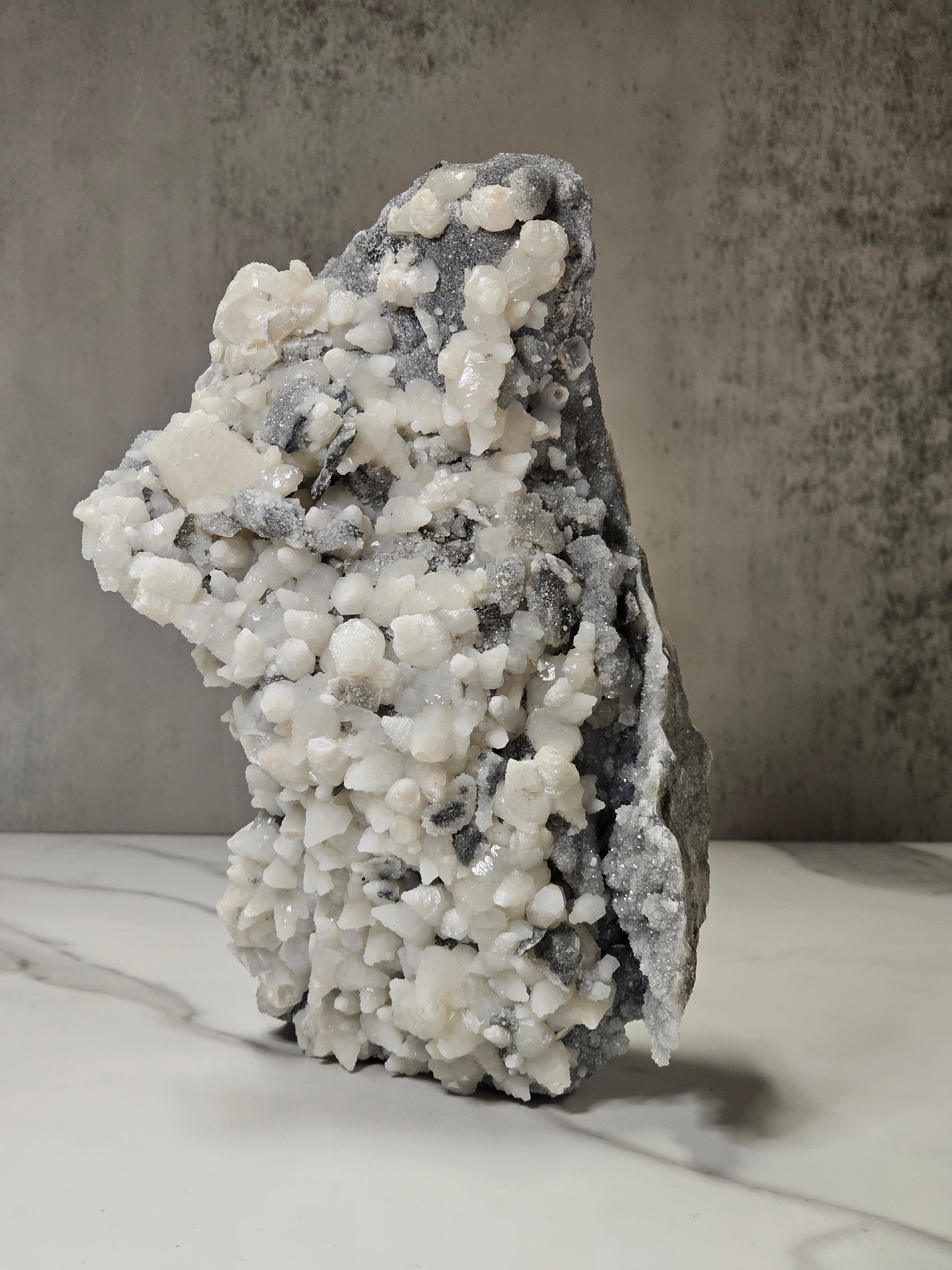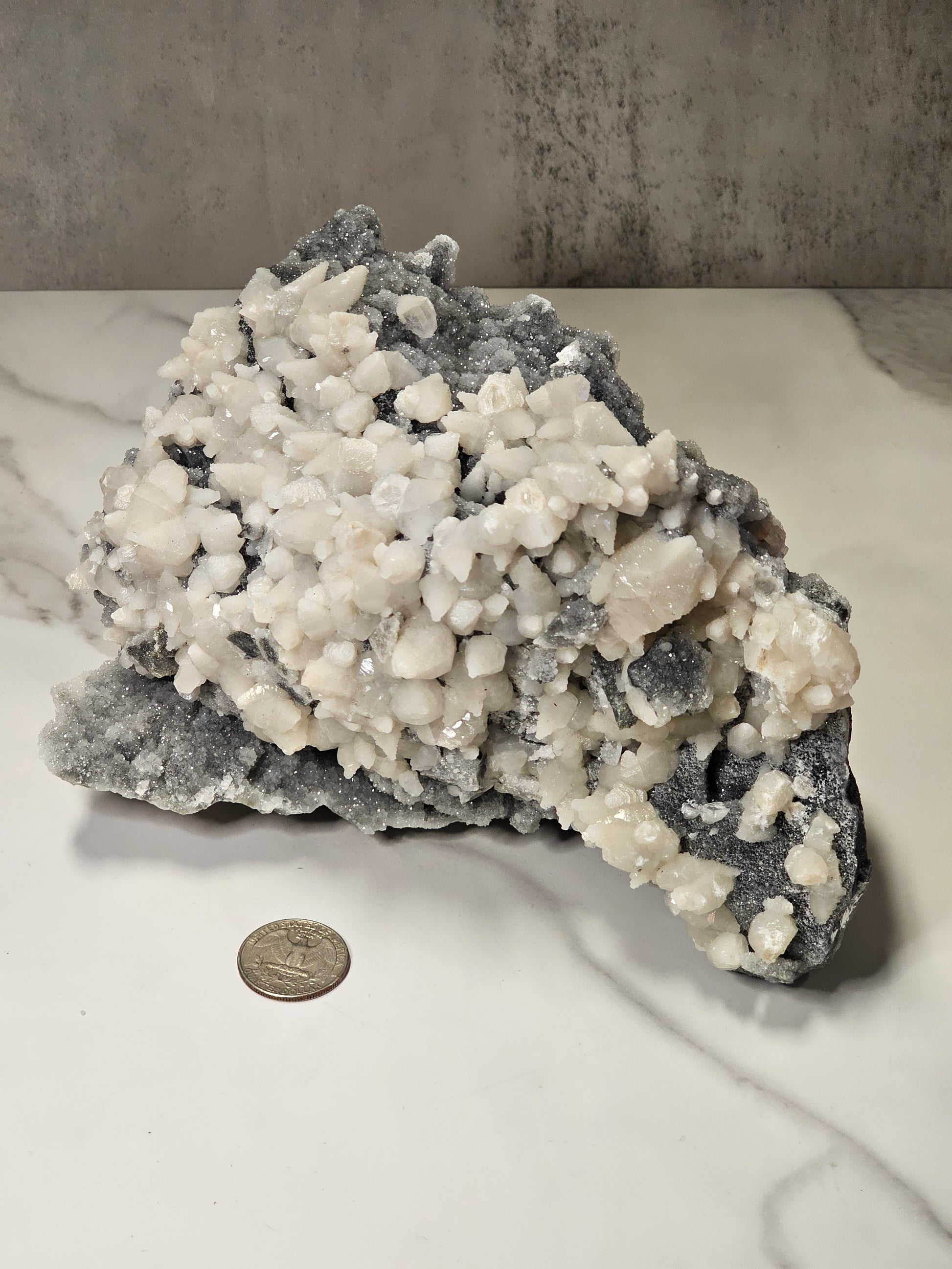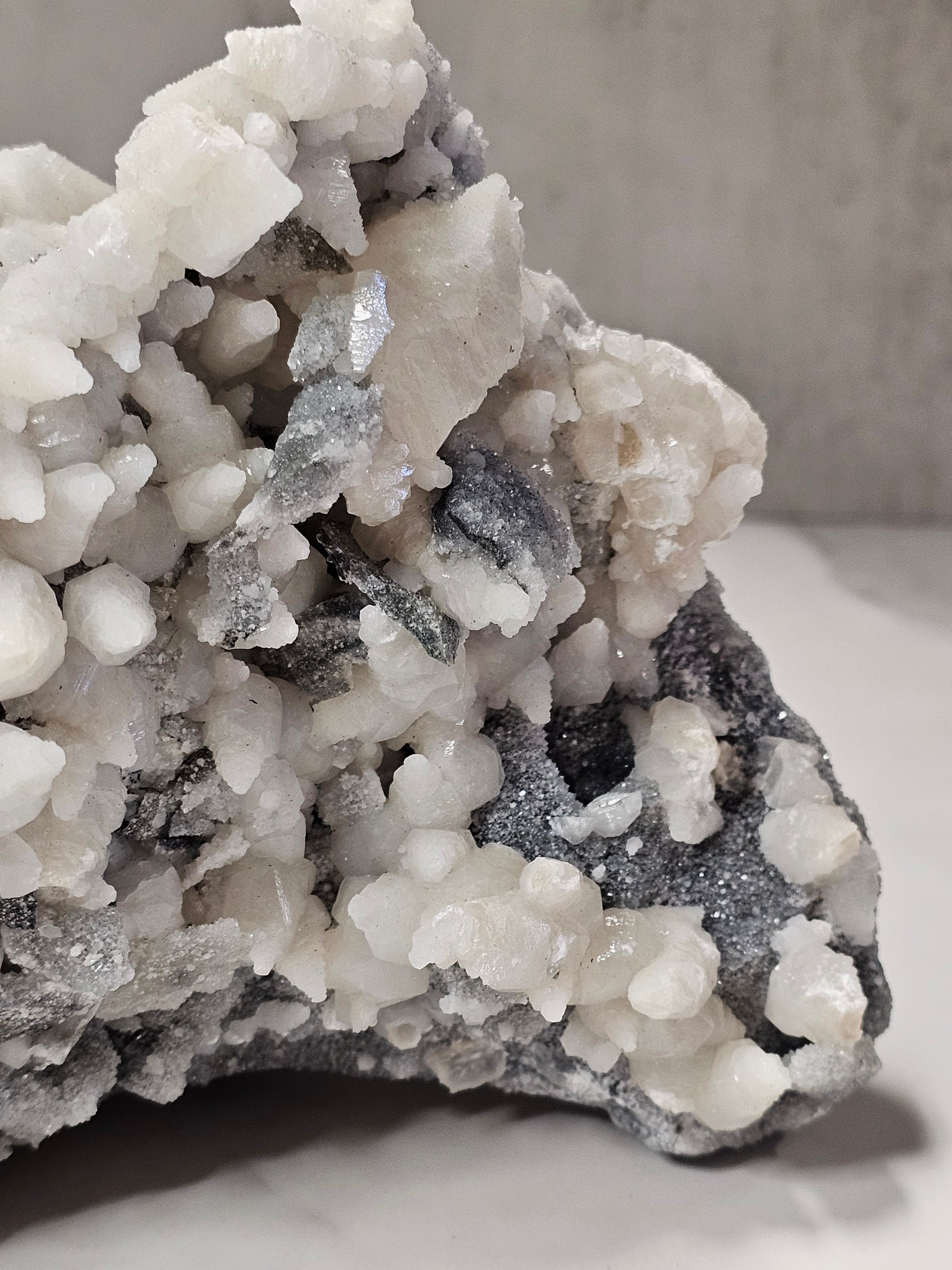 This extra large one of a kind specimen is composed of Calcite on Sphalerite. It has lots of sparkly sugar druzy all over with small growths of pointed Calcite. It can stand up in a couple different orientations, no stand included. This specimen is approximately 7.85 inches tall and 5.67 inches at the widest part. It weighs 73.1 ounces.