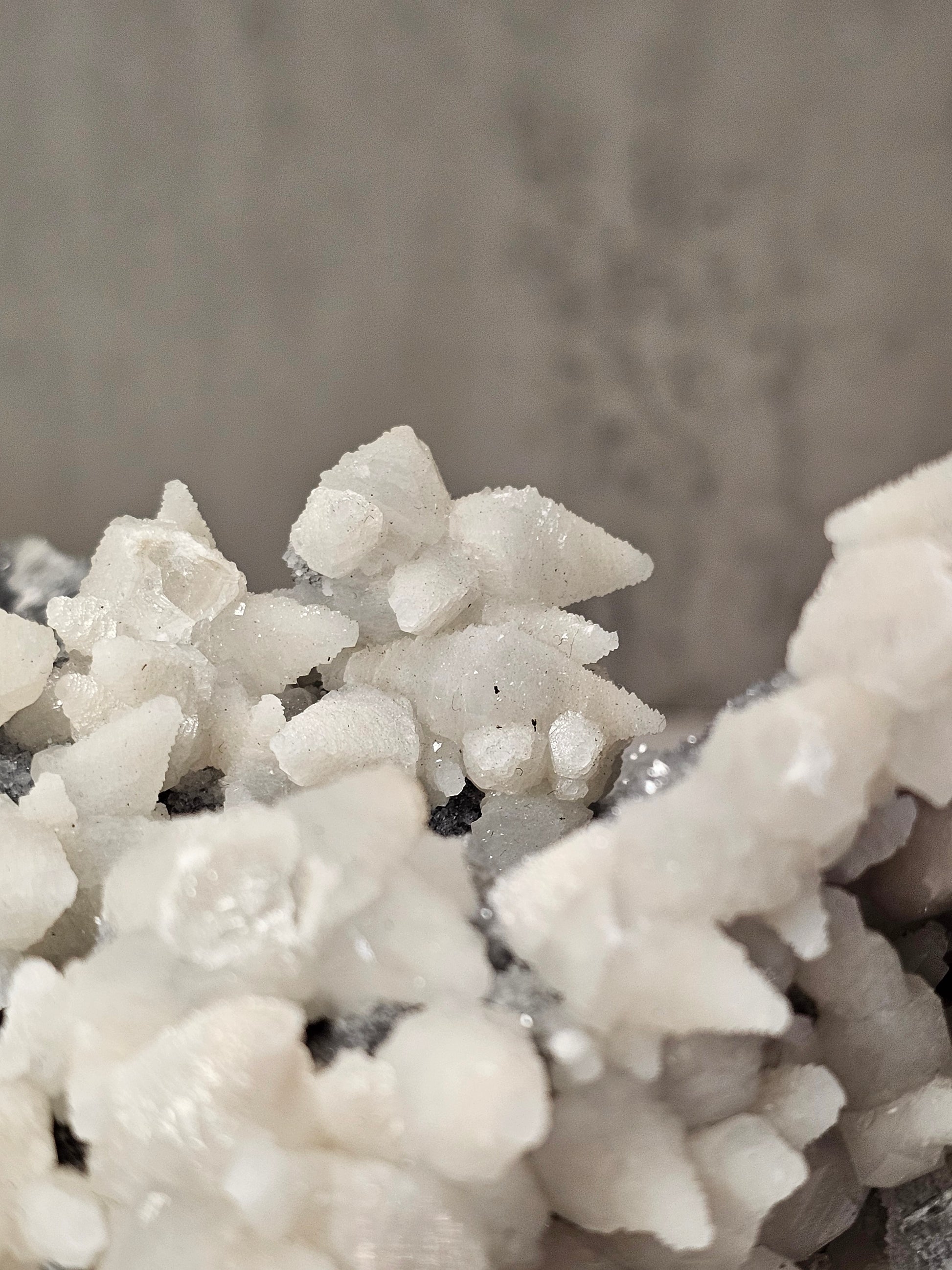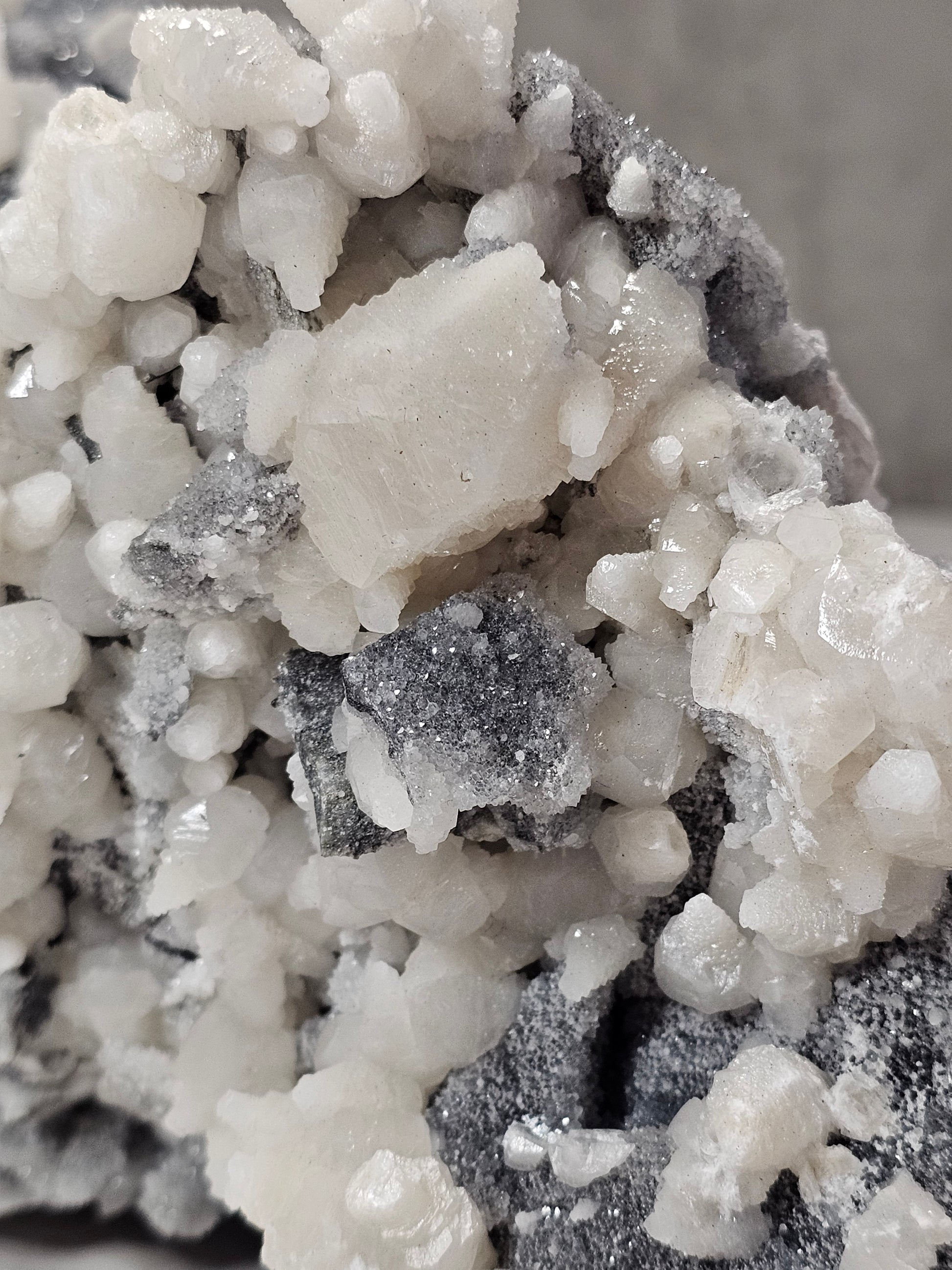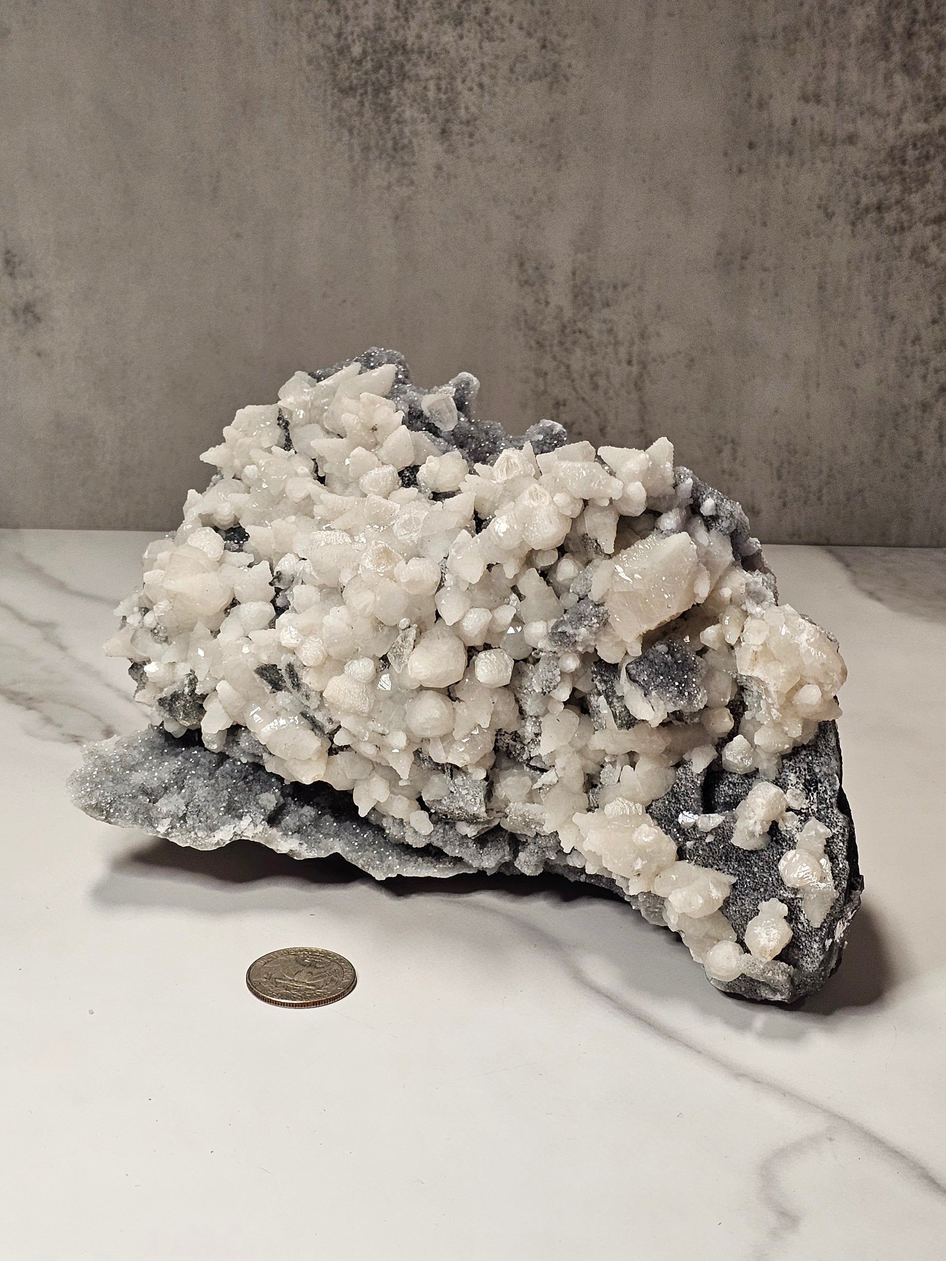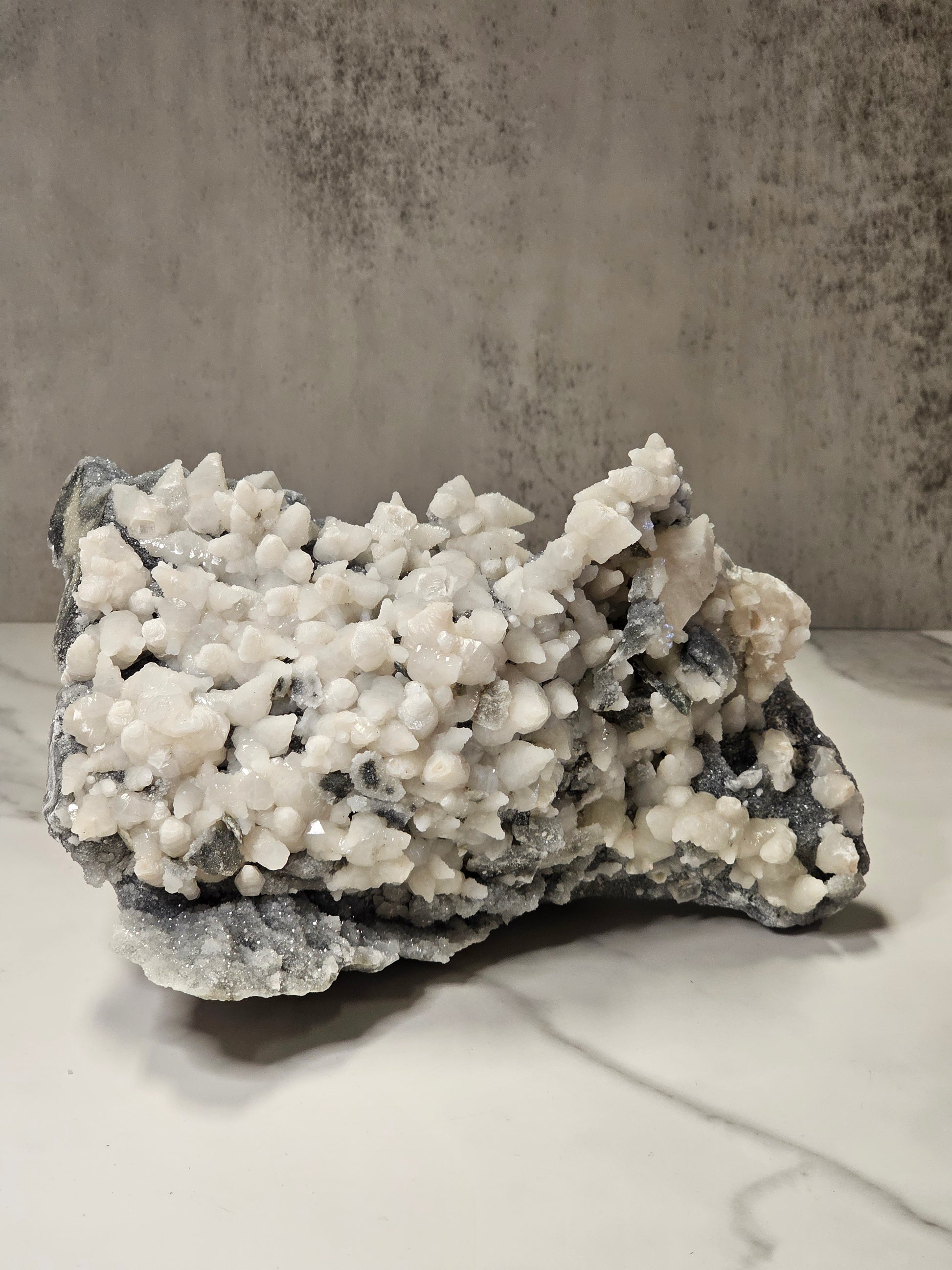 This extra large one of a kind specimen is composed of Calcite on Sphalerite. It has lots of sparkly sugar druzy all over with small growths of pointed Calcite. It can stand up in a couple different orientations, no stand included. This specimen is approximately 7.85 inches tall and 5.67 inches at the widest part. It weighs 73.1 ounces.
