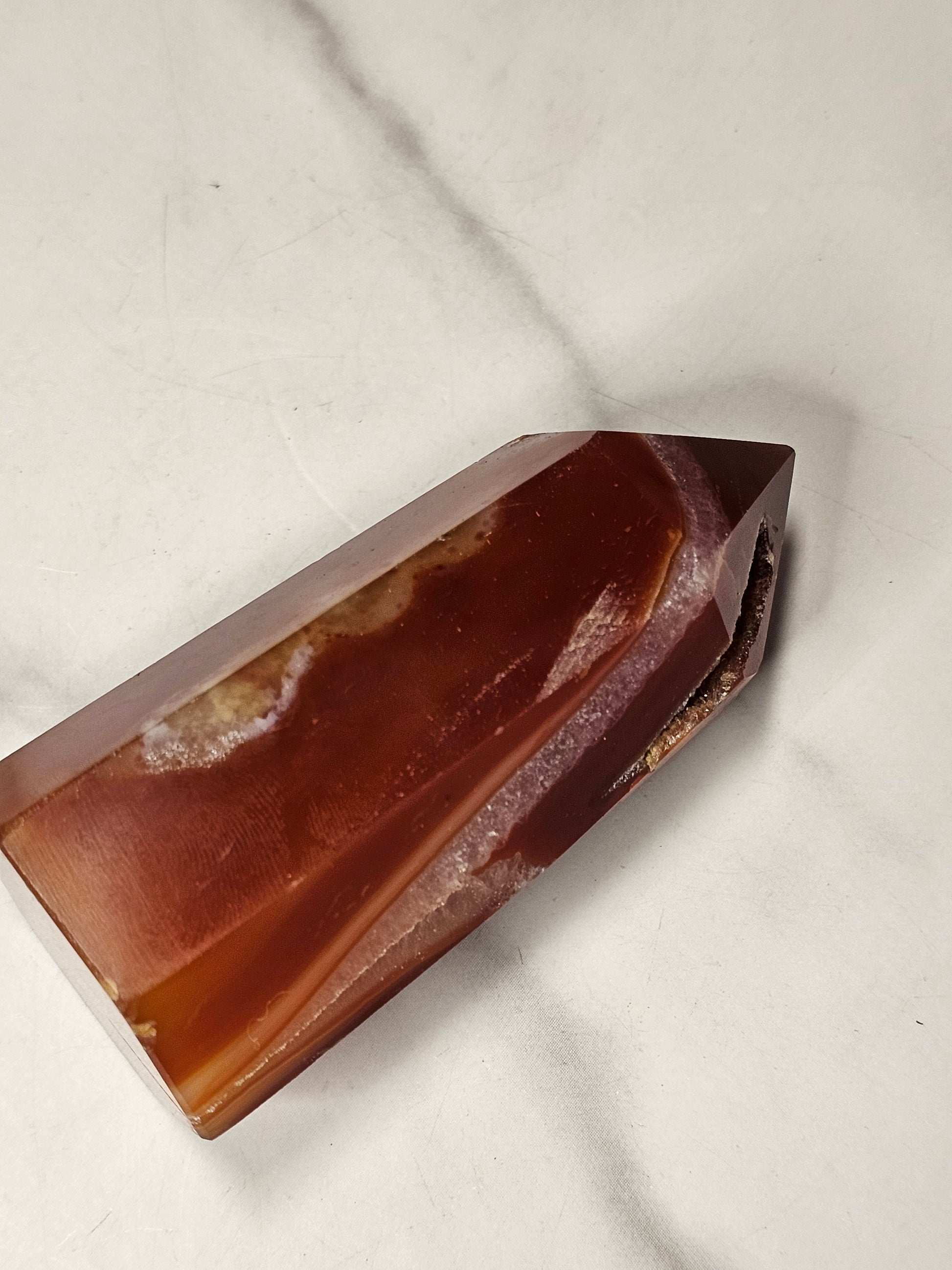 This Carnelian tower has a couple really pretty and sparkly druzies. It stands up at 3.09 inches tall and has a base diameter of 1.44 inches wide.