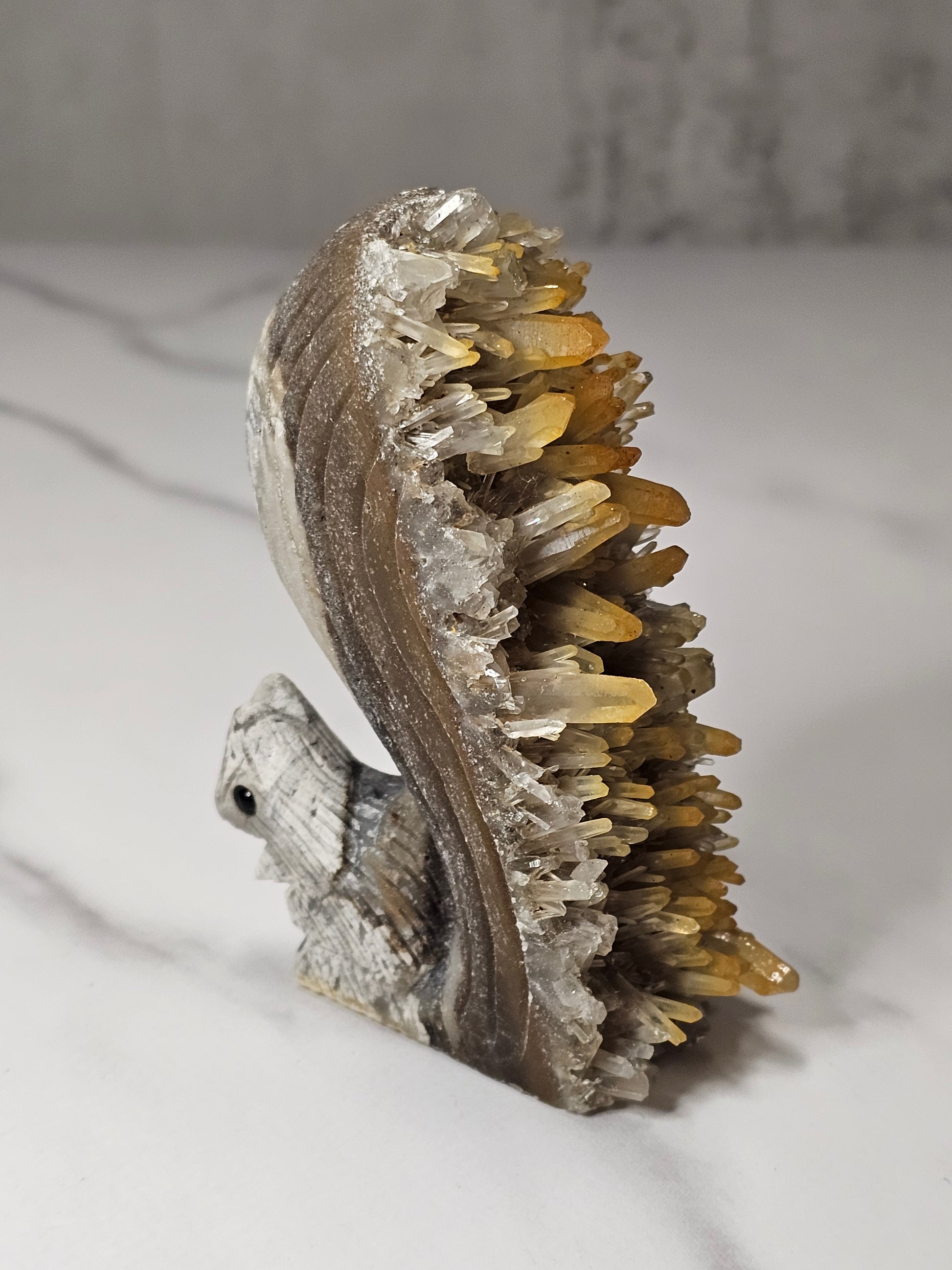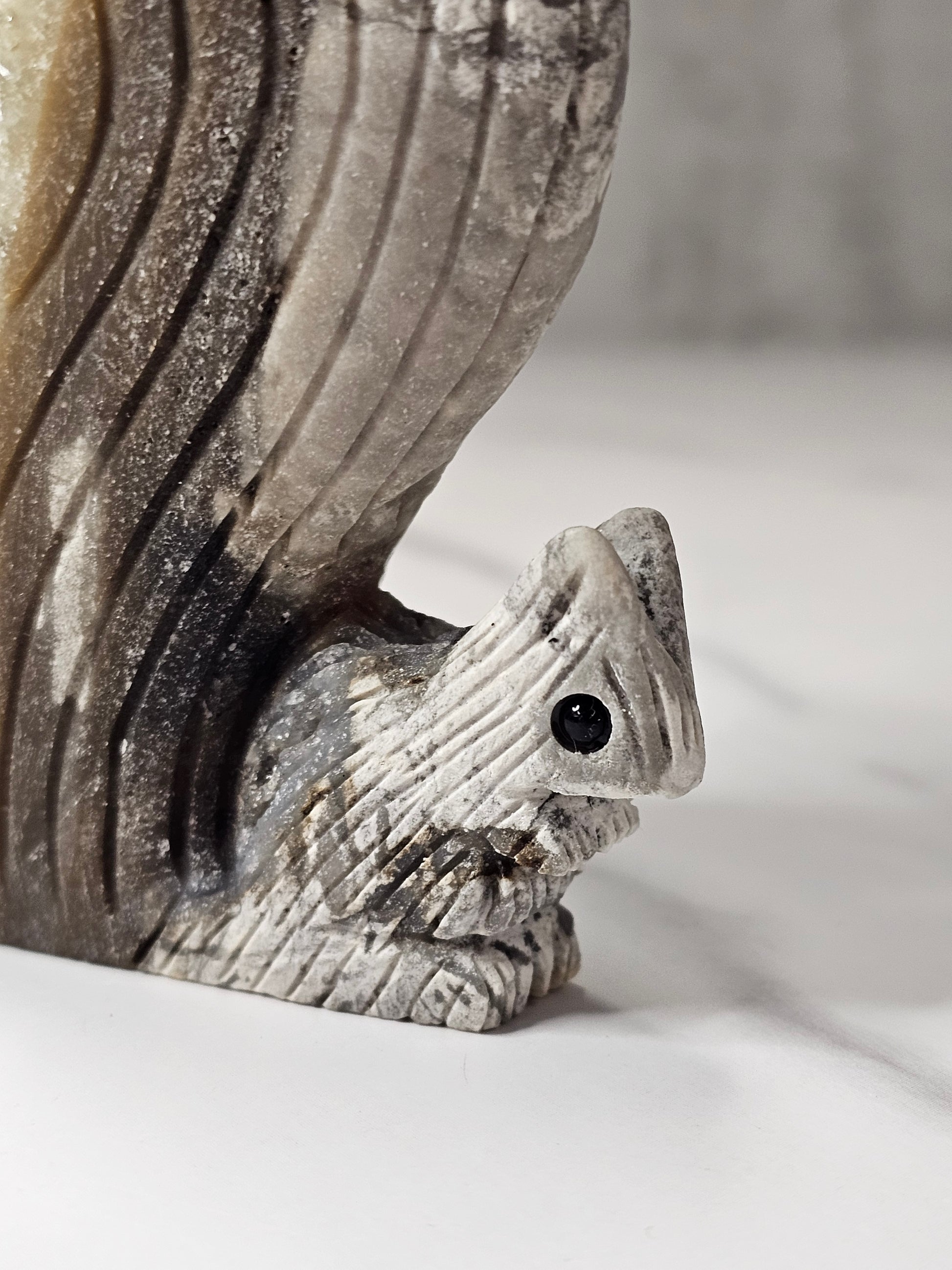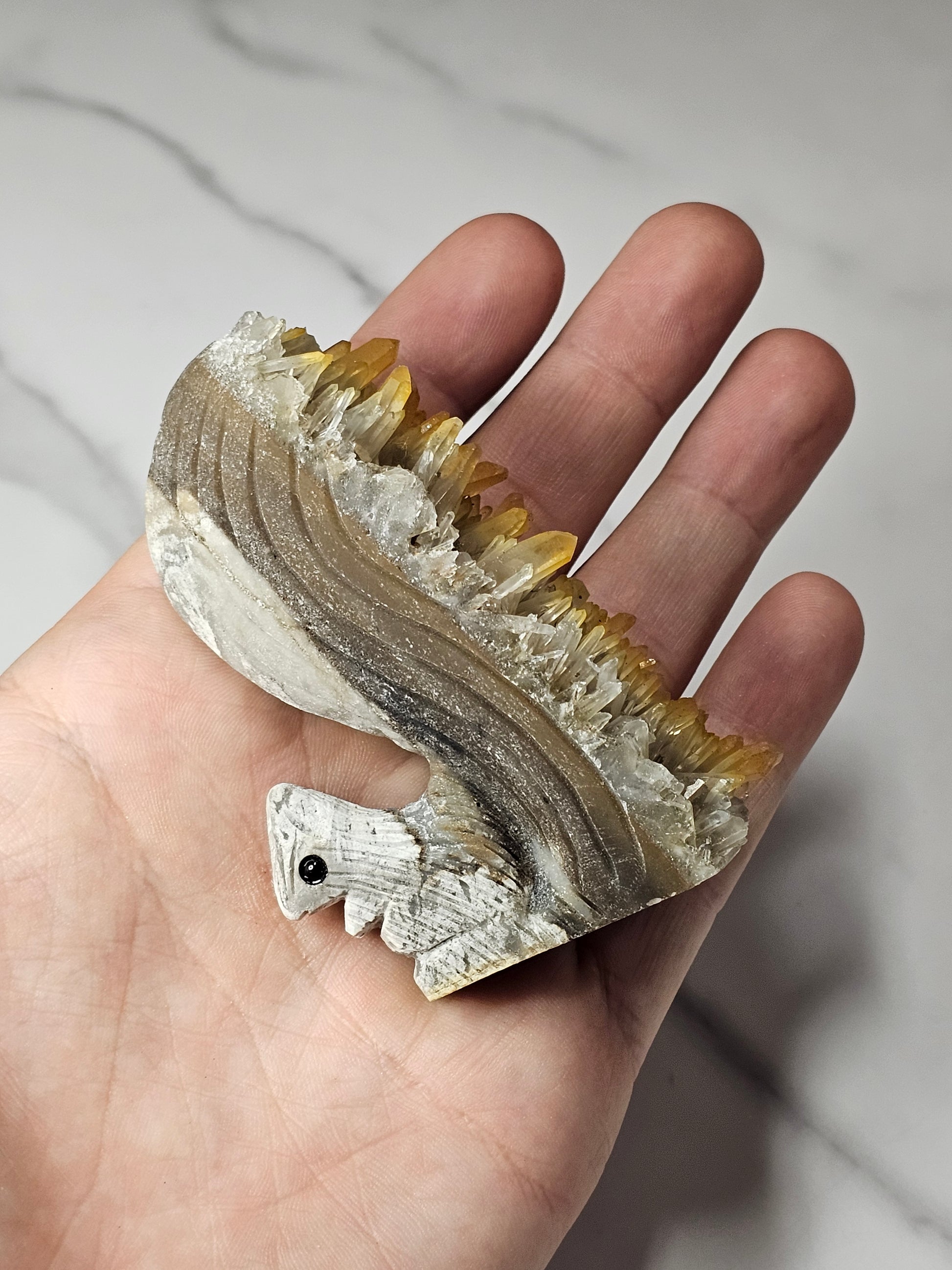 This squirrel carving is made out of a natural Citrine cluster. It is very detailed and unique! This one is 3.24 inches tall and 2.39 inches wide.