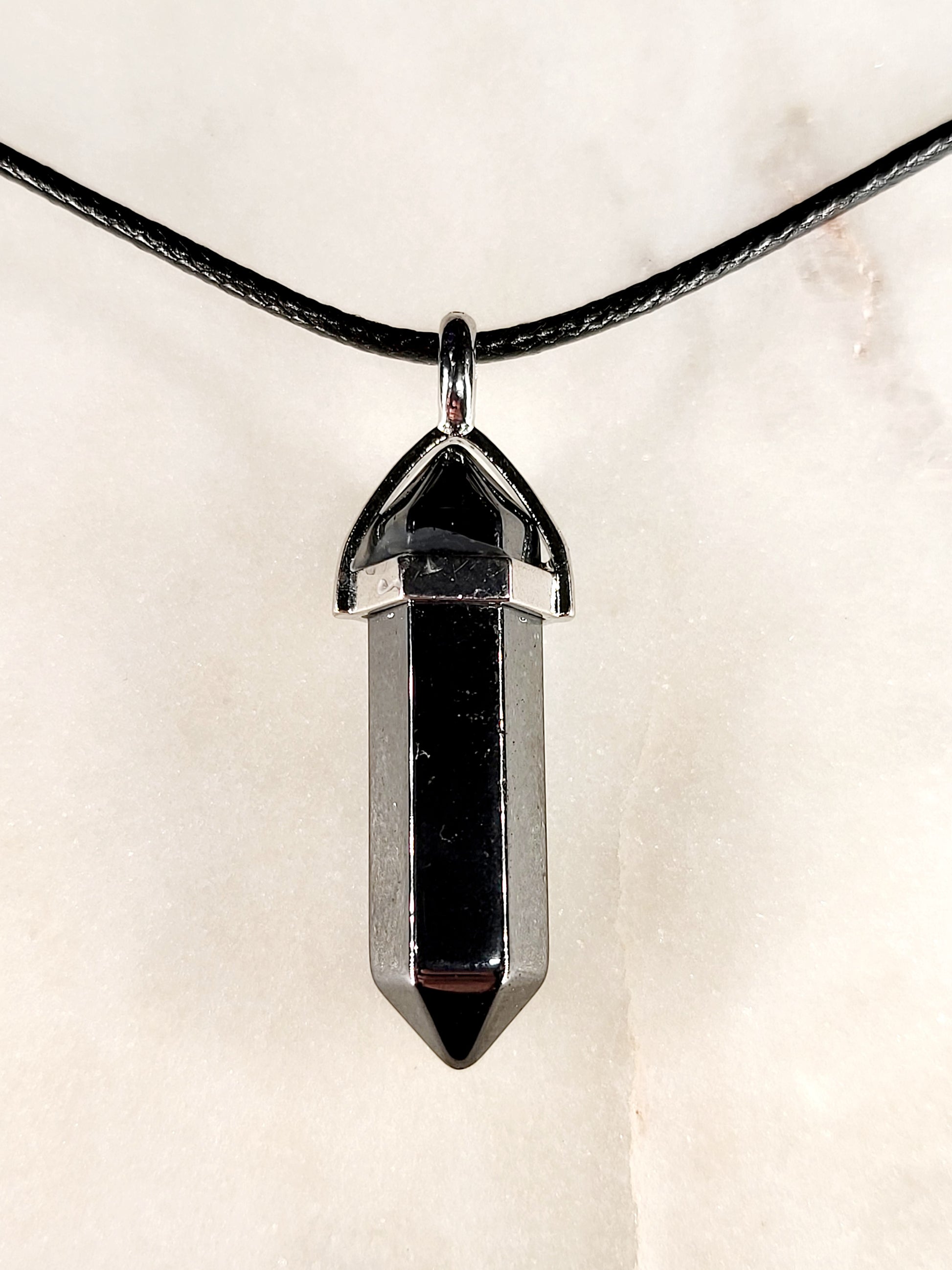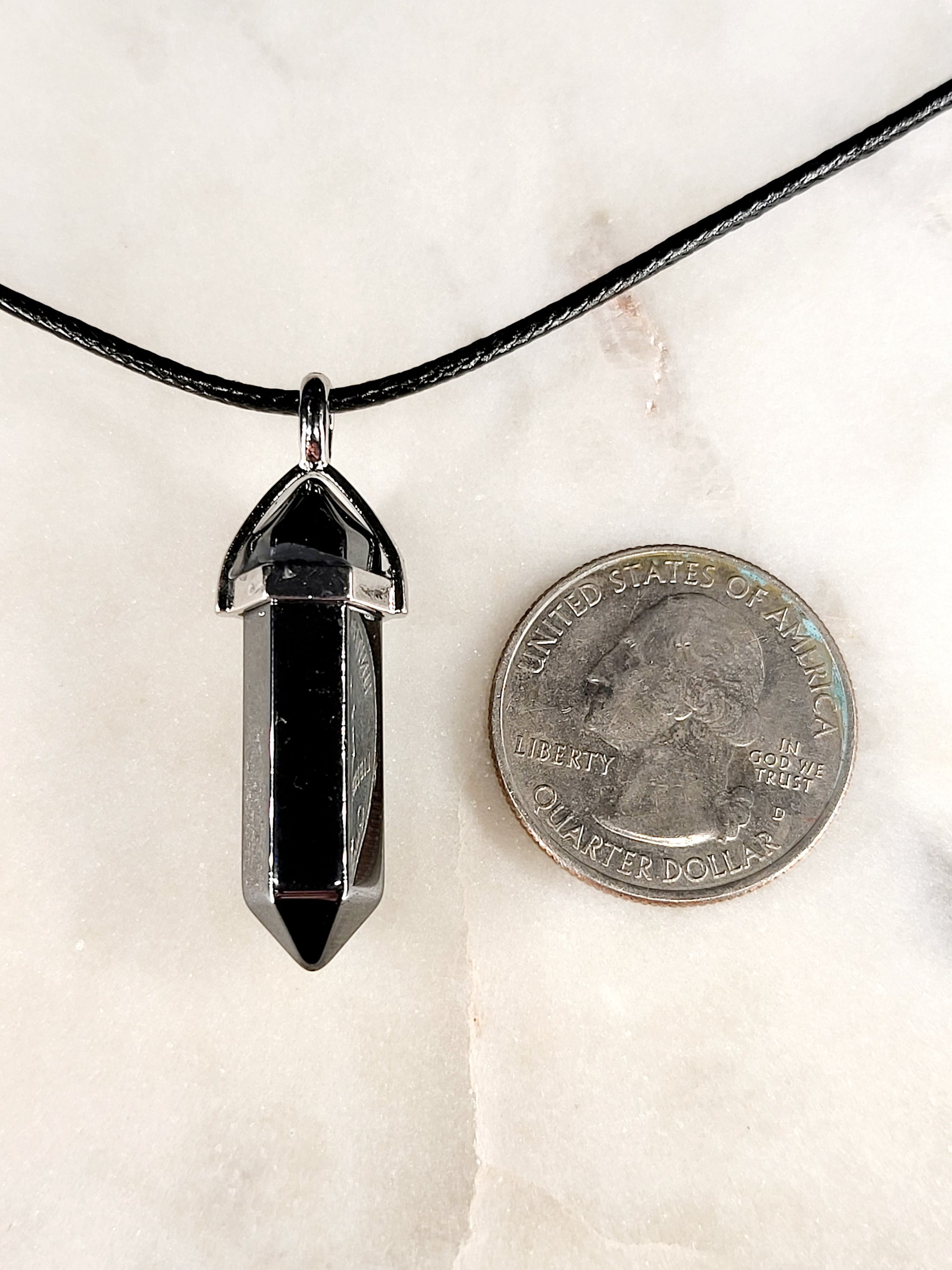 This necklace is made with an Obsidian double terminated crystal point. It comes on an 18" black waxed cord with metal clasps and a bag