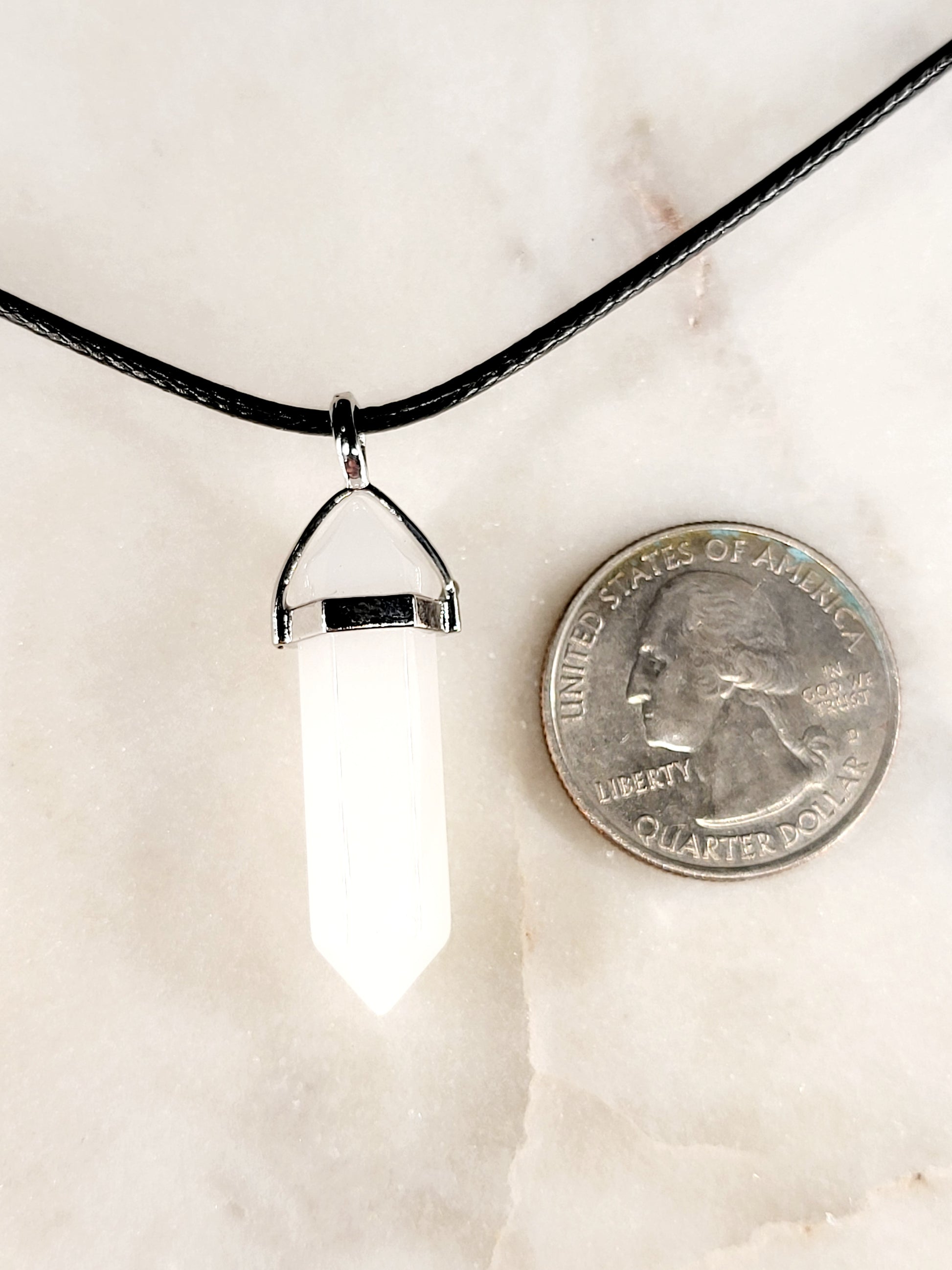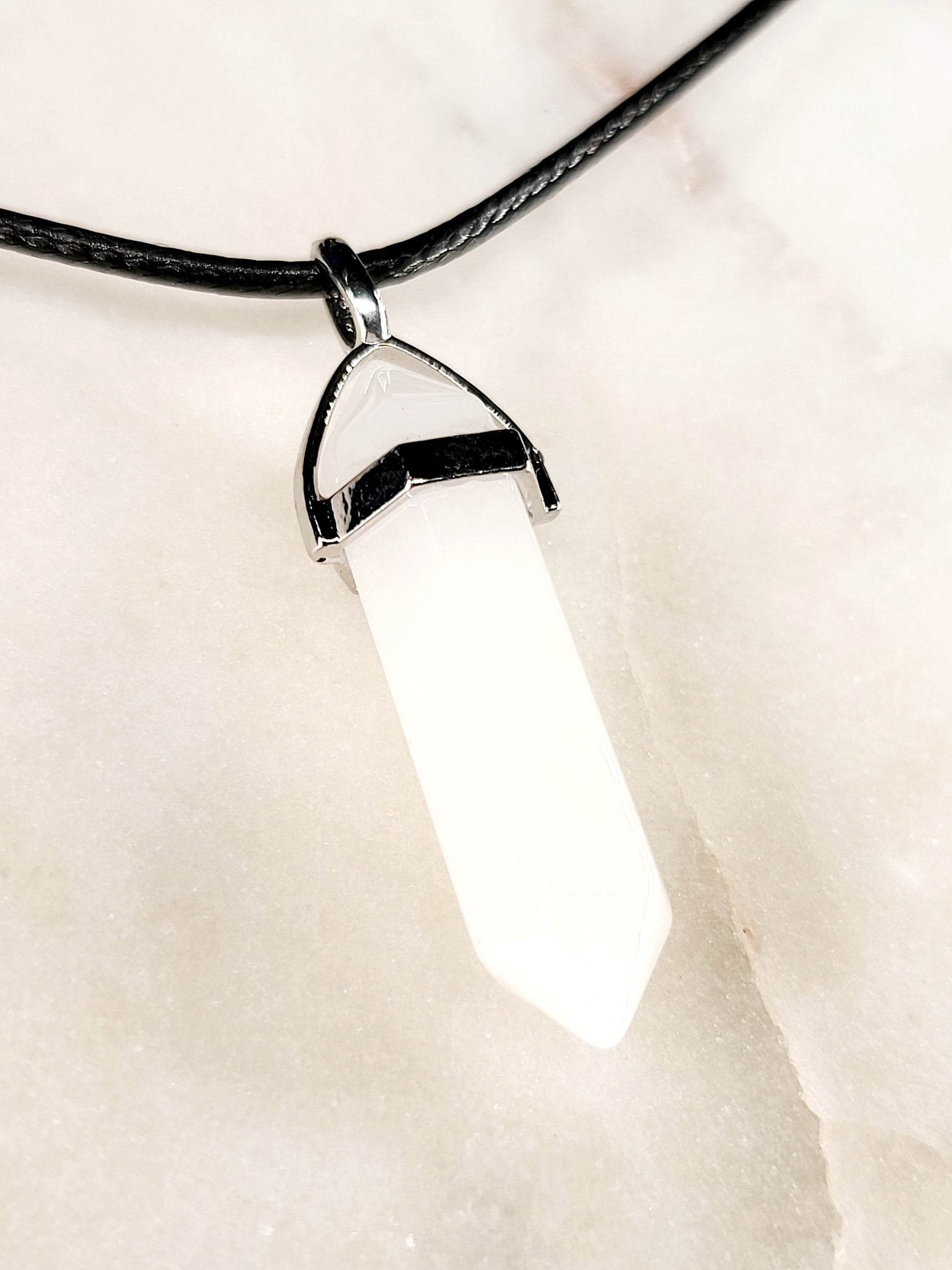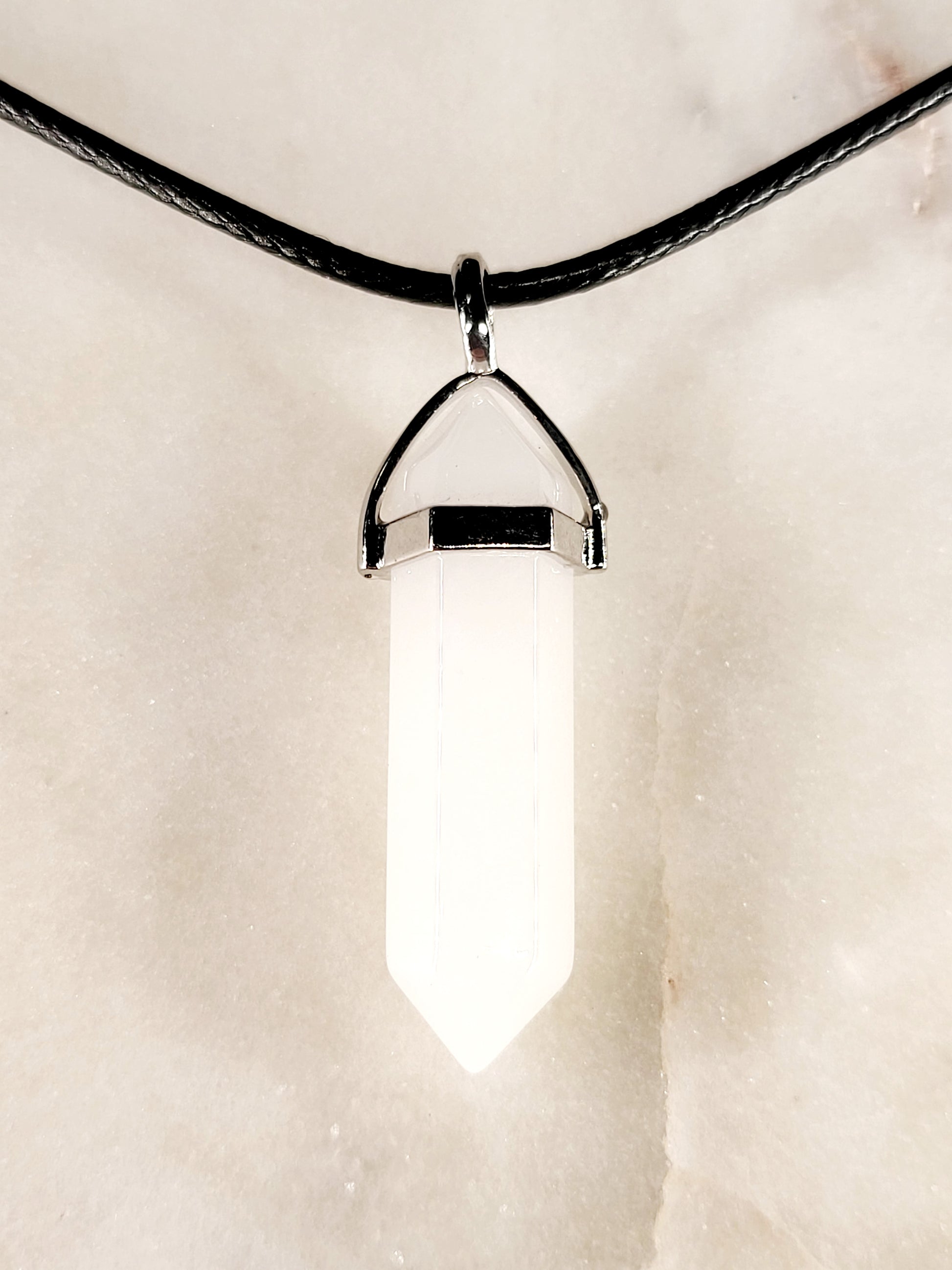 This necklace is made with an Opalite double terminated crystal point. It comes on an 18" black waxed cord with metal clasps and a bag