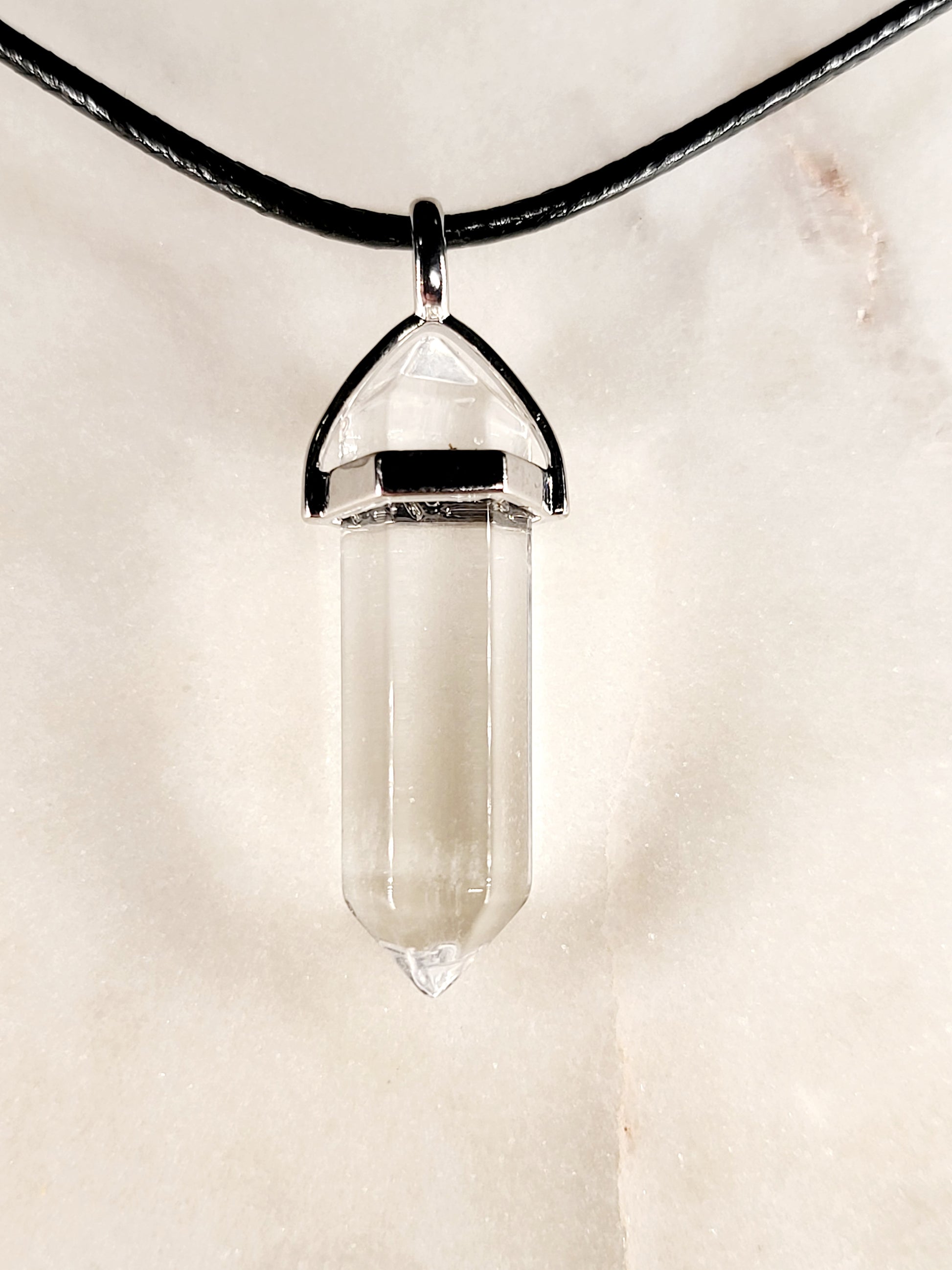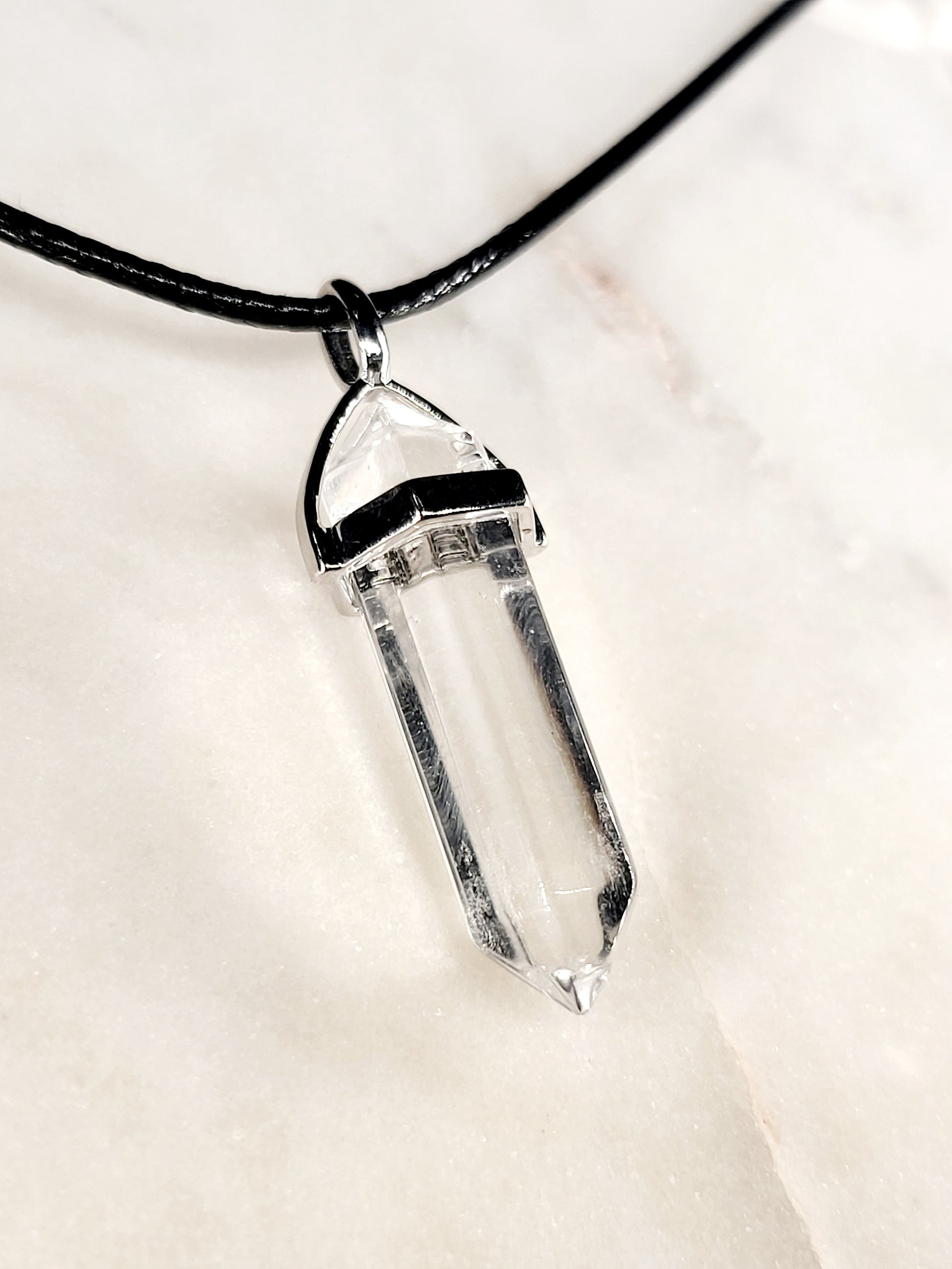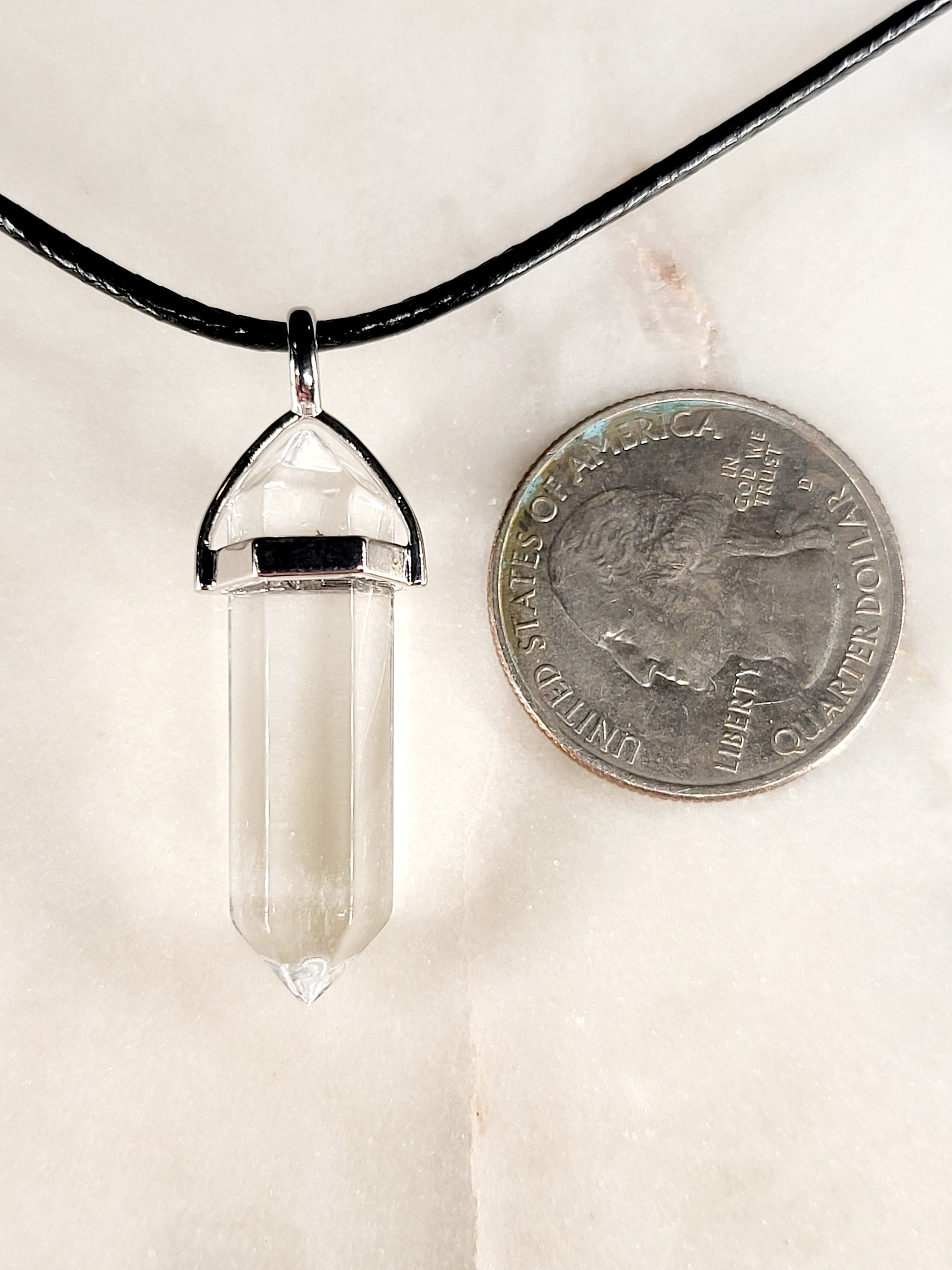 This necklace is made with a Clear Quartz double terminated crystal point. It comes on an 18" black waxed cord with metal clasps and a bag
