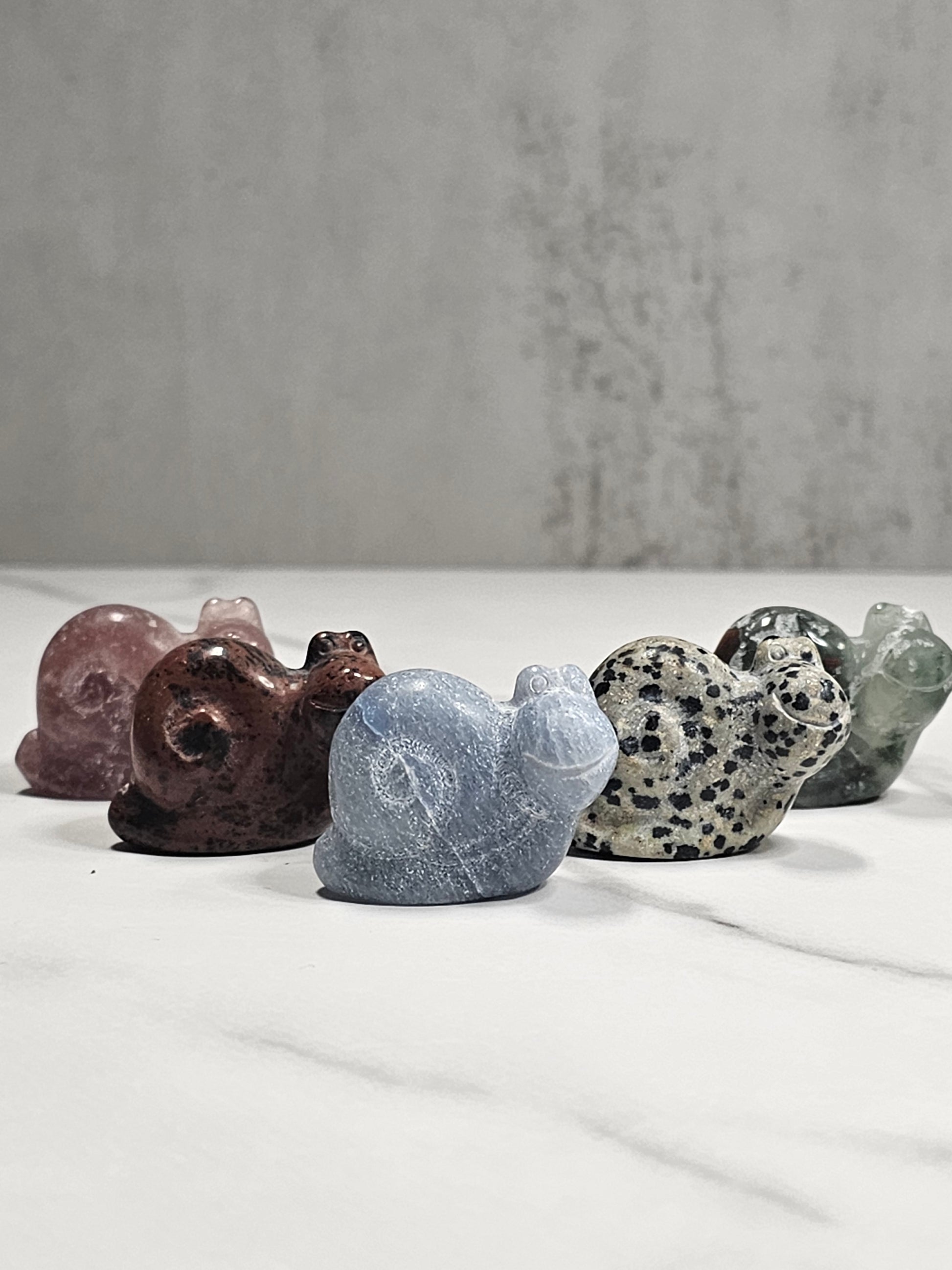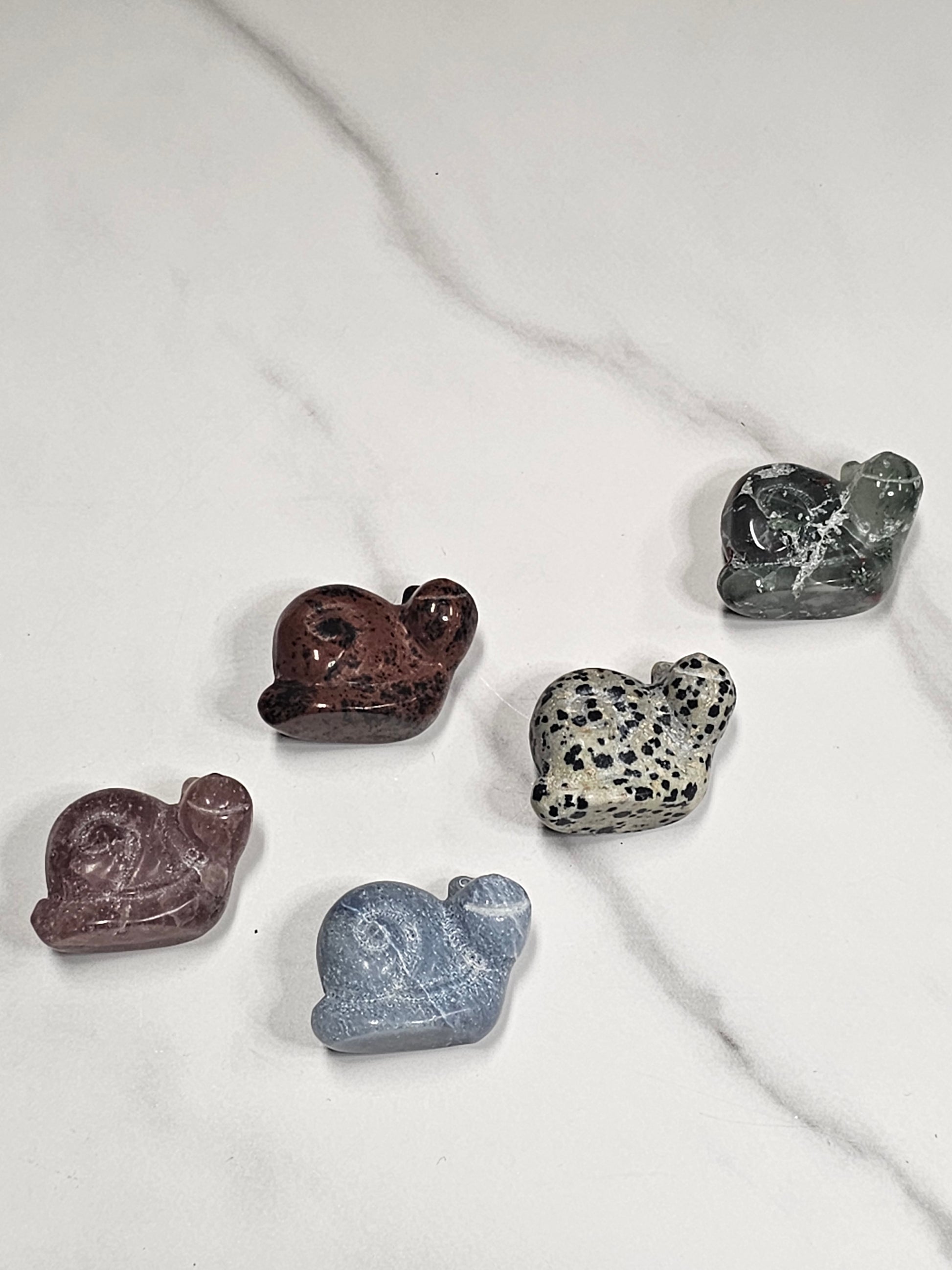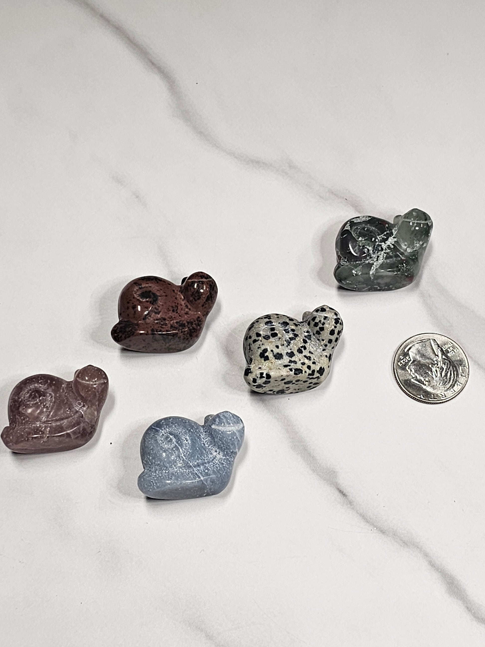 Assorted crystal snail carvings are sent curators choice at random. Each one is 26mm or 1 inch tall. They have friendly eyes and a cute smile on each one!
