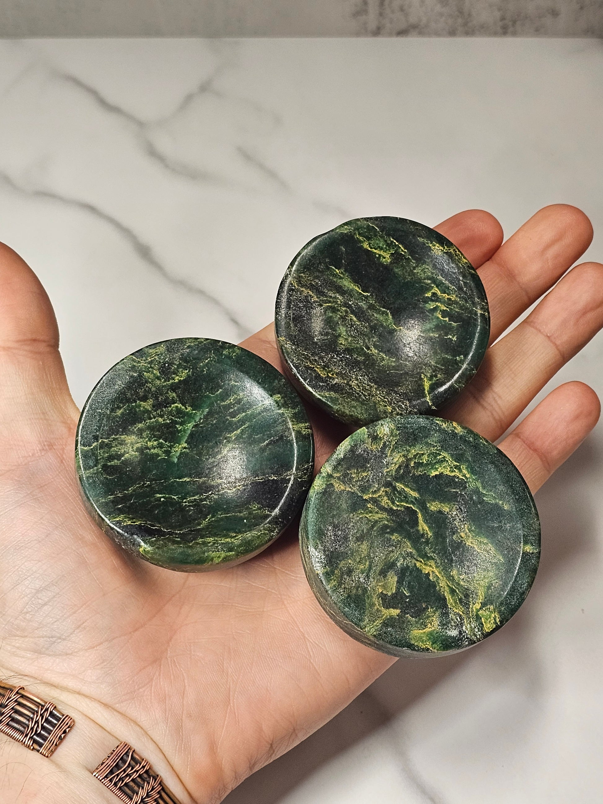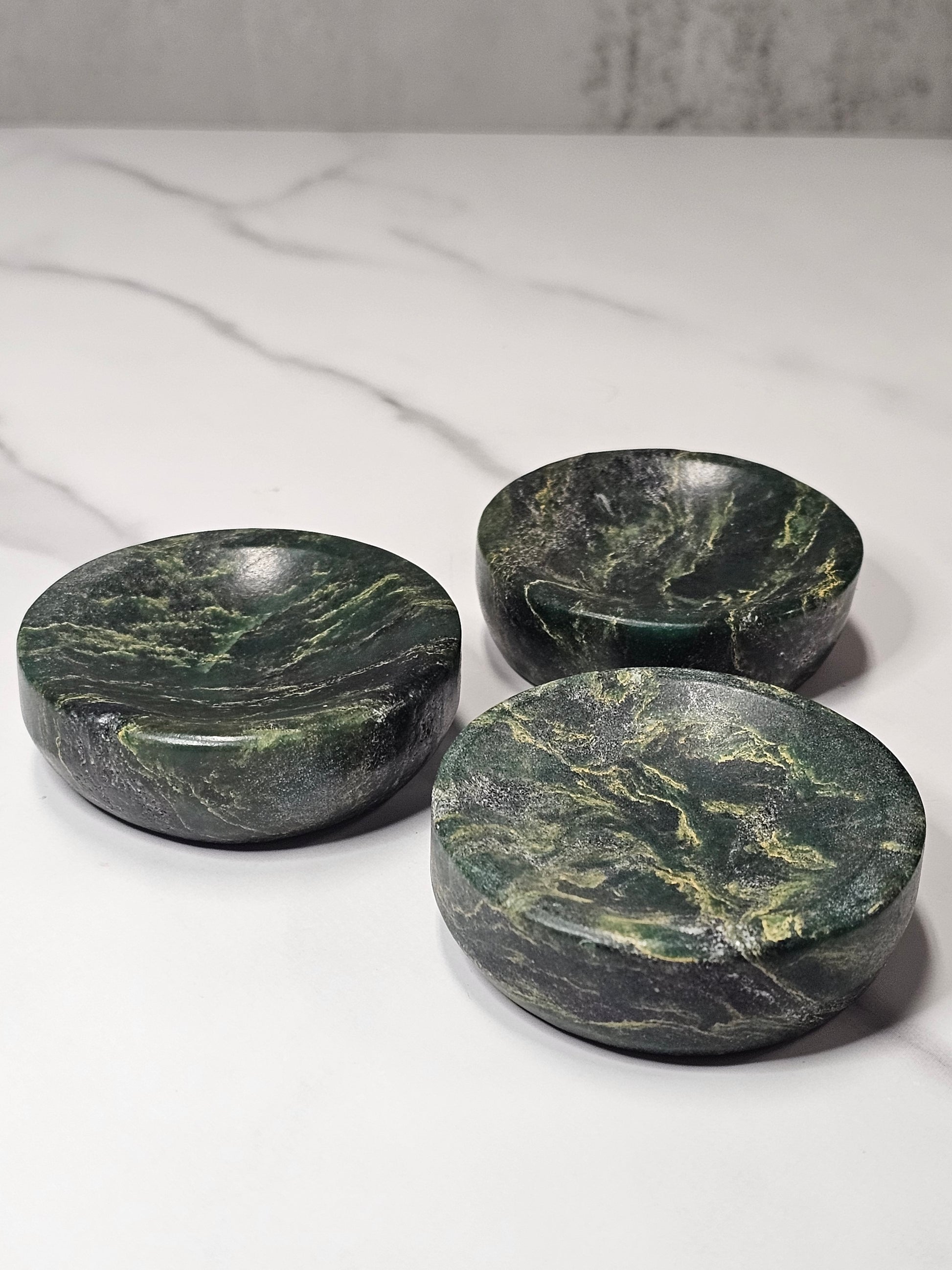 These Emerald bowls are approximately 2.3 inches in diameter and .75 inches tall/deep. They're perfect for putting small items like rings or keys or little crystals. Each one will be shipped at random.
