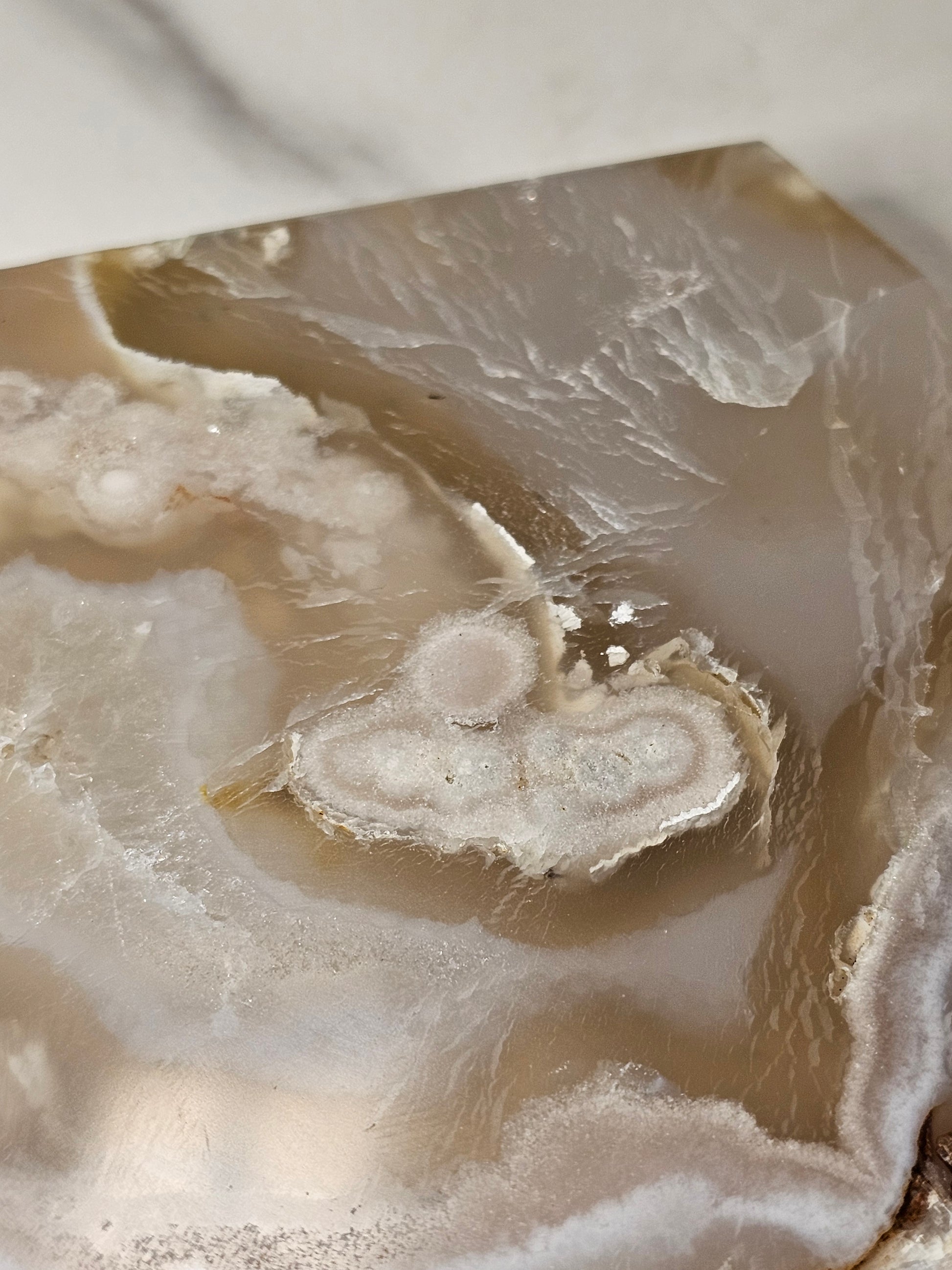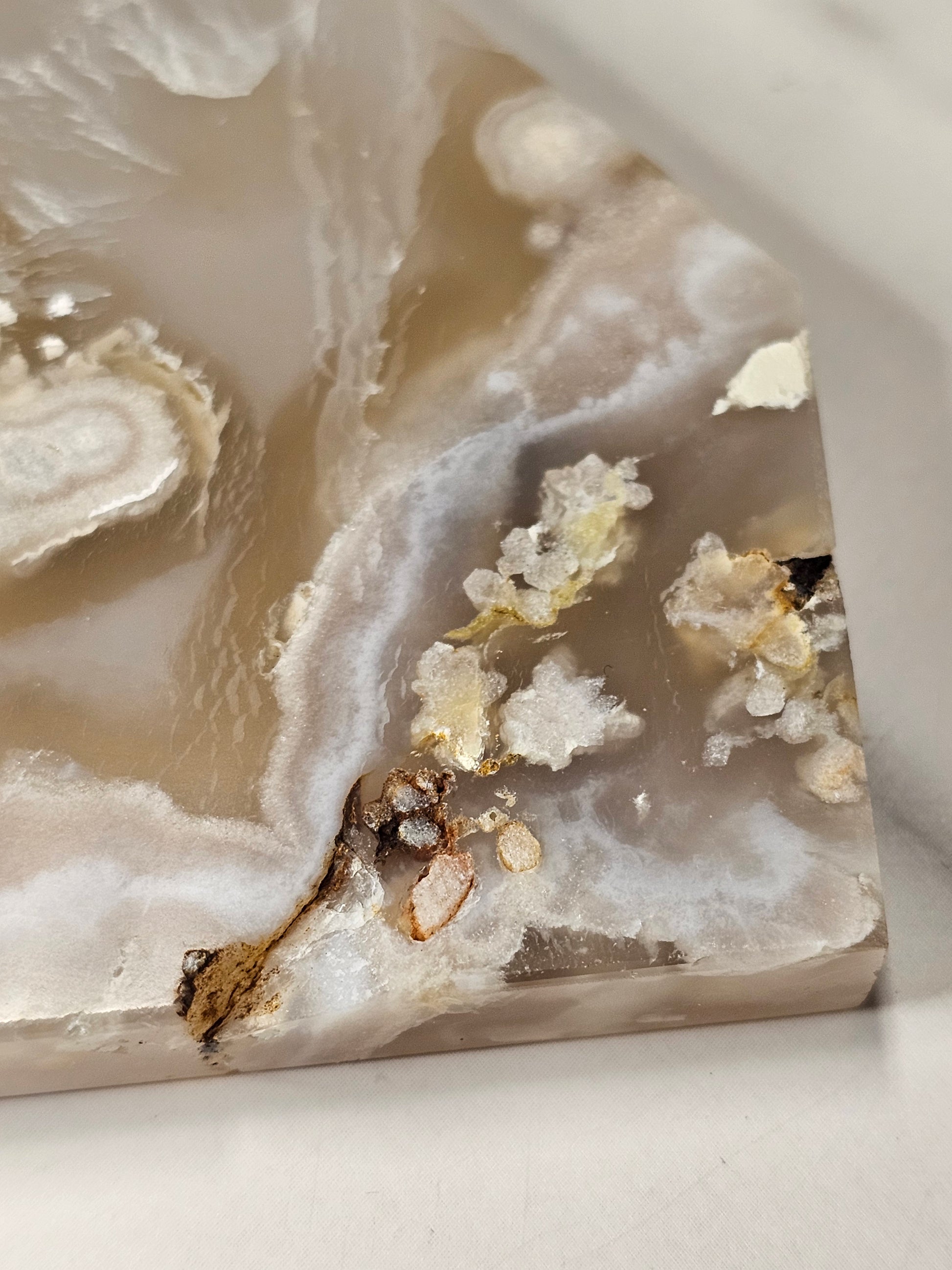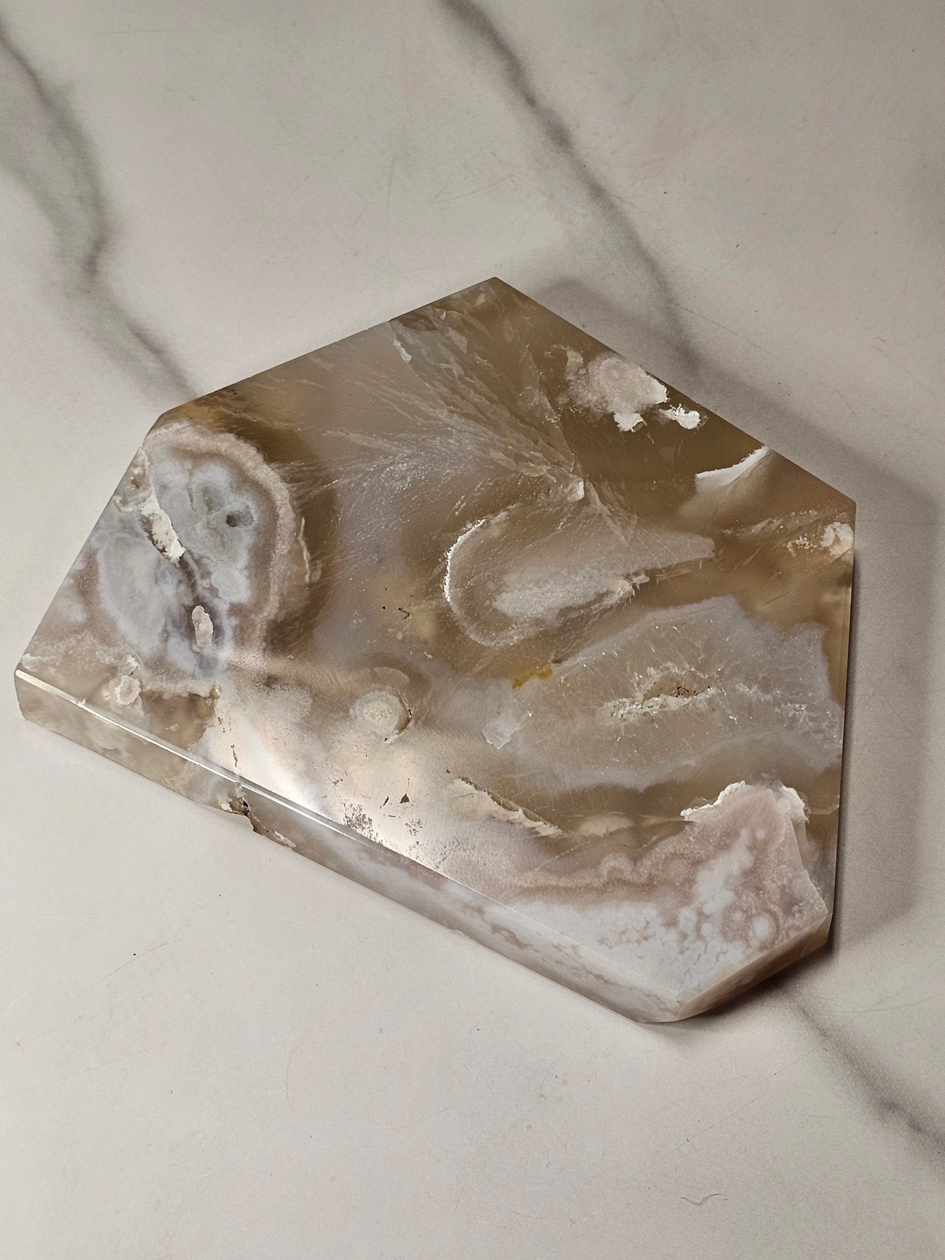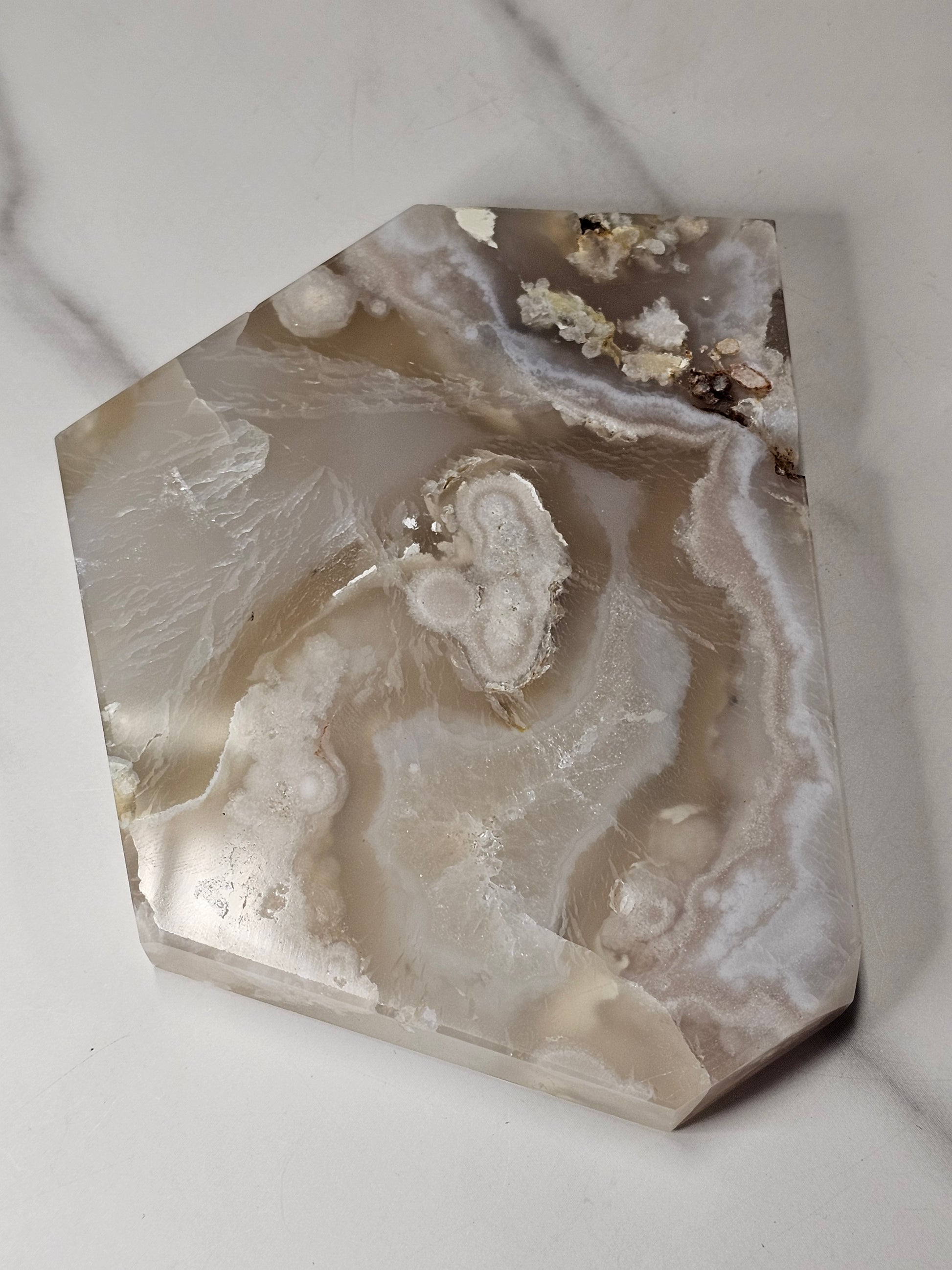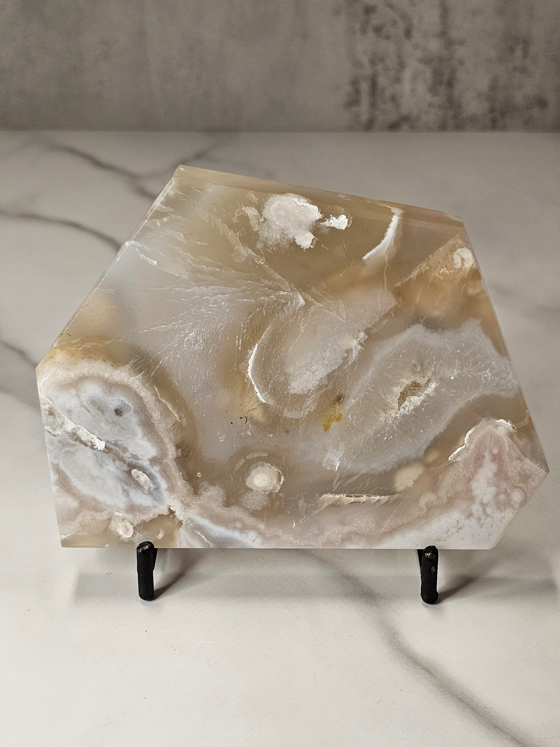 This nicely polished slice of Flower Agate is really pretty and has a nice light pastel color to it with good translucency and some crystalizations and banding! It is 4.21 inches long by 3.28 inches wide and 0.51 inches thick.